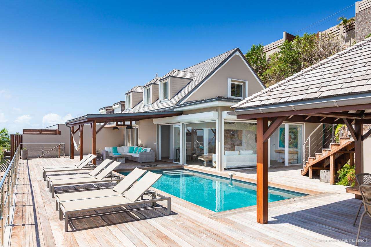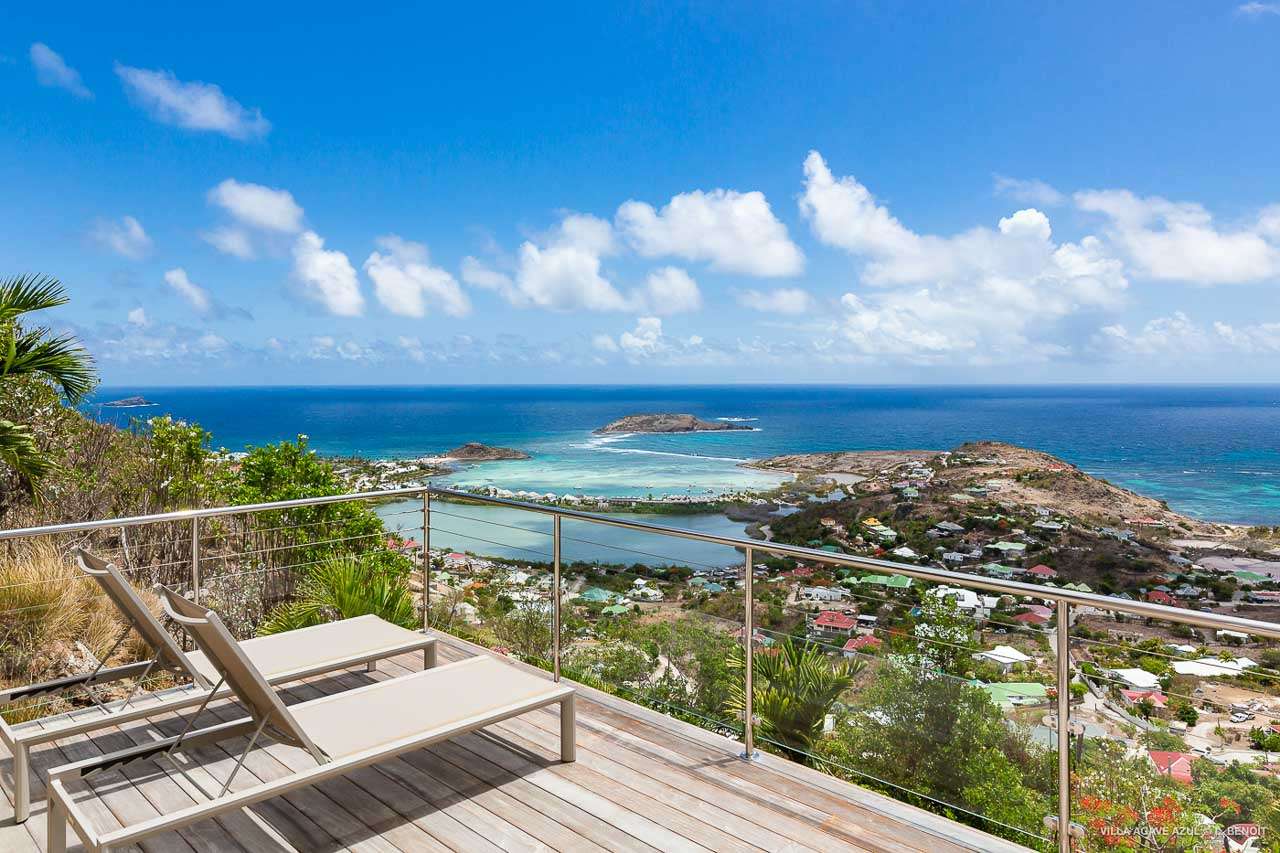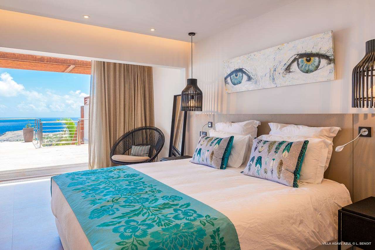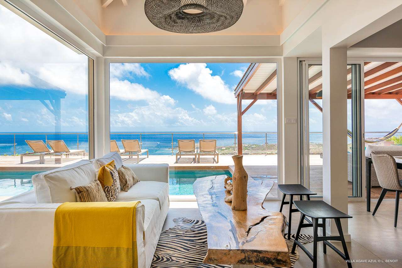 Welcome to Villa Agave Azul (villa code: WV ZUL), a contemporary 4-bedroom villa located in Vitet, St. Barts. This private villa offers breathtaking views of the ocean and the Grand Cul de Sac lagoon, all within minutes of several beaches, shops, and restaurants. Villa Agave Azul is a beautiful example of modern island living. A soothing palette of creams, whites, and rustic woods combine in the interior, with splashes of color and creativity in the tasteful décor. But the real highlight is the incredible island views, with panoramas of the Caribbean and gorgeous Grand Cul de Sac at every turn. Located high in the hills of Vitet, Villa Agave Azul is an idyllic island home that celebrates the best of the St. Barts lifestyle. Within minutes, you could be wading into the sparkling Caribbean, or enjoying a gourmet meal on the waterfront. Private, elegant, and with a fabulous location, this is a great choice for a Caribbean getaway. The bright living spaces inside Villa Agave Azul feature an alluring open-plan design, creating the sense of being outside while lounging around in comfortable interior spaces. A stylish great room is the center of the home, with a combined living room, dining area, and kitchen. The living room sits right next to the sliding glass doors, opening to the outdoor terrace and inviting in the cool breezes. The sofa makes for a great spot to sink in and unwind after a long day exploring St. Barts. To the back of the great room is Villa Agave Azul’s kitchen. Fully equipped, this space has all the appliances you’ll need to prepare meals during your stay. Our concierge also has a few tricks up their sleeves if you wish, from grocery deliveries to arranging a private chef for an evening. There’s a charming indoor dining table, sitting next to sliding doors that open to a tranquil inner courtyard. An alfresco table sits outside on the covered terrace, an idyllic spot to take in the incredible views while you enjoy a gourmet meal. There are 4 bedrooms inside Villa Agave Azul, calm and soothing spaces for some downtime during your stay. The master suite is next to the great room, with contemporary décor and a plush king-sized bed. Ascending upstairs brings you to two more bedrooms, one with a king and the other with a pair of twins. The fourth bedroom is below the main house, with a private terrace enjoying breathtaking 180-degree ocean views. The room also has a small kitchenette. All four bedrooms enjoy spacious ensuite bathrooms and air-conditioning. Stepping outside brings you to Villa Agave Azul’s oversized deck, enjoying some of the best views of the island. From here, the shimmering turquoise bay will coax you out to explore, with plenty of comfortable seating to kick back and take it all in. There’s an outdoor seating area for cocktail hours and sunset views, while plush loungers provide comfortable spots for sunbathing between dips in the villa’s pool. There are stairs that lead down to a lower deck, offering a relaxing retreat with more loungers overlooking the ocean. More stairs ascend to the top of the villa, where there’s a small fitness room. Please note: The stairs to access the house may not be suitable for people with reduced mobility. During the December holidays, the villa rents at full occupancy rates regardless of how many bedrooms are used.Please fill out the form to begin your inquiry and we will connect you with a seasoned villa rental specialist.