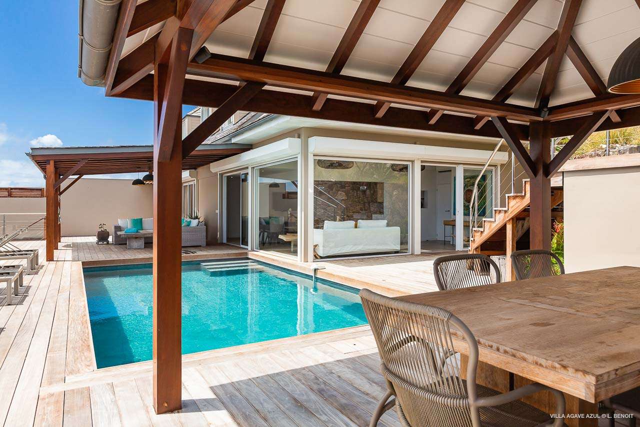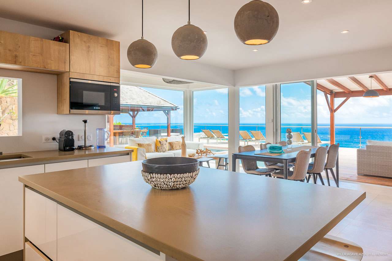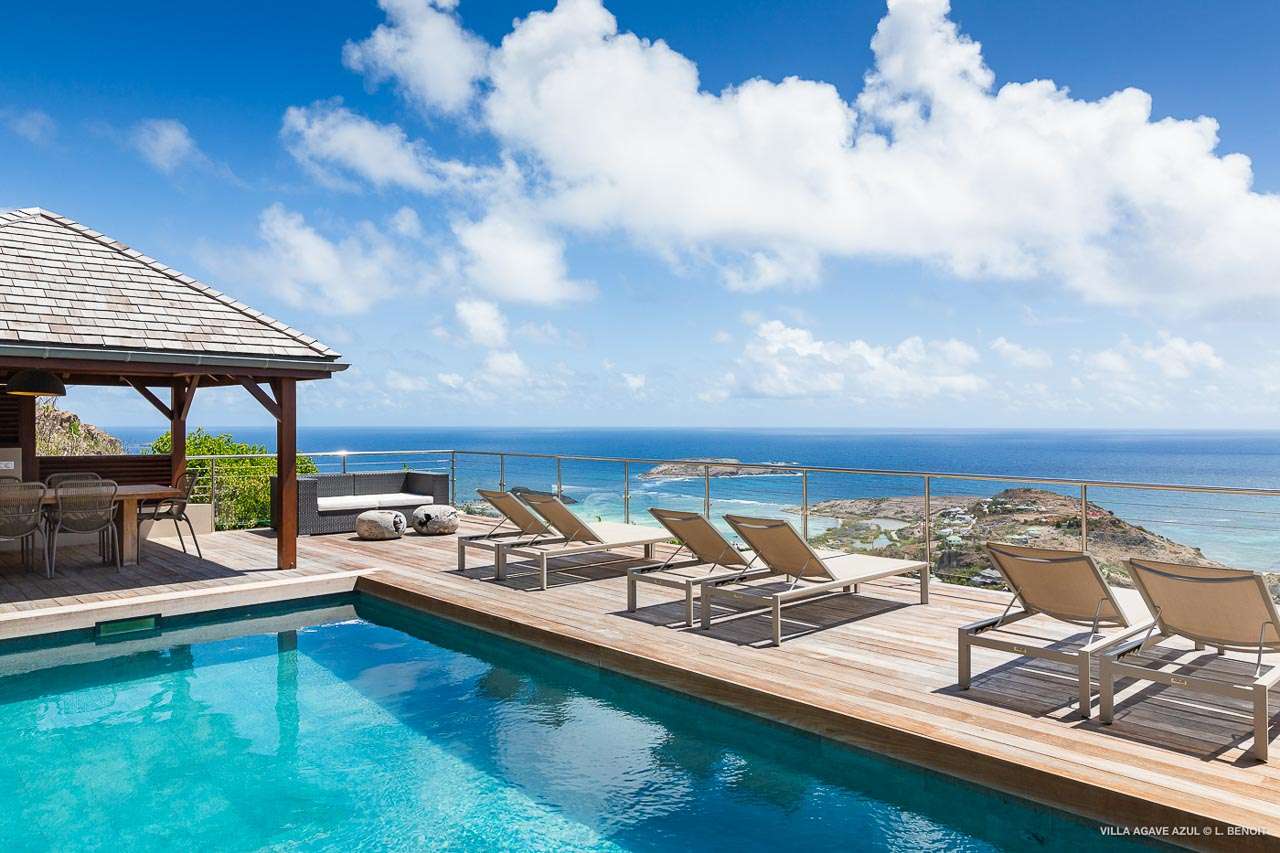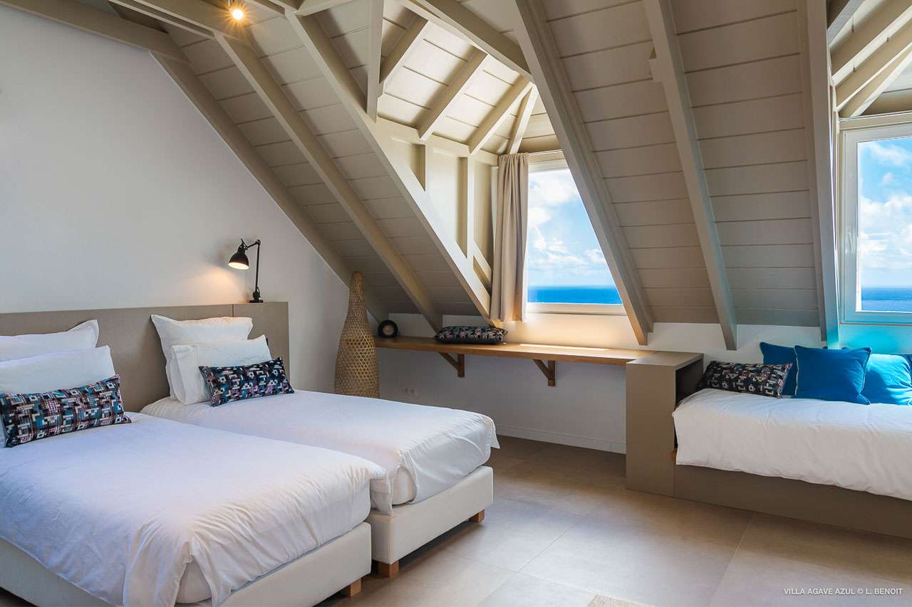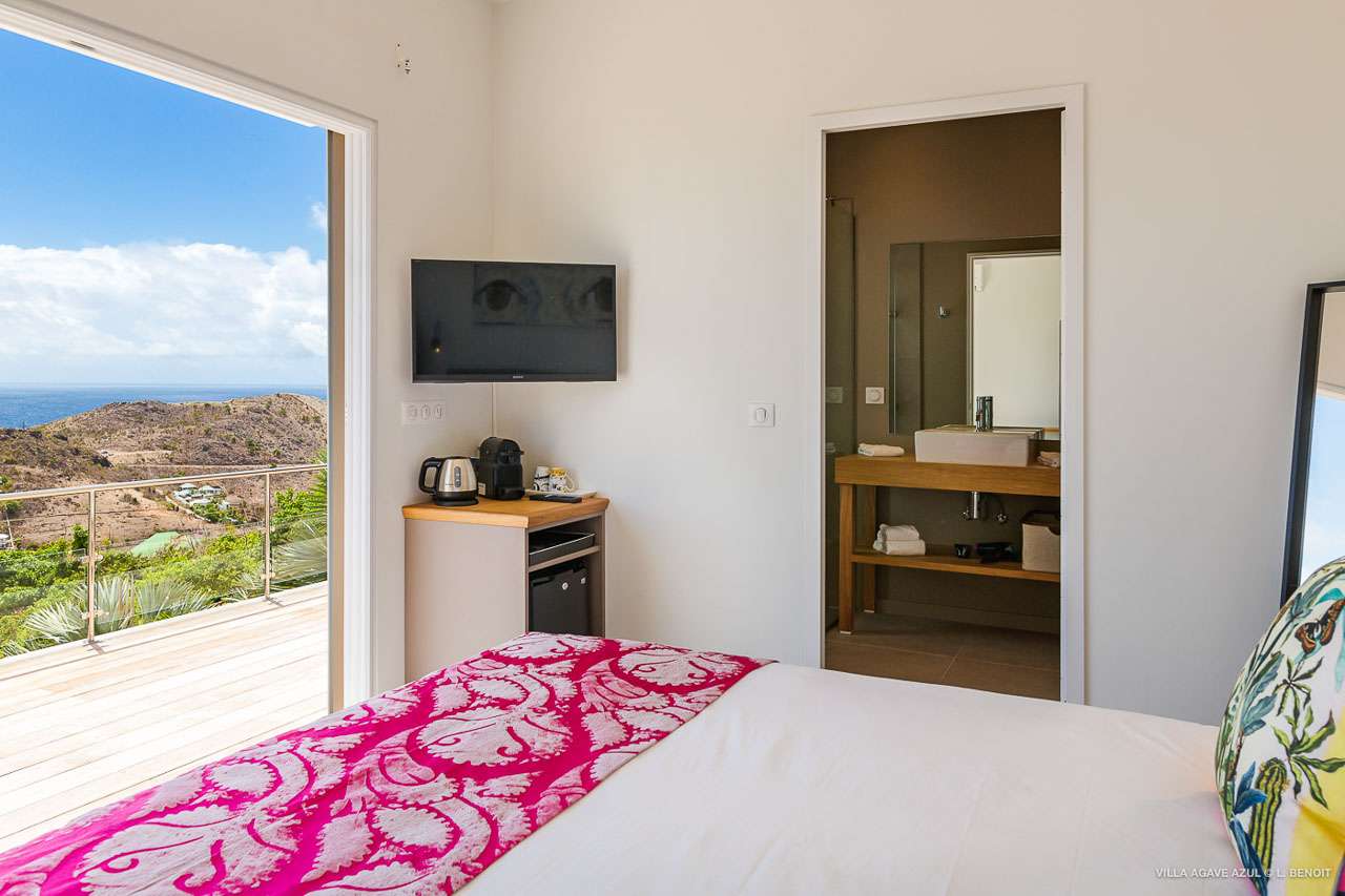 Welcome to Villa Agave Azul (villa code: WV ZUL), a contemporary 4-bedroom villa located in Vitet, St. Barts. This private villa offers breathtaking views of the ocean and the Grand Cul de Sac lagoon, all within minutes of several beaches, shops, and restaurants. Villa Agave Azul is a beautiful example of modern island living. A soothing palette of creams, whites, and rustic woods combine in the interior, with splashes of color and creativity in the tasteful décor. But the real highlight is the incredible island views, with panoramas of the Caribbean and gorgeous Grand Cul de Sac at every turn. Located high in the hills of Vitet, Villa Agave Azul is an idyllic island home that celebrates the best of the St. Barts lifestyle. Within minutes, you could be wading into the sparkling Caribbean, or enjoying a gourmet meal on the waterfront. Private, elegant, and with a fabulous location, this is a great choice for a Caribbean getaway. The bright living spaces inside Villa Agave Azul feature an alluring open-plan design, creating the sense of being outside while lounging around in comfortable interior spaces. A stylish great room is the center of the home, with a combined living room, dining area, and kitchen. The living room sits right next to the sliding glass doors, opening to the outdoor terrace and inviting in the cool breezes. The sofa makes for a great spot to sink in and unwind after a long day exploring St. Barts. To the back of the great room is Villa Agave Azul’s kitchen. Fully equipped, this space has all the appliances you’ll need to prepare meals during your stay. Our concierge also has a few tricks up their sleeves if you wish, from grocery deliveries to arranging a private chef for an evening. There’s a charming indoor dining table, sitting next to sliding doors that open to a tranquil inner courtyard. An alfresco table sits outside on the covered terrace, an idyllic spot to take in the incredible views while you enjoy a gourmet meal. There are 4 bedrooms inside Villa Agave Azul, calm and soothing spaces for some downtime during your stay. The master suite is next to the great room, with contemporary décor and a plush king-sized bed. Ascending upstairs brings you to two more bedrooms, one with a king and the other with a pair of twins. The fourth bedroom is below the main house, with a private terrace enjoying breathtaking 180-degree ocean views. The room also has a small kitchenette. All four bedrooms enjoy spacious ensuite bathrooms and air-conditioning. Stepping outside brings you to Villa Agave Azul’s oversized deck, enjoying some of the best views of the island. From here, the shimmering turquoise bay will coax you out to explore, with plenty of comfortable seating to kick back and take it all in. There’s an outdoor seating area for cocktail hours and sunset views, while plush loungers provide comfortable spots for sunbathing between dips in the villa’s pool. There are stairs that lead down to a lower deck, offering a relaxing retreat with more loungers overlooking the ocean. More stairs ascend to the top of the villa, where there’s a small fitness room. Please note: The stairs to access the house may not be suitable for people with reduced mobility. During the December holidays, the villa rents at full occupancy rates regardless of how many bedrooms are used.Please fill out the form to begin your inquiry and we will connect you with a seasoned villa rental specialist.