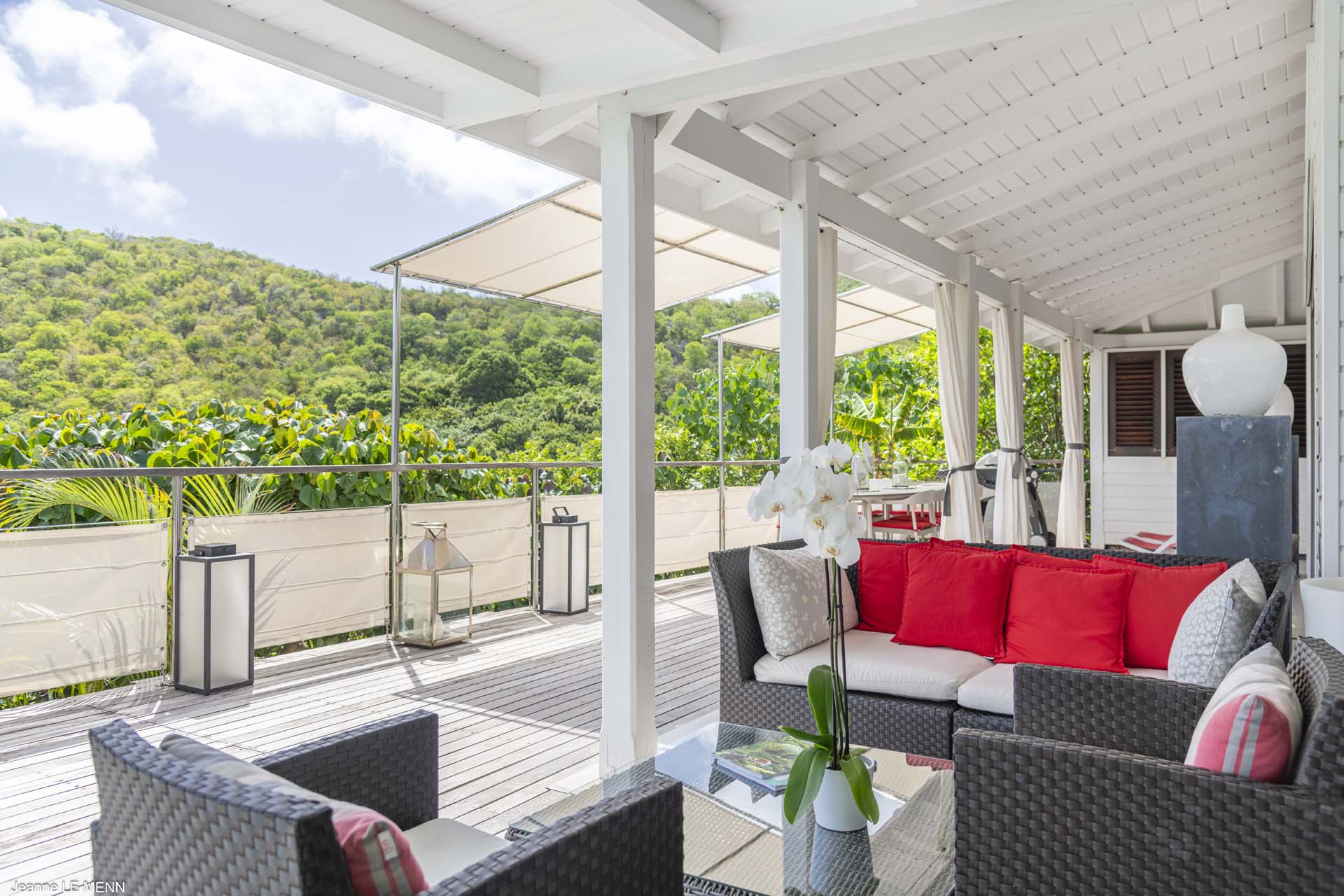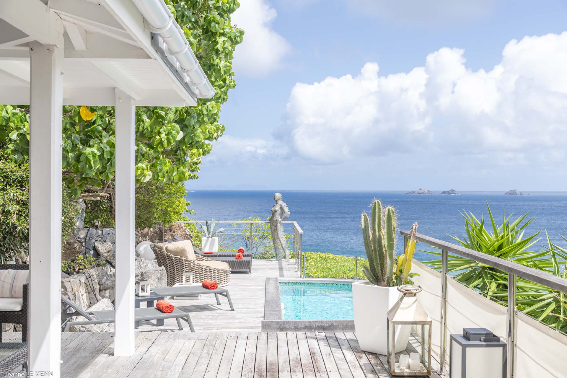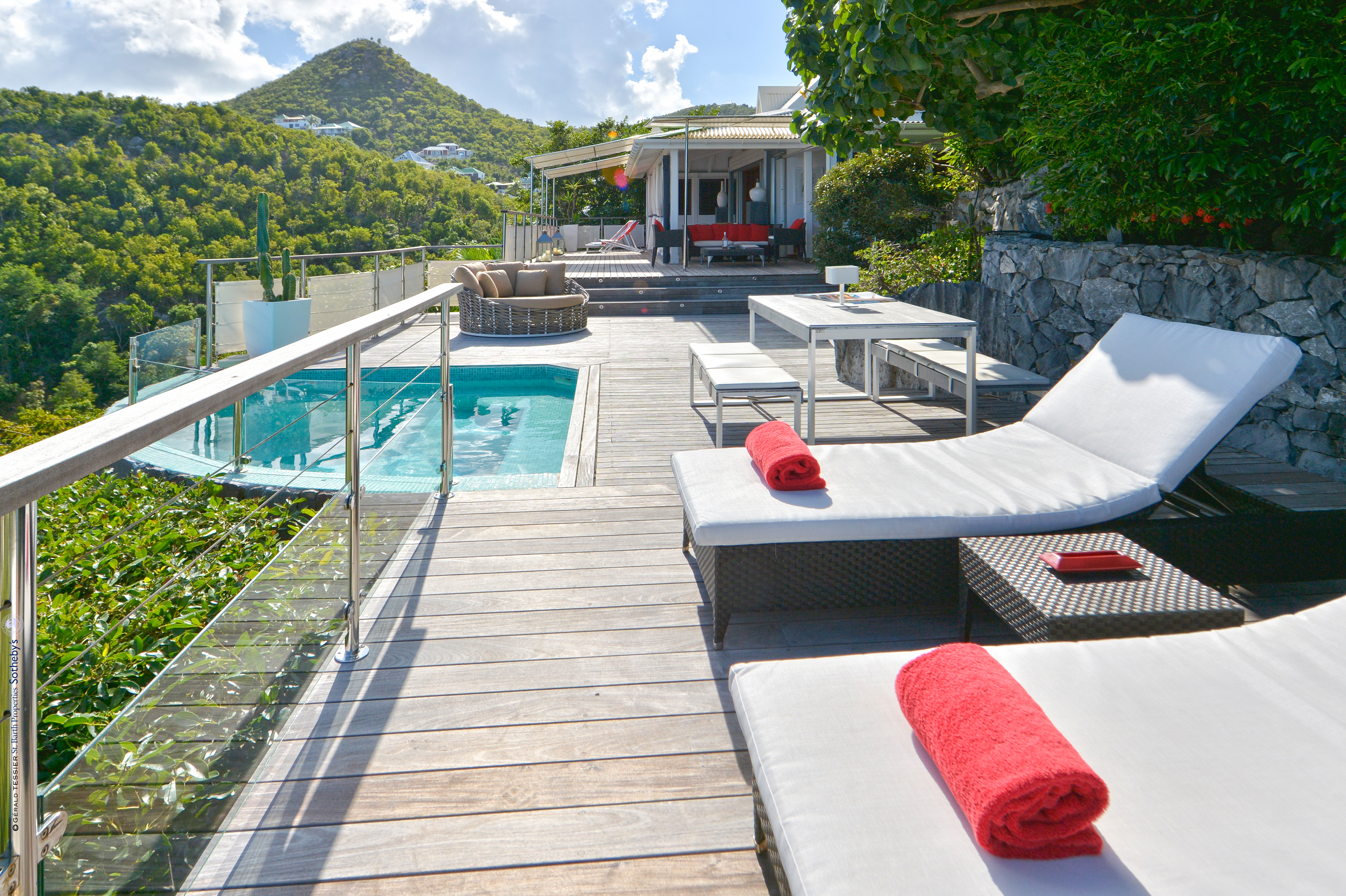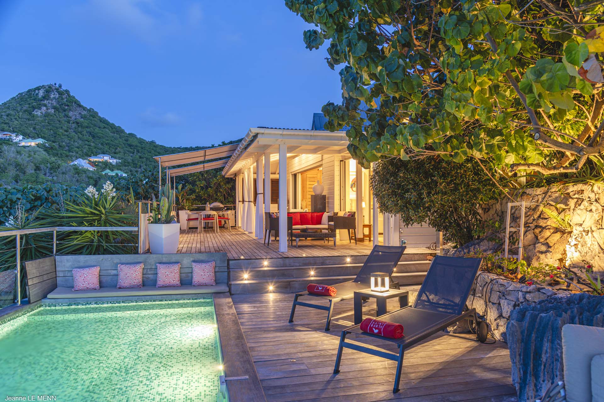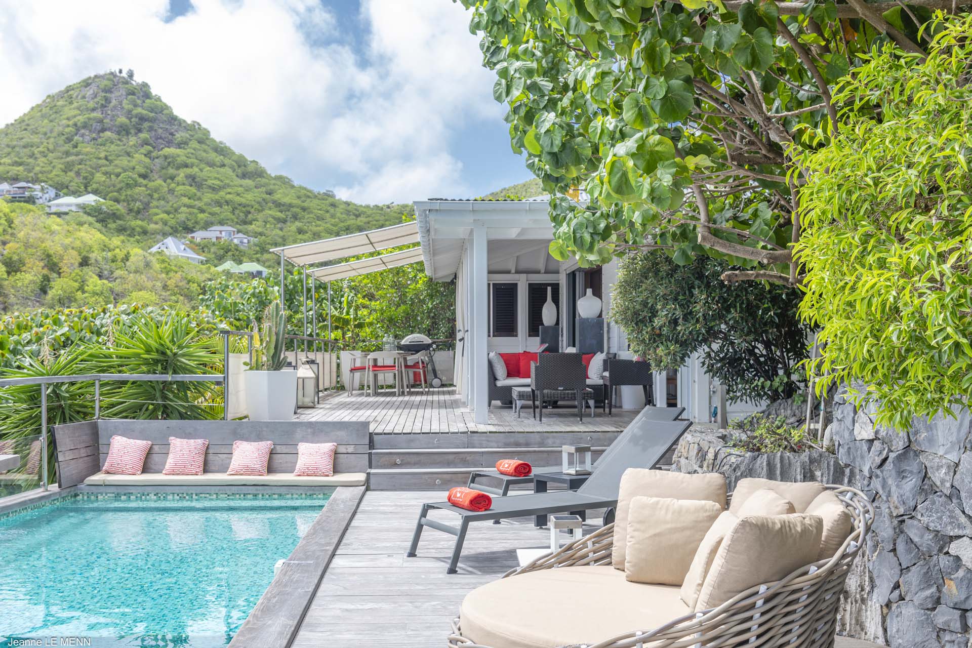 Villa Aloa, (villa code: WV AOA) is a 3-bedroom located in the popular Roc Flamands complex. Villa Aloa has an abundance of features, the outdoor spaces include a multi-level deck with a kitty-cornered plunge pool that overlooks a lovely view of the sea. Guests love the adjacent alfresco dining area. Steps lead down from the parking area to the main level which encompasses the living room, dining area, and a well-equipped compact kitchen. The three bedrooms, 2 with king beds and one with a king or 2 twins are on a lower level and each has direct access to the hot tub which is also on this level. The master bedroom has an ensuite bathroom and the guest rooms share a bathroom across the hallway. A powder room is located on the main level. During the Thanksgiving and December holidays, the villa rents at the full occupancy rate regardless of how many bedrooms are used. * Note - There are a lot of stairs to get down to the villa.Please fill out the form to begin your inquiry and we will connect you with a seasoned villa rental specialist.