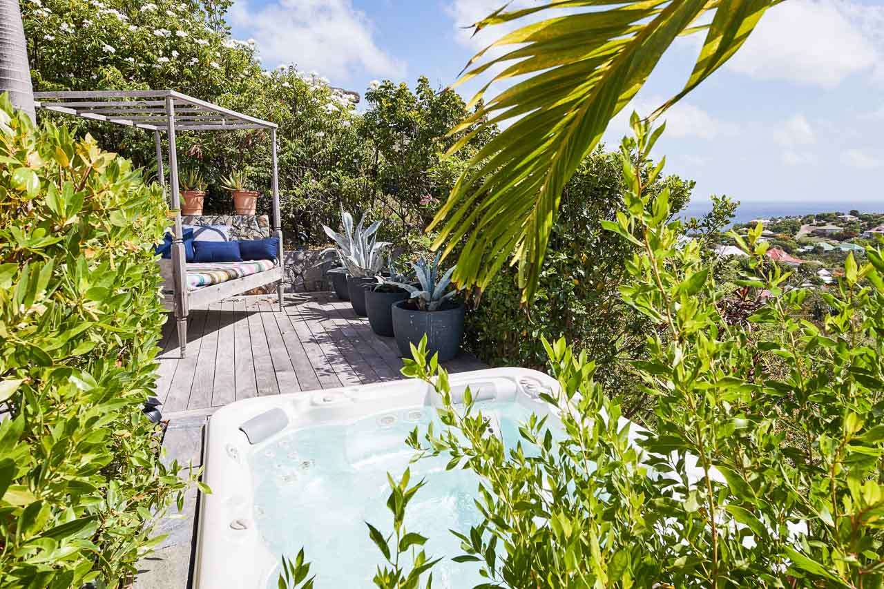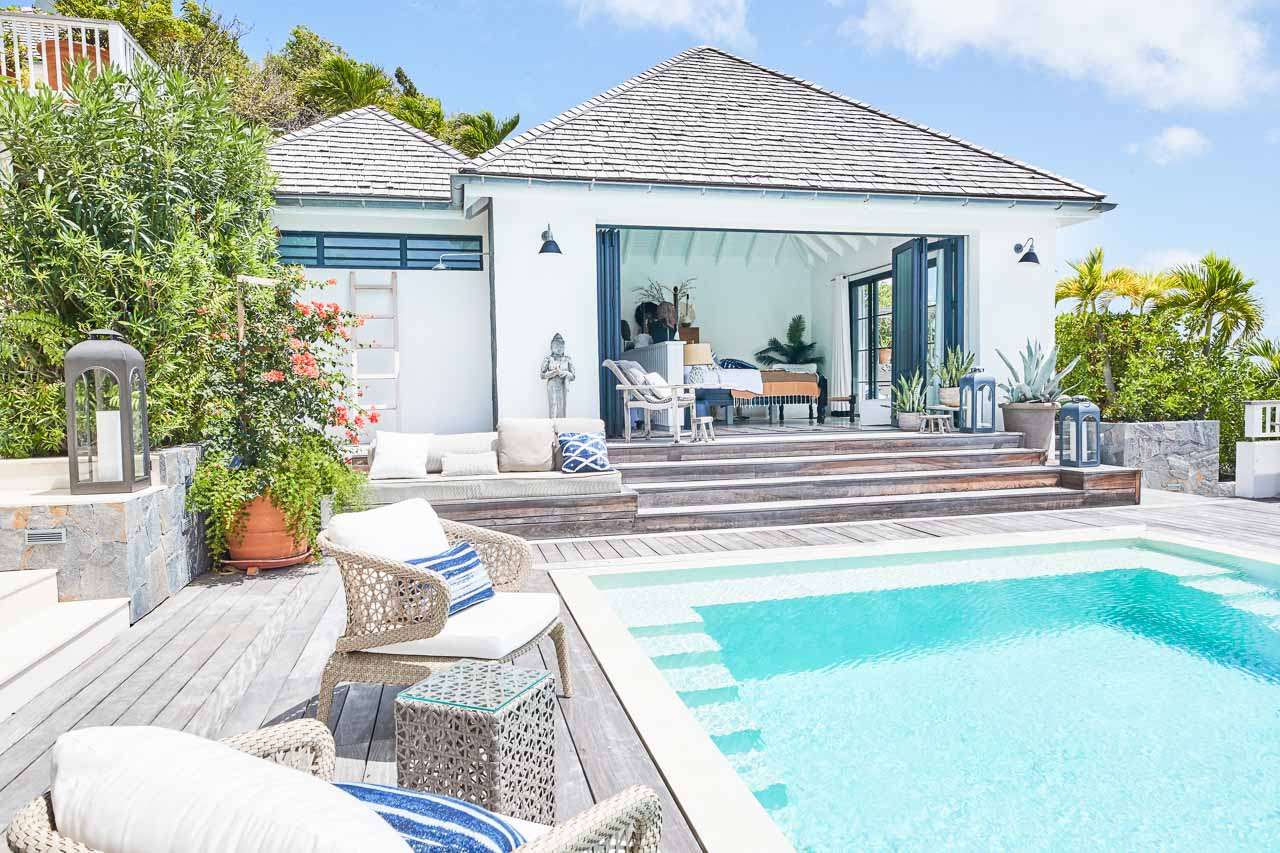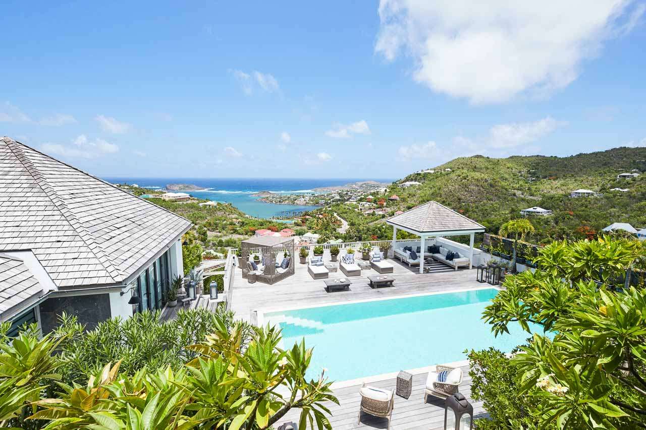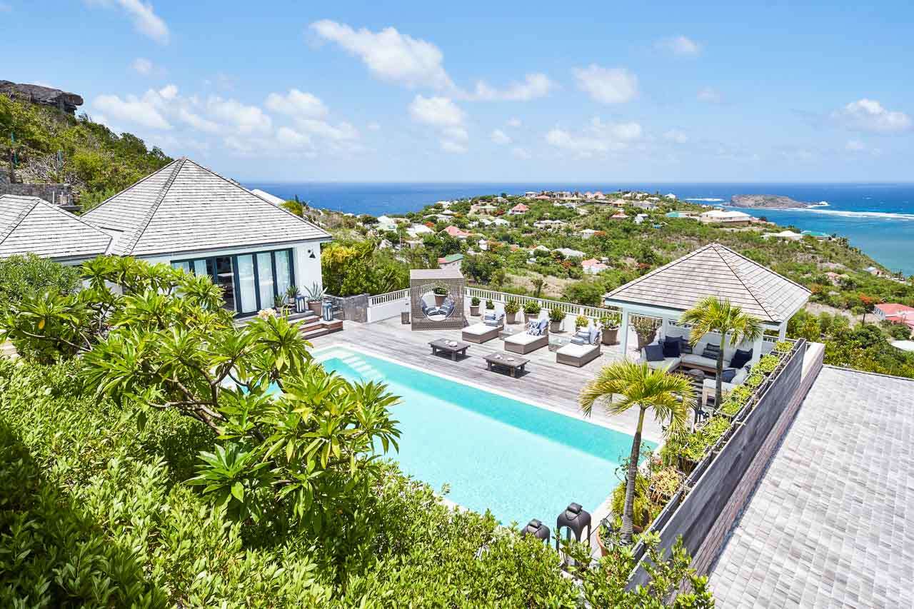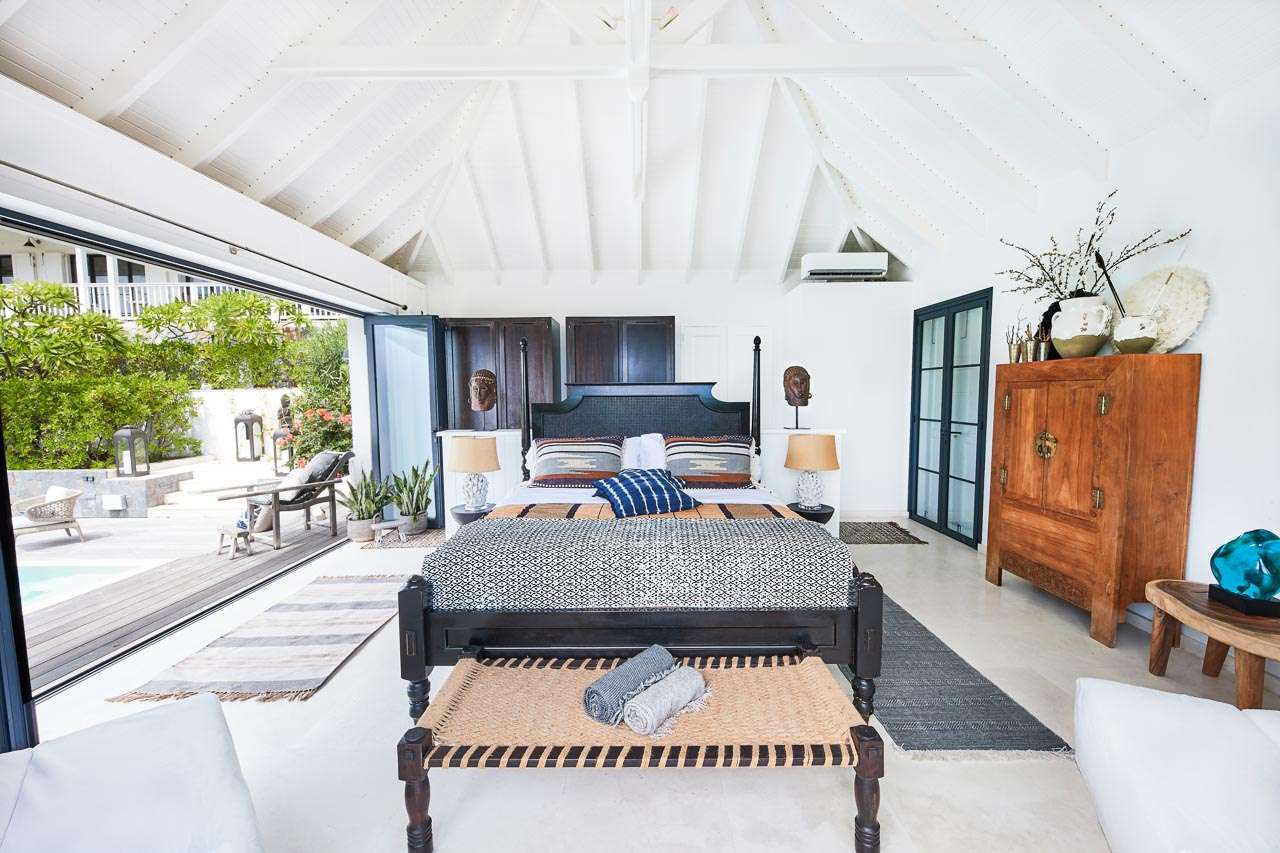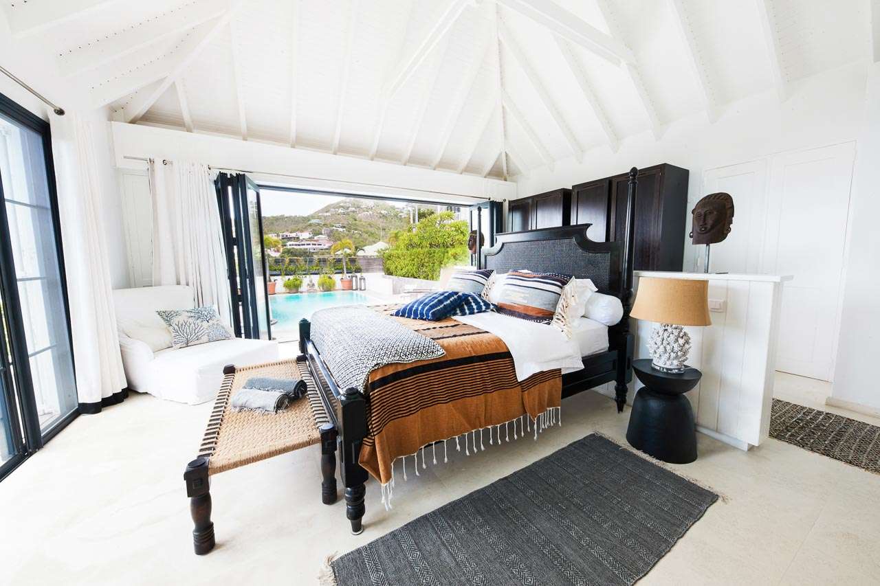 Welcome to Villa Amalie (villa code: WV KAM), a stunning 2-bedroom villa located in Marigot, St. Barts. Featuring stunning views over the bay, this design-led property is within minutes of several beaches and shopping. As soon as you step inside Villa Amalie, it’s love at first sight. This stylish villa blends a striking Scandinavian design aesthetic with rustic island elegance. Black and white hues contrast with rattan textures, weathered wood, and plenty of house plants, with artwork on the walls, weathered antique cabinets and tables, and unique décor. You’ll never tire of admiring the chic style of Villa Amalie, but just as alluring are the wonderful views over Marigot Bay. The verdant green hills roll down to meet the sparkling sea, with Turtle Island offshore glowing in the Caribbean sun. Both Marigot and Lorient beaches are a 5-minute drive, while Gustavia is 10 minutes by car. Spread over three levels, Villa Amalie enjoys a splendid blend of indoor and outdoor spaces. Stairs lead between all the levels, with the upper-level home to the main great room, combining the living area, dining room, and kitchen. All rooms on this level open to a covered balcony overlooking the pool area and views. The living room is bright and airy, with an eclectic décor adorning the antique furnishings. Soft sofas with patterned throws provide comfortable spots to kick back, with a flat-screen TV for movies. It’s also a great room for morning coffees and conversation, enjoying some quality time with family and friends. At the other end of the interconnected great room is the kitchen. One wall is covered with framed pictures, a striking design touch that makes this place feel like home. Preparing meals here is easy, with those inspiring views over Marigot Bay encouraging you to experiment with the local island recipes. Between the living room and kitchen is Villa Amalie’s dining room table, a beautiful setting to gather for a meal. There are plants on both sides, with a feature wall of woven hats adding a rustic, down-to-earth touch. There are two bedrooms in this expansive villa, both with plenty of graceful style and decor. Quiet, relaxed, and gorgeous, you’ll wake up each day refreshed and ready to explore the best of St. Barts. On the middle level of Villa Amalie is the master bedroom, tastefully decorated in black and white tones. The bedroom offers a king-sized bed and an ensuite bathroom. A private terrace surrounded by lush island ferns conceals a hot tub, a luxurious spot to toast to your island vacation. Descending one more level brings you to the second bedroom. Also decorated in striking black and white, this room has a king-sized bed, ensuite bathroom, and a private terrace with ocean views. With outdoor living spaces on the two upper levels, there’s plenty of space at Villa Amalie to entertain guests. Stretching the width of the upper-level great room, a covered balcony enjoys plenty of seating for kicking back with a cool drink and gazing out at the Caribbean. Also on the upper level is a separate gazebo, with another indoor lounge area open to the ocean views. The middle level is home to the inviting pool, surrounded by loungers for sunbathing, and a daybed underneath another gazebo, an ideal spot to read a good book or nap in the shade. During the December holidays, the villa rents at the full occupancy rate regardless of how many bedrooms are used.Please fill out the form to begin your inquiry and we will connect you with a seasoned villa rental specialist.