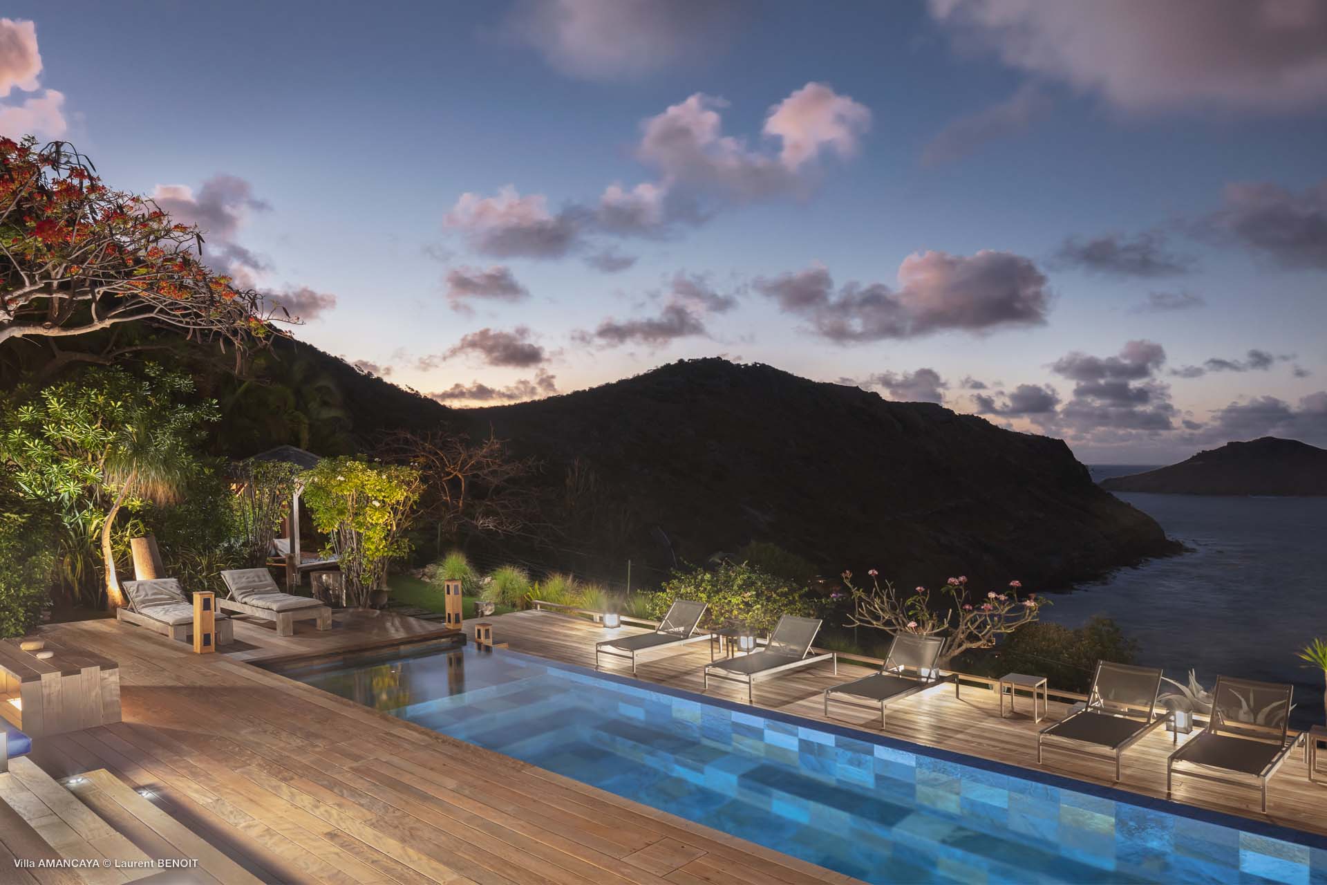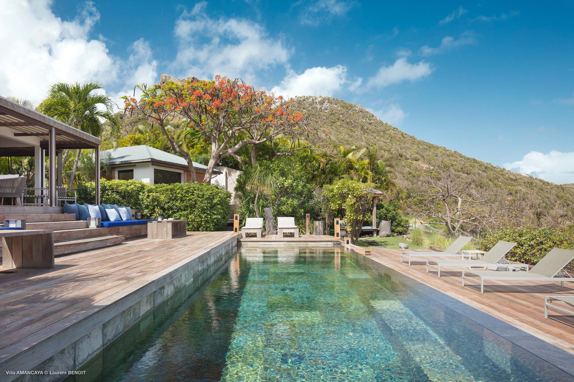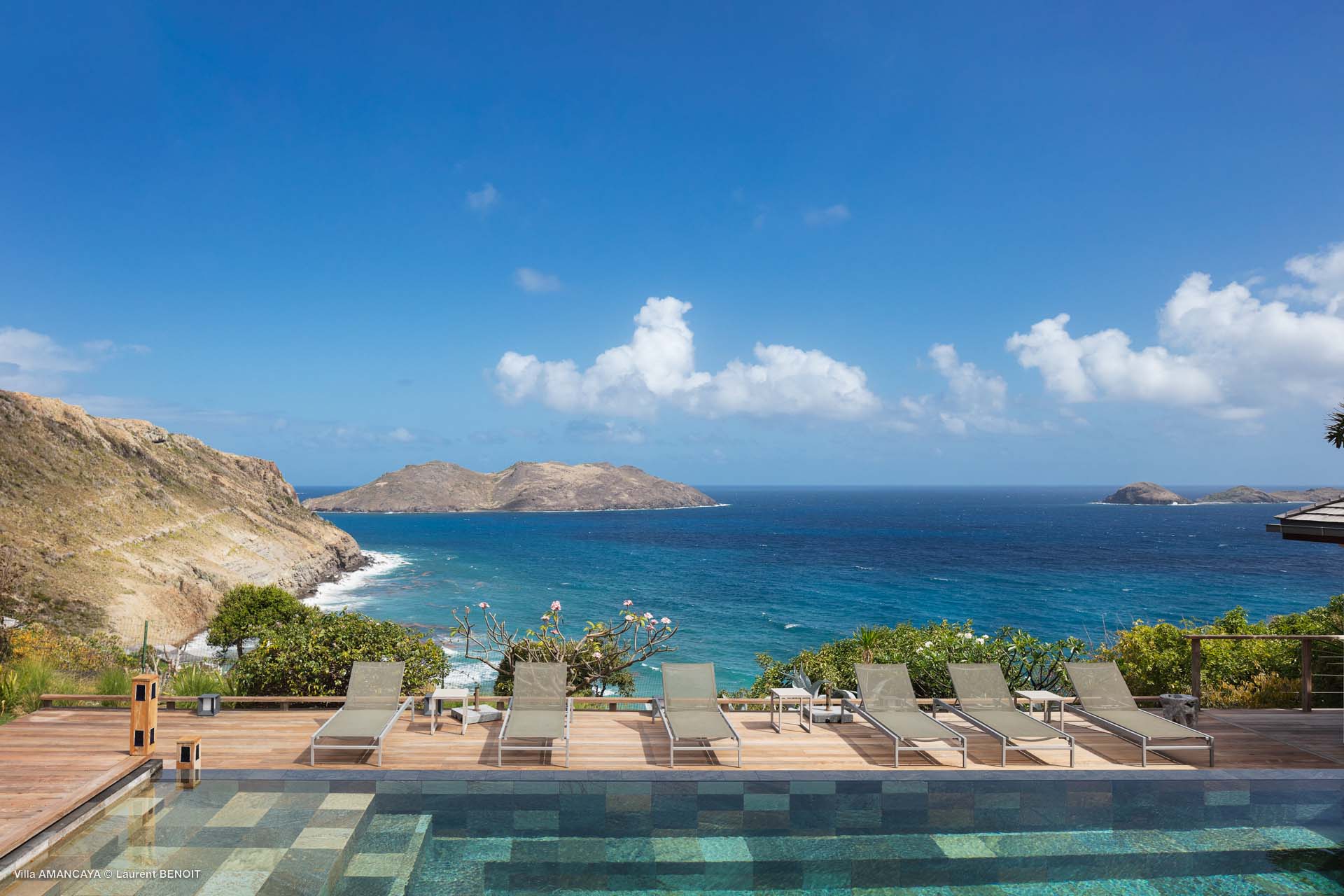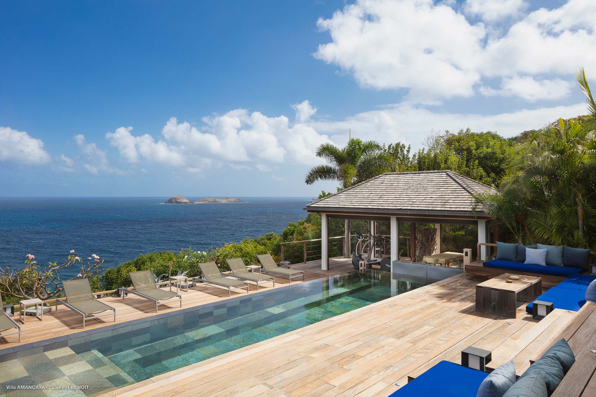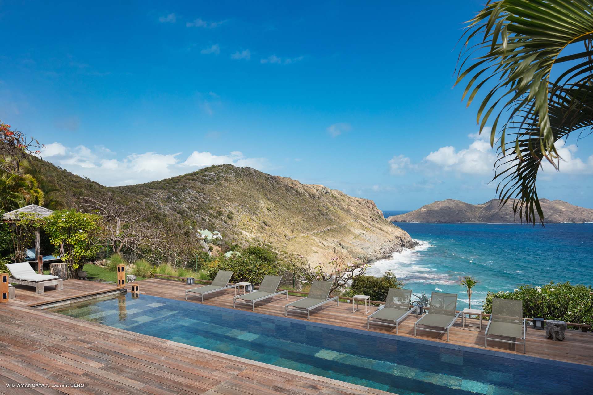 Castaway to Villa Amancaya (villa code: WV KAY), a luxurious 6-bedroom villa located in Anse des Cayes, St. Barts. This private, hillside property has breathtaking views within minutes of several beaches, shopping, and incredible restaurants. A private and luxurious getaway, Villa Amancaya is St. Barts at its very best. The rustic and high-end interiors combine a laid-back island style with an Oriental influence, while outside, the views are incredible. Decorated with lavender and teak accents, this is an oasis of peace and quiet for you to enjoy a laid-back vacation in St. Barts. Nestled within a lush garden above Anse de Cayes, Villa Amancaya is a fantastic choice for a large family gathering or group of friends traveling together. The beach is a short drive away, as are St. Jean and Gustavia, both offering fantastic dining options. This is a villa made for a carefree getaway in St. Barts. Spread across the main house and several bungalows, Villa Amancaya offers plenty of space to come together as a group or find some solitude. In the main house, there’s a decadent mix of Caribbean style and Zen-like décor. The living room has a large L-shaped sofa and opens to the pool and view. Shelves behind the sofa feature a range of interesting décor, from coffee table books to elegant vases and ornate teapots. The room takes advantage of the view, with the incredible deep blues of the Caribbean Sea drawing your gaze. Next to the living room is Villa Amancaya’s well-equipped kitchen. From easy snacks to gourmet island dinners, this space makes it easy to prepare meals during your stay. Our concierge can even organize private chefs to cater a meal or two, leaving you to enjoy a sunset drink and aperitif while you wait. There are two dining areas to choose from, both outside so you can pair your food with the dazzling views. One sits next to the pool under the covered terrace, while the other is closer to the edge, underneath a shaded gazebo. Both make it easy to entertain. There’s a total of 6 bedrooms spread across Villa Amancaya, providing privacy between guests. In the main building are three bedrooms, each with a king-sized bed and ensuite bathroom with shower. One faces the pool, while the other opens to the villa’s garden with a fountain. Two more bedrooms are in separate bungalows, both with a king-sized bed and ensuite bathroom. The 6th bedroom is located at the rear of the garden in another guest cottage, featuring a king or 2 twin beds and ensuite bathroom. The outdoor spaces at Villa Amancaya are a highlight of this property. There’s a carefree and idyllic feel to the terraces, made from gorgeous natural wood and bordered by lush palms and tropical plants. The covered terrace has several seating areas, and wonderful spots to kick back with a cool drink and gaze out at the yachts in the bay. Steps lead down to the swimming pool, refreshing and cool in the heat of the day. Loungers for sunbathing line the water, ideal places to settle in with a book or drift off to sleep with the breeze rustling through the garden. At the end of the pool is another gazebo, this one with an open-air fitness room and a spot for decadent massages. The interior garden is another relaxing spot to kick back, a Zen-like space to disconnect from the rushes of modern life. Villa Amancaya has a range of high-end amenities to help you relax during your stay. During the December holidays, the villa rents at the full occupancy rate regardless of how many bedrooms are used.Please fill out the form to begin your inquiry and we will connect you with a seasoned villa rental specialist.