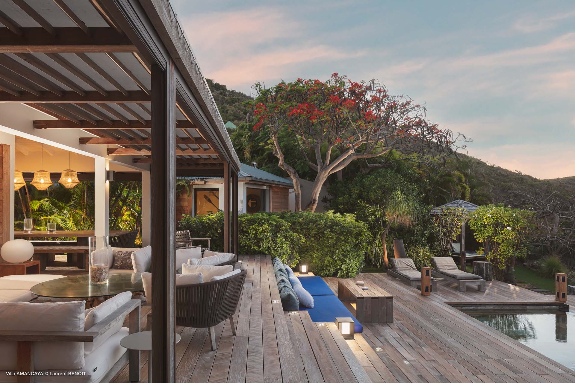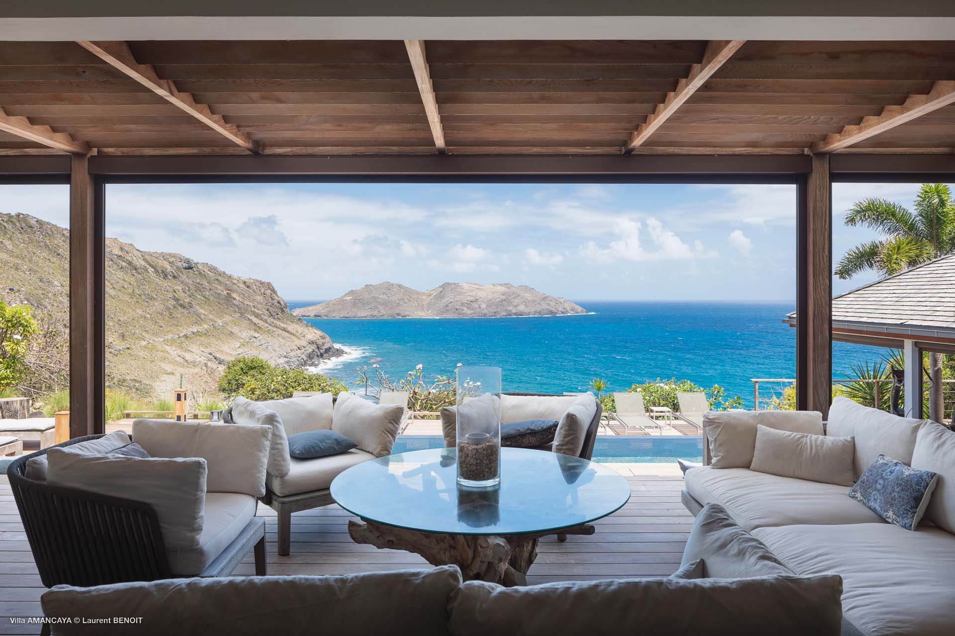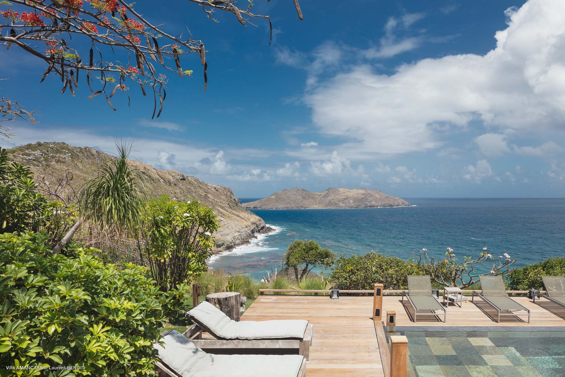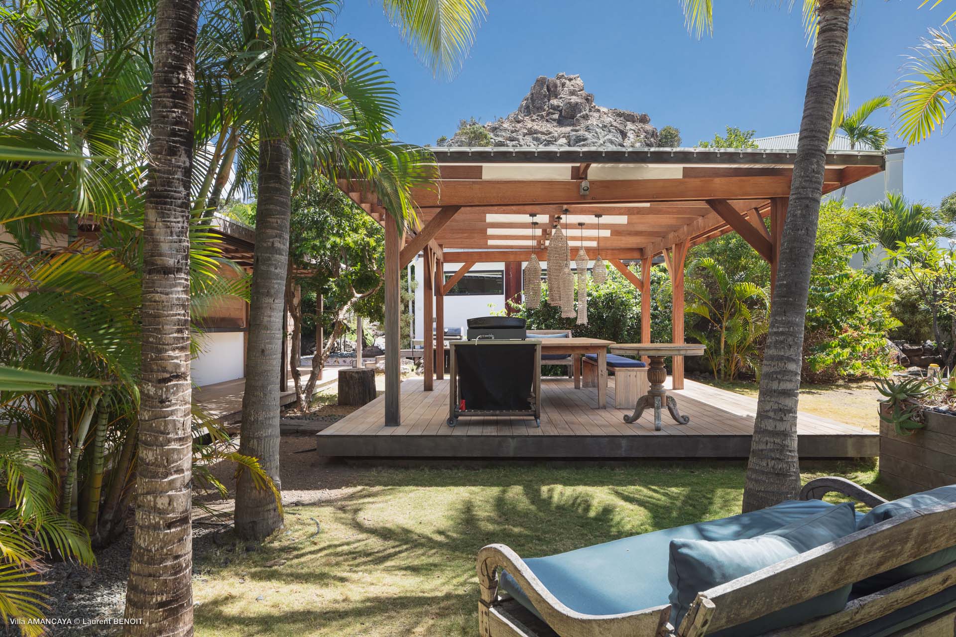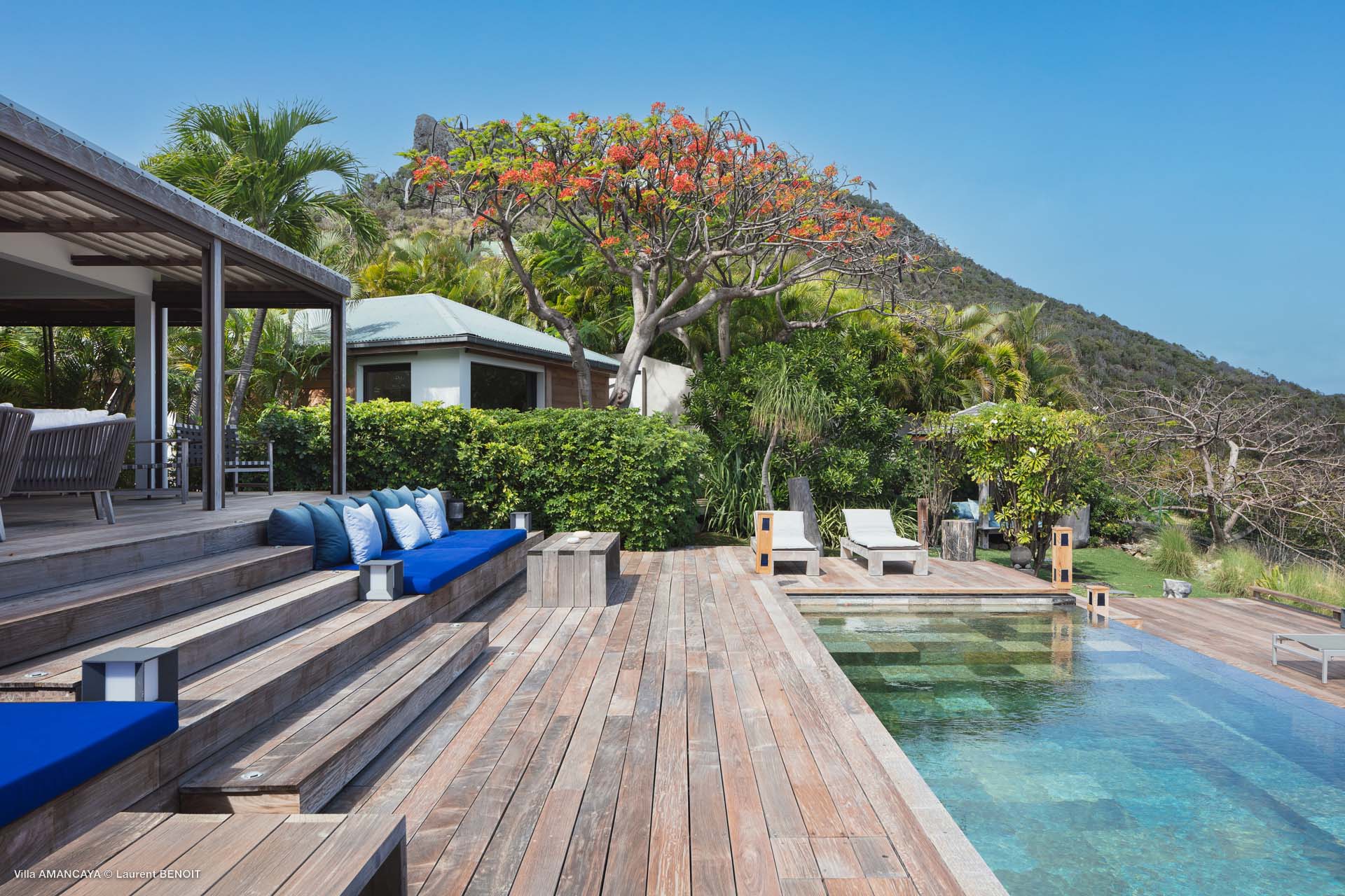Castaway to Villa Amancaya (villa code: WV KAY), a luxurious 6-bedroom villa located in Anse des Cayes, St. Barts. This private, hillside property has breathtaking views within minutes of several beaches, shopping, and incredible restaurants. A private and luxurious getaway, Villa Amancaya is St. Barts at its very best. The rustic and high-end interiors combine a laid-back island style with an Oriental influence, while outside, the views are incredible. Decorated with lavender and teak accents, this is an oasis of peace and quiet for you to enjoy a laid-back vacation in St. Barts. Nestled within a lush garden above Anse de Cayes, Villa Amancaya is a fantastic choice for a large family gathering or group of friends traveling together. The beach is a short drive away, as are St. Jean and Gustavia, both offering fantastic dining options. This is a villa made for a carefree getaway in St. Barts. Spread across the main house and several bungalows, Villa Amancaya offers plenty of space to come together as a group or find some solitude. In the main house, there’s a decadent mix of Caribbean style and Zen-like décor. The living room has a large L-shaped sofa and opens to the pool and view. Shelves behind the sofa feature a range of interesting décor, from coffee table books to elegant vases and ornate teapots. The room takes advantage of the view, with the incredible deep blues of the Caribbean Sea drawing your gaze. Next to the living room is Villa Amancaya’s well-equipped kitchen. From easy snacks to gourmet island dinners, this space makes it easy to prepare meals during your stay. Our concierge can even organize private chefs to cater a meal or two, leaving you to enjoy a sunset drink and aperitif while you wait. There are two dining areas to choose from, both outside so you can pair your food with the dazzling views. One sits next to the pool under the covered terrace, while the other is closer to the edge, underneath a shaded gazebo. Both make it easy to entertain. There’s a total of 6 bedrooms spread across Villa Amancaya, providing privacy between guests. In the main building are three bedrooms, each with a king-sized bed and ensuite bathroom with shower. One faces the pool, while the other opens to the villa’s garden with a fountain. Two more bedrooms are in separate bungalows, both with a king-sized bed and ensuite bathroom. The 6th bedroom is located at the rear of the garden in another guest cottage, featuring a king or 2 twin beds and ensuite bathroom. The outdoor spaces at Villa Amancaya are a highlight of this property. There’s a carefree and idyllic feel to the terraces, made from gorgeous natural wood and bordered by lush palms and tropical plants. The covered terrace has several seating areas, and wonderful spots to kick back with a cool drink and gaze out at the yachts in the bay. Steps lead down to the swimming pool, refreshing and cool in the heat of the day. Loungers for sunbathing line the water, ideal places to settle in with a book or drift off to sleep with the breeze rustling through the garden. At the end of the pool is another gazebo, this one with an open-air fitness room and a spot for decadent massages. The interior garden is another relaxing spot to kick back, a Zen-like space to disconnect from the rushes of modern life. Villa Amancaya has a range of high-end amenities to help you relax during your stay. During the December holidays, the villa rents at the full occupancy rate regardless of how many bedrooms are used.Please fill out the form to begin your inquiry and we will connect you with a seasoned villa rental specialist.