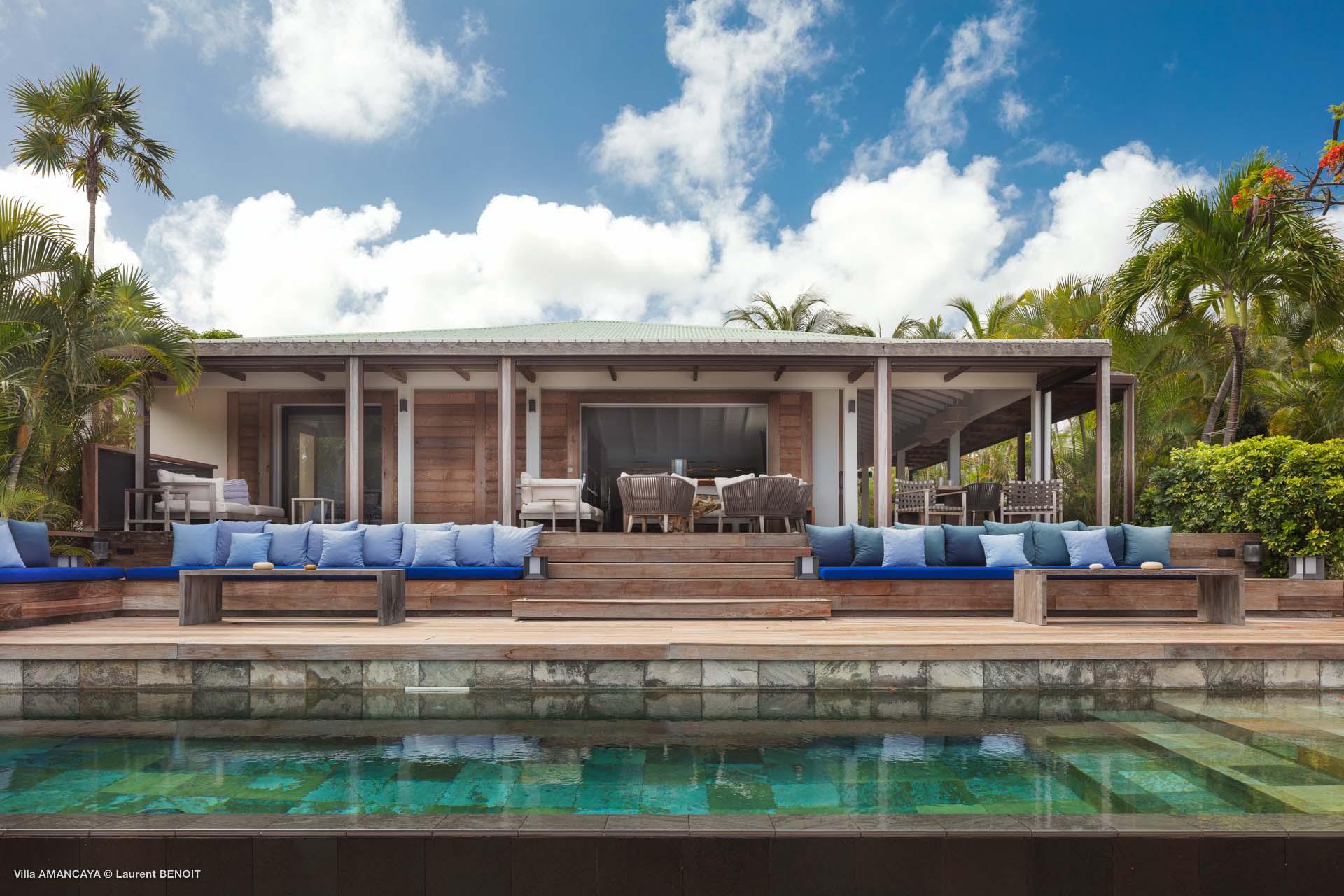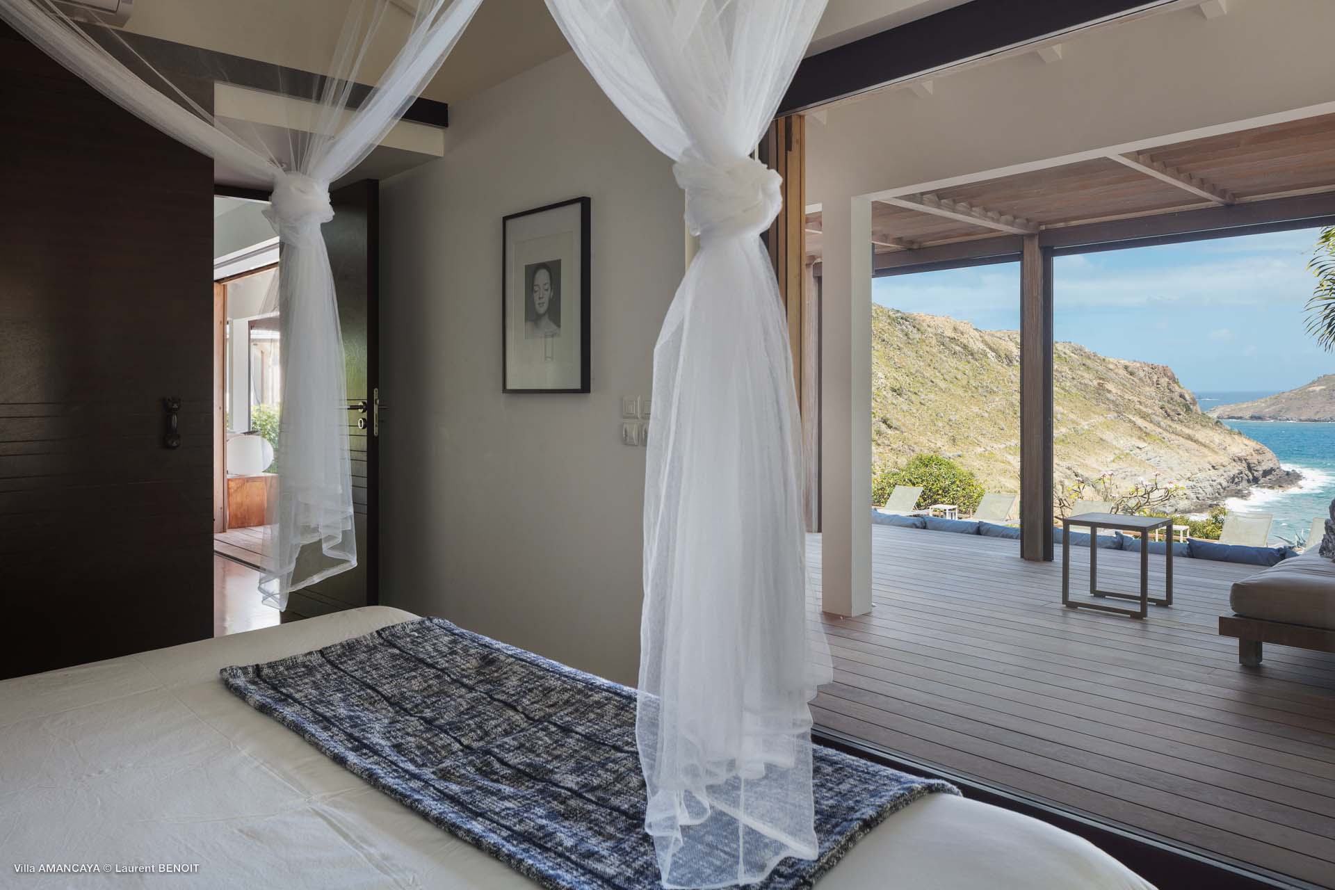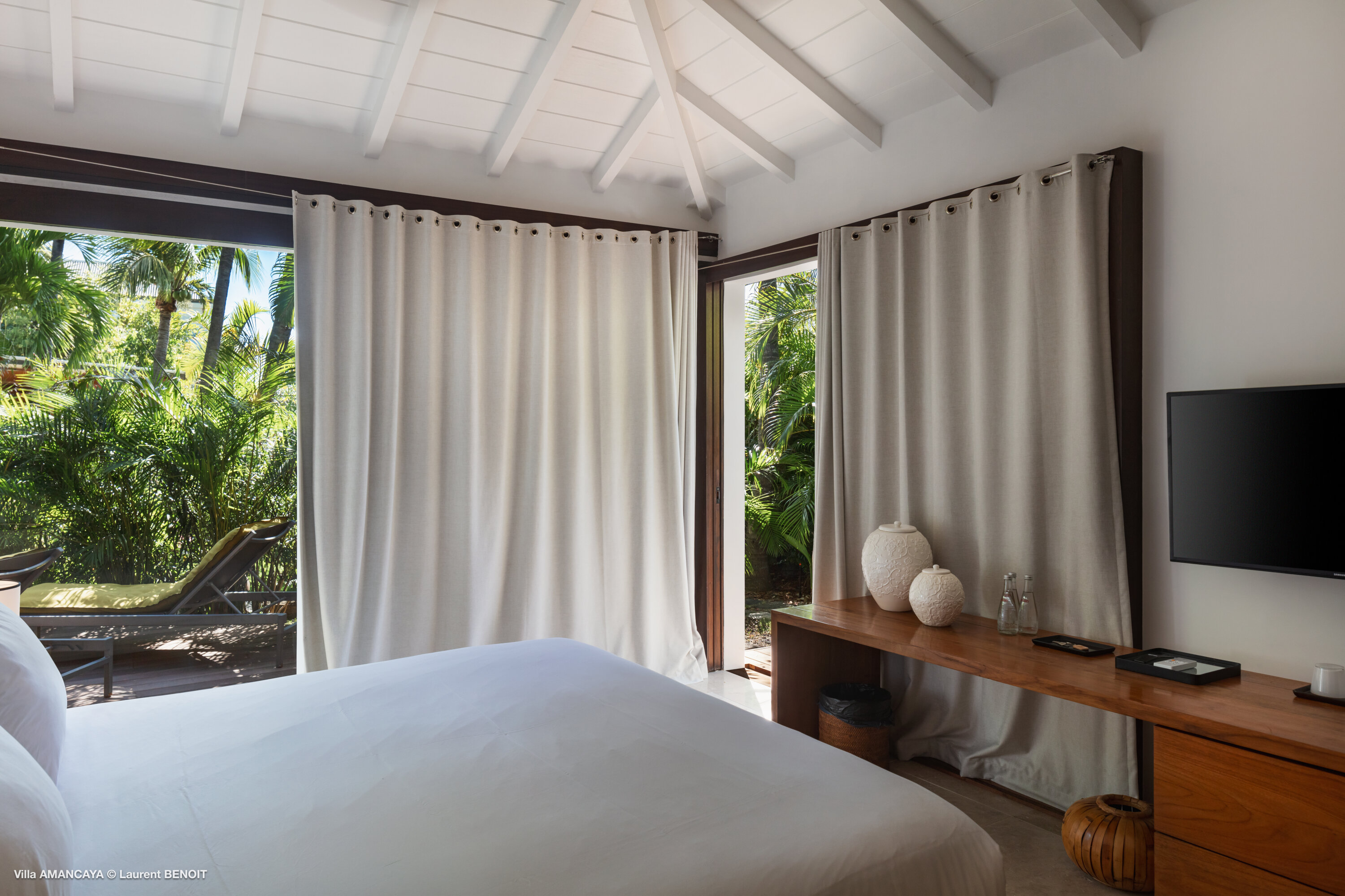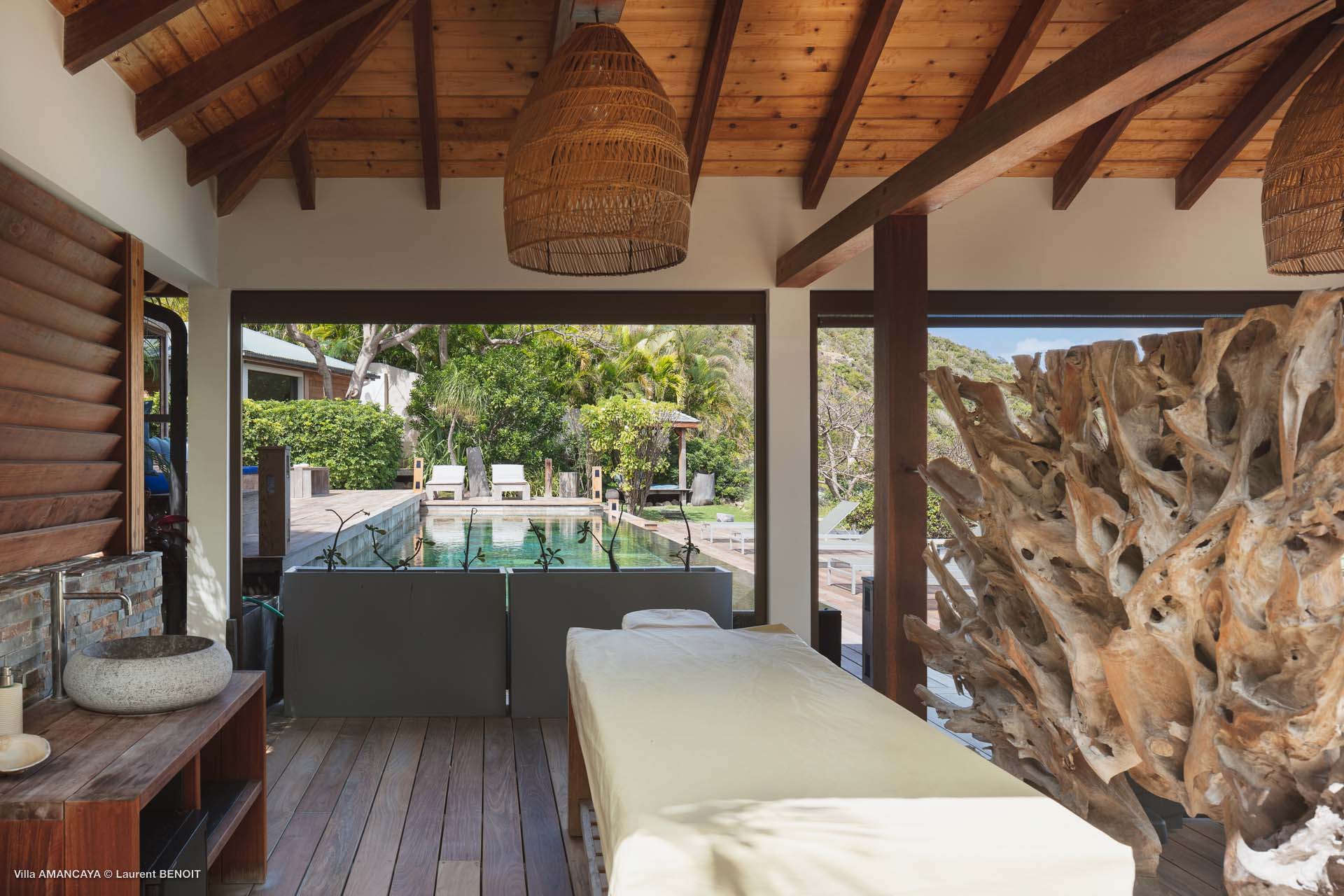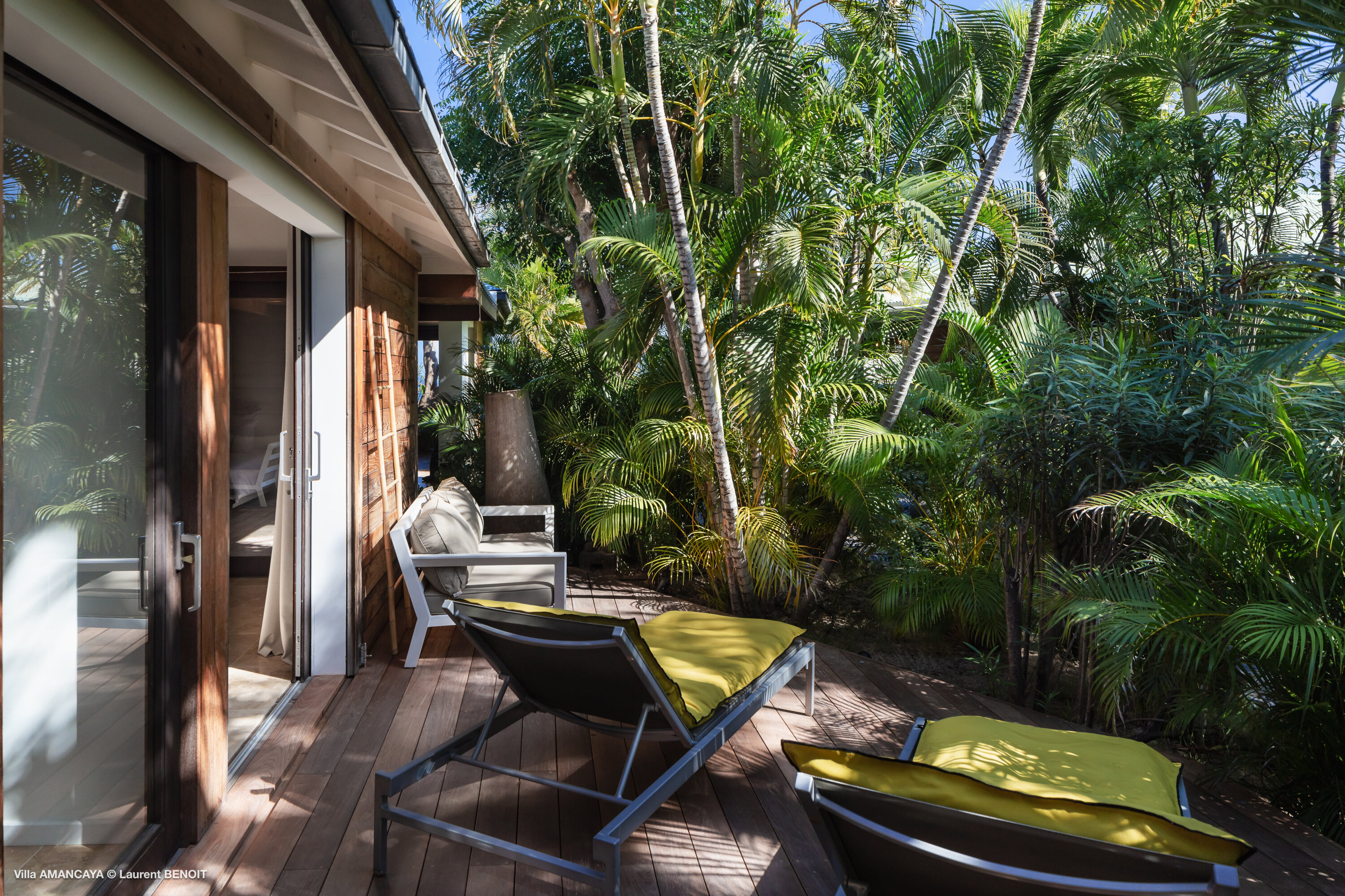 Castaway to Villa Amancaya (villa code: WV KAY), a luxurious 6-bedroom villa located in Anse des Cayes, St. Barts. This private, hillside property has breathtaking views within minutes of several beaches, shopping, and incredible restaurants. A private and luxurious getaway, Villa Amancaya is St. Barts at its very best. The rustic and high-end interiors combine a laid-back island style with an Oriental influence, while outside, the views are incredible. Decorated with lavender and teak accents, this is an oasis of peace and quiet for you to enjoy a laid-back vacation in St. Barts. Nestled within a lush garden above Anse de Cayes, Villa Amancaya is a fantastic choice for a large family gathering or group of friends traveling together. The beach is a short drive away, as are St. Jean and Gustavia, both offering fantastic dining options. This is a villa made for a carefree getaway in St. Barts. Spread across the main house and several bungalows, Villa Amancaya offers plenty of space to come together as a group or find some solitude. In the main house, there’s a decadent mix of Caribbean style and Zen-like décor. The living room has a large L-shaped sofa and opens to the pool and view. Shelves behind the sofa feature a range of interesting décor, from coffee table books to elegant vases and ornate teapots. The room takes advantage of the view, with the incredible deep blues of the Caribbean Sea drawing your gaze. Next to the living room is Villa Amancaya’s well-equipped kitchen. From easy snacks to gourmet island dinners, this space makes it easy to prepare meals during your stay. Our concierge can even organize private chefs to cater a meal or two, leaving you to enjoy a sunset drink and aperitif while you wait. There are two dining areas to choose from, both outside so you can pair your food with the dazzling views. One sits next to the pool under the covered terrace, while the other is closer to the edge, underneath a shaded gazebo. Both make it easy to entertain. There’s a total of 6 bedrooms spread across Villa Amancaya, providing privacy between guests. In the main building are three bedrooms, each with a king-sized bed and ensuite bathroom with shower. One faces the pool, while the other opens to the villa’s garden with a fountain. Two more bedrooms are in separate bungalows, both with a king-sized bed and ensuite bathroom. The 6th bedroom is located at the rear of the garden in another guest cottage, featuring a king or 2 twin beds and ensuite bathroom. The outdoor spaces at Villa Amancaya are a highlight of this property. There’s a carefree and idyllic feel to the terraces, made from gorgeous natural wood and bordered by lush palms and tropical plants. The covered terrace has several seating areas, and wonderful spots to kick back with a cool drink and gaze out at the yachts in the bay. Steps lead down to the swimming pool, refreshing and cool in the heat of the day. Loungers for sunbathing line the water, ideal places to settle in with a book or drift off to sleep with the breeze rustling through the garden. At the end of the pool is another gazebo, this one with an open-air fitness room and a spot for decadent massages. The interior garden is another relaxing spot to kick back, a Zen-like space to disconnect from the rushes of modern life. Villa Amancaya has a range of high-end amenities to help you relax during your stay. During the December holidays, the villa rents at the full occupancy rate regardless of how many bedrooms are used.Please fill out the form to begin your inquiry and we will connect you with a seasoned villa rental specialist.