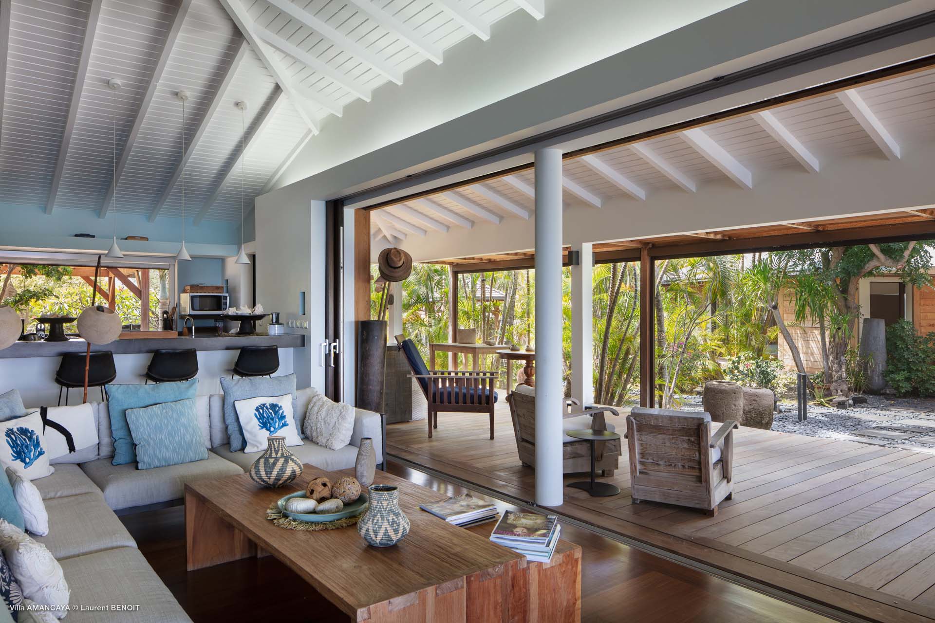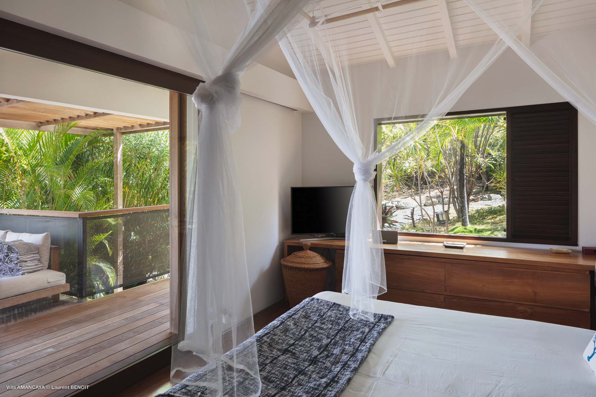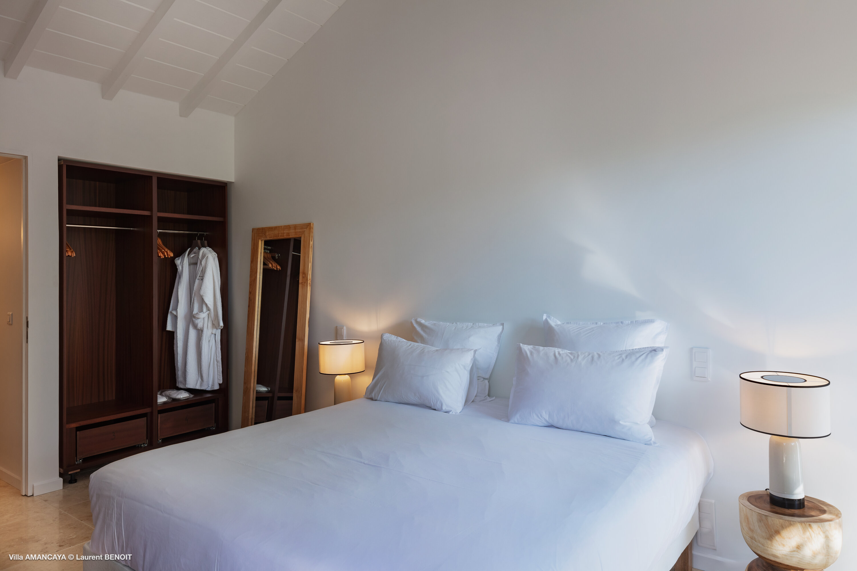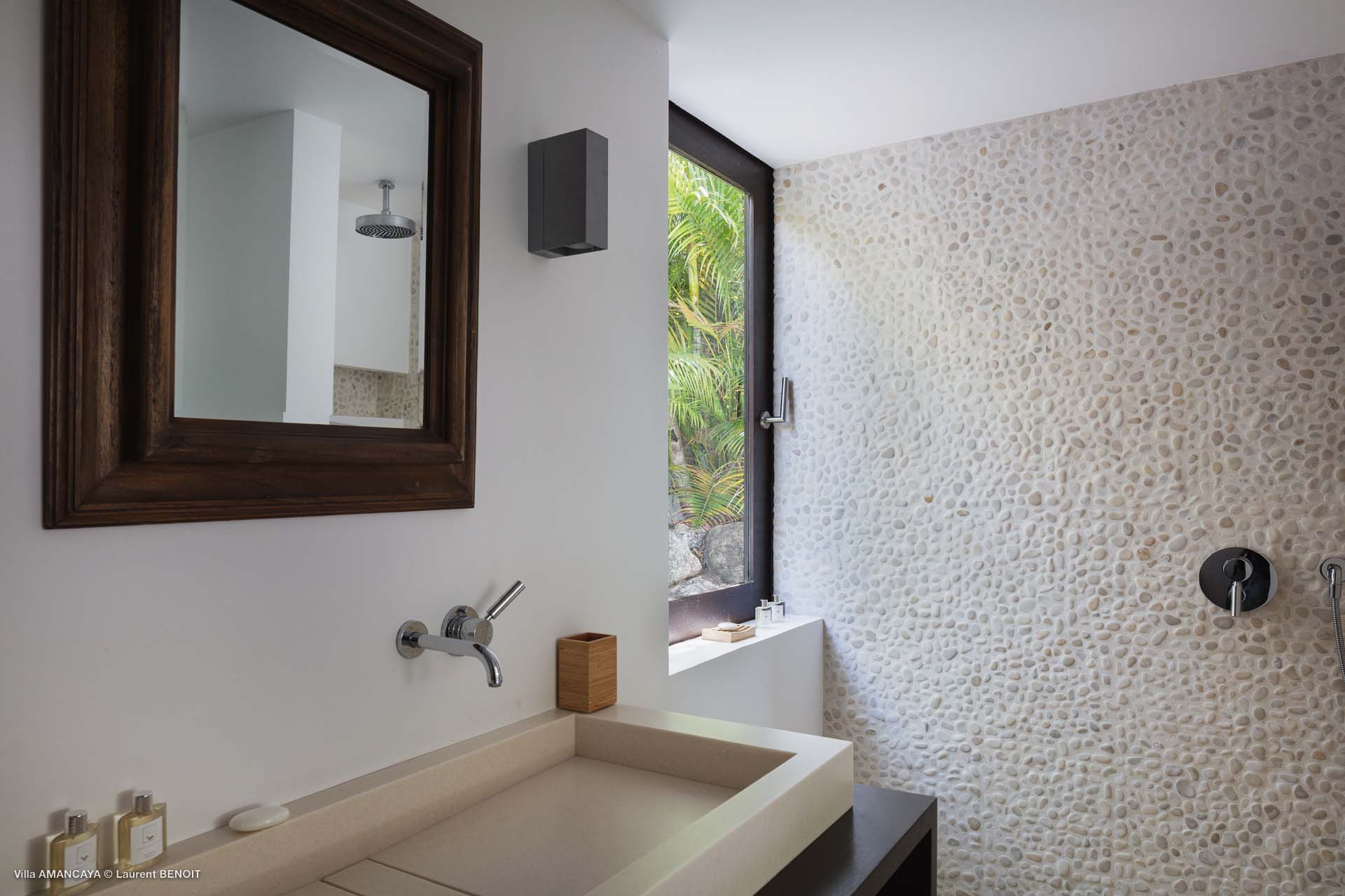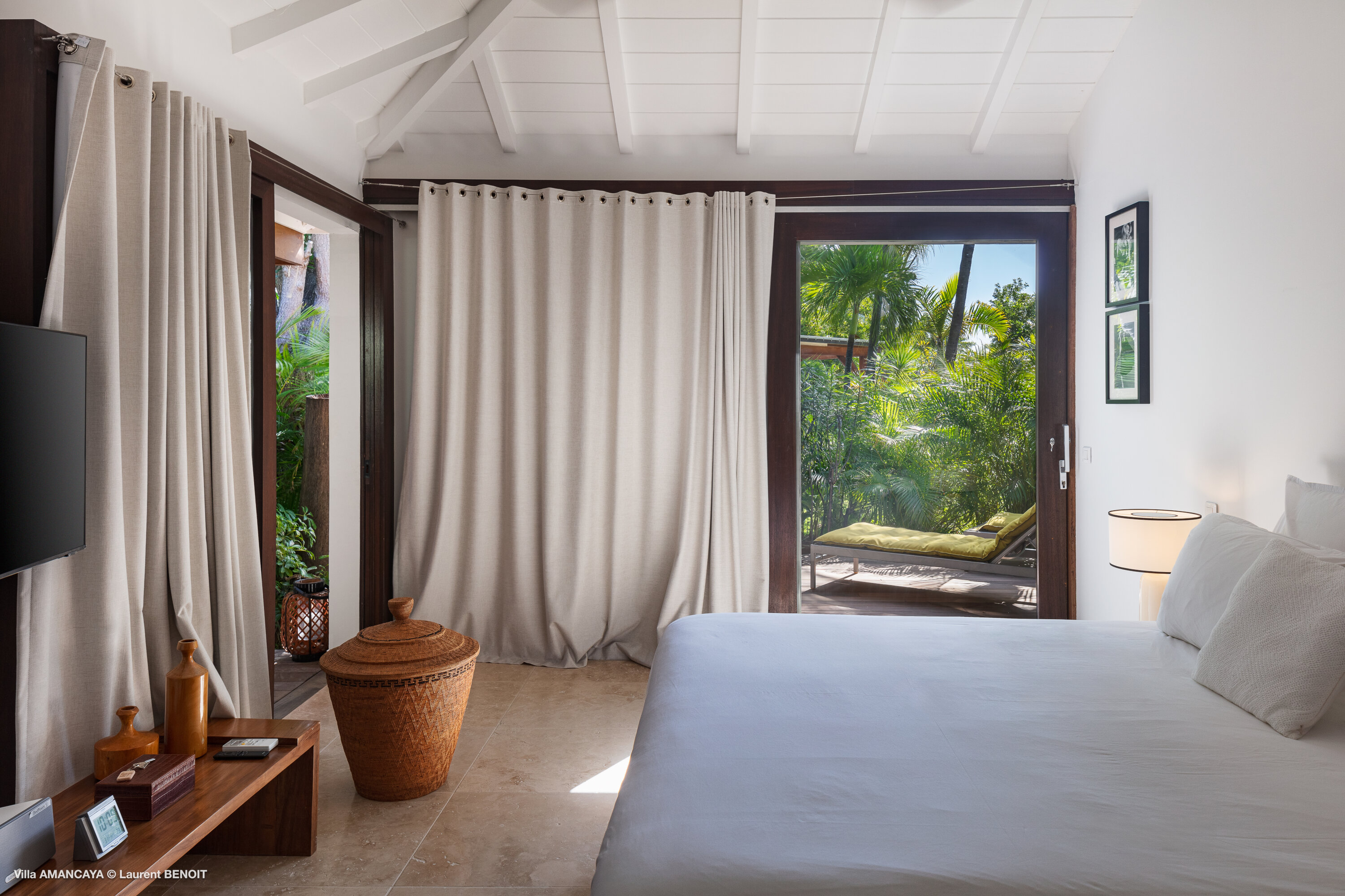 Castaway to Villa Amancaya (villa code: WV KAY), a luxurious 6-bedroom villa located in Anse des Cayes, St. Barts. This private, hillside property has breathtaking views within minutes of several beaches, shopping, and incredible restaurants. A private and luxurious getaway, Villa Amancaya is St. Barts at its very best. The rustic and high-end interiors combine a laid-back island style with an Oriental influence, while outside, the views are incredible. Decorated with lavender and teak accents, this is an oasis of peace and quiet for you to enjoy a laid-back vacation in St. Barts. Nestled within a lush garden above Anse de Cayes, Villa Amancaya is a fantastic choice for a large family gathering or group of friends traveling together. The beach is a short drive away, as are St. Jean and Gustavia, both offering fantastic dining options. This is a villa made for a carefree getaway in St. Barts. Spread across the main house and several bungalows, Villa Amancaya offers plenty of space to come together as a group or find some solitude. In the main house, there’s a decadent mix of Caribbean style and Zen-like décor. The living room has a large L-shaped sofa and opens to the pool and view. Shelves behind the sofa feature a range of interesting décor, from coffee table books to elegant vases and ornate teapots. The room takes advantage of the view, with the incredible deep blues of the Caribbean Sea drawing your gaze. Next to the living room is Villa Amancaya’s well-equipped kitchen. From easy snacks to gourmet island dinners, this space makes it easy to prepare meals during your stay. Our concierge can even organize private chefs to cater a meal or two, leaving you to enjoy a sunset drink and aperitif while you wait. There are two dining areas to choose from, both outside so you can pair your food with the dazzling views. One sits next to the pool under the covered terrace, while the other is closer to the edge, underneath a shaded gazebo. Both make it easy to entertain. There’s a total of 6 bedrooms spread across Villa Amancaya, providing privacy between guests. In the main building are three bedrooms, each with a king-sized bed and ensuite bathroom with shower. One faces the pool, while the other opens to the villa’s garden with a fountain. Two more bedrooms are in separate bungalows, both with a king-sized bed and ensuite bathroom. The 6th bedroom is located at the rear of the garden in another guest cottage, featuring a king or 2 twin beds and ensuite bathroom. The outdoor spaces at Villa Amancaya are a highlight of this property. There’s a carefree and idyllic feel to the terraces, made from gorgeous natural wood and bordered by lush palms and tropical plants. The covered terrace has several seating areas, and wonderful spots to kick back with a cool drink and gaze out at the yachts in the bay. Steps lead down to the swimming pool, refreshing and cool in the heat of the day. Loungers for sunbathing line the water, ideal places to settle in with a book or drift off to sleep with the breeze rustling through the garden. At the end of the pool is another gazebo, this one with an open-air fitness room and a spot for decadent massages. The interior garden is another relaxing spot to kick back, a Zen-like space to disconnect from the rushes of modern life. Villa Amancaya has a range of high-end amenities to help you relax during your stay. During the December holidays, the villa rents at the full occupancy rate regardless of how many bedrooms are used.Please fill out the form to begin your inquiry and we will connect you with a seasoned villa rental specialist.