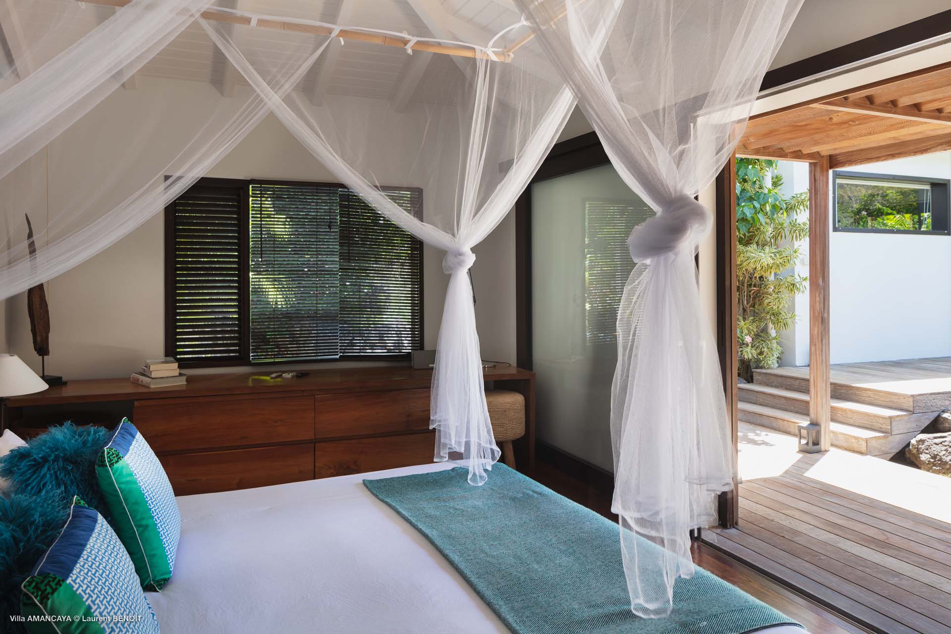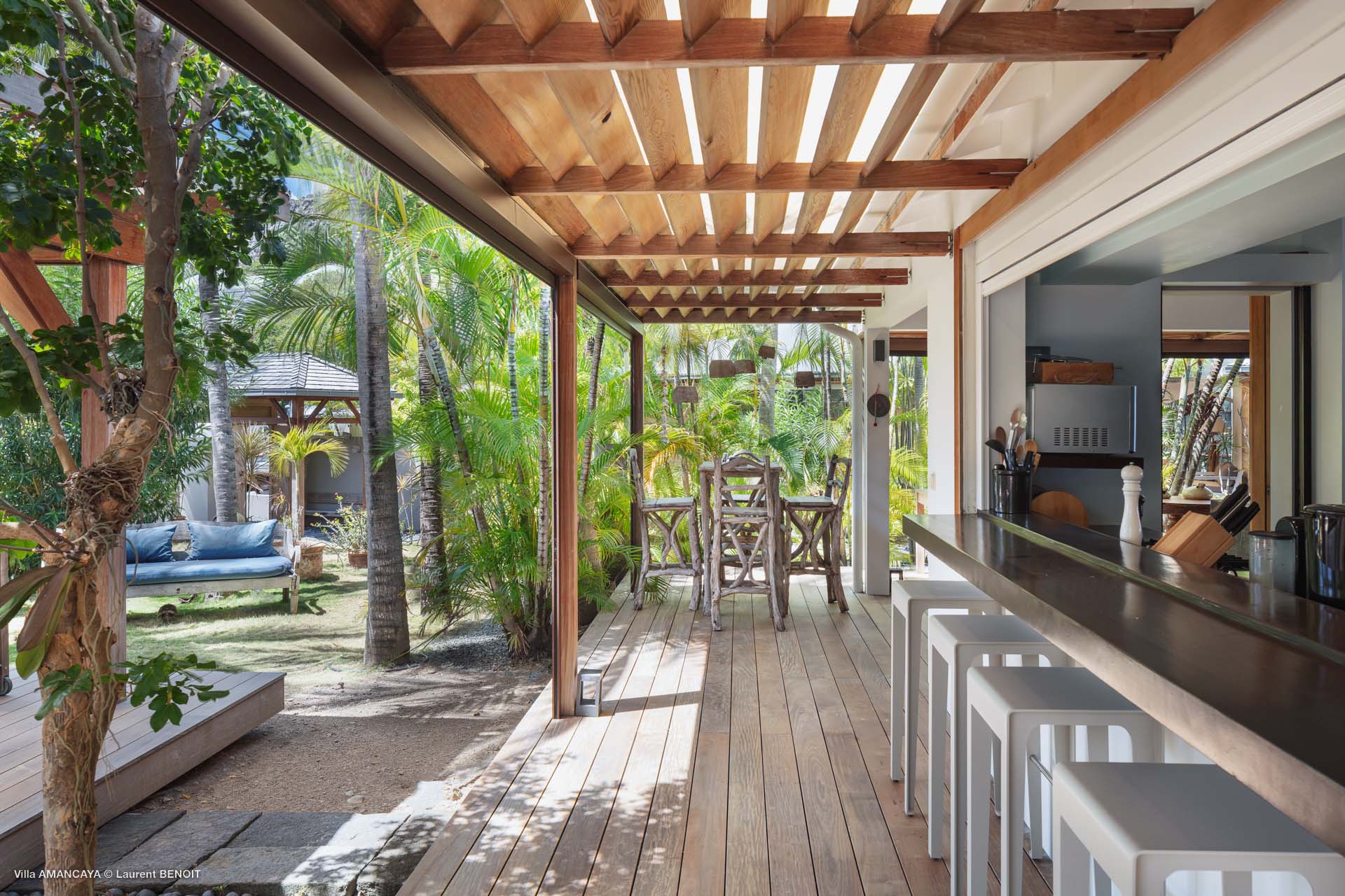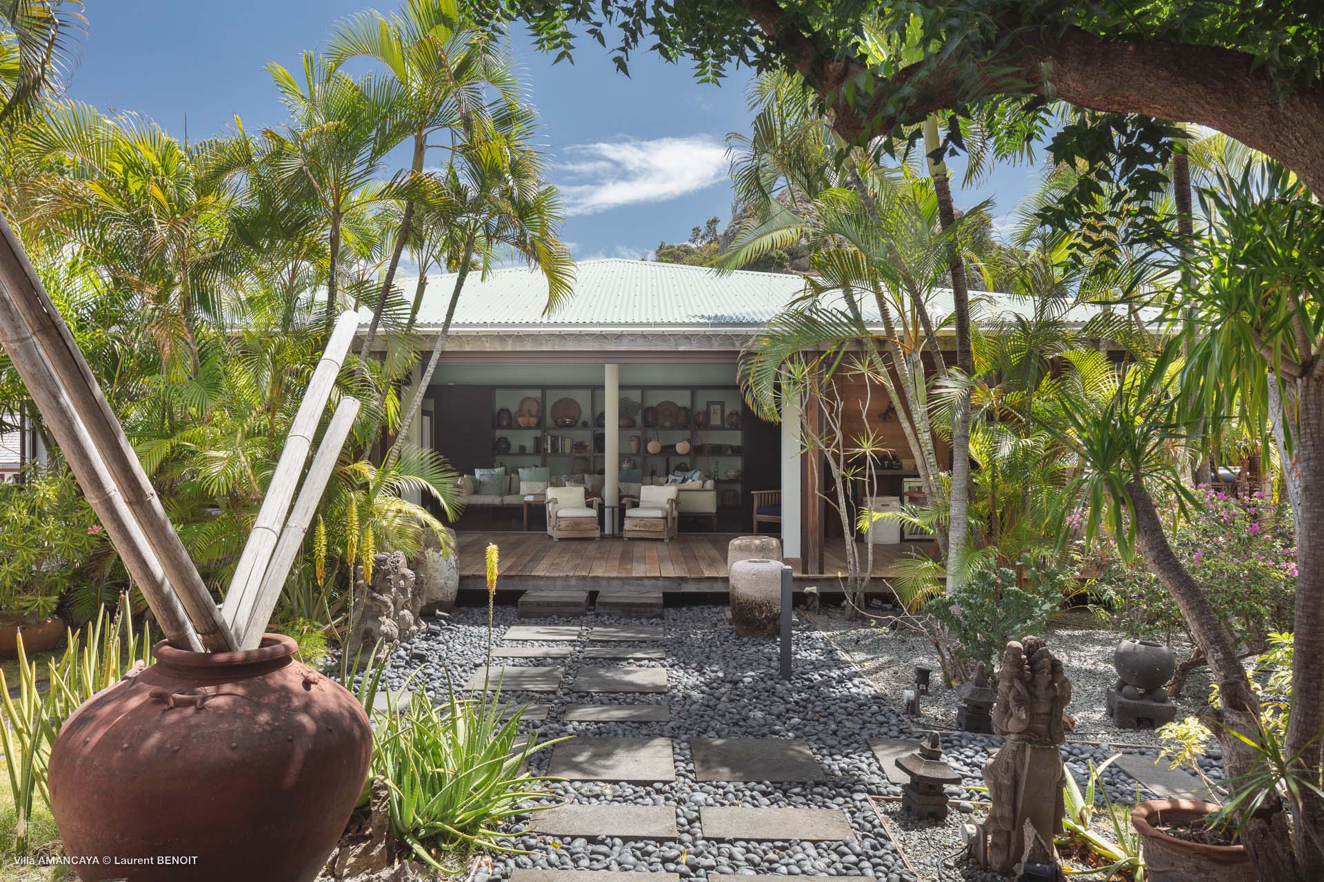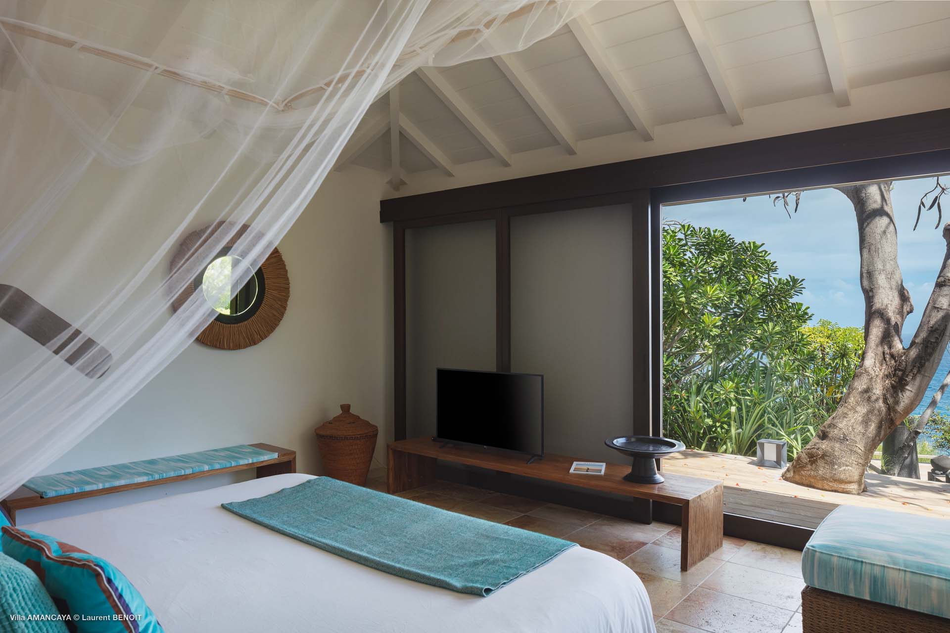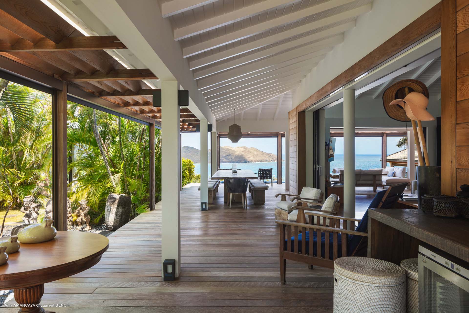 Castaway to Villa Amancaya (villa code: WV KAY), a luxurious 6-bedroom villa located in Anse des Cayes, St. Barts. This private, hillside property has breathtaking views within minutes of several beaches, shopping, and incredible restaurants. A private and luxurious getaway, Villa Amancaya is St. Barts at its very best. The rustic and high-end interiors combine a laid-back island style with an Oriental influence, while outside, the views are incredible. Decorated with lavender and teak accents, this is an oasis of peace and quiet for you to enjoy a laid-back vacation in St. Barts. Nestled within a lush garden above Anse de Cayes, Villa Amancaya is a fantastic choice for a large family gathering or group of friends traveling together. The beach is a short drive away, as are St. Jean and Gustavia, both offering fantastic dining options. This is a villa made for a carefree getaway in St. Barts. Spread across the main house and several bungalows, Villa Amancaya offers plenty of space to come together as a group or find some solitude. In the main house, there’s a decadent mix of Caribbean style and Zen-like décor. The living room has a large L-shaped sofa and opens to the pool and view. Shelves behind the sofa feature a range of interesting décor, from coffee table books to elegant vases and ornate teapots. The room takes advantage of the view, with the incredible deep blues of the Caribbean Sea drawing your gaze. Next to the living room is Villa Amancaya’s well-equipped kitchen. From easy snacks to gourmet island dinners, this space makes it easy to prepare meals during your stay. Our concierge can even organize private chefs to cater a meal or two, leaving you to enjoy a sunset drink and aperitif while you wait. There are two dining areas to choose from, both outside so you can pair your food with the dazzling views. One sits next to the pool under the covered terrace, while the other is closer to the edge, underneath a shaded gazebo. Both make it easy to entertain. There’s a total of 6 bedrooms spread across Villa Amancaya, providing privacy between guests. In the main building are three bedrooms, each with a king-sized bed and ensuite bathroom with shower. One faces the pool, while the other opens to the villa’s garden with a fountain. Two more bedrooms are in separate bungalows, both with a king-sized bed and ensuite bathroom. The 6th bedroom is located at the rear of the garden in another guest cottage, featuring a king or 2 twin beds and ensuite bathroom. The outdoor spaces at Villa Amancaya are a highlight of this property. There’s a carefree and idyllic feel to the terraces, made from gorgeous natural wood and bordered by lush palms and tropical plants. The covered terrace has several seating areas, and wonderful spots to kick back with a cool drink and gaze out at the yachts in the bay. Steps lead down to the swimming pool, refreshing and cool in the heat of the day. Loungers for sunbathing line the water, ideal places to settle in with a book or drift off to sleep with the breeze rustling through the garden. At the end of the pool is another gazebo, this one with an open-air fitness room and a spot for decadent massages. The interior garden is another relaxing spot to kick back, a Zen-like space to disconnect from the rushes of modern life. Villa Amancaya has a range of high-end amenities to help you relax during your stay. During the December holidays, the villa rents at the full occupancy rate regardless of how many bedrooms are used.Please fill out the form to begin your inquiry and we will connect you with a seasoned villa rental specialist.