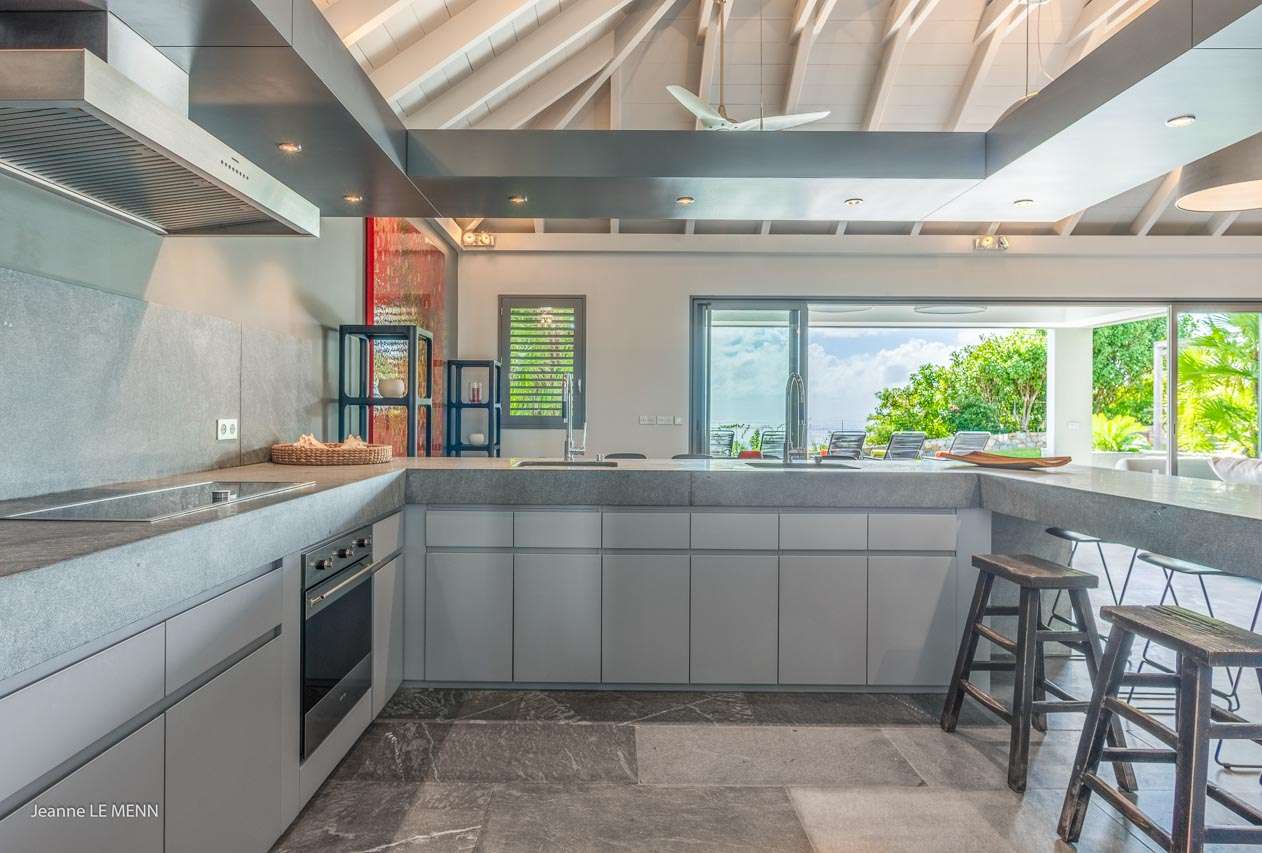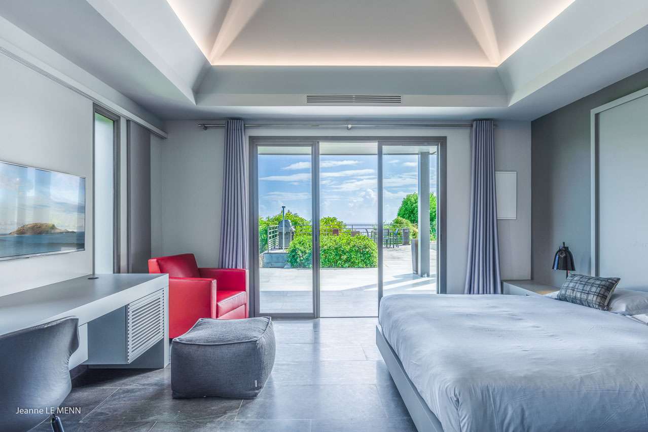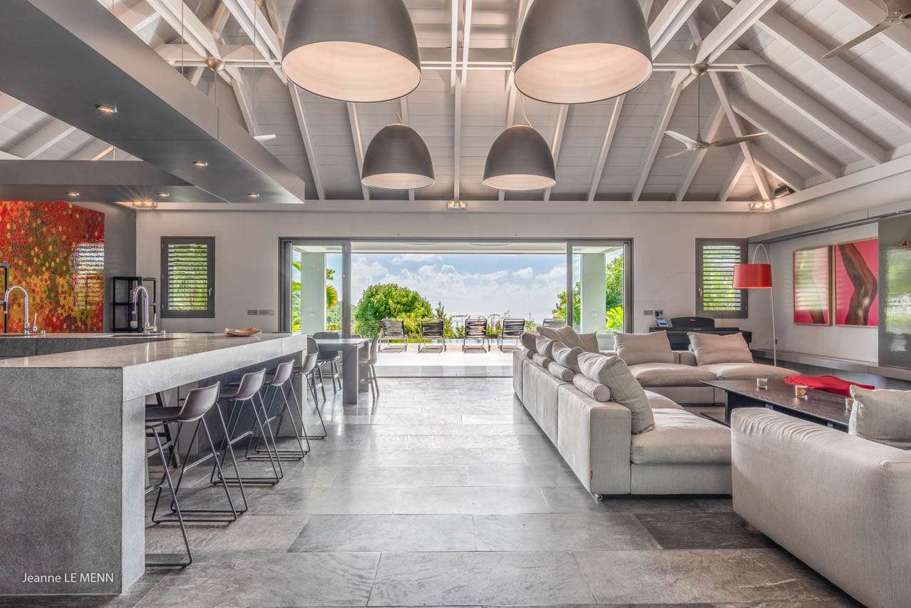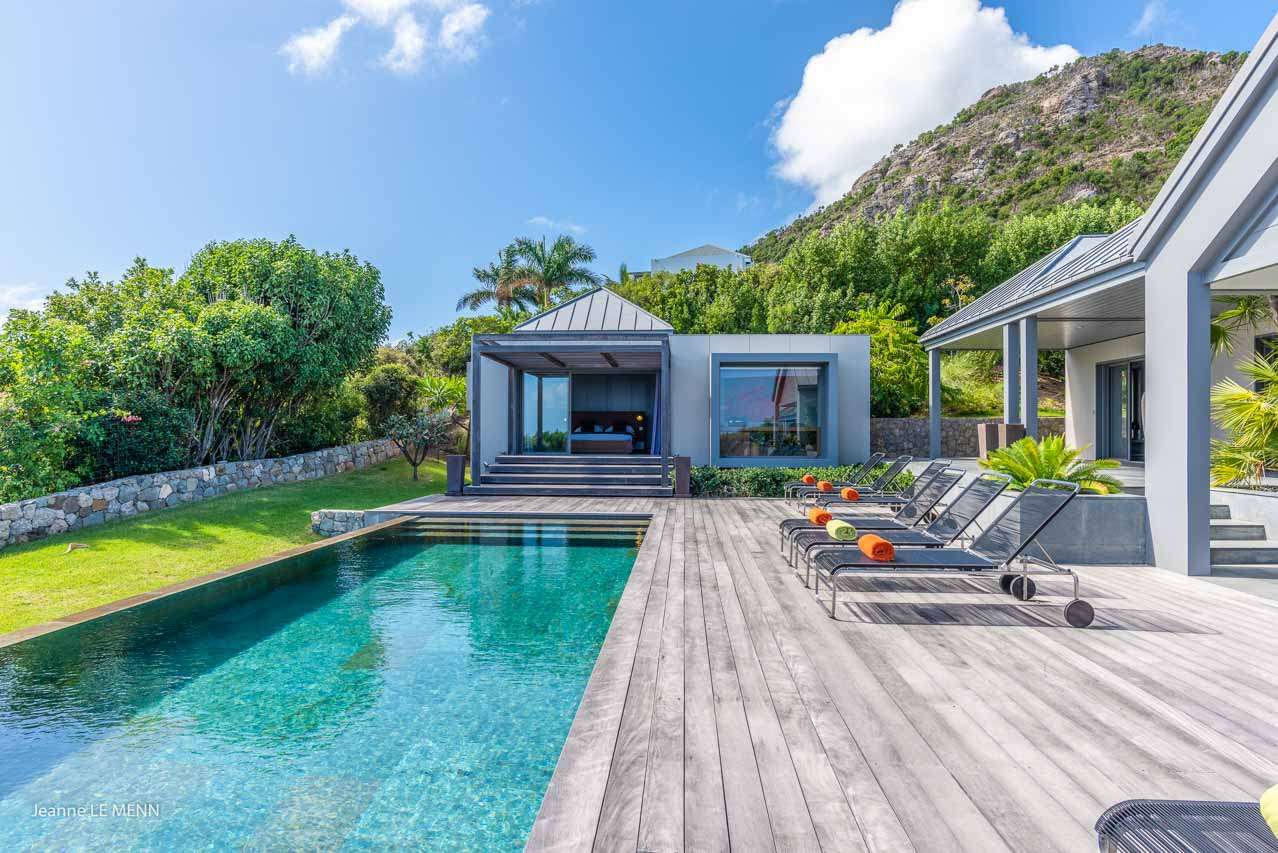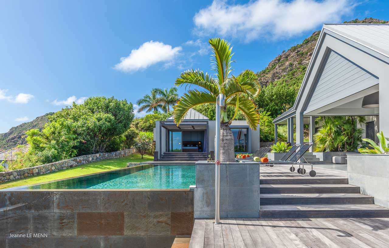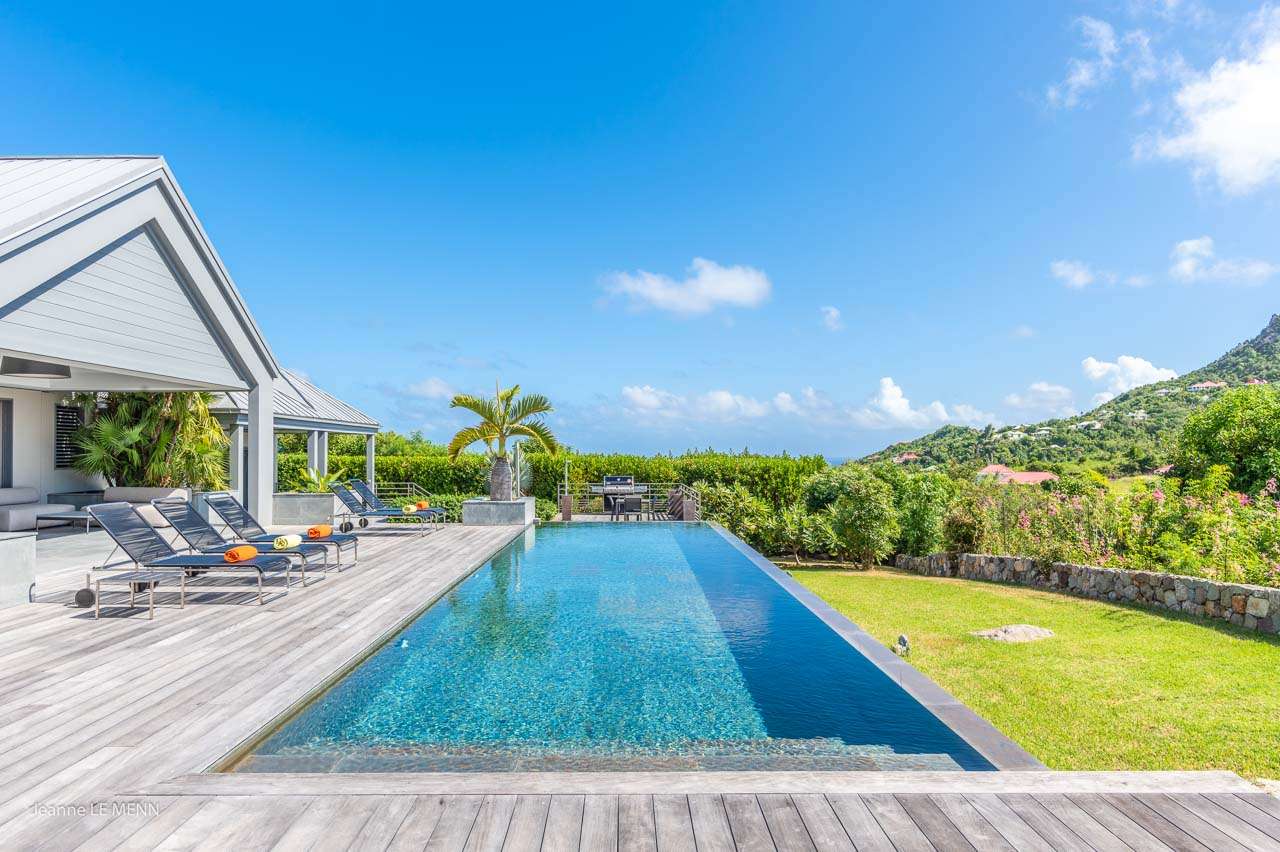 Welcome to Villa Angel (villa code: WV AVV), a stunning 6-bedroom villa in Vitet, St. Barts. Airy, contemporary, and with gorgeous ocean views, this is a sophisticated island villa equally suited for large groups of friends or a family trip. The expansive interiors at Villa Angel are modern and elegant, with hues of gray, white, and brown creating a fabulous backdrop for a wonderful collection of vibrant artworks. Awash with the Caribbean breeze and natural light, this home is brimming with smart features and a beautiful design – an idyllic choice for a Caribbean getaway. Nestled in the hills high above Grand Fond, Villa Angel enjoys fantastic views over the southeast corner of St. Barts. Private, quiet, and comfortable, this luxurious St. Barts villa is a 5-minute drive from the beach and around 10 minutes to shops and restaurants. Plenty of space both inside and out at Villa Angel makes this a dreamy choice for a stay in St. Barts. There are plenty of seating options in sun and shade, a spacious main room, and bedrooms all nearly equal in size. Outside, lush palms sway in the island breeze. The large great room features the living room, dining area, and kitchen. An array of large ceiling fans and chic light fixtures hang down from the ceiling, while the hues of contemporary gray contrast with the punchy artwork. A large sectional sofa at one end next to the entertainment unit is a great spot to relax or watch a movie with your entire group. Ocean breezes wash through Villa Angel’s kitchen, a spacious room that lets you turn cooking into a social affair. You could gather at the long breakfast bar for cocktails while you prepare a meal, or let our concierge arrange a professional chef for an evening and enjoy watching them work their magic. Next to the kitchen is a large dining table, a fabulous setting for meals with family and friends. There’s seating for up to 12 here. There are four bedrooms just off the main room, with two on each side. Each of these rooms has a Euro king-sized bed, an ensuite bathroom, large closets, and TVs with U.S. satellite channels. The luxurious ensuites also come with both indoor and outdoor showers. The master bedroom is in a separate bungalow at one end of the pool, accessed through a door off the main terrace. This space features a Euro king-sized bed, his-and-her closets, a large ensuite with a shower and a bath, and a private office space. The sixth and final bedroom is in another separate bungalow, this one next to the entrance to Villa Angel. This space is more suited to staff or teenagers, but can also accommodate a sixth couple. There’s either a king-sized bed or a pair of twins, a separate kitchenette with a fridge, an ensuite bathroom, and a private garden terrace. The clean and beautiful design of Villa Angel extends to its outdoor living spaces, where you can kick back with a cool drink and gaze out at the sparkling Caribbean. There are no other villas within view from this lofty vantage point; you’ll feel as if you have the island to yourself. On the covered terrace area, a low-slung chaise lounge is ideal for reading, relaxing, or hosting a sunset cocktail hour. Sunseekers will love the loungers that line the pool, letting you bask in the island rays between refreshing dips in the water. There’s also a grill area for island-style cookouts, an outdoor shower, and a lush lawn area for more leisurely days spent relaxing outside. * Note - €200 key deposit per room, will be refunded if all keys are returned.Please fill out the form to begin your inquiry and we will connect you with a seasoned villa rental specialist.