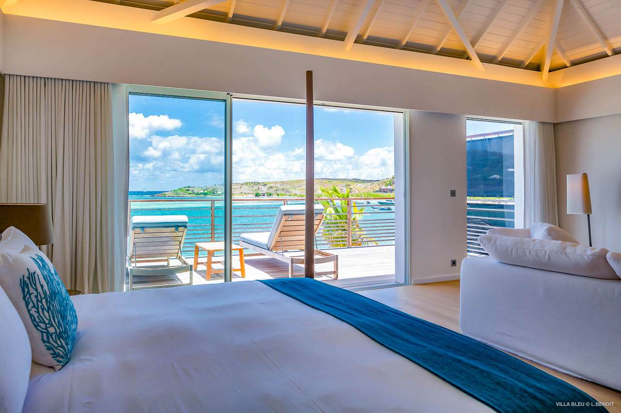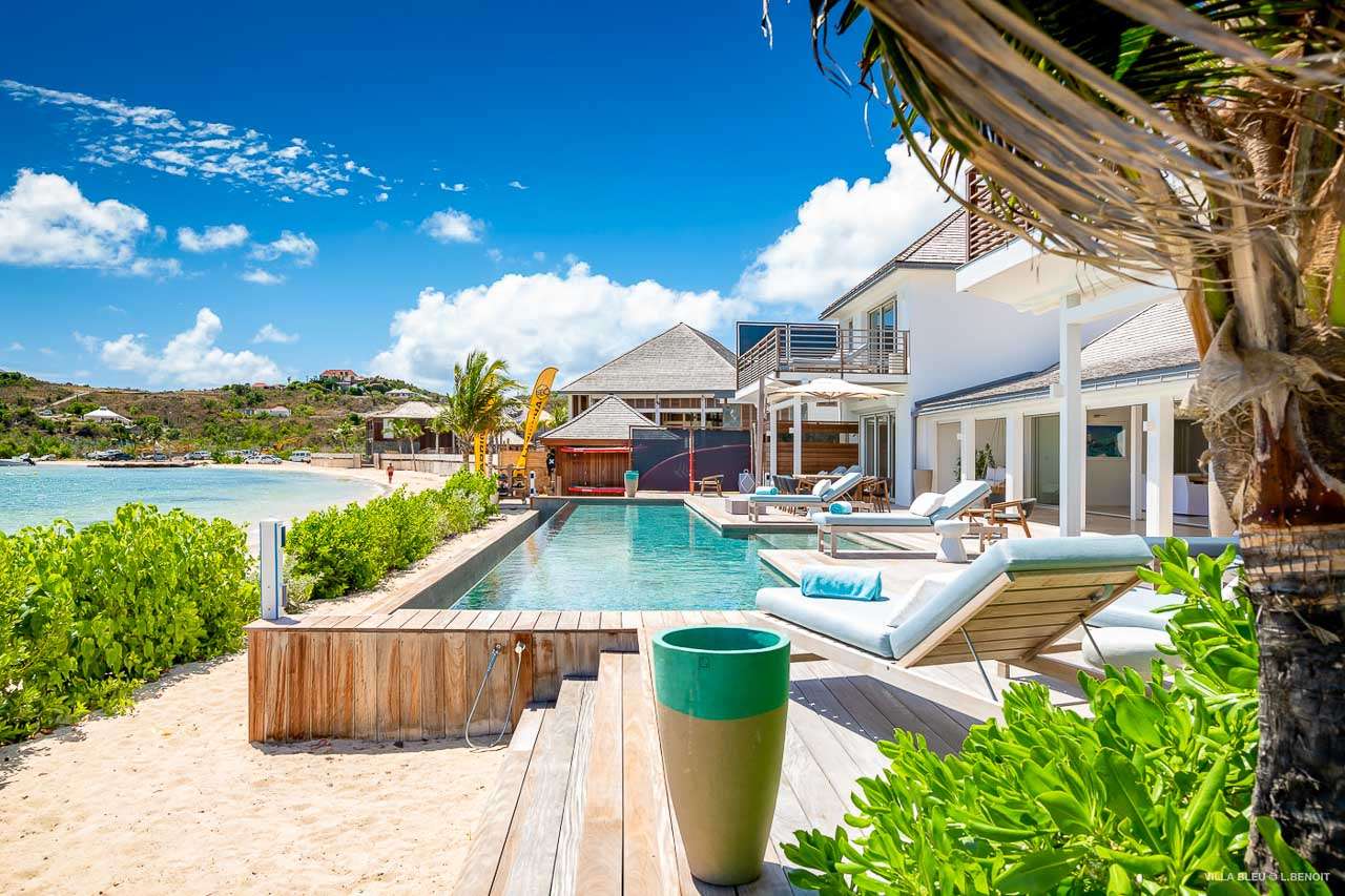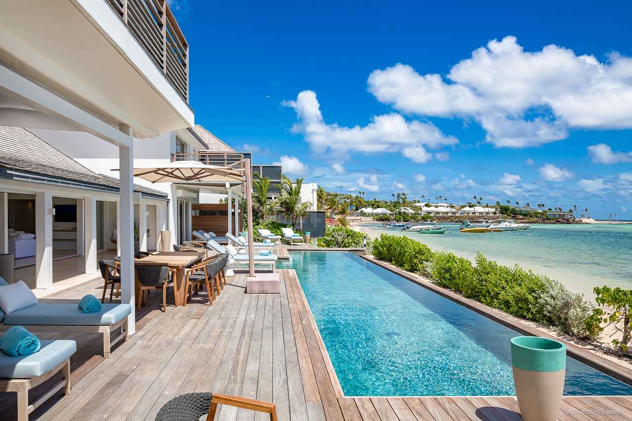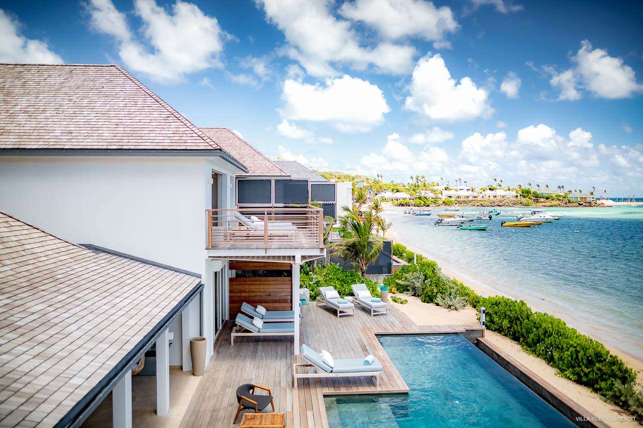 Castaway to Villa Aqua (villa code: WV AQA), a modern 6-bedroom villa in Grand Cul de Sac, St. Barts. This waterfront villa enjoys a fantastic location next to the new Barthelemy Hotel within steps of the beach and a short walk from restaurants. Bright and airy interiors inside Villa Aqua are a peaceful retreat from the rushes of modern life. The clean island design features an open-plan layout, filled with natural light and playful breezes blowing in from the Caribbean. Minimalist, contemporary, and with plenty of cool spots to relax, this is a fabulous choice for a beachfront getaway in St. Barts. Nestled on the shores of the beach at Grand Cul de Sac, Villa Aqua enjoys a fantastic location on St. Barts. Within walking distance are plenty of 5-star hotel restaurants, bars, and shops. St. Jean is a 10-minute drive, and the capital Gustavia is only 5 minutes further. Open and breezy, Villa Aqua can open on several sides to enjoy the full effect of the ocean breeze. Doors and windows frame incredible views of the cerulean-blue sea, with a range of comfortable furnishings for everyone to kick back and unwind. The central great room is the heart of the home, an idyllic and luxurious setting for gathering with family and friends. The oversized living room enjoys several soft sofas, with some facing the view and others facing the entertainment center. A dining area separates the living room from a well-equipped gourmet kitchen, which is suitable for hosting large parties. A second, connected preparation kitchen is equipped with a large refrigerator and wine cooler. With both, you’ll have no trouble preparing fantastic meals during your stay. The large indoor dining table is a relaxed and casual spot to enjoy a meal, a highlight of any stay. There’s also a lovely alfresco dining table, coaxing you to dine outside with the fading afternoon sending rosy gold colors arcing across the sky. There are 6 bedrooms inside Villa Aqua, tranquil retreats for your stay in this island paradise. Creamy, contemporary colors match with the natural wooden furnishings, while vaulted ceilings enjoy chic recessed lighting. There are two separate staircases on either end of the villa, both leading to one of the two master suites. Both enjoy king-sized beds, a dressing area, a private balcony with sea views, and an ensuite bathroom with a rain shower and a bathtub. There are four guest suites on the main floor, all with king-sized beds and ensuite bathrooms. Two enjoy ocean views, while the other two are on the garden side of the house. For more space, Villa Aqua can be rented with its sister villa, Villa Bleu (villa code: WV BLE) for a total of 12 bedrooms. Stepping outside lets you immerse yourself in the wonderful views over the Caribbean. In either direction, the gentle curve of the bay is alluring, with the striking water bordered by white sands. A large deck surrounds the swimming pool, tempting you in to cool off each day. There are several loungers lining the pool’s edge, and others nestled in the shade. Reading, enjoying a drink, or indulging in an afternoon nap are all on the menu. Mere steps away, the inviting Caribbean is the stuff of dreams. The tranquil water is crystal-clear, with the white sandy shore ideal for lounging. During the Thanksgiving and December holidays, the villa rents at full occupancy rates regardless of how many bedrooms are used.Please fill out the form to begin your inquiry and we will connect you with a seasoned villa rental specialist.