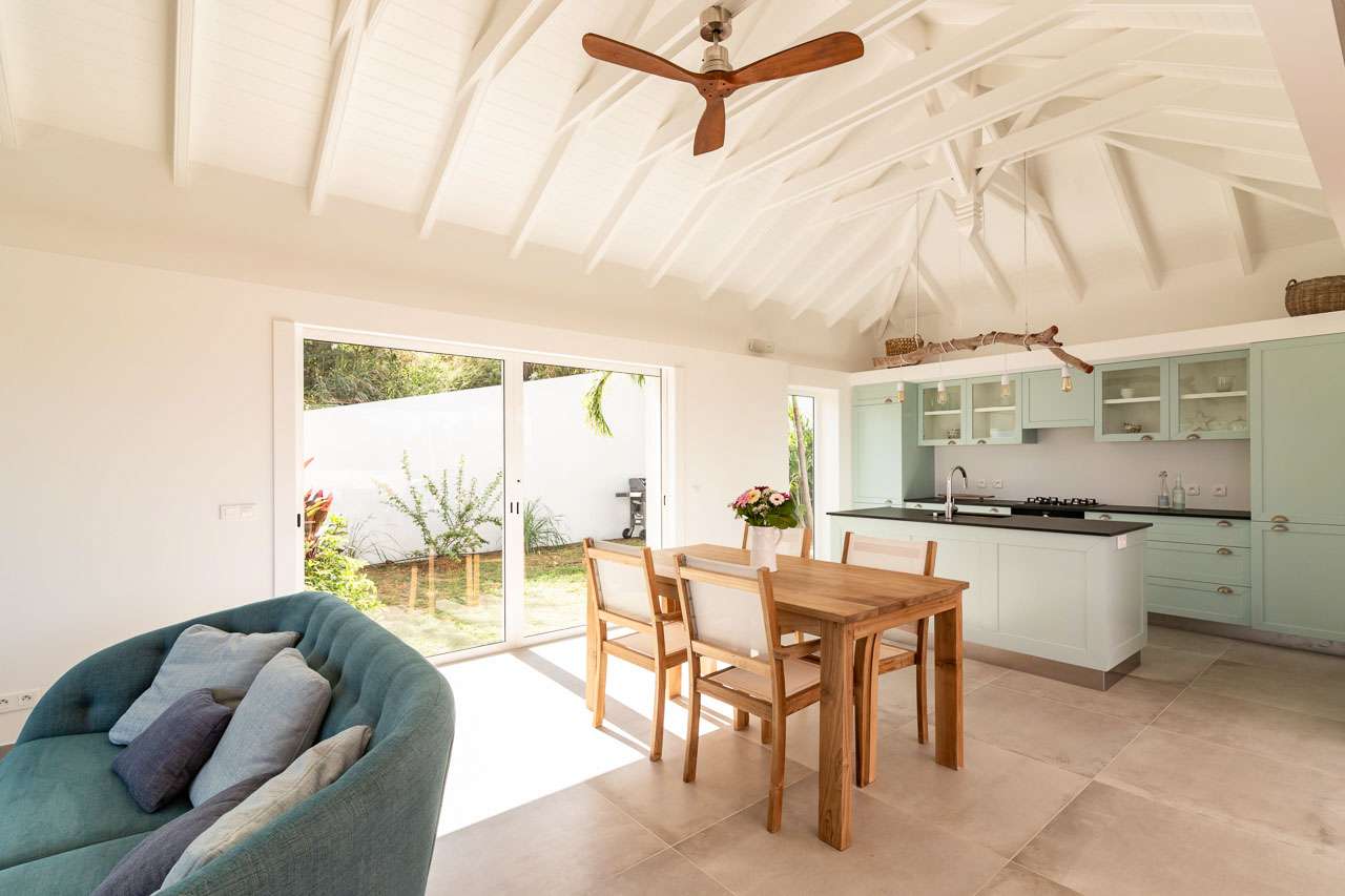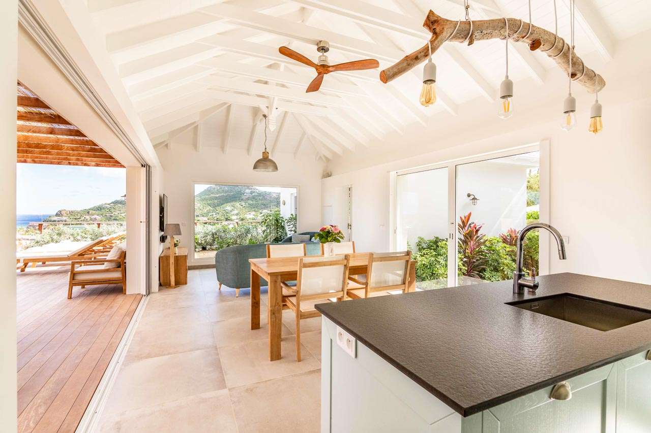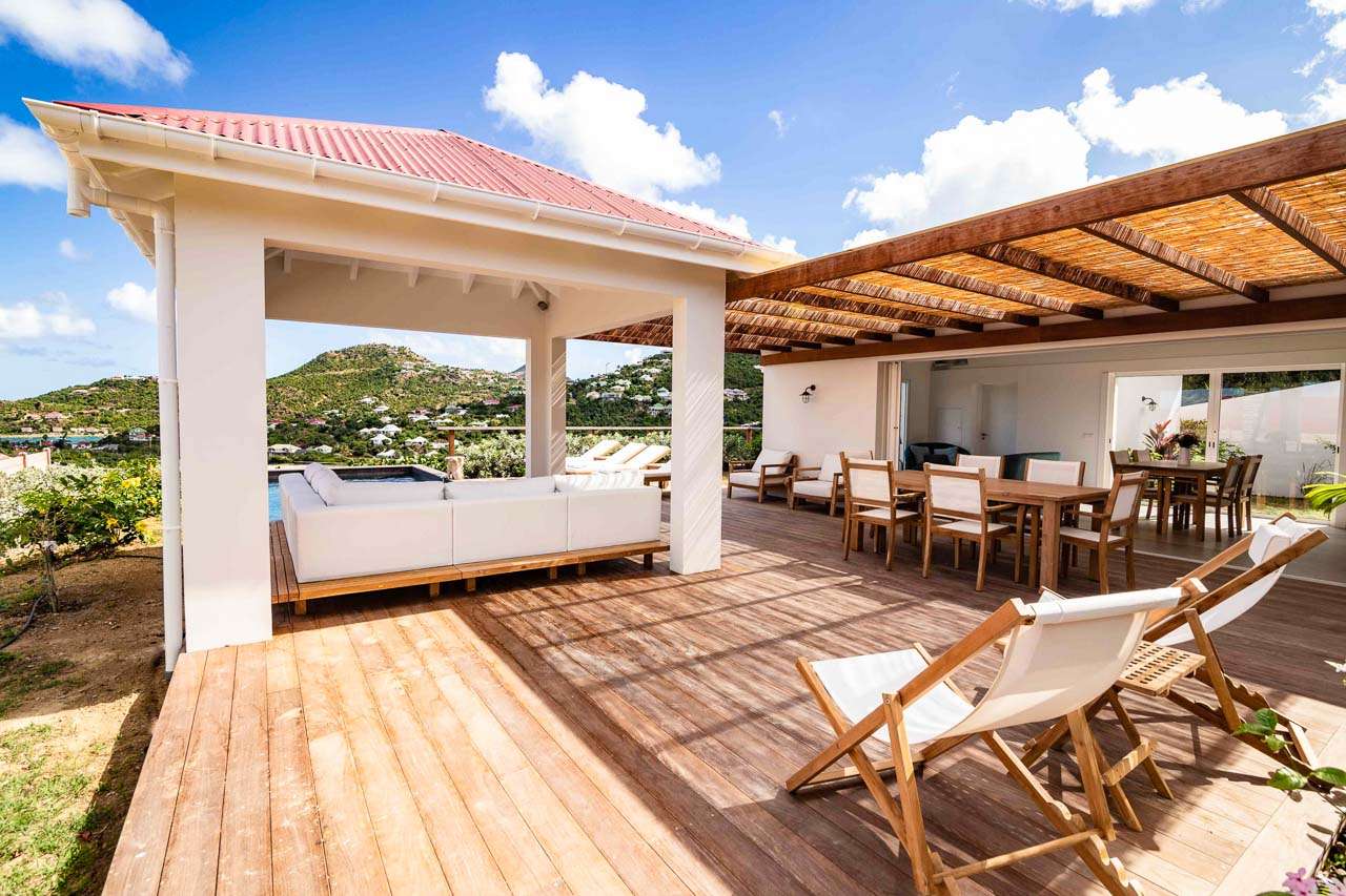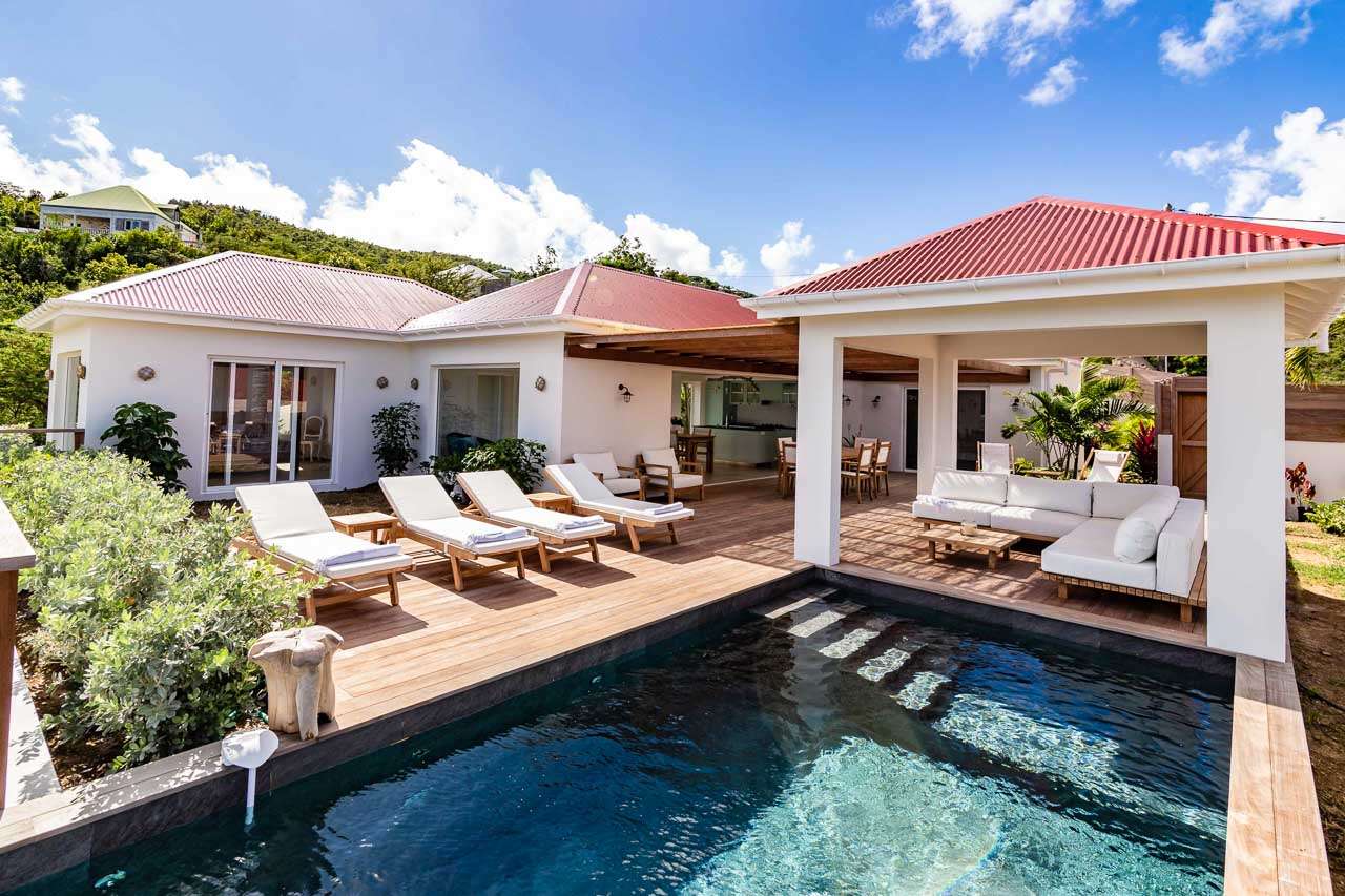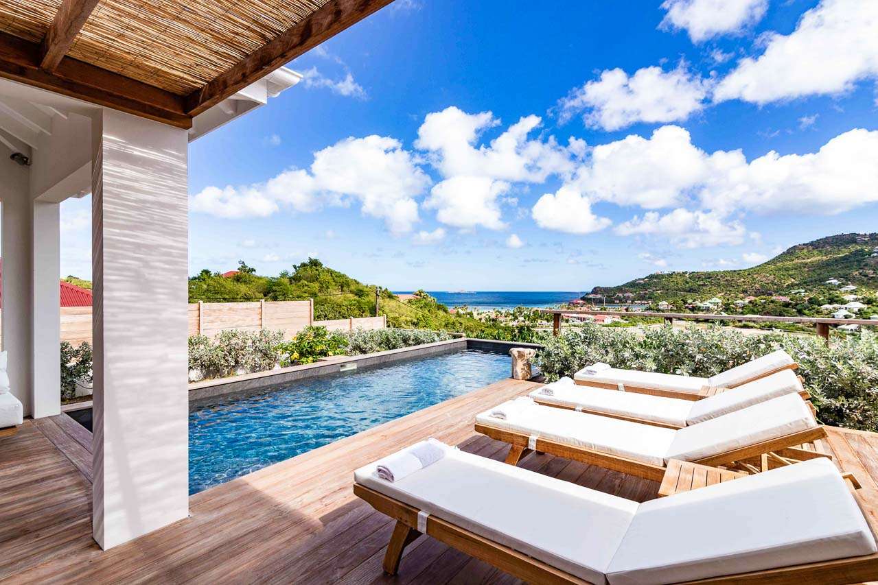 Villa Au Paille En Queuenis a newly-built, 2-bedroom villa with gorgeous views just a short distance from the beach. Sitting high on the hillside by the pond of St. Jean, Villa Au Paille En Queue benefits fully from the views, facing the Eden Rock and the sea beyond. It is just a short drive from shops, restaurants and the lively beach of St. Jean. The cozy villa has two bungalows with a large corner deck and an extended pool, surrounded by a small tropical garden. There is ample space outside for dining, lounging and sunbathing, cooled by the Caribbean breezes. A gazebo with a comfortable sectional sofa in the shade, large enough that it can also serve as a daybed, completes the outdoor space. The main, fully-screened bungalow houses a modern, open kitchen with a large island that separates the space. In the front is the living room with comfortable seating by the TV that offers U.S. satellite as well as Apple TV and a large window to benefit from the views. Connecting to the living room is the first bedroom with large windows that let in plenty of light and offer gorgeous views. It has a European king-sized bed, ensuite dressing room and bathroom with shower. The second bedroom is situated in the separate bungalow next to the entrance. This bedroom is similar to the first, but with a different color palette. Each bedroom also has Apple TV. Au Paille En Queue is an excellent villa for a family with children as well as two couples vacationing together. This Villa comes with house cleaning services six days a week, except on holidays. During the December holidays, the villa rents at the full occupancy rate regardless of how many bedrooms are used. * Note - there are two very friendly cats that like to visit from next door.Please fill out the form to begin your inquiry and we will connect you with a seasoned villa rental specialist.