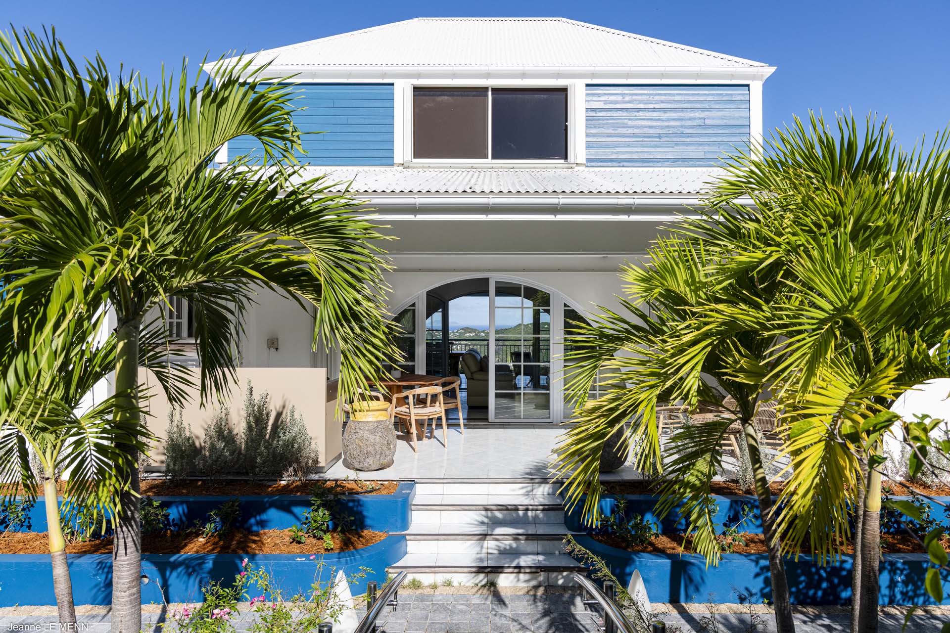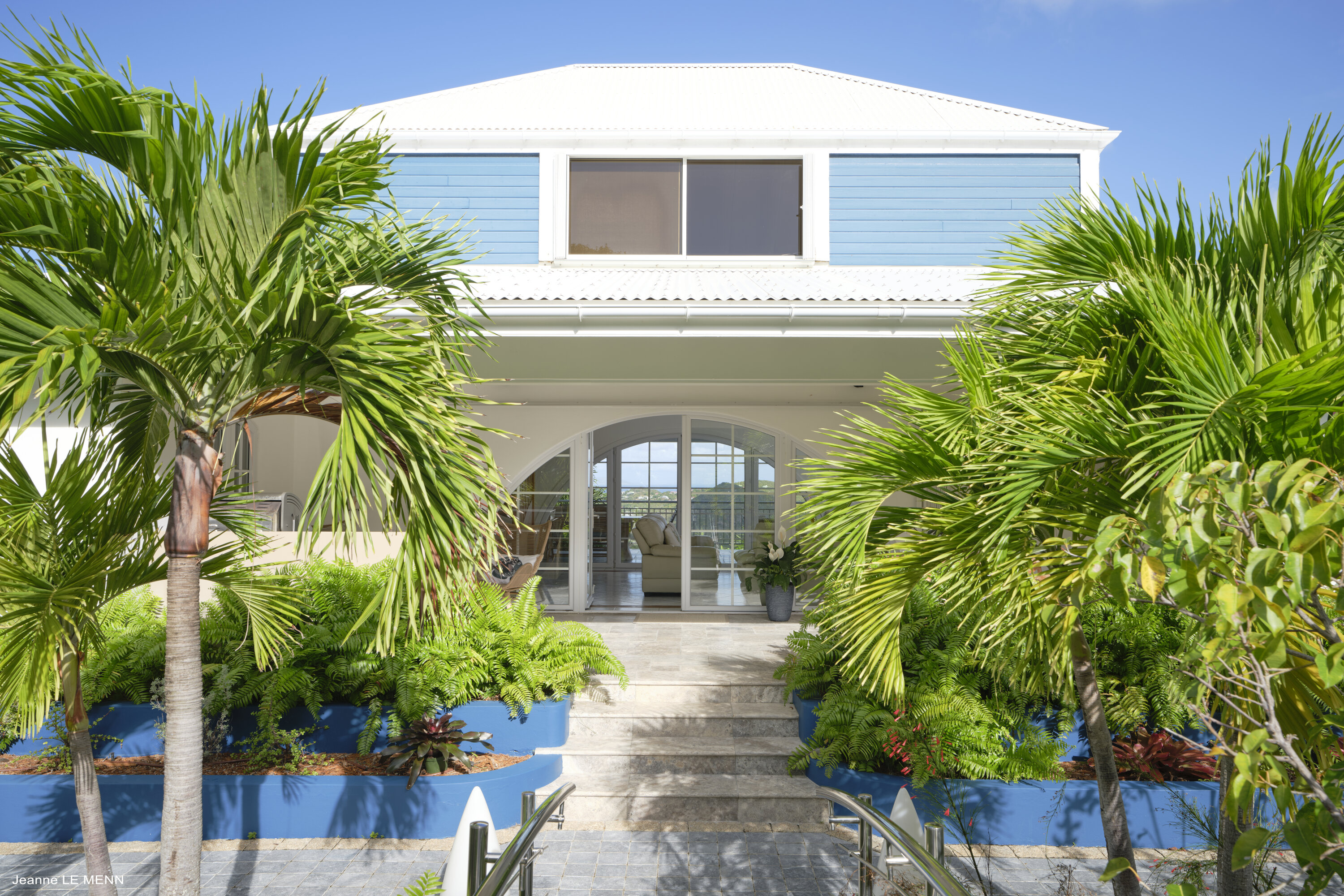 A spiral staircase leads to an upper loft level, offering even more space to unwind. Wall-to-wall windows offer incredible views on all sides, taking in the emerald landscapes and turquoise bays of St. Barts.