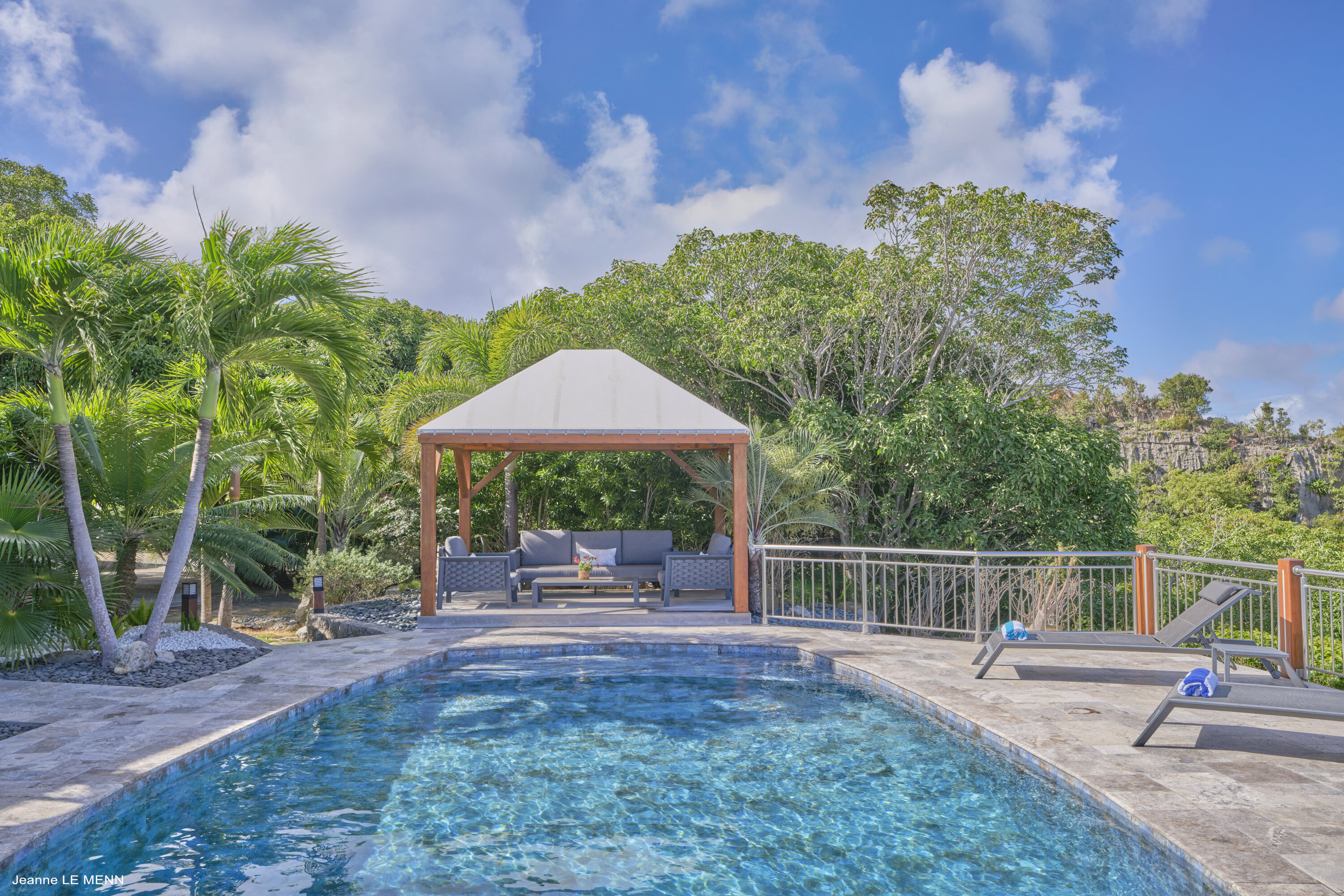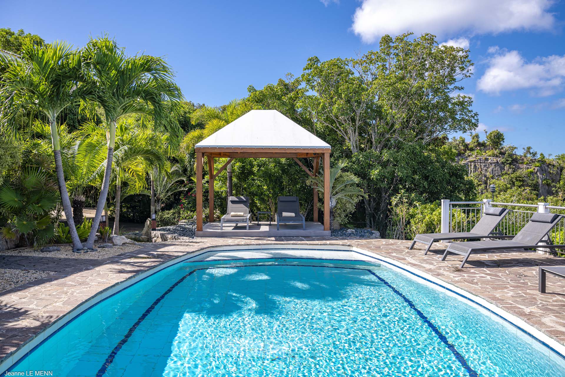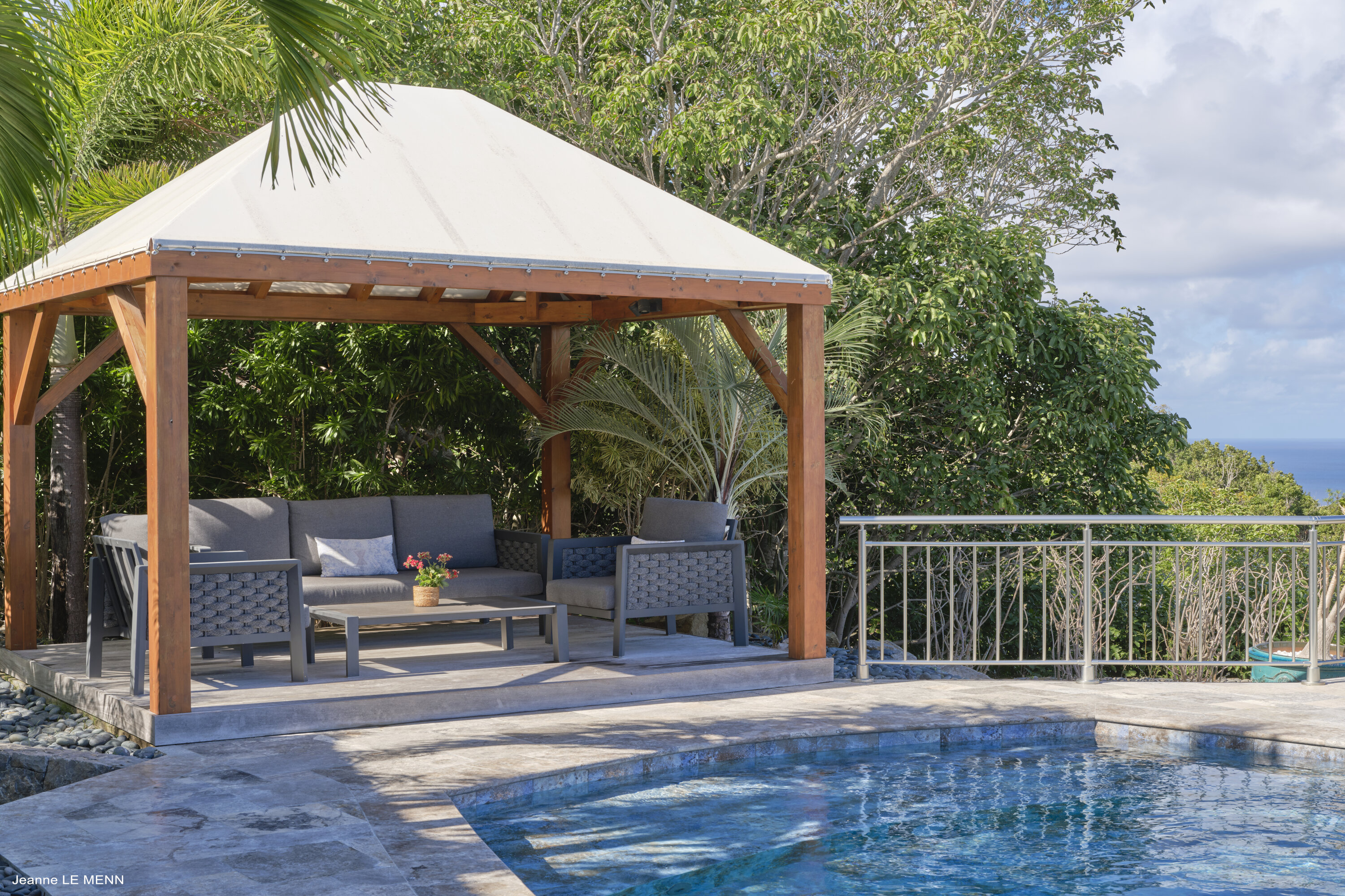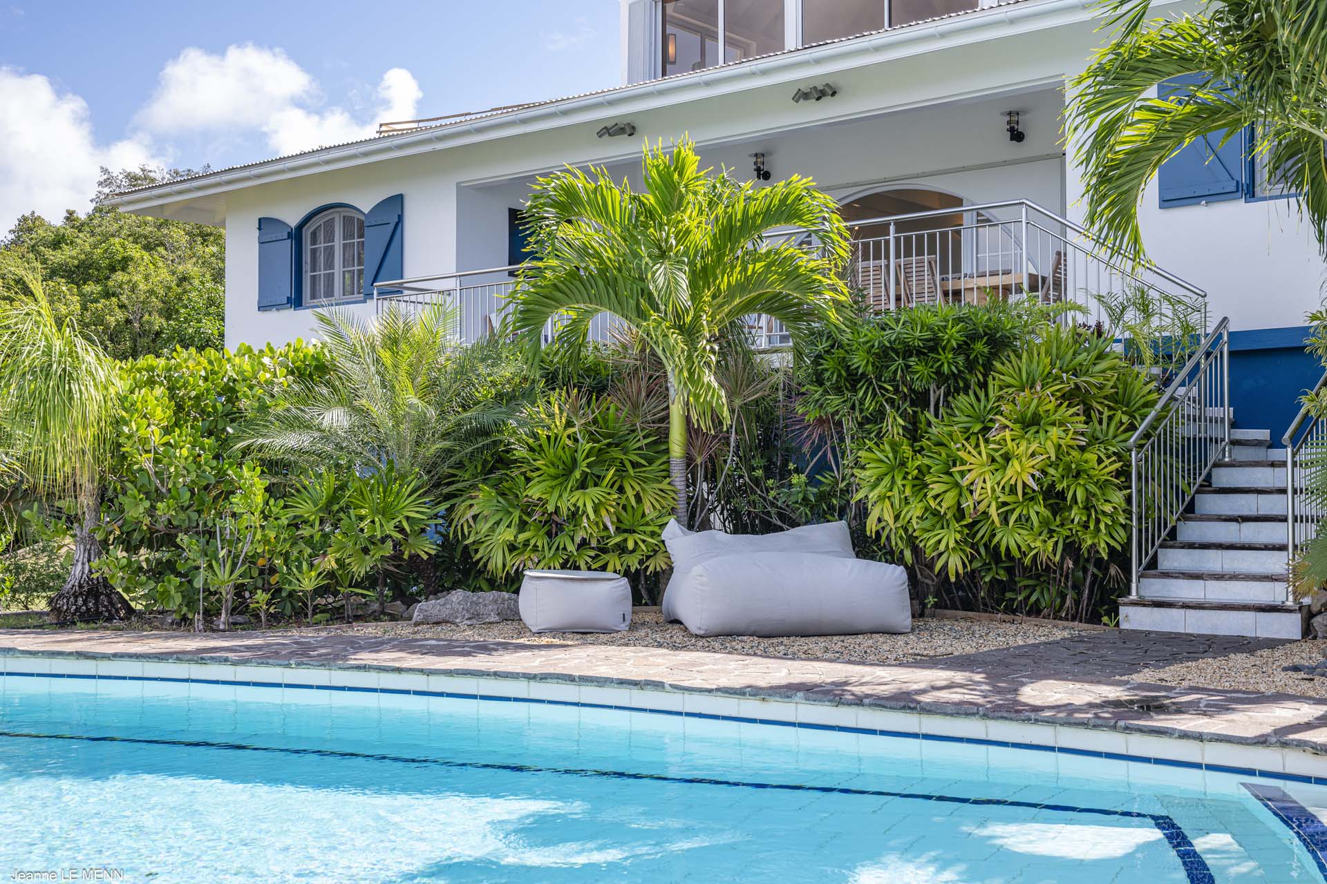 For a cool drink in the afternoon, the covered terrace out the back has a comfortable lounge as well. Steps lead down towards the generous deck with a swimming pool. Here, you can lounge all day in the sun, enjoying the views and the island breeze.