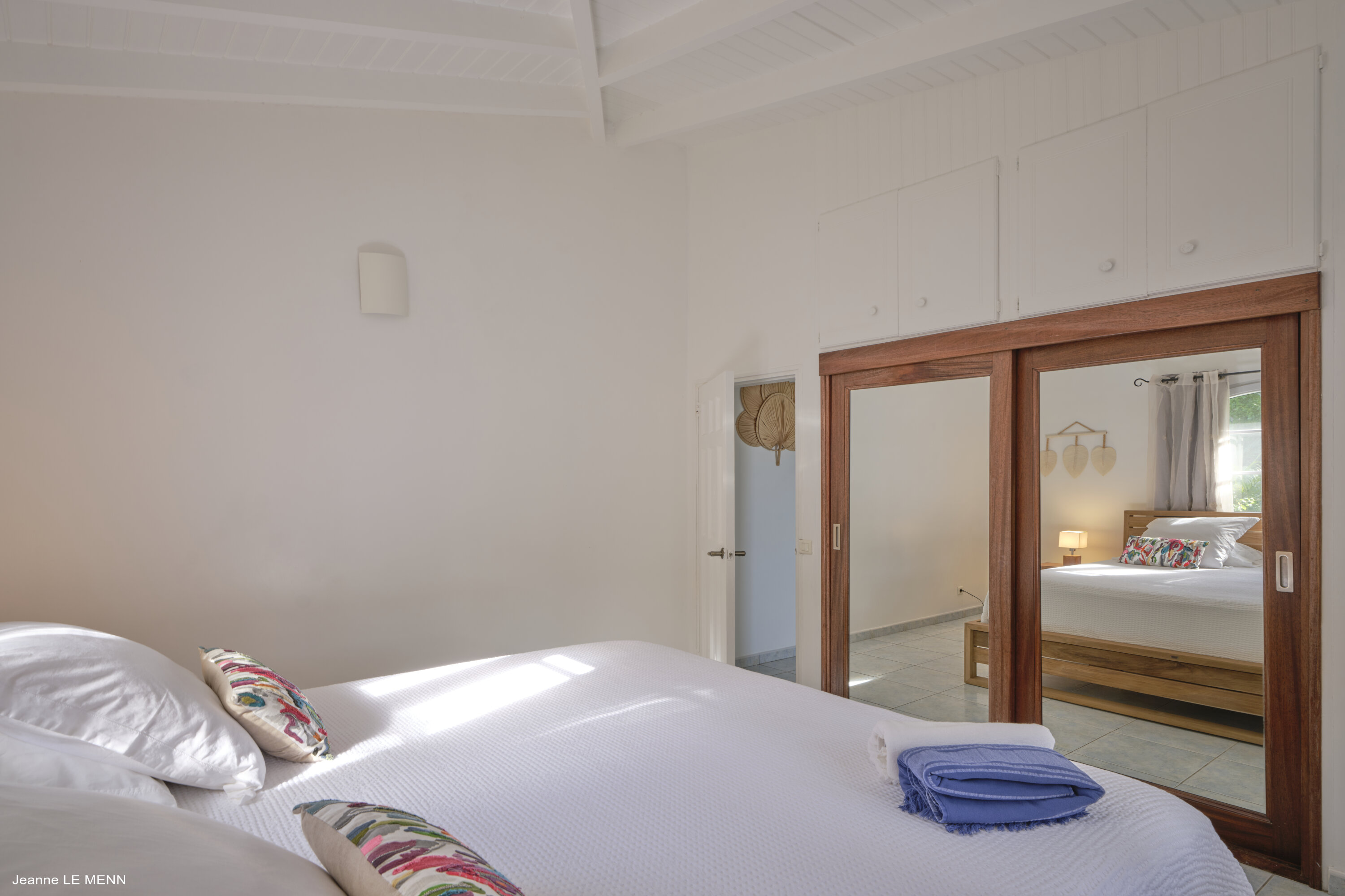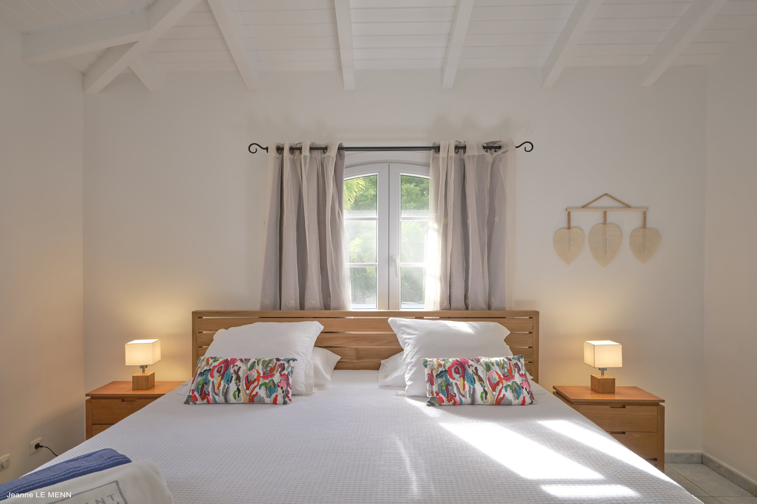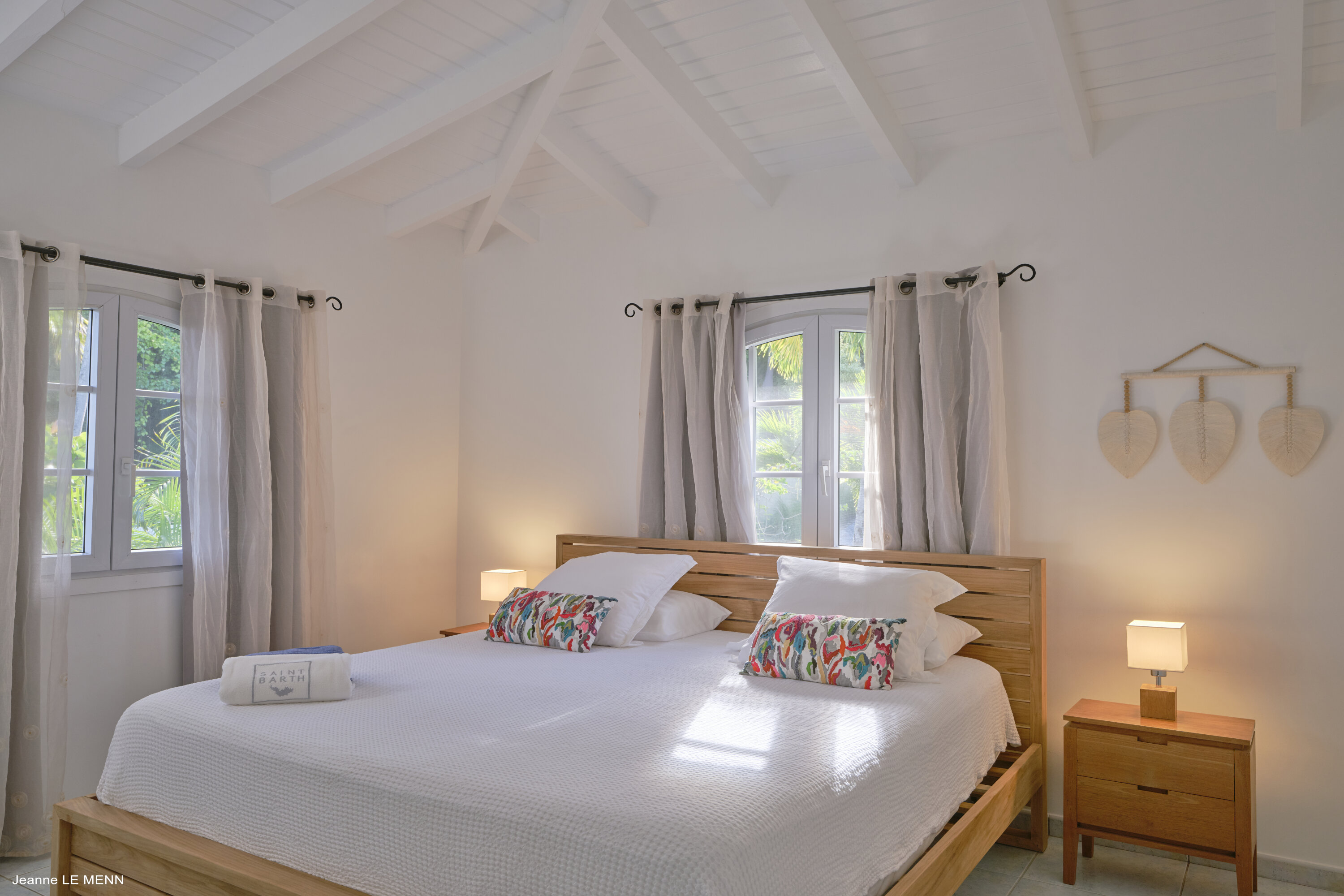 The 3 bedrooms at Villa Au Petit Pont are accessed from the living room. Each offers a quiet place to rest and recharge, with soothing white walls and beautiful wooden furnishings. Screened windows let you fall asleep with the cool island breeze.