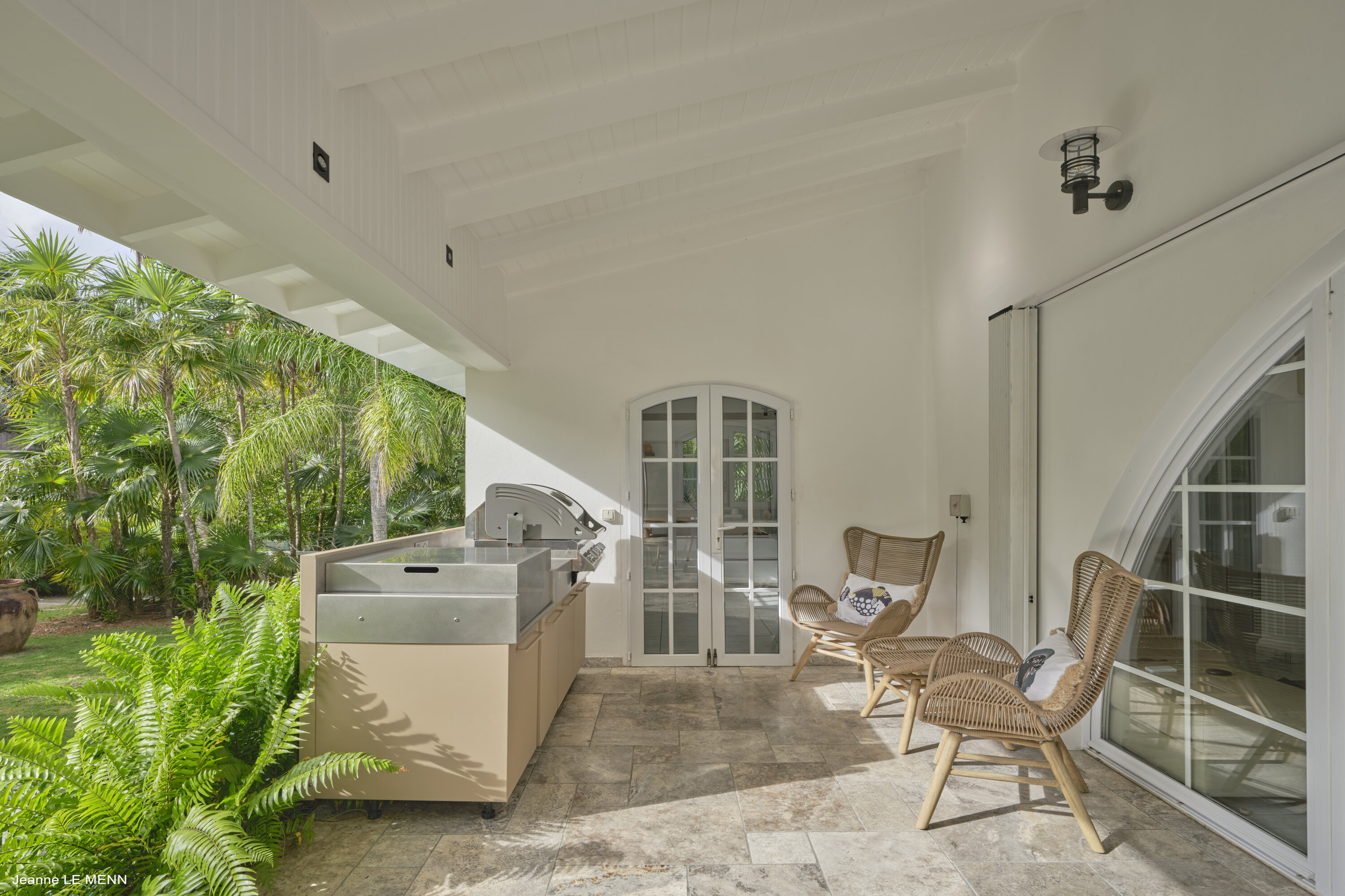 The front terrace with a dining table is home to the villa’s gas grill, letting you host island-style cookouts. The sizzle of fresh fish and steak on the grill is a fabulous accompaniment to a rosy gold sunset. Looking out over landscaped gardens, you’ll quickly be able to disconnect from the rush of modern life.