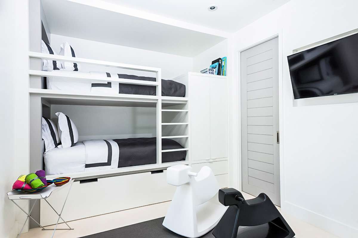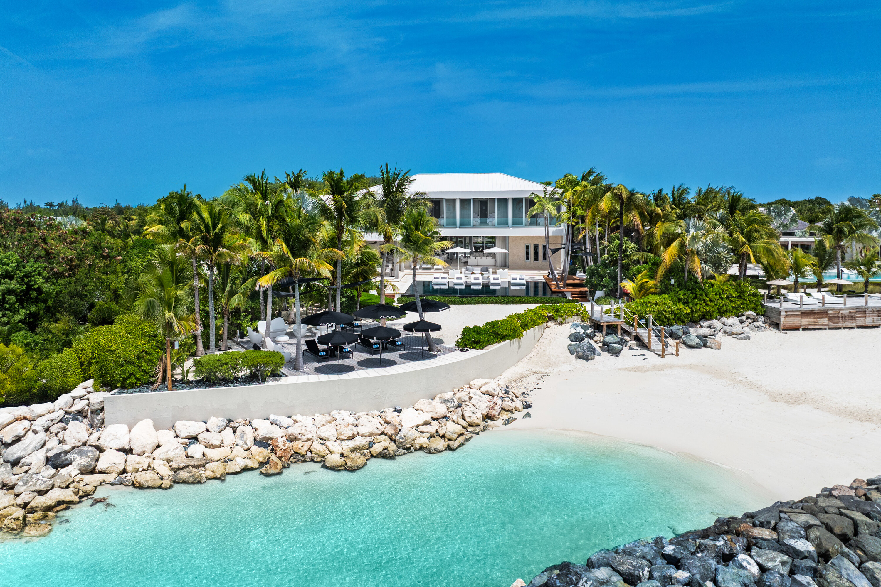 On the upper level, you’ll find three more bedrooms, each with 2 queen beds inside and their own private terrace overlooking the pool. There’s another master suite on this level as well, with a lavish king-sized bed, Apple TV, walk-in rain shower, and a terrace with ocean views.