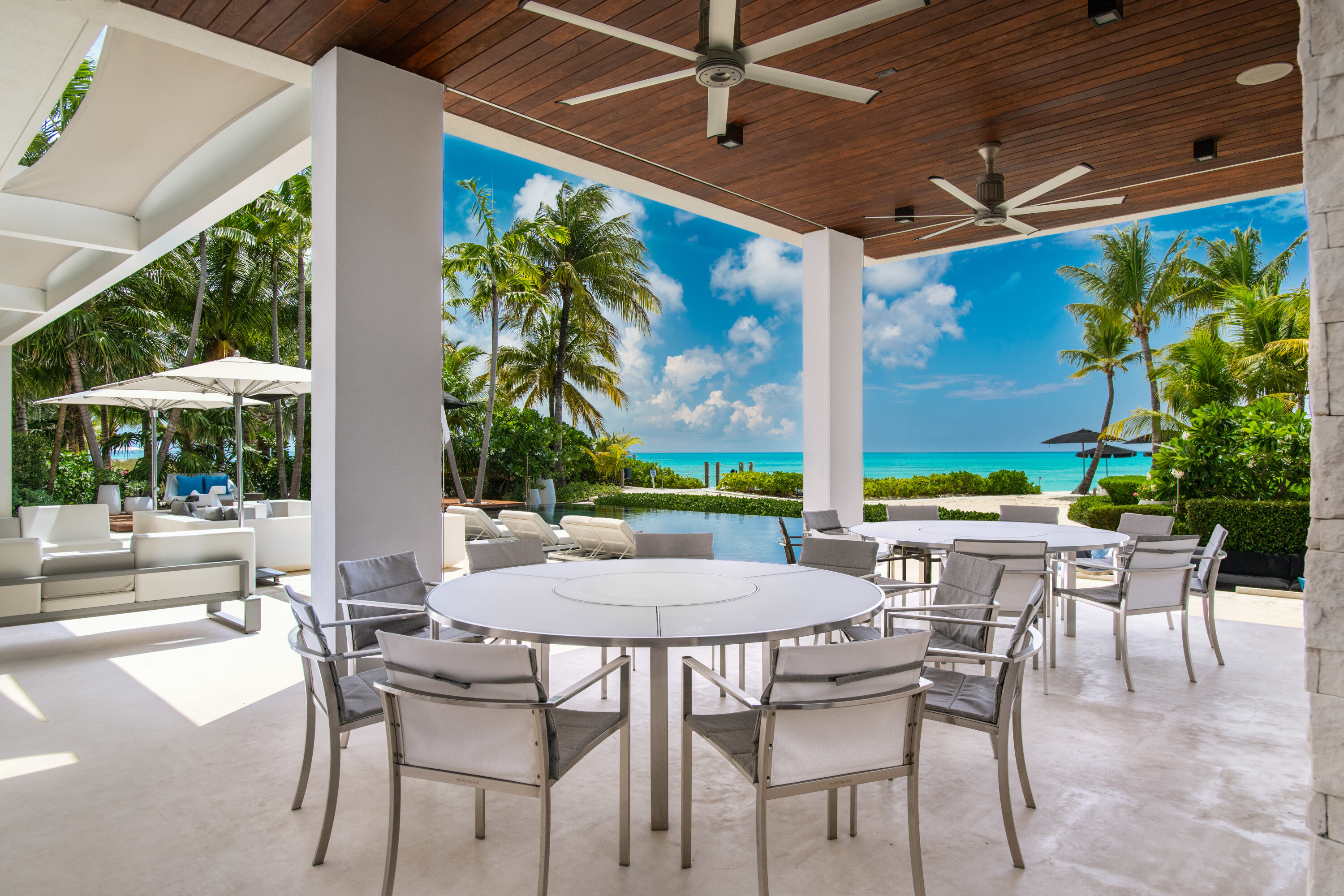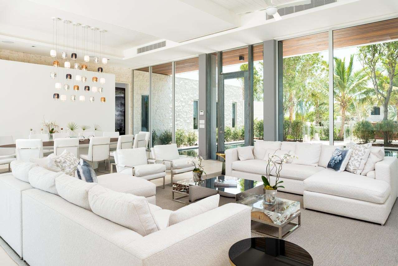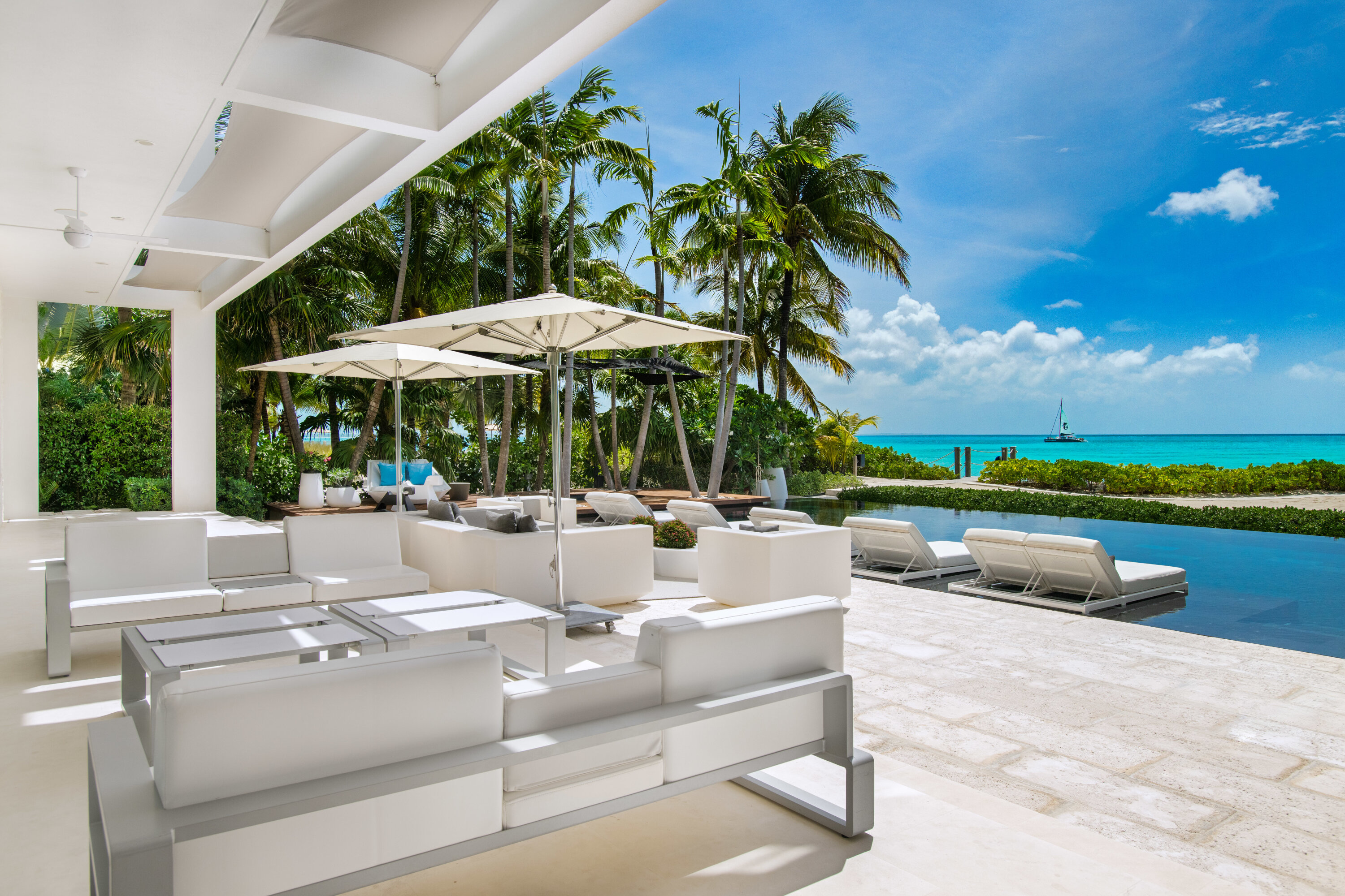 Throwing open the glass wall opens the entire space to the outdoor living area and intoxicating infinity pool. Breezy trade winds blow in from the ocean, letting you relax in cool comfort on the plush white sofas. This is self-assured oceanside luxury.
