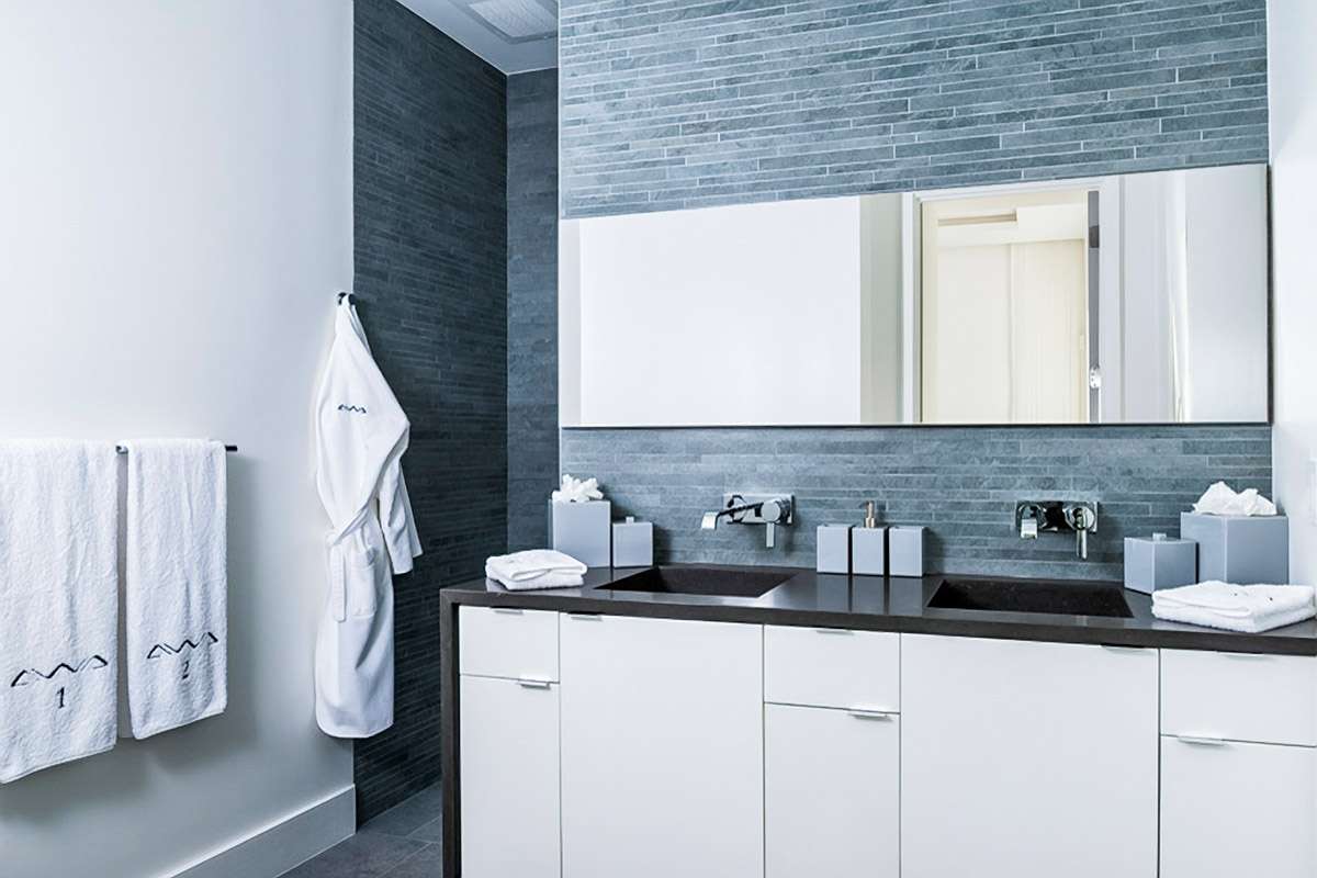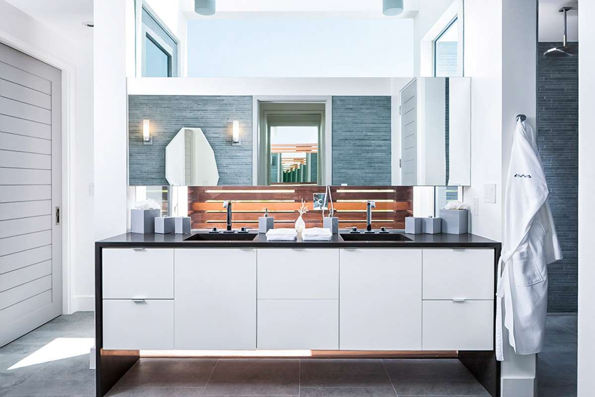 The main living space is engaging, with thoughtful marble details, fascinating artwork, and unique wallpapers helping to bring the vibrant Caribbean colors inside.