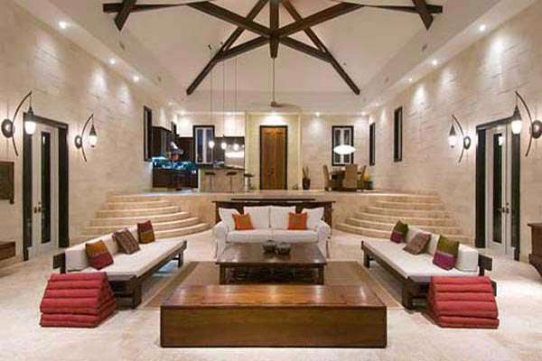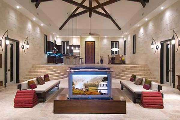 Walking into Villa Balinese whisks you away immediately to an intoxicating tropical island hideaway. The entryway features a large river-stone bank of cascading waterfalls, flanked by beautiful coconut palms. Inside, intricate Asian pearl-stone tiles and vaulted ceilings of cedar beam create a delightful and exotic villa experience.