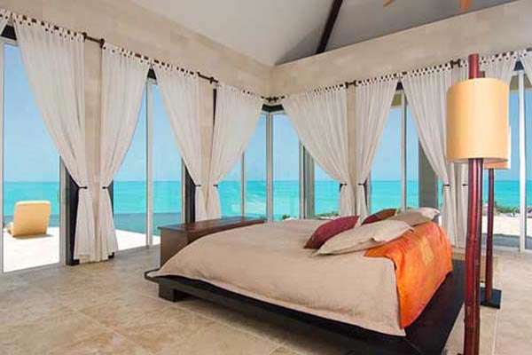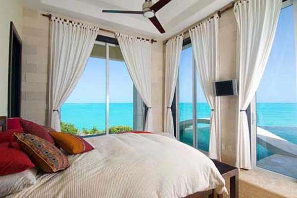 The master suite opens to the pool and features a lavish has a king-sized bed. In the bathroom, a raised bathtub with an overhead waterfall shower is a luxurious way to wash off the salt before sliding under the soft covers.
