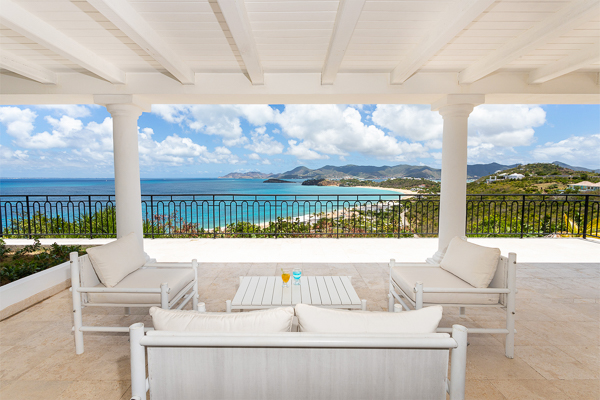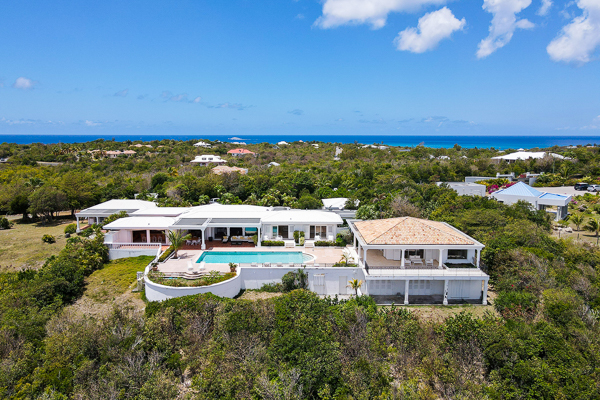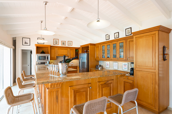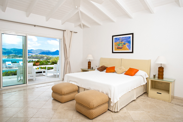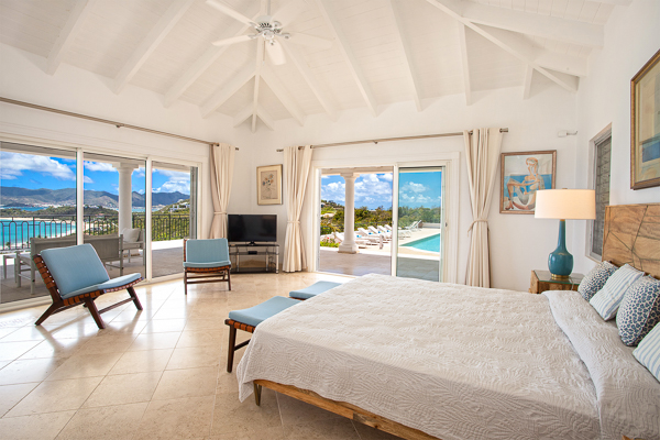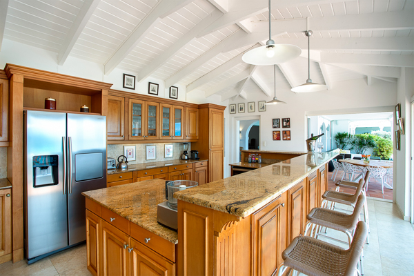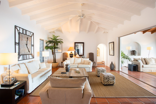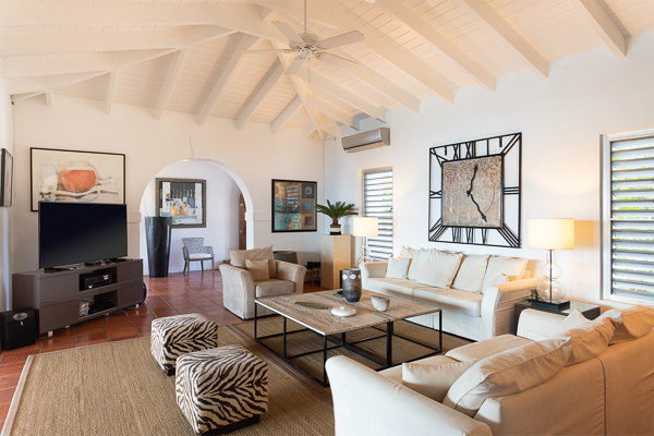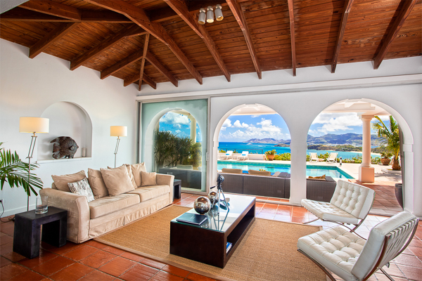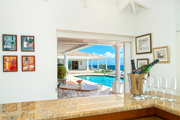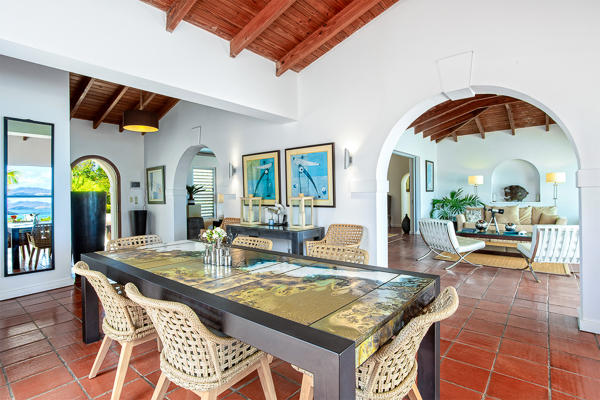 Inside, the villa flows seamlessly between indoor and outdoor living. A spacious double living room connects to a formal dining room framed by graceful arches, as well as outdoor dining and lounge areas. The fully-equipped kitchen, outfitted with granite countertops and a wide pass-through window to the terrace, overlooks Baie Rouge and invites effortless entertaining.