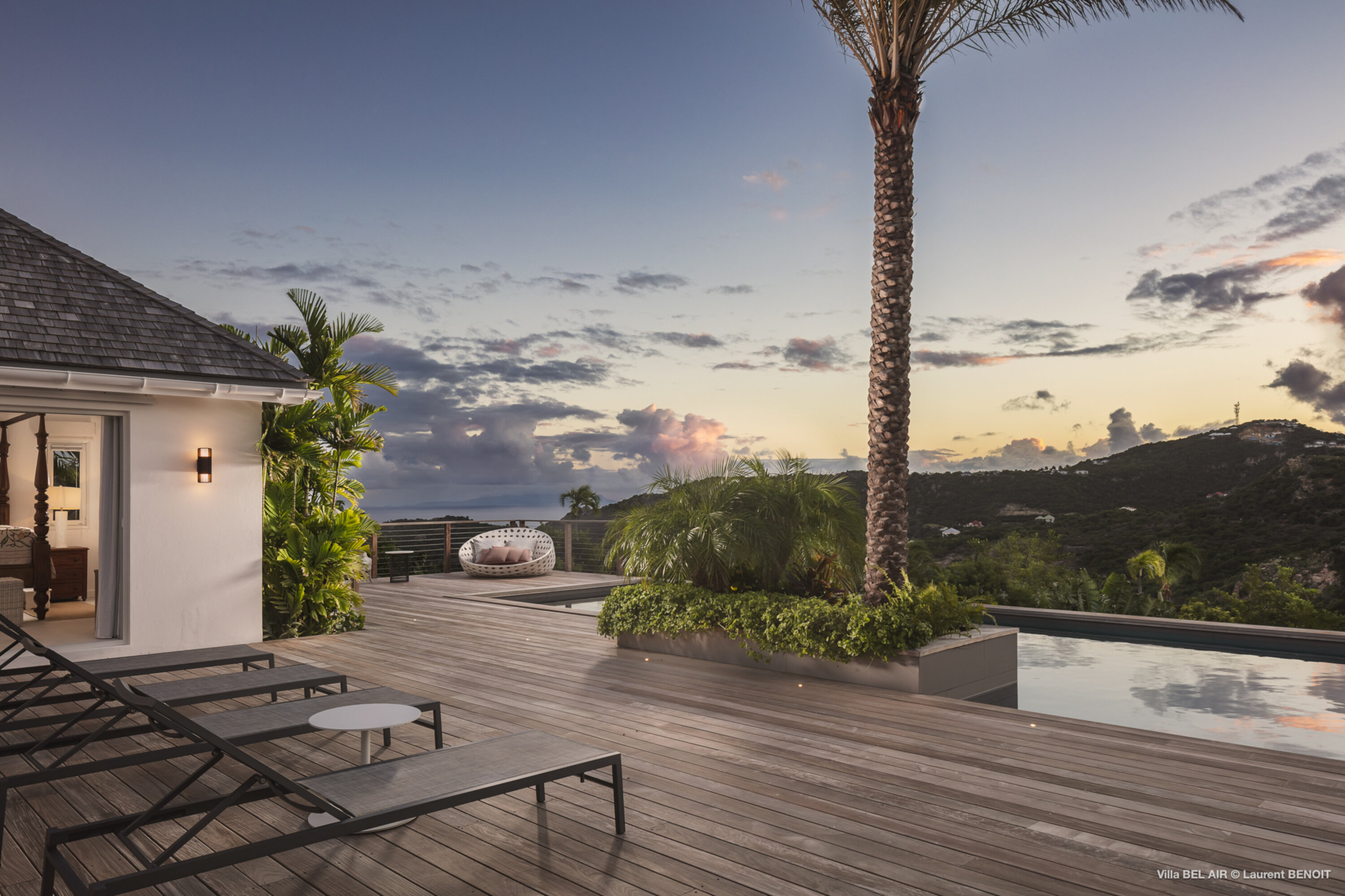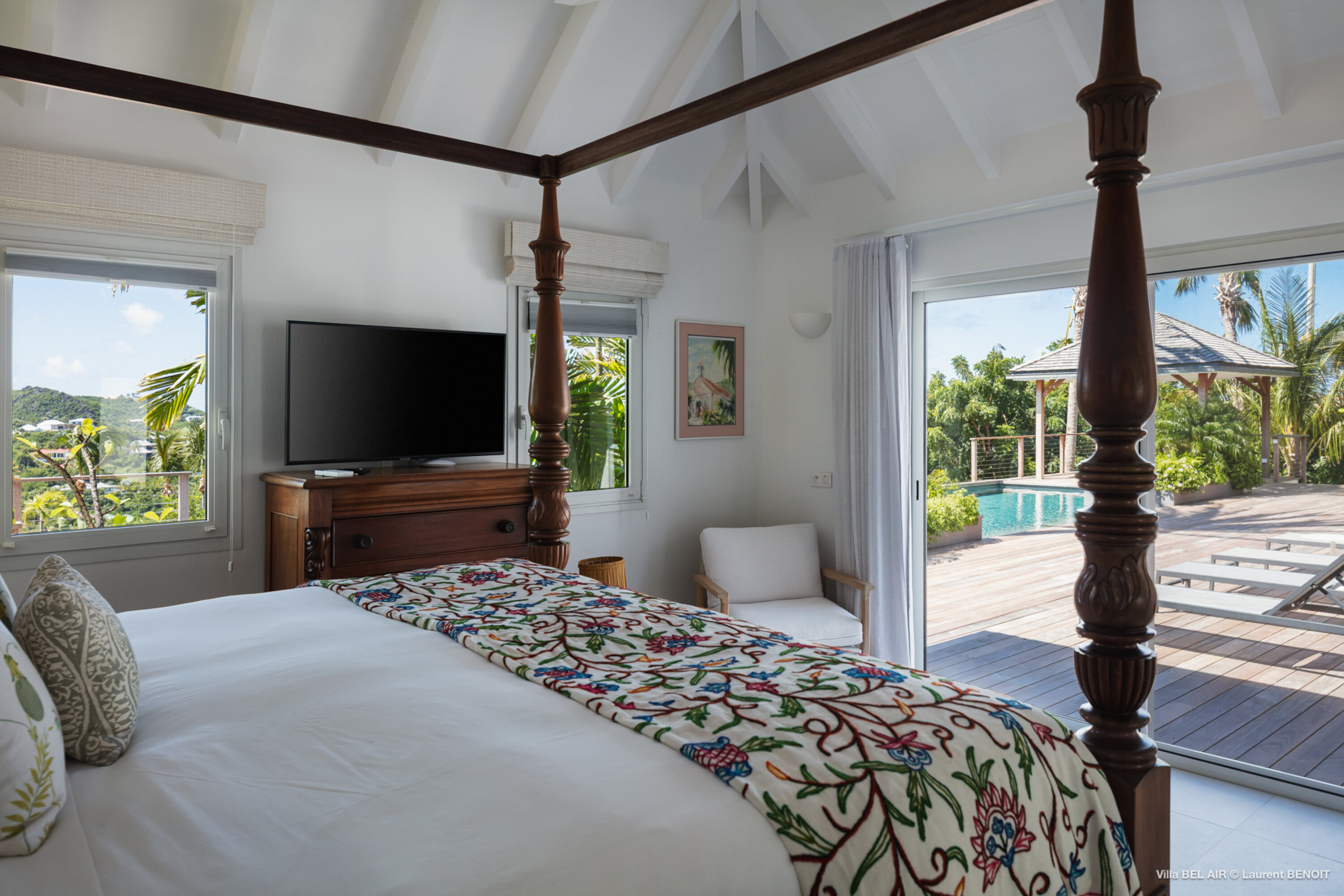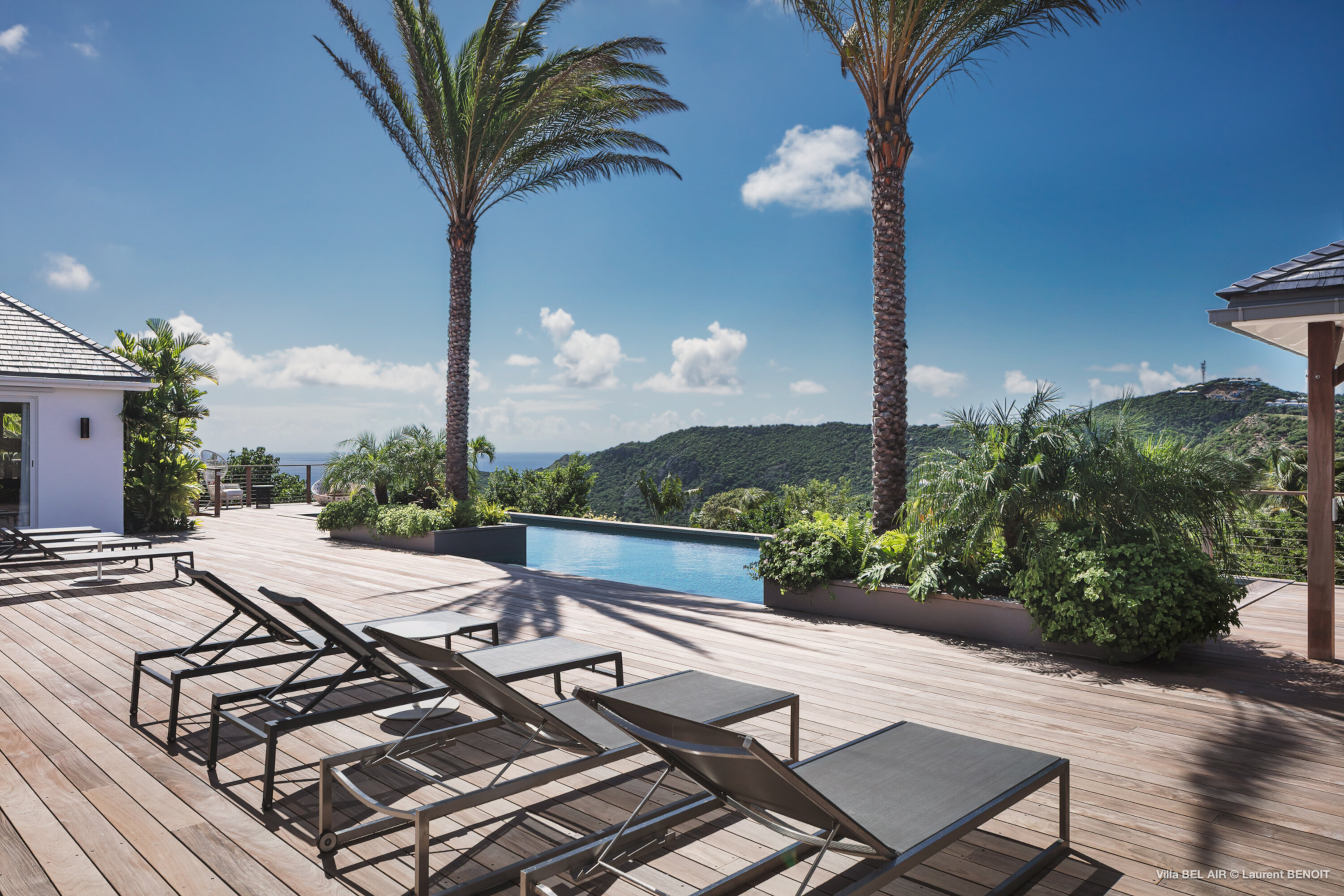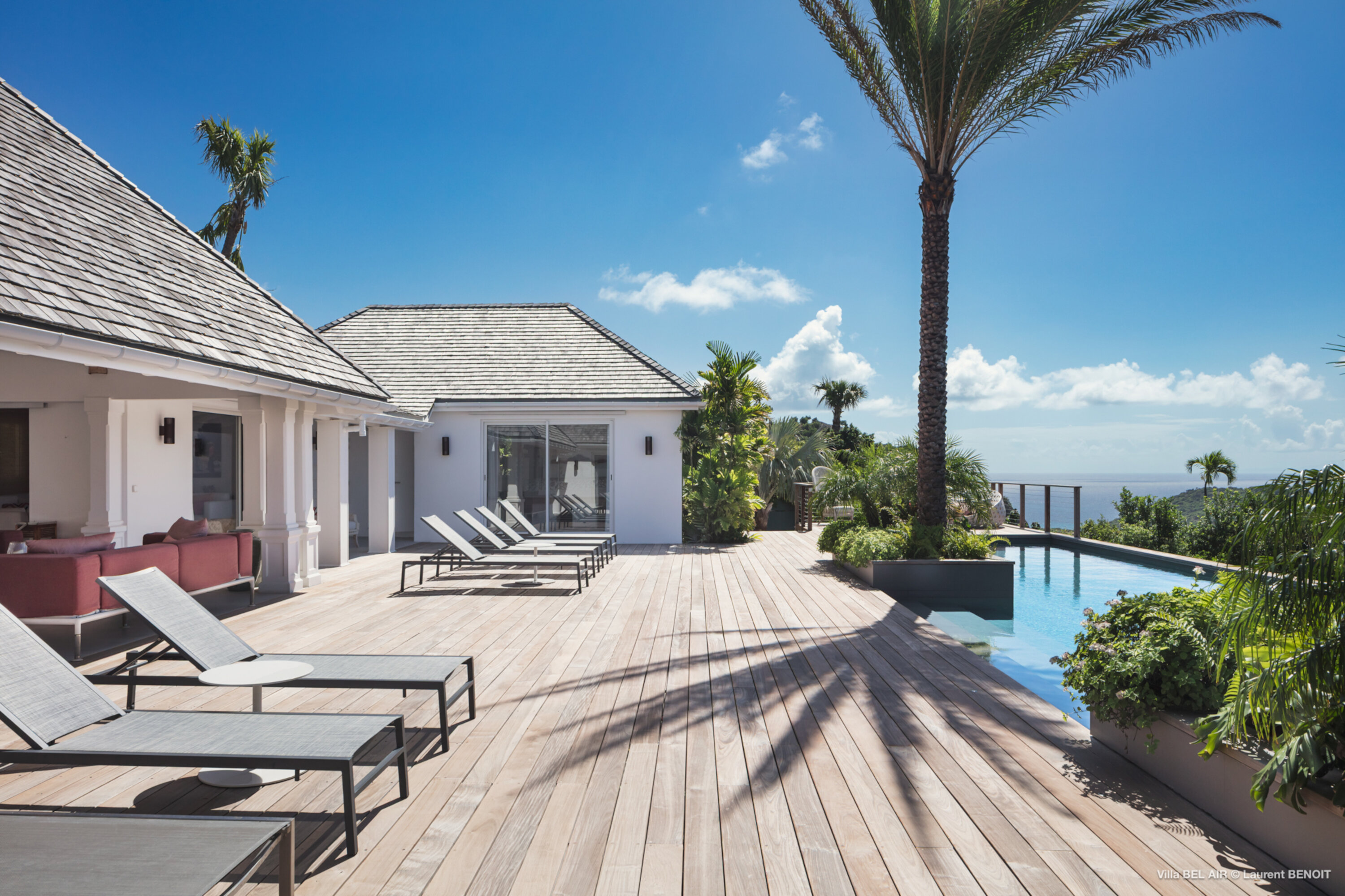 Perched high in the hills above St. Jean, Villa Bel Air (villa code: WV AIR) is a fully renovated luxury retreat offering breathtaking panoramic views over the ocean and the lush landscape of St. Barth. Bathed by the gentle trade winds and blessed with spectacular sunsets every evening, this exceptional property combines elegance, comfort, and an atmosphere that naturally invites relaxation and convivial moments. Just minutes from the vibrant beaches and boutiques of St. Jean, the villa enjoys a peaceful and private setting, making it a true haven of tranquility. The beautifully landscaped tropical gardens lining the driveway set the stage for an exceptional arrival experience. The entrance opens onto a vast covered terrace, perfectly cooled by the trade winds, which flows seamlessly into the outdoor dining area and generous sun deck overlooking magnificent hillside scenery and ocean views on both the St. Jean and Salines sides. Below, the expansive garden provides an ideal space for relaxation or children’s play. The main level features a spacious open-plan living area including a fully equipped modern kitchen, an elegant air-conditioned lounge with an entertainment center, and direct access to the pool terrace. A Sonos sound system ensures a refined ambiance both indoors and outdoors. Villa Bel Air features five spacious bedrooms, thoughtfully designed for comfort and privacy. Two identical master suites flank the swimming pool, each offering a king-size four-poster bed, dressing area and en-suite bathroom with shower. The third bedroom, located on the main level, is furnished with twin beds that can be converted into a king. The fourth and fifth bedrooms are situated on the lower level, opening onto the garden and offering generous space and serenity. The fourth bedroom features its own en-suite bathroom. The fifth bedroom presents a unique layout: while equally spacious and particularly appealing to teenagers seeking independence, its bathroom is not directly connected and is accessed via the terrace, ensuring privacy while maintaining comfort. This configuration makes it an ideal, autonomous space where younger guests can enjoy their own relaxed environment. A fully air-conditioned private gym completes the villa’s premium amenities, allowing guests to maintain their wellness routine in total comfort. With its fresh, elegant décor and warm, soothing atmosphere, Villa Bel Air is a villa that instantly makes one feel at home. Designed for sharing, laughter and unforgettable moments, it is ideal for families or groups of friends seeking an exclusive Caribbean escape where luxury meets effortless living.Please fill out the form to begin your inquiry and we will connect you with a seasoned villa rental specialist.