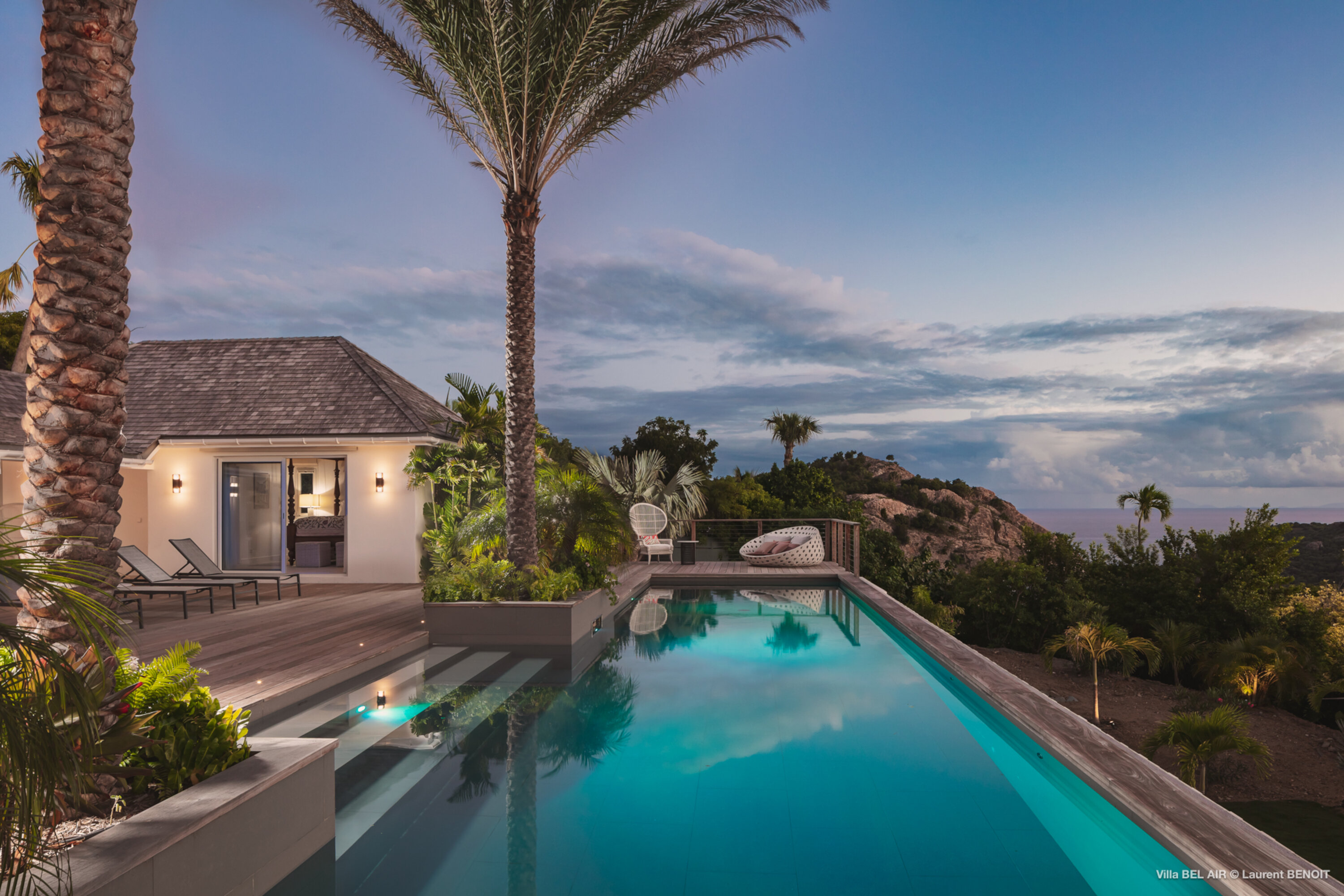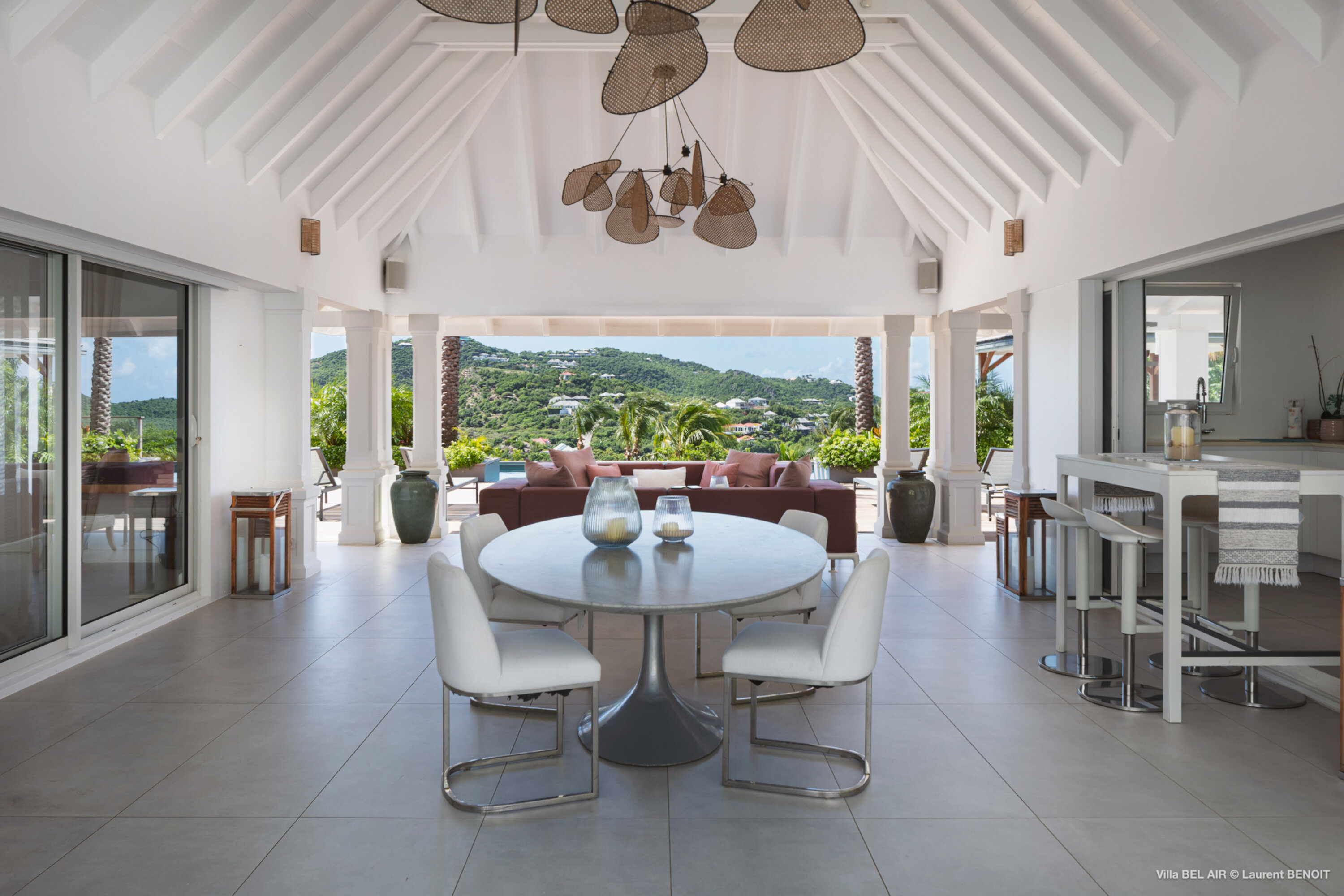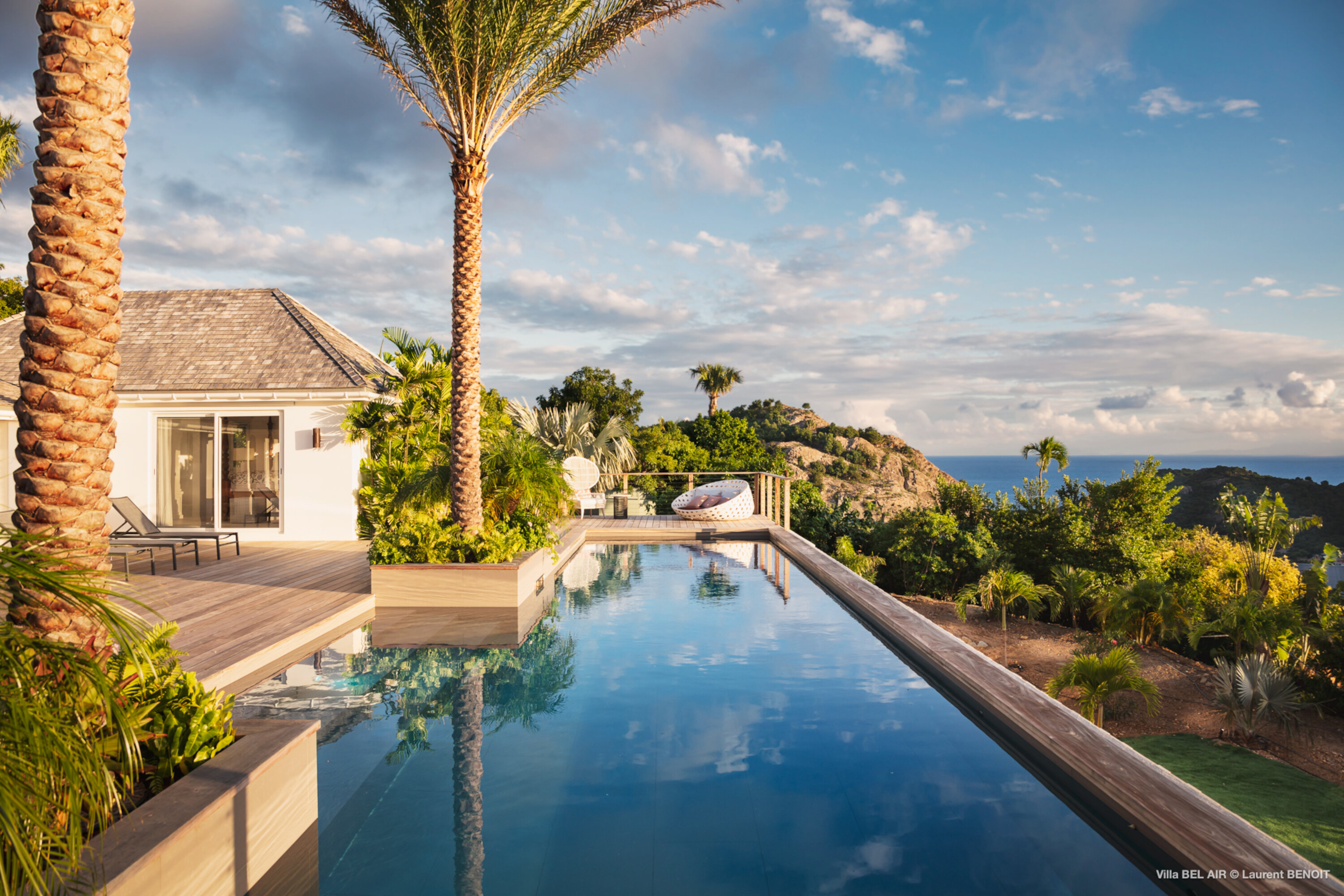 Perched high in the hills above St. Jean, Villa Bel Air (villa code: WV AIR) is a fully renovated luxury retreat offering breathtaking panoramic views over the ocean and the lush landscape of St. Barth. Bathed by the gentle trade winds and blessed with spectacular sunsets every evening, this exceptional property combines elegance, comfort, and an atmosphere that naturally invites relaxation and convivial moments. Just minutes from the vibrant beaches and boutiques of St. Jean, the villa enjoys a peaceful and private setting, making it a true haven of tranquility. The beautifully landscaped tropical gardens lining the driveway set the stage for an exceptional arrival experience. The entrance opens onto a vast covered terrace, perfectly cooled by the trade winds, which flows seamlessly into the outdoor dining area and generous sun deck overlooking magnificent hillside scenery and ocean views on both the St. Jean and Salines sides. Below, the expansive garden provides an ideal space for relaxation or children’s play. The main level features a spacious open-plan living area including a fully equipped modern kitchen, an elegant air-conditioned lounge with an entertainment center, and direct access to the pool terrace. A Sonos sound system ensures a refined ambiance both indoors and outdoors. Villa Bel Air features five spacious bedrooms, thoughtfully designed for comfort and privacy. Two identical master suites flank the swimming pool, each offering a king-size four-poster bed, dressing area and en-suite bathroom with shower. The third bedroom, located on the main level, is furnished with twin beds that can be converted into a king. The fourth and fifth bedrooms are situated on the lower level, opening onto the garden and offering generous space and serenity. The fourth bedroom features its own en-suite bathroom. The fifth bedroom presents a unique layout: while equally spacious and particularly appealing to teenagers seeking independence, its bathroom is not directly connected and is accessed via the terrace, ensuring privacy while maintaining comfort. This configuration makes it an ideal, autonomous space where younger guests can enjoy their own relaxed environment. A fully air-conditioned private gym completes the villa’s premium amenities, allowing guests to maintain their wellness routine in total comfort. With its fresh, elegant décor and warm, soothing atmosphere, Villa Bel Air is a villa that instantly makes one feel at home. Designed for sharing, laughter and unforgettable moments, it is ideal for families or groups of friends seeking an exclusive Caribbean escape where luxury meets effortless living.Please fill out the form to begin your inquiry and we will connect you with a seasoned villa rental specialist.