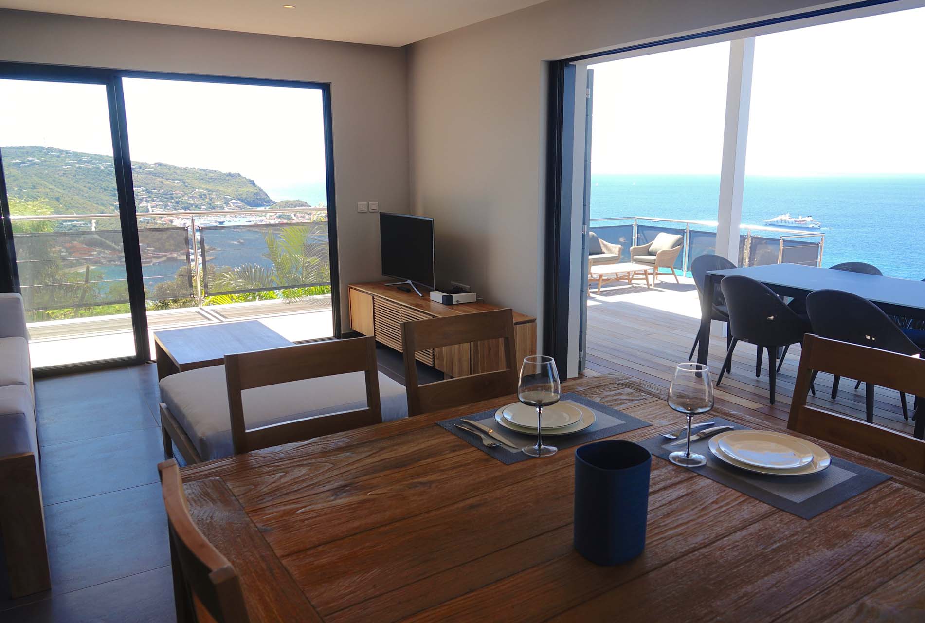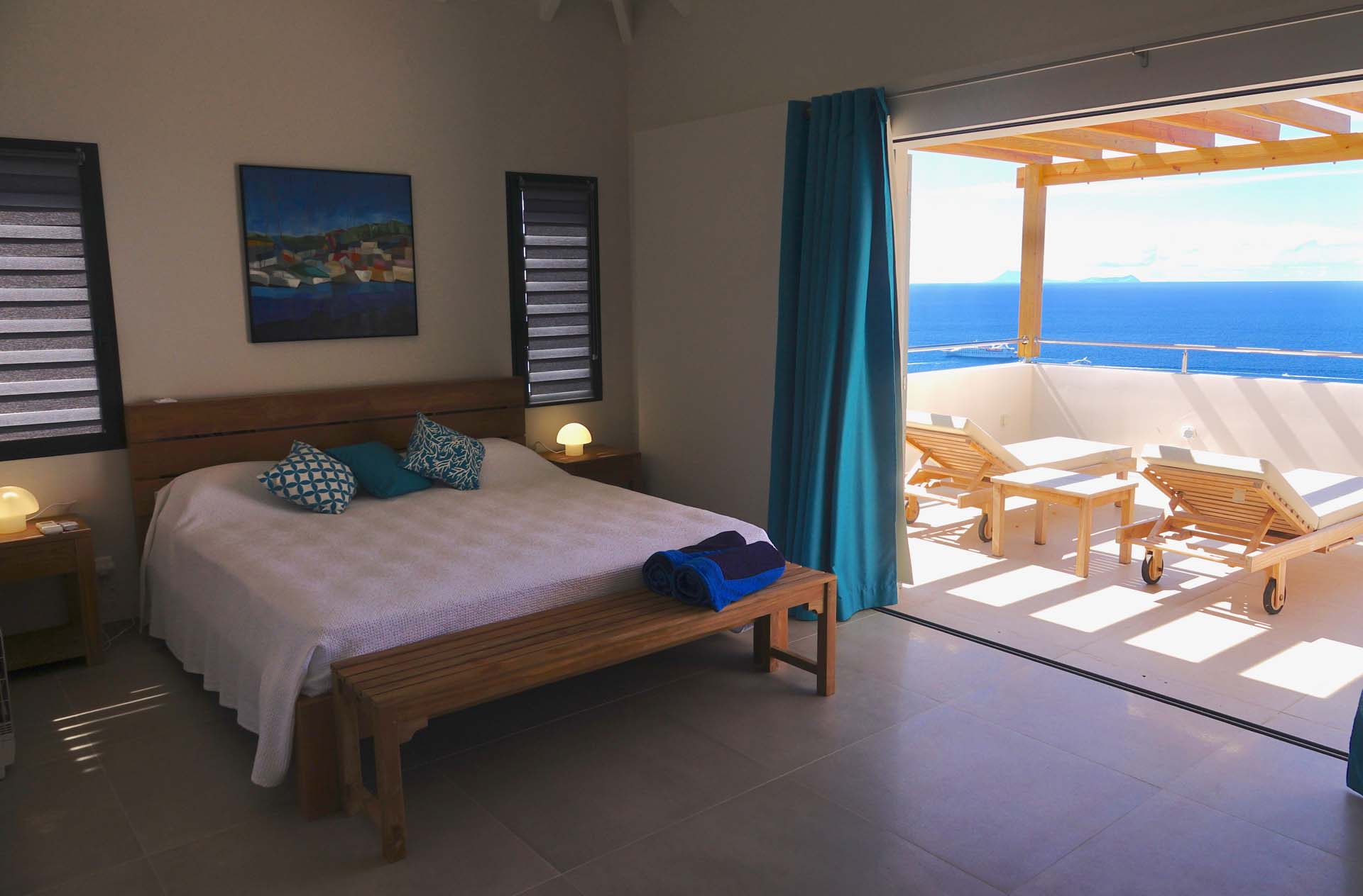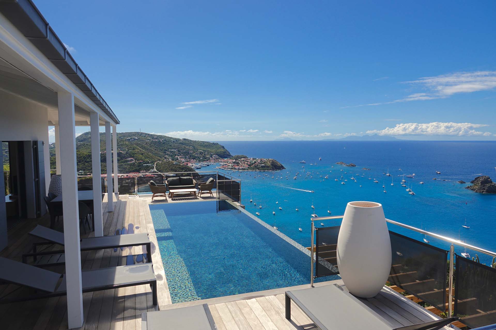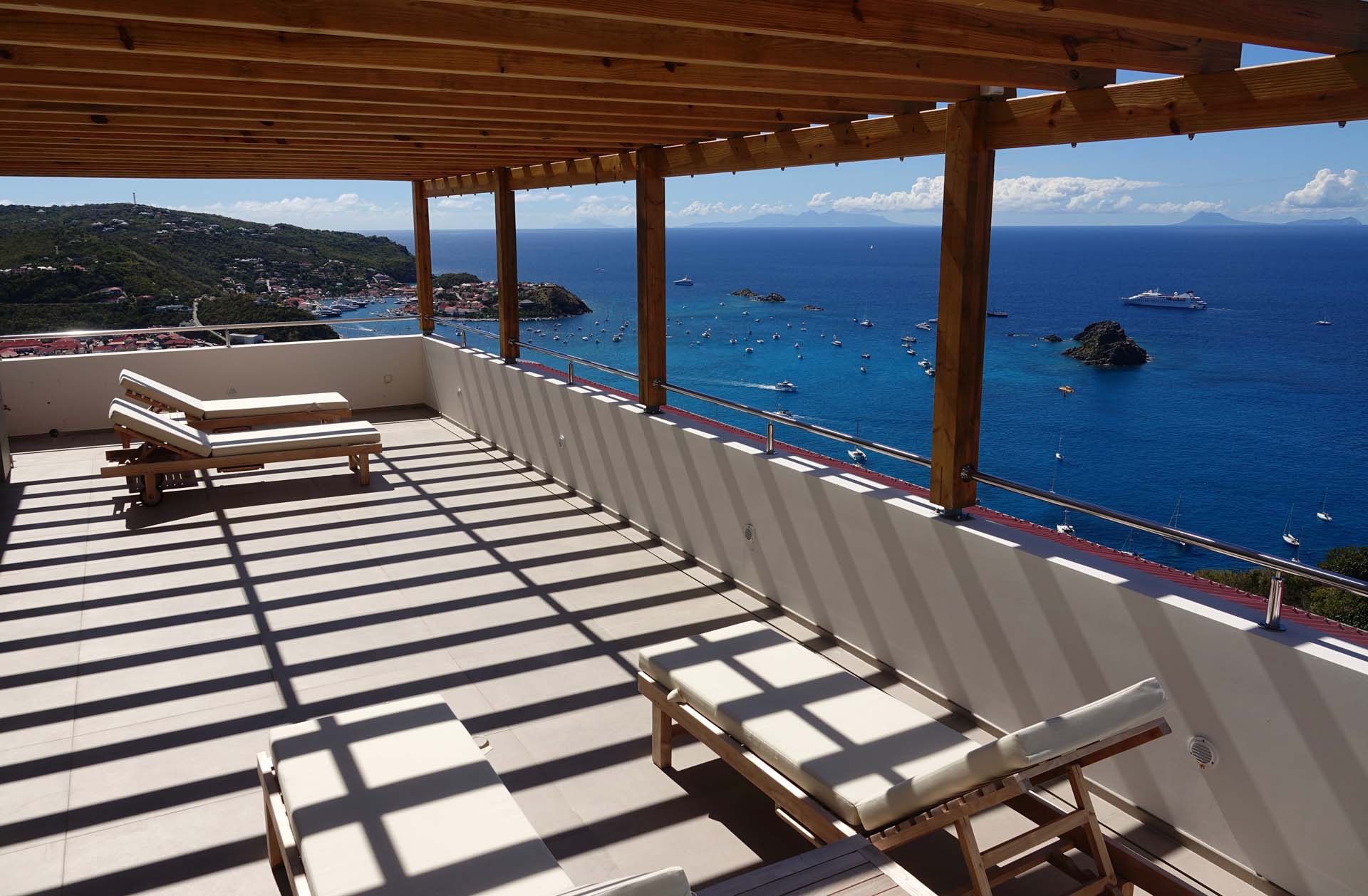 Castaway to Villa Belharra (villa code: WV BLR), a modern 2-bedroom villa located high in the hills of Colombier, St. Barts. Sitting above the picturesque Corossol Beach, this stunning home enjoys panoramic sunrise to sunset views, including Gustavia and its harbor and the surrounding islands. New, fresh, and contemporary, Villa Belharra acts as the ideal backdrop to those breathtaking views. Luxurious and minimalist, the interiors enhance the scenery, with natural woods contrasted against contemporary shades of white and gray. What décor there is embraces the island feel, from the artworks to the tasteful living space decorations. Sitting high on a hill in Colombier, it’s not all about the views at Villa Belharra – the location is equally as alluring. Guests enjoy quick access to Flamands Beach, St. Jean, and the capital Gustavia, an ideal spot for a sunset drink before enjoying an evening meal. Simple and comfortable, the living spaces inside Villa Belharra feature an open-plan design. A large great room combines the living room, dining area, and kitchen, opening on two sides to frame the views. The living room sofa is a great spot to kick back, letting your gaze wander across the shimmering Caribbean. A flat-screen TV provides some entertainment for quiet evenings, but with the lights of Gustavia calling below, it’s hard to resist the pull of St. Barts’ capital, with world-class restaurants and a lively pocket of nightlife. The modern kitchen is fully equipped and comes with a small breakfast bar. For the evenings you do decide to cook inside the villa, you’ll be pleased with the high-end appliances, plenty of space, and inspiring views. Villa Belharra features an indoor dining table, sitting between the living area and kitchen. There’s a second table on the outdoor terrace, coaxing you out for more formal meals paired with a fiery island sunset and the beautiful evening air. Ascending upstairs brings you to the 2 bedrooms inside Villa Belharra, quiet and private spaces to unwind. Both rooms open up to a large shared terrace, an incredible spot for a quiet drink or a night of stargazing. The bedrooms are identical, both with a European king-sized bed and ensuite bathrooms. The one difference is that one of the ensuites can open to the outside. The terrace on the main level is a wonderful spot to soak up the gorgeous views. The infinity pool is a highlight, a tempting spot for a dip, its edge melting into the sparkling Caribbean background. There are several seating areas, from lounges to sunbeds, letting you enjoy a good book, drift off to sleep, or spend some time sunbathing. Villa Belharra is all about enjoying time outside, admiring the rugged coastline, spying out luxury yachts sailing into the Gustavia harbor, and watching the sunset cast rosy gold hues across the seascapes. During the Thanksgiving and December holidays, the villa rents at full occupancy rates regardless of how many bedrooms are used.Please fill out the form to begin your inquiry and we will connect you with a seasoned villa rental specialist.
