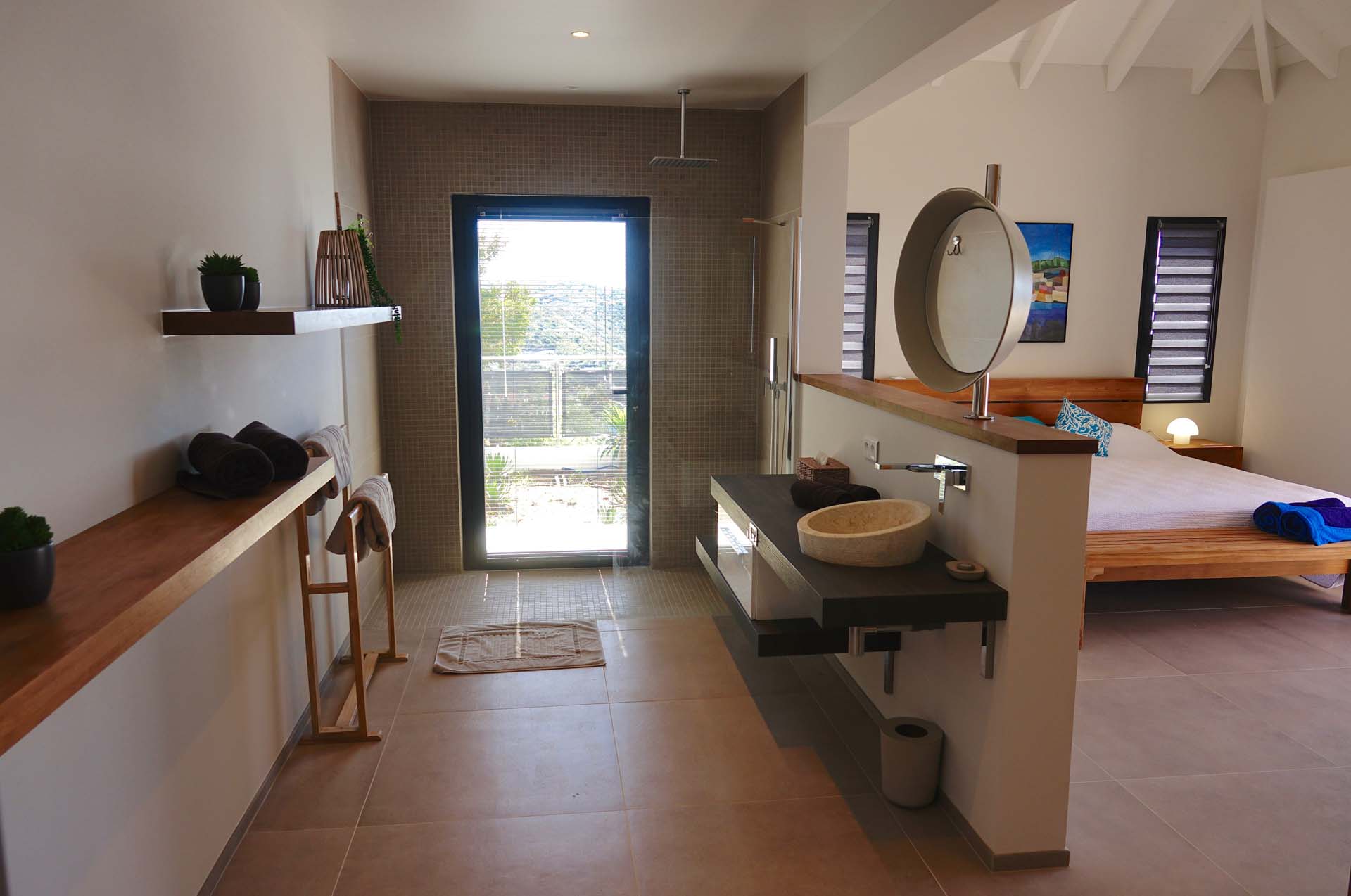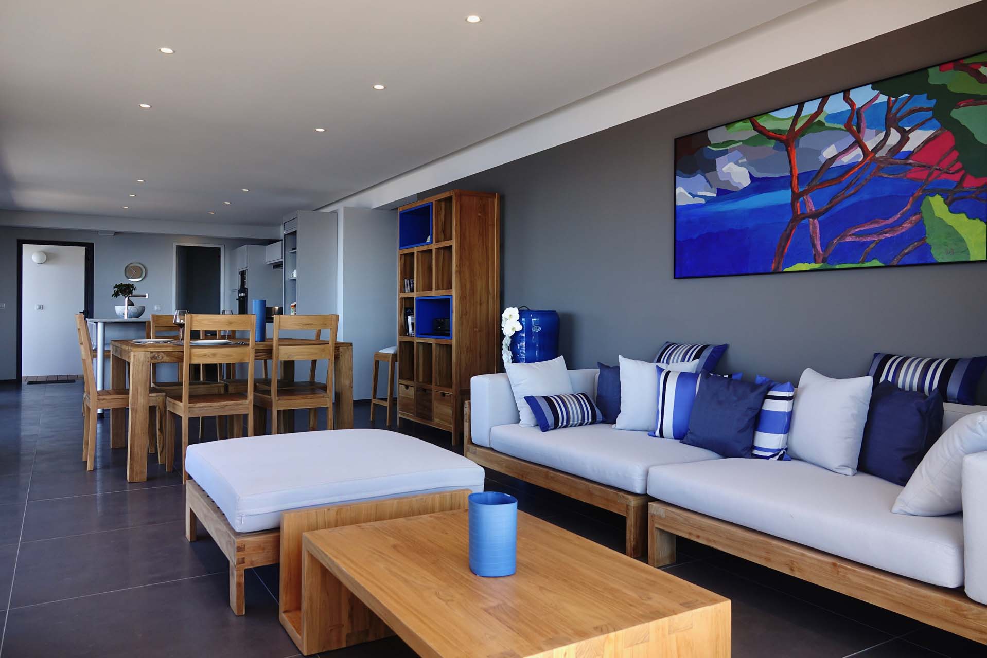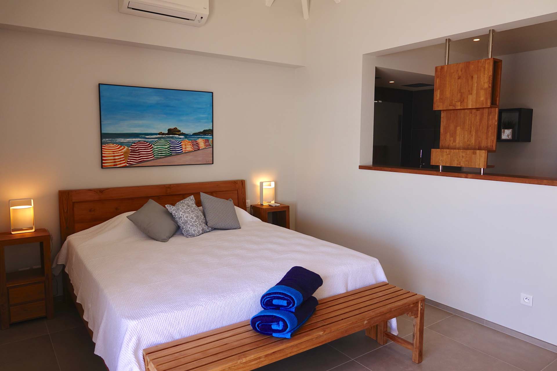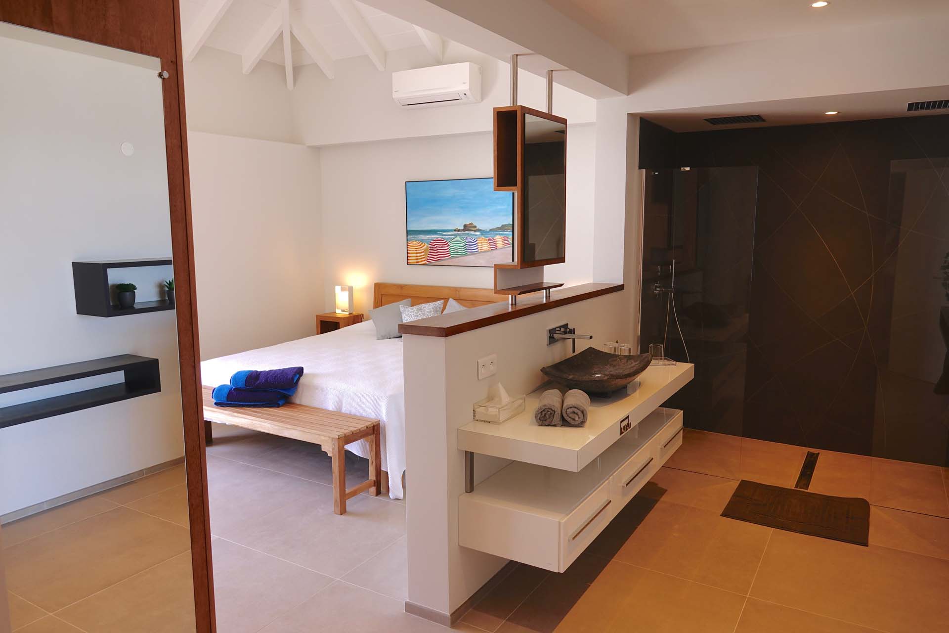 Castaway to Villa Belharra (villa code: WV BLR), a modern 2-bedroom villa located high in the hills of Colombier, St. Barts. Sitting above the picturesque Corossol Beach, this stunning home enjoys panoramic sunrise to sunset views, including Gustavia and its harbor and the surrounding islands. New, fresh, and contemporary, Villa Belharra acts as the ideal backdrop to those breathtaking views. Luxurious and minimalist, the interiors enhance the scenery, with natural woods contrasted against contemporary shades of white and gray. What décor there is embraces the island feel, from the artworks to the tasteful living space decorations. Sitting high on a hill in Colombier, it’s not all about the views at Villa Belharra – the location is equally as alluring. Guests enjoy quick access to Flamands Beach, St. Jean, and the capital Gustavia, an ideal spot for a sunset drink before enjoying an evening meal. Simple and comfortable, the living spaces inside Villa Belharra feature an open-plan design. A large great room combines the living room, dining area, and kitchen, opening on two sides to frame the views. The living room sofa is a great spot to kick back, letting your gaze wander across the shimmering Caribbean. A flat-screen TV provides some entertainment for quiet evenings, but with the lights of Gustavia calling below, it’s hard to resist the pull of St. Barts’ capital, with world-class restaurants and a lively pocket of nightlife. The modern kitchen is fully equipped and comes with a small breakfast bar. For the evenings you do decide to cook inside the villa, you’ll be pleased with the high-end appliances, plenty of space, and inspiring views. Villa Belharra features an indoor dining table, sitting between the living area and kitchen. There’s a second table on the outdoor terrace, coaxing you out for more formal meals paired with a fiery island sunset and the beautiful evening air. Ascending upstairs brings you to the 2 bedrooms inside Villa Belharra, quiet and private spaces to unwind. Both rooms open up to a large shared terrace, an incredible spot for a quiet drink or a night of stargazing. The bedrooms are identical, both with a European king-sized bed and ensuite bathrooms. The one difference is that one of the ensuites can open to the outside. The terrace on the main level is a wonderful spot to soak up the gorgeous views. The infinity pool is a highlight, a tempting spot for a dip, its edge melting into the sparkling Caribbean background. There are several seating areas, from lounges to sunbeds, letting you enjoy a good book, drift off to sleep, or spend some time sunbathing. Villa Belharra is all about enjoying time outside, admiring the rugged coastline, spying out luxury yachts sailing into the Gustavia harbor, and watching the sunset cast rosy gold hues across the seascapes. During the Thanksgiving and December holidays, the villa rents at full occupancy rates regardless of how many bedrooms are used.Please fill out the form to begin your inquiry and we will connect you with a seasoned villa rental specialist.