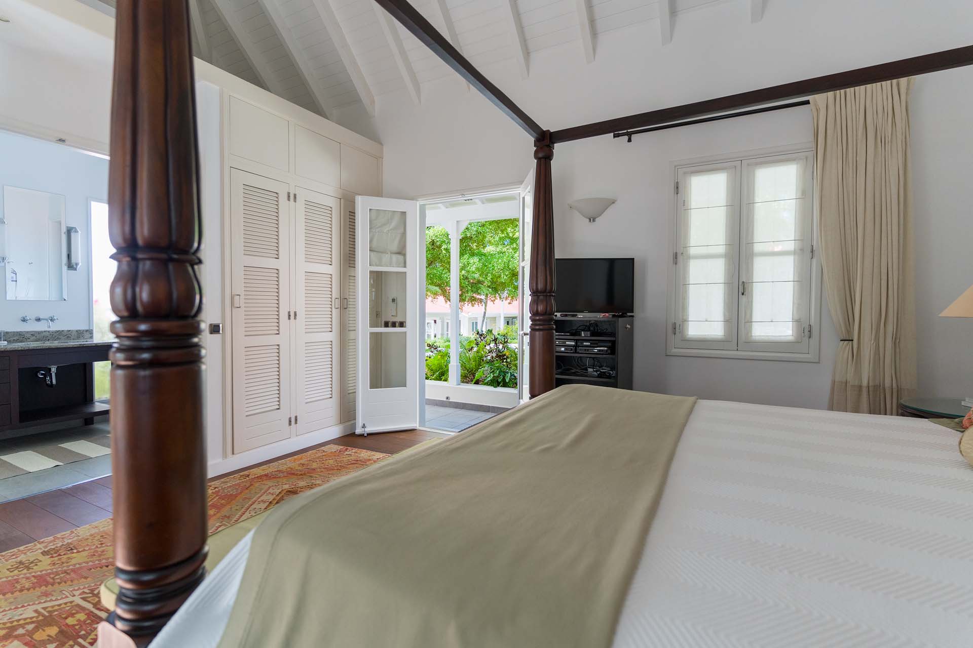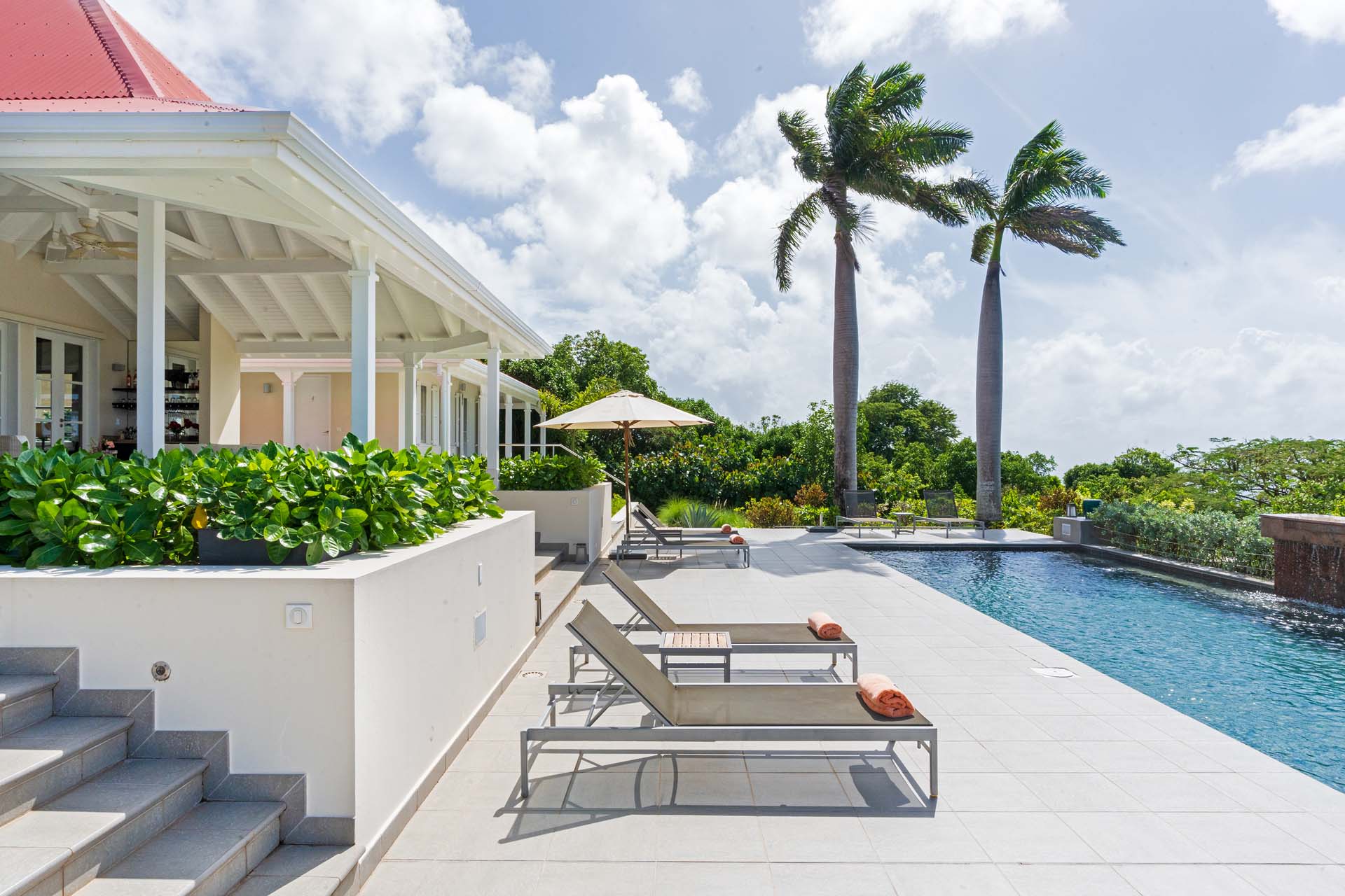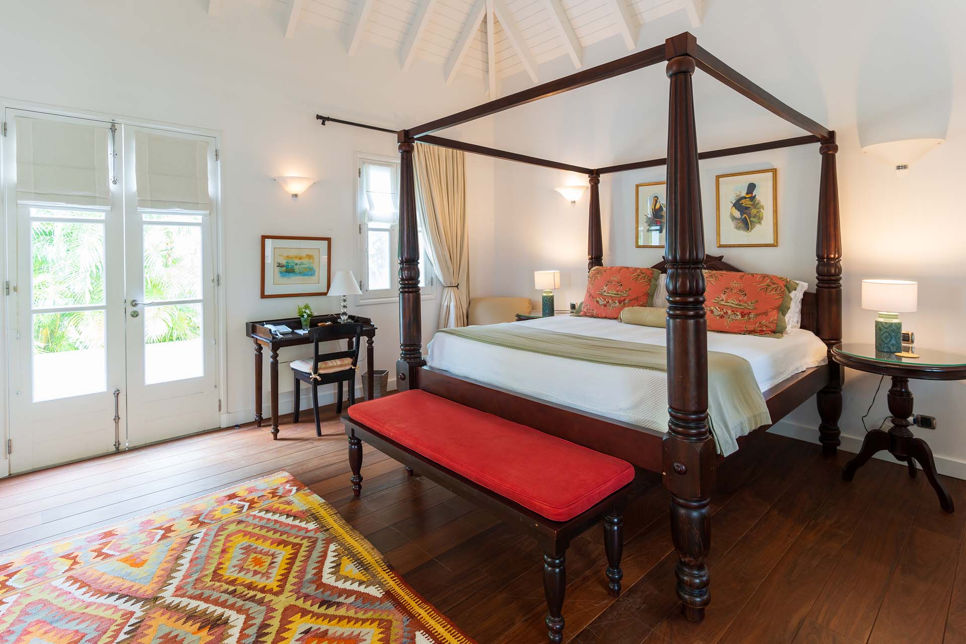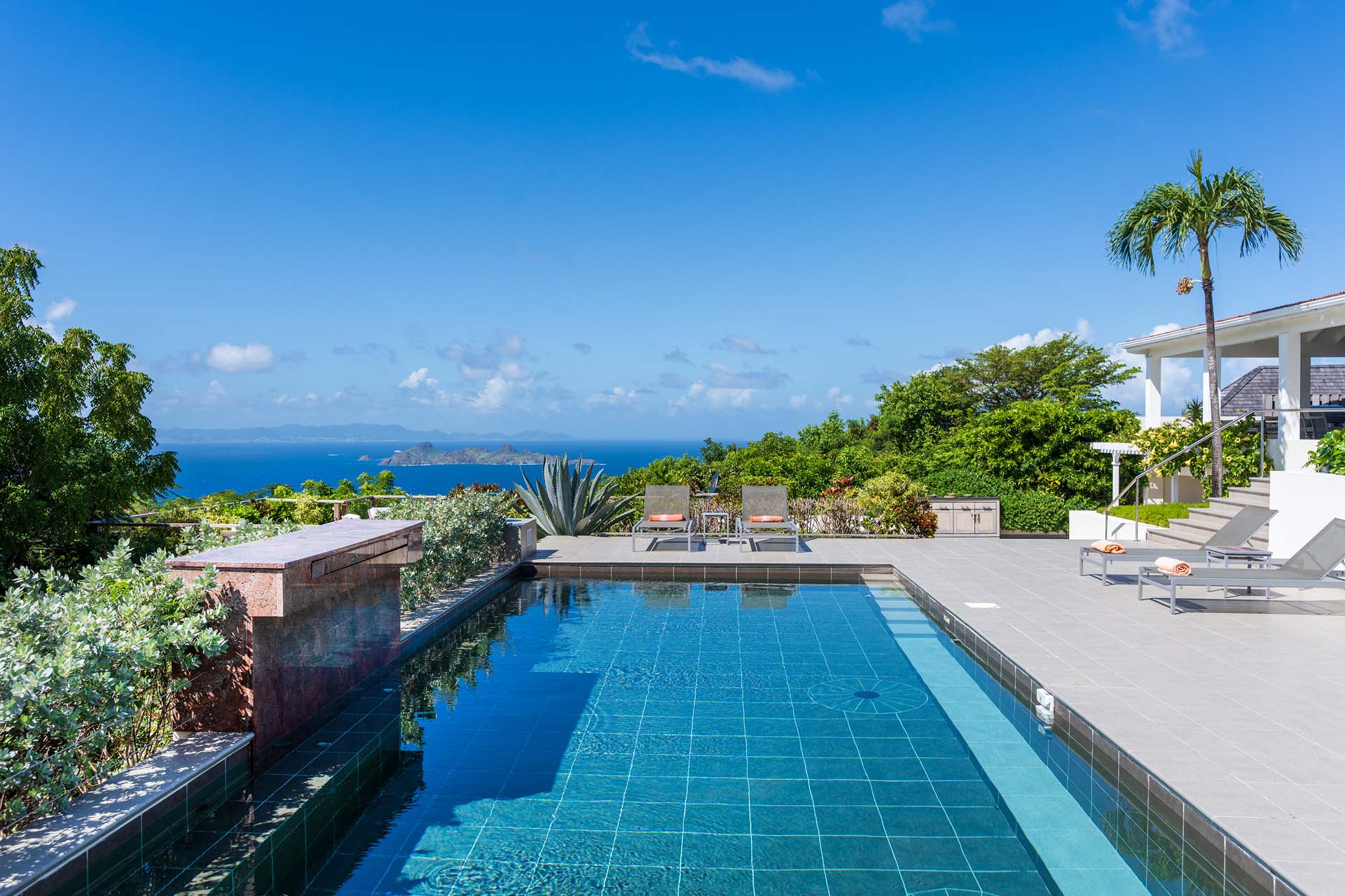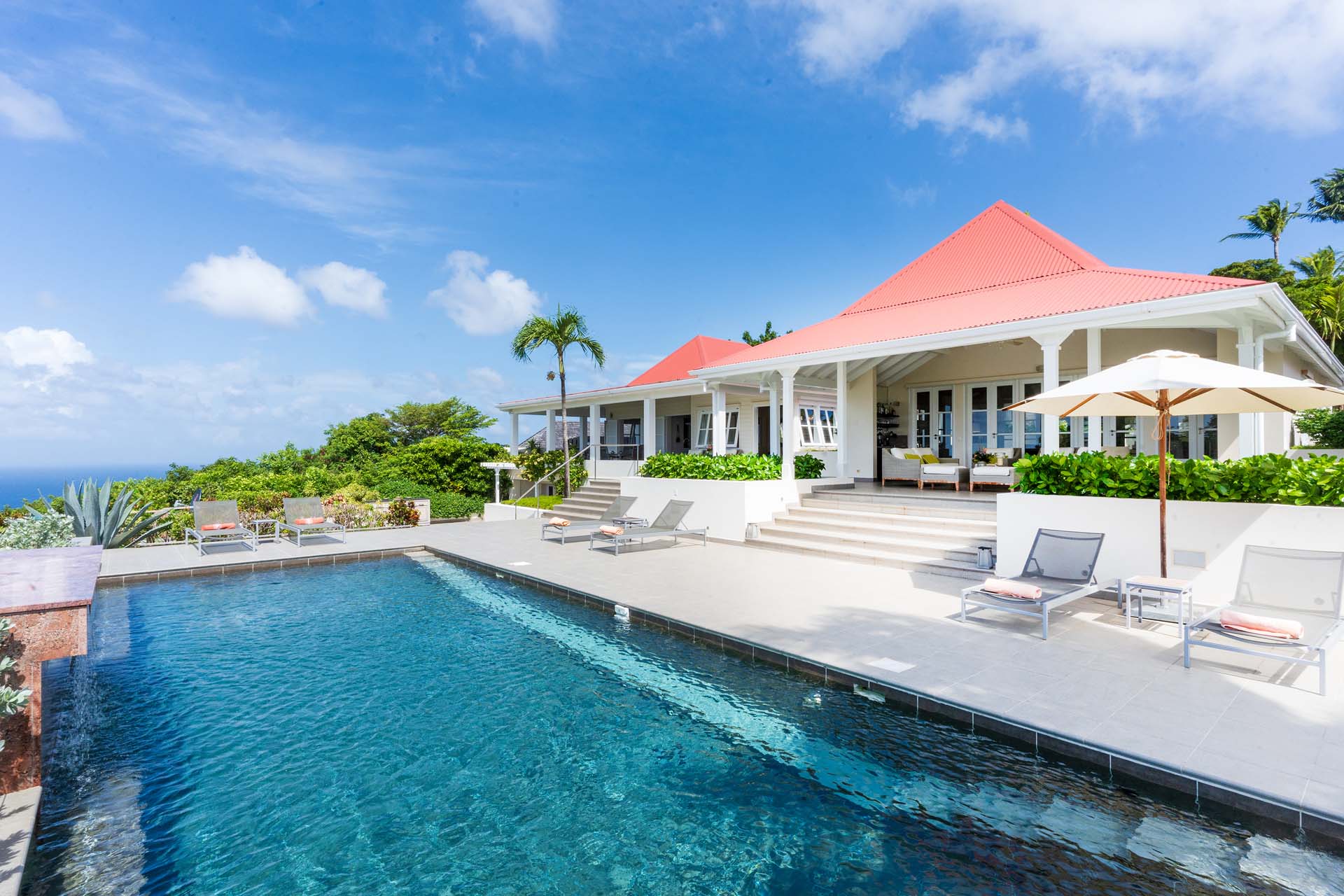 Welcome to Villa Belle Bague (villa code: WV VBB), a contemporary 4-bedroom villa nestled high in the hills of Colombier, St. Barts. This property enjoys some of the best sunset views on the island, taking in the glimmering Caribbean from St. Kitts all the way to Anguilla. The stylish interiors of Villa Belle Bague feature island antiques, vaulted wooden ceilings, and elegant colonial furnishings. Blending with the outdoor spaces, the entire property is clad in a tropical, island atmosphere. This is the luxurious Caribbean living at its very best. Villa Belle Bague is a short drive from the beach and restaurants in Flamands. Elegant restaurants and shops in Gustavia or St-Jean are both just 10 minutes away. Spread over a series of pavilions, Villa Belle Bague is brought together by a series of covered outdoor walkways revolving around a central cloister. With a beautiful garden and stone fountain, this entrance sets the tone for the rest of the relaxing living spaces. The large living room pavilion features French doors opening towards the outdoor terrace and ocean views. Sofas, armchairs, and artworks all pop with vibrant patterns, contrasting with dark wooden details and accents. Belle Bague Villa’s kitchen has stainless steel appliances and granite countertops. Our concierge can organize grocery pre-stocking or delivery, catered meals, or arrange private chef service for a special occasion. The kitchen opens to an outdoor dining area and a full bar under a covered terrace. Dining in the open air with the velvety evening slowly descending will be a highlight of any stay. A formal dining room with a French sideboard has seating suitable for up to 10 guests under an antique chandelier. It’s a magnificent setting for elegant dinners with family and friends. Three of the four bedrooms are in separate cottages, located around the central cloister. Each bedroom has colonial-style furnishings and a French queen-sized bed, offering a fantastic night’s sleep. The rooms also come with an ensuite bathroom with granite-topped vanities and a private terrace ideal for sunbathing. The fourth bedroom is similarly furnished and opens towards the pool terrace. Outside the main living room is the expansive covered deck. A comfortable lounge area with Rattan sofas offers a nice spot to sink in, open a bottle of wine, and enjoy the stunning sunsets across the sea and islands. Steps lead down towards the large, heated pool, featuring a striking granite-faced waterfall. Diving in here is a refreshing way to cool off during the day. Surrounding the pool is a wooden deck furnished with plenty of loungers, letting you soak up the island sun. From its location at the tip of Colombier point, Villa Belle Bague is close to the trail head for the hiking trail that leads down to Colombier beach, a protected nature preserve. A few minutes away by car is the lovely is Flamands Beach. Home to several elegant restaurants and hotels, it’s one of St. Barts’ most upscale areas. For something more rugged, Belle Bague Villa is also minutes away from the trailhead leading to Colombier Beach. Accessed only via foot or with a boat, it’s a fantastic glimpse into the natural beauty of the island. A gym equipped with weights, a rowing machine, and an elliptical is an ideal spot to work up a sweat. For those that need to get some work done, behind the kitchen is also a spacious office, complete with a computer and printer. During Thanksgiving and the December holidays, the villa rents at the full occupancy rate regardless of how many bedrooms are used. This villa is suitable for young children.Please fill out the form to begin your inquiry and we will connect you with a seasoned villa rental specialist.