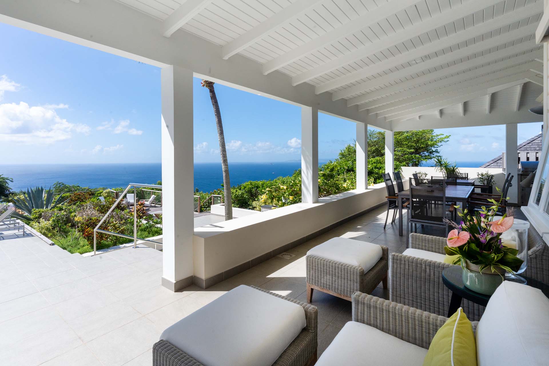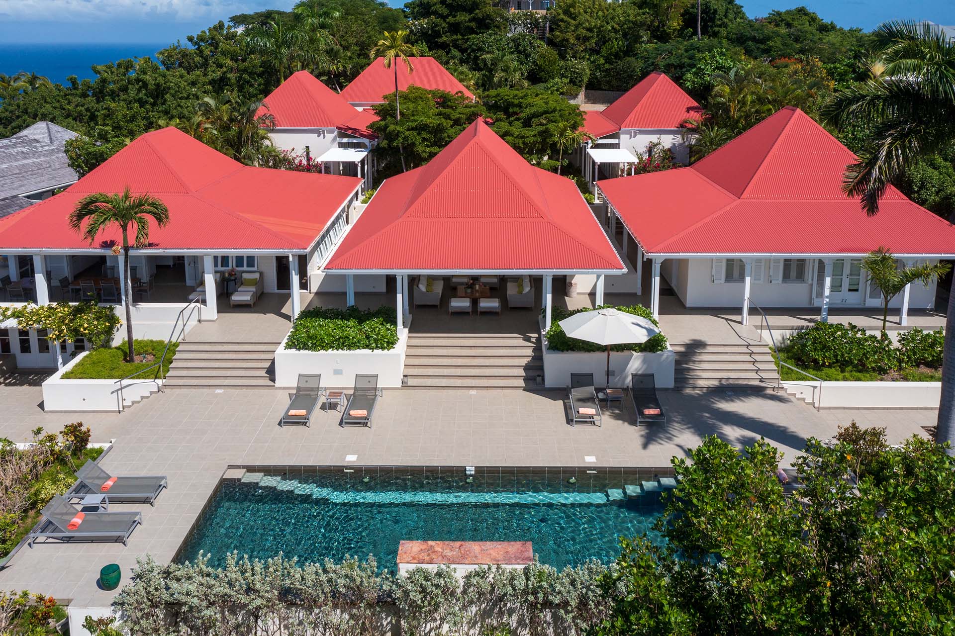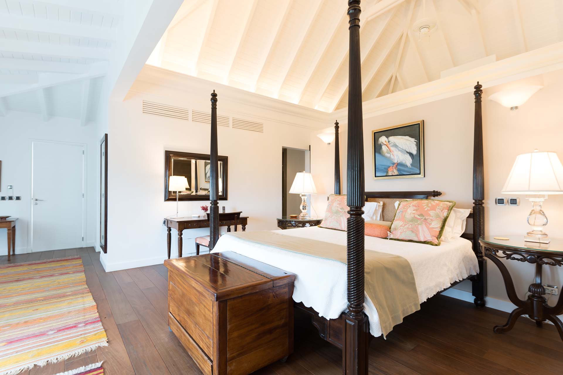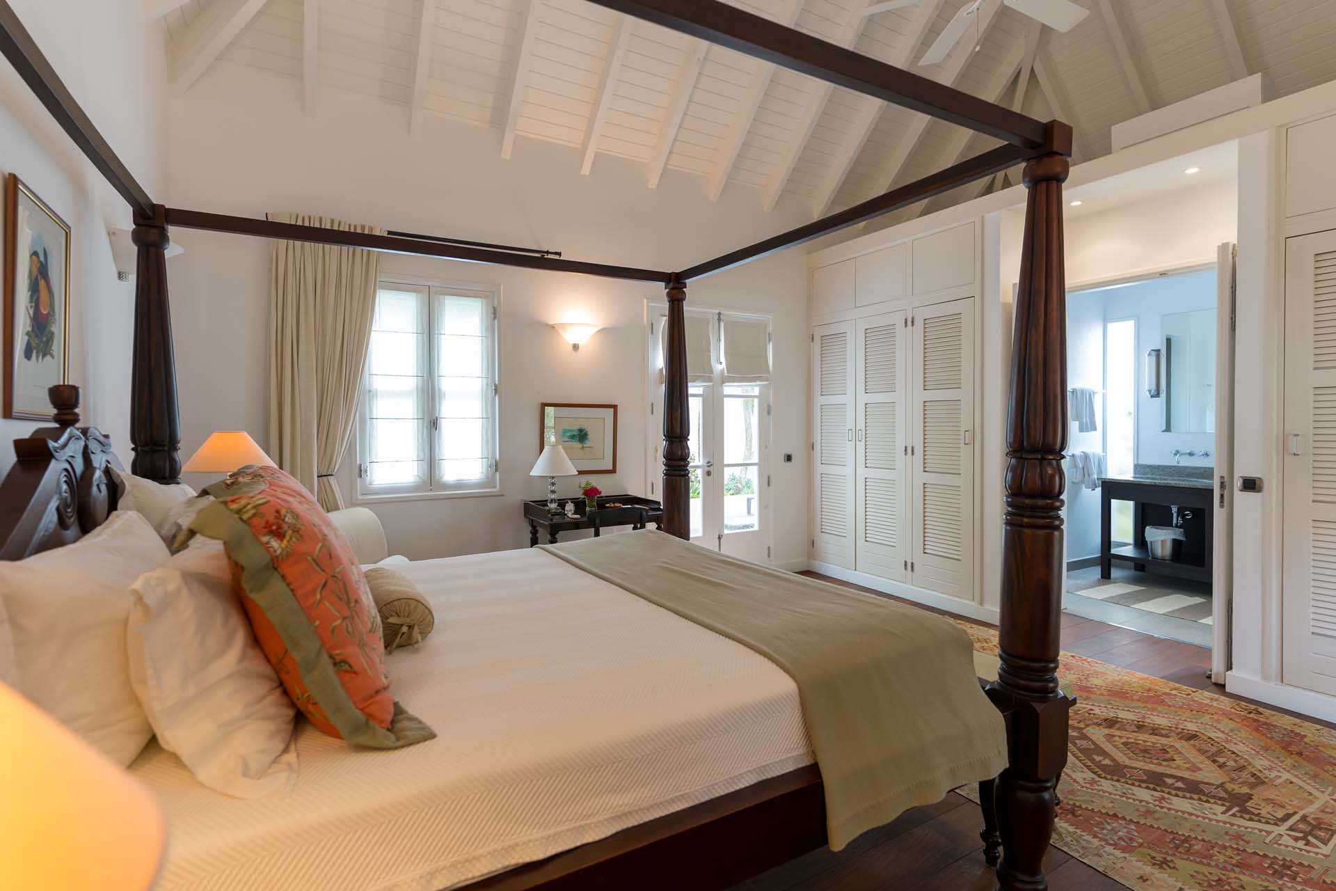 Welcome to Villa Belle Bague (villa code: WV VBB), a contemporary 4-bedroom villa nestled high in the hills of Colombier, St. Barts. This property enjoys some of the best sunset views on the island, taking in the glimmering Caribbean from St. Kitts all the way to Anguilla. The stylish interiors of Villa Belle Bague feature island antiques, vaulted wooden ceilings, and elegant colonial furnishings. Blending with the outdoor spaces, the entire property is clad in a tropical, island atmosphere. This is the luxurious Caribbean living at its very best. Villa Belle Bague is a short drive from the beach and restaurants in Flamands. Elegant restaurants and shops in Gustavia or St-Jean are both just 10 minutes away. Spread over a series of pavilions, Villa Belle Bague is brought together by a series of covered outdoor walkways revolving around a central cloister. With a beautiful garden and stone fountain, this entrance sets the tone for the rest of the relaxing living spaces. The large living room pavilion features French doors opening towards the outdoor terrace and ocean views. Sofas, armchairs, and artworks all pop with vibrant patterns, contrasting with dark wooden details and accents. Belle Bague Villa’s kitchen has stainless steel appliances and granite countertops. Our concierge can organize grocery pre-stocking or delivery, catered meals, or arrange private chef service for a special occasion. The kitchen opens to an outdoor dining area and a full bar under a covered terrace. Dining in the open air with the velvety evening slowly descending will be a highlight of any stay. A formal dining room with a French sideboard has seating suitable for up to 10 guests under an antique chandelier. It’s a magnificent setting for elegant dinners with family and friends. Three of the four bedrooms are in separate cottages, located around the central cloister. Each bedroom has colonial-style furnishings and a French queen-sized bed, offering a fantastic night’s sleep. The rooms also come with an ensuite bathroom with granite-topped vanities and a private terrace ideal for sunbathing. The fourth bedroom is similarly furnished and opens towards the pool terrace. Outside the main living room is the expansive covered deck. A comfortable lounge area with Rattan sofas offers a nice spot to sink in, open a bottle of wine, and enjoy the stunning sunsets across the sea and islands. Steps lead down towards the large, heated pool, featuring a striking granite-faced waterfall. Diving in here is a refreshing way to cool off during the day. Surrounding the pool is a wooden deck furnished with plenty of loungers, letting you soak up the island sun. From its location at the tip of Colombier point, Villa Belle Bague is close to the trail head for the hiking trail that leads down to Colombier beach, a protected nature preserve. A few minutes away by car is the lovely is Flamands Beach. Home to several elegant restaurants and hotels, it’s one of St. Barts’ most upscale areas. For something more rugged, Belle Bague Villa is also minutes away from the trailhead leading to Colombier Beach. Accessed only via foot or with a boat, it’s a fantastic glimpse into the natural beauty of the island. A gym equipped with weights, a rowing machine, and an elliptical is an ideal spot to work up a sweat. For those that need to get some work done, behind the kitchen is also a spacious office, complete with a computer and printer. During Thanksgiving and the December holidays, the villa rents at the full occupancy rate regardless of how many bedrooms are used. This villa is suitable for young children.Please fill out the form to begin your inquiry and we will connect you with a seasoned villa rental specialist.
