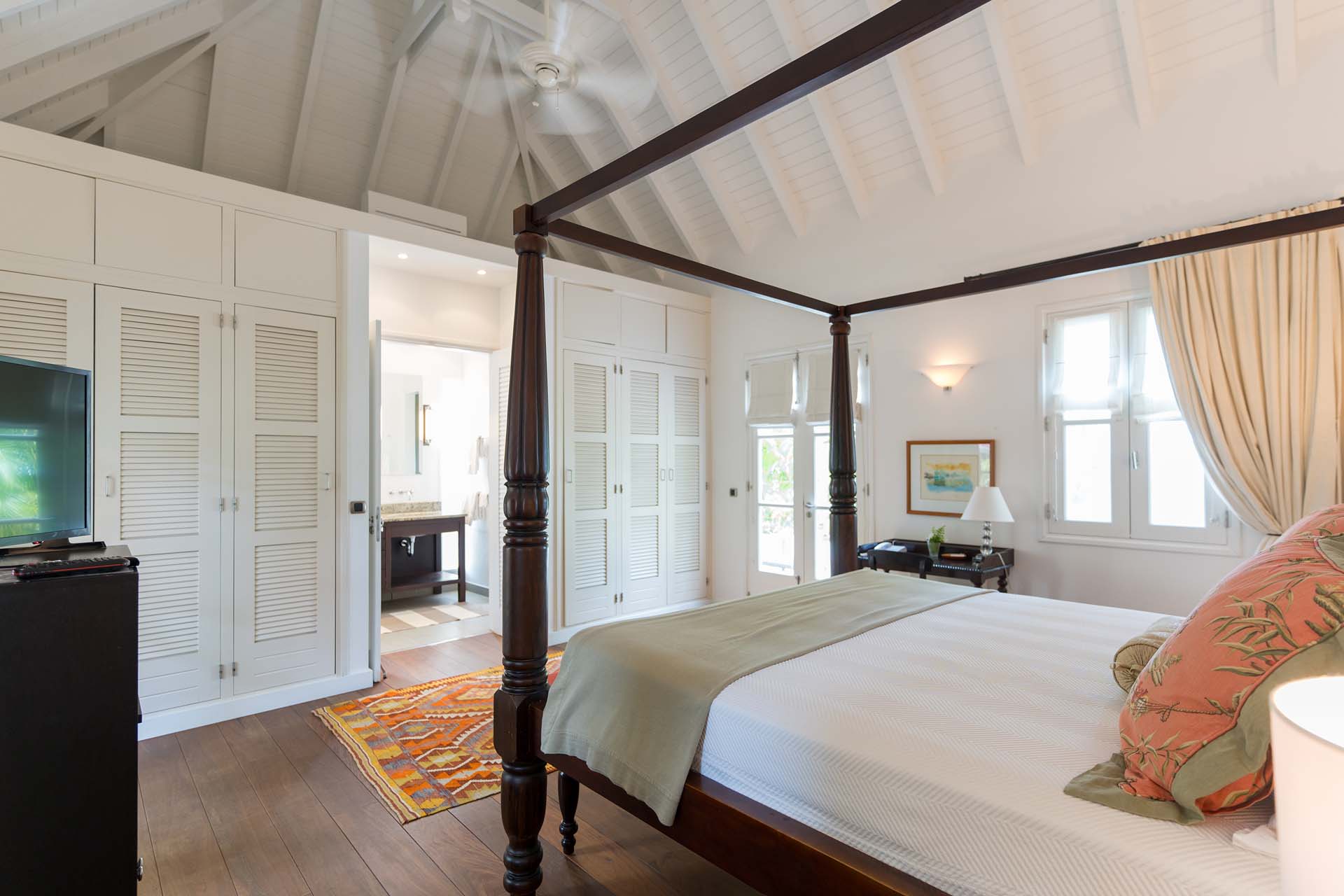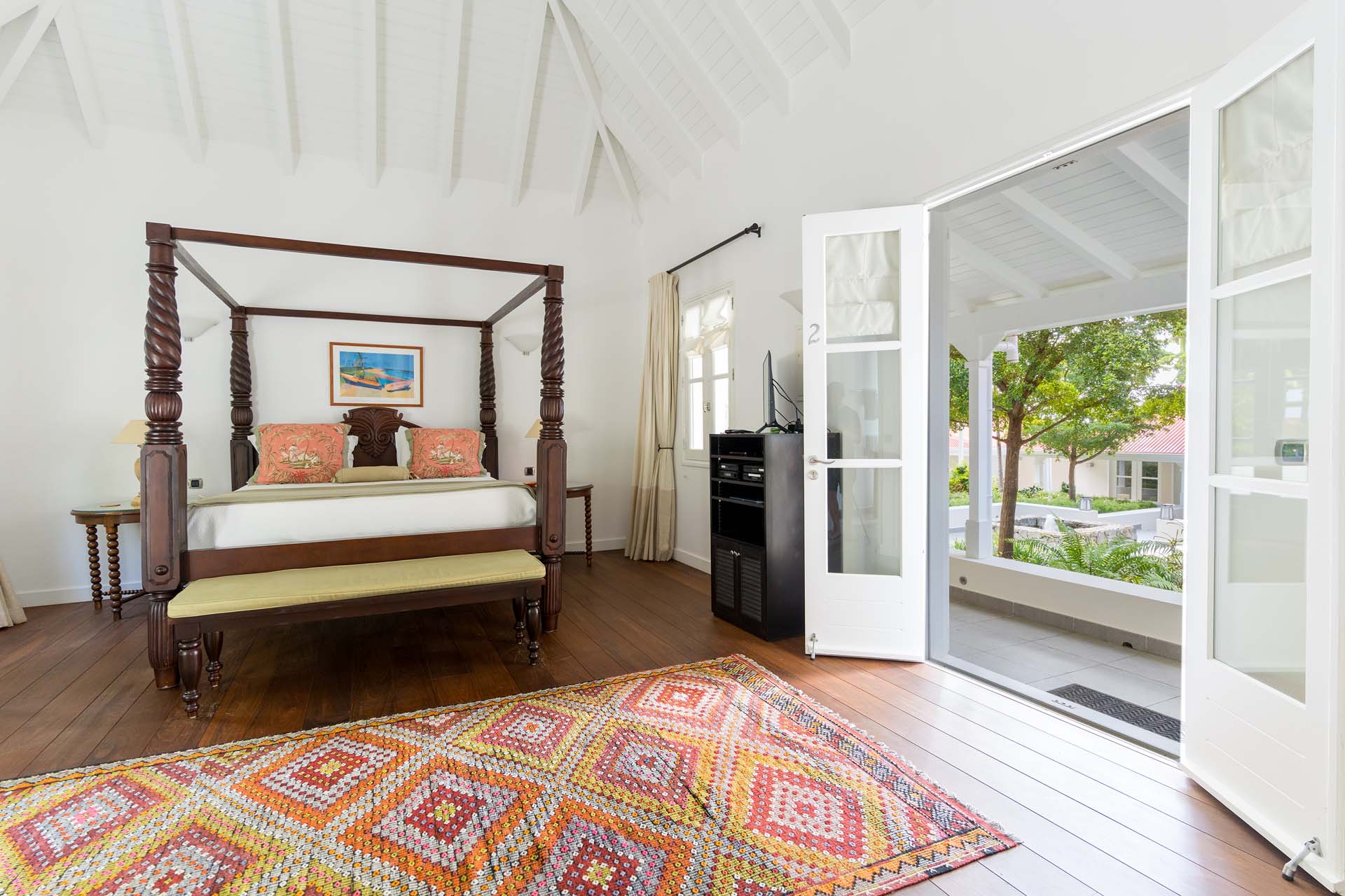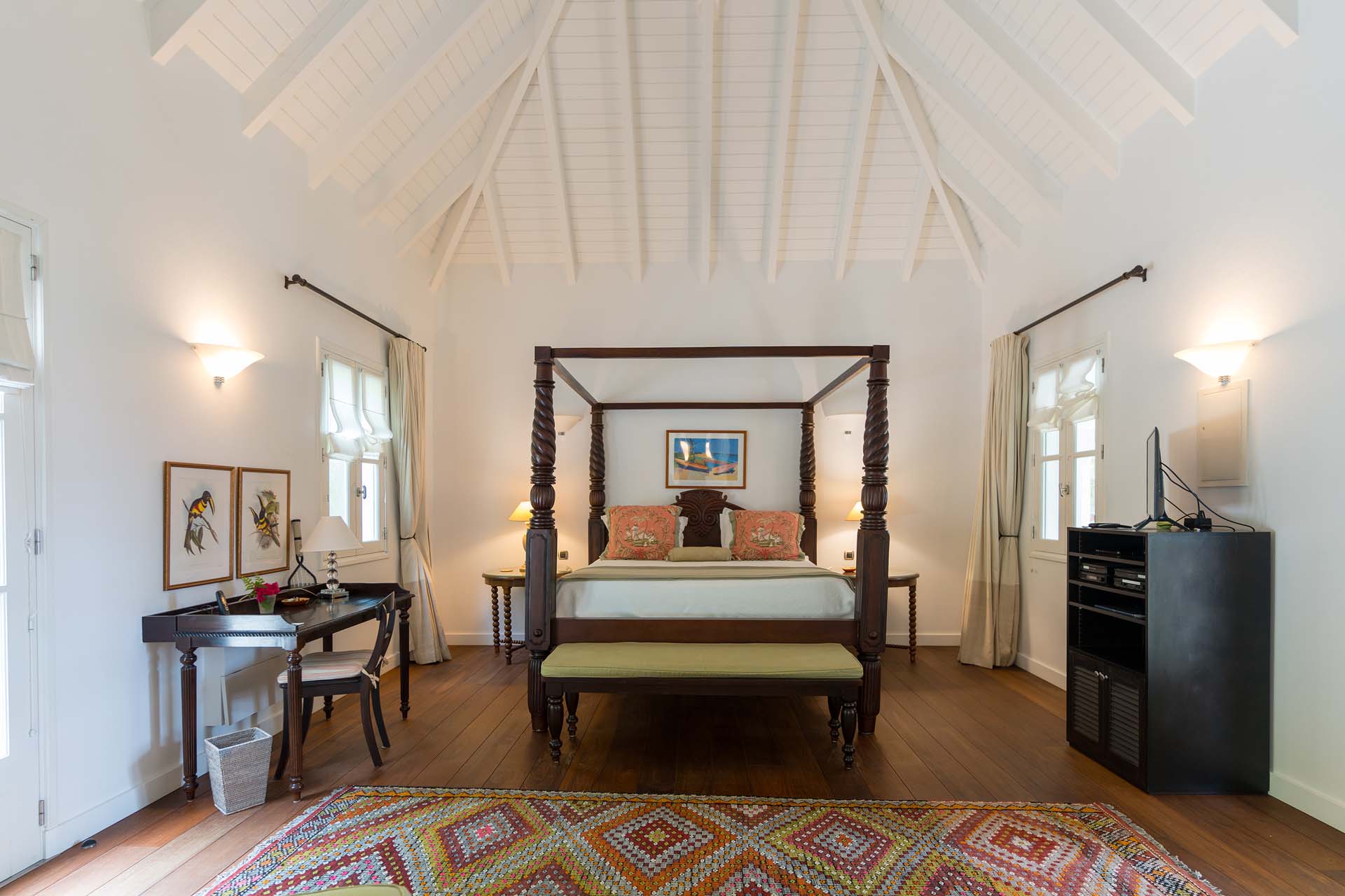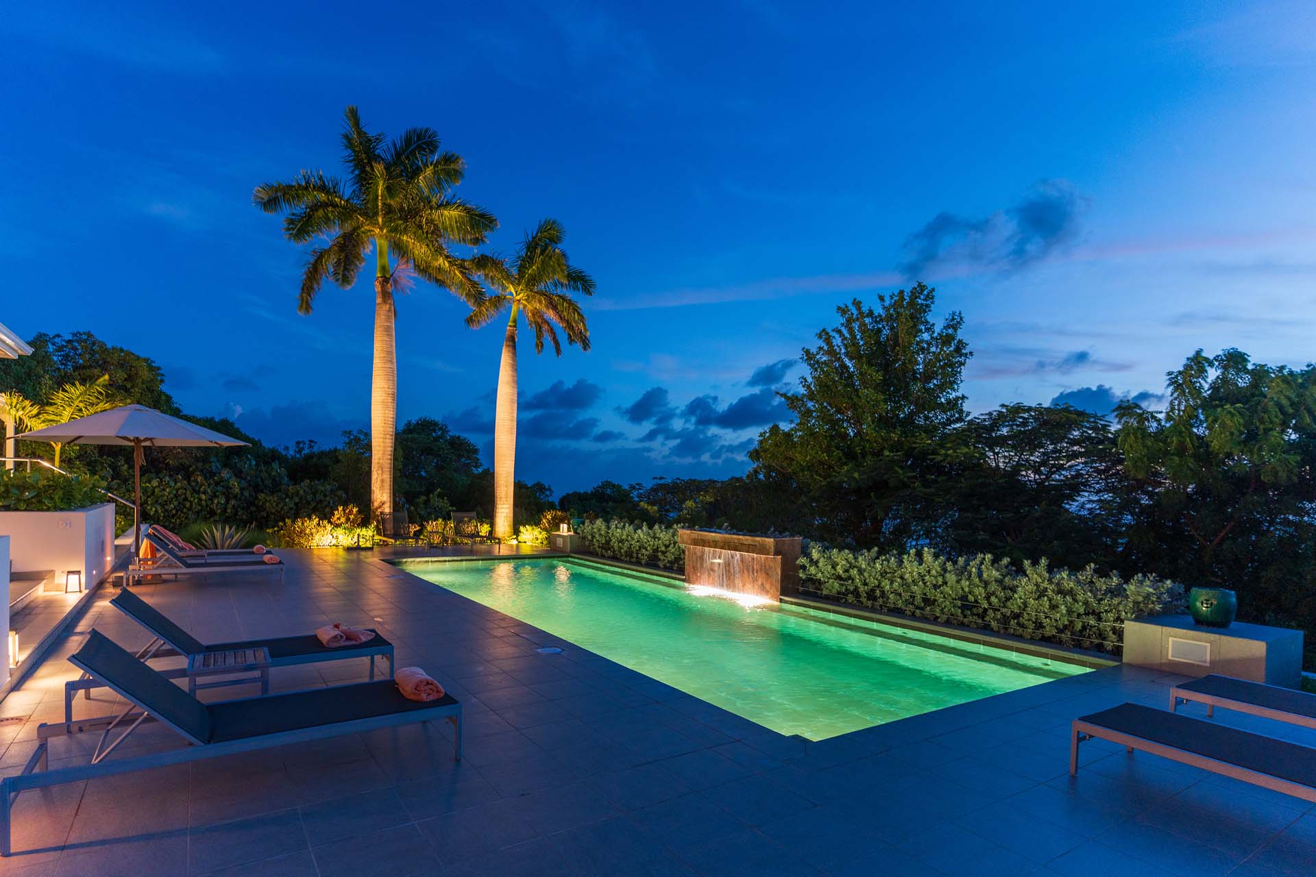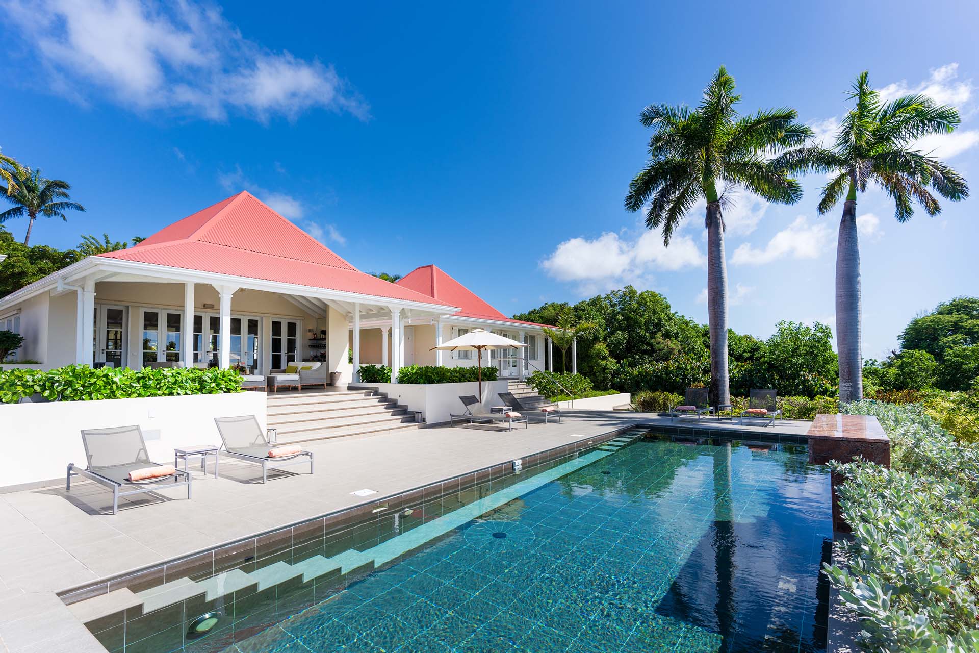 Welcome to Villa Belle Bague (villa code: WV VBB), a contemporary 4-bedroom villa nestled high in the hills of Colombier, St. Barts. This property enjoys some of the best sunset views on the island, taking in the glimmering Caribbean from St. Kitts all the way to Anguilla. The stylish interiors of Villa Belle Bague feature island antiques, vaulted wooden ceilings, and elegant colonial furnishings. Blending with the outdoor spaces, the entire property is clad in a tropical, island atmosphere. This is the luxurious Caribbean living at its very best. Villa Belle Bague is a short drive from the beach and restaurants in Flamands. Elegant restaurants and shops in Gustavia or St-Jean are both just 10 minutes away. Spread over a series of pavilions, Villa Belle Bague is brought together by a series of covered outdoor walkways revolving around a central cloister. With a beautiful garden and stone fountain, this entrance sets the tone for the rest of the relaxing living spaces. The large living room pavilion features French doors opening towards the outdoor terrace and ocean views. Sofas, armchairs, and artworks all pop with vibrant patterns, contrasting with dark wooden details and accents. Belle Bague Villa’s kitchen has stainless steel appliances and granite countertops. Our concierge can organize grocery pre-stocking or delivery, catered meals, or arrange private chef service for a special occasion. The kitchen opens to an outdoor dining area and a full bar under a covered terrace. Dining in the open air with the velvety evening slowly descending will be a highlight of any stay. A formal dining room with a French sideboard has seating suitable for up to 10 guests under an antique chandelier. It’s a magnificent setting for elegant dinners with family and friends. Three of the four bedrooms are in separate cottages, located around the central cloister. Each bedroom has colonial-style furnishings and a French queen-sized bed, offering a fantastic night’s sleep. The rooms also come with an ensuite bathroom with granite-topped vanities and a private terrace ideal for sunbathing. The fourth bedroom is similarly furnished and opens towards the pool terrace. Outside the main living room is the expansive covered deck. A comfortable lounge area with Rattan sofas offers a nice spot to sink in, open a bottle of wine, and enjoy the stunning sunsets across the sea and islands. Steps lead down towards the large, heated pool, featuring a striking granite-faced waterfall. Diving in here is a refreshing way to cool off during the day. Surrounding the pool is a wooden deck furnished with plenty of loungers, letting you soak up the island sun. From its location at the tip of Colombier point, Villa Belle Bague is close to the trail head for the hiking trail that leads down to Colombier beach, a protected nature preserve. A few minutes away by car is the lovely is Flamands Beach. Home to several elegant restaurants and hotels, it’s one of St. Barts’ most upscale areas. For something more rugged, Belle Bague Villa is also minutes away from the trailhead leading to Colombier Beach. Accessed only via foot or with a boat, it’s a fantastic glimpse into the natural beauty of the island. A gym equipped with weights, a rowing machine, and an elliptical is an ideal spot to work up a sweat. For those that need to get some work done, behind the kitchen is also a spacious office, complete with a computer and printer. During Thanksgiving and the December holidays, the villa rents at the full occupancy rate regardless of how many bedrooms are used. This villa is suitable for young children.Please fill out the form to begin your inquiry and we will connect you with a seasoned villa rental specialist.