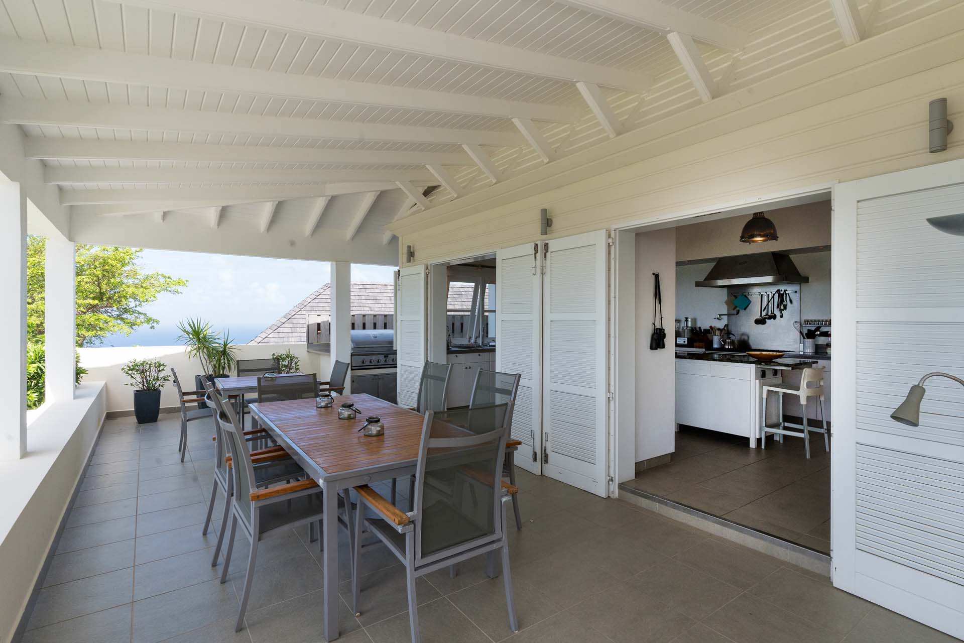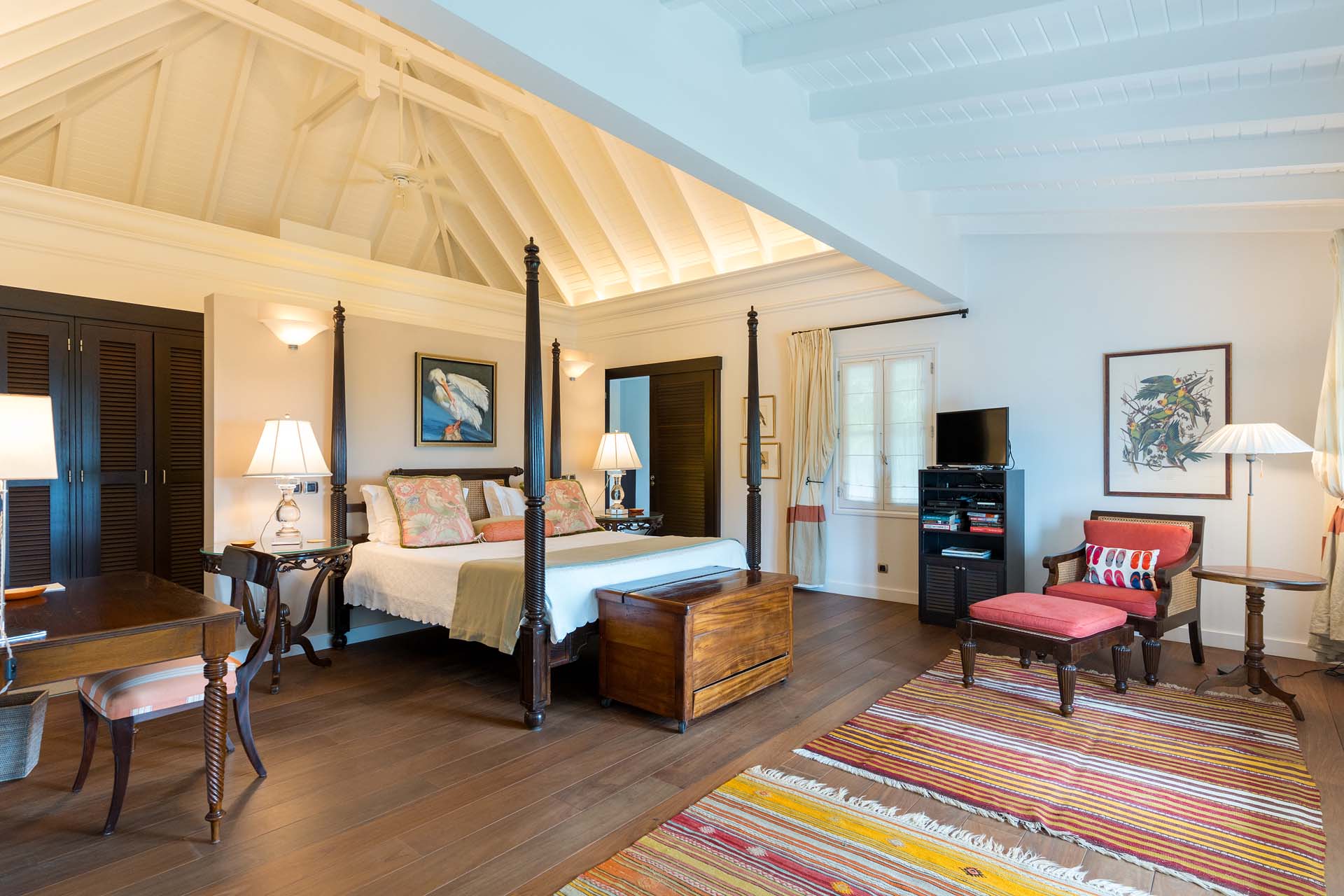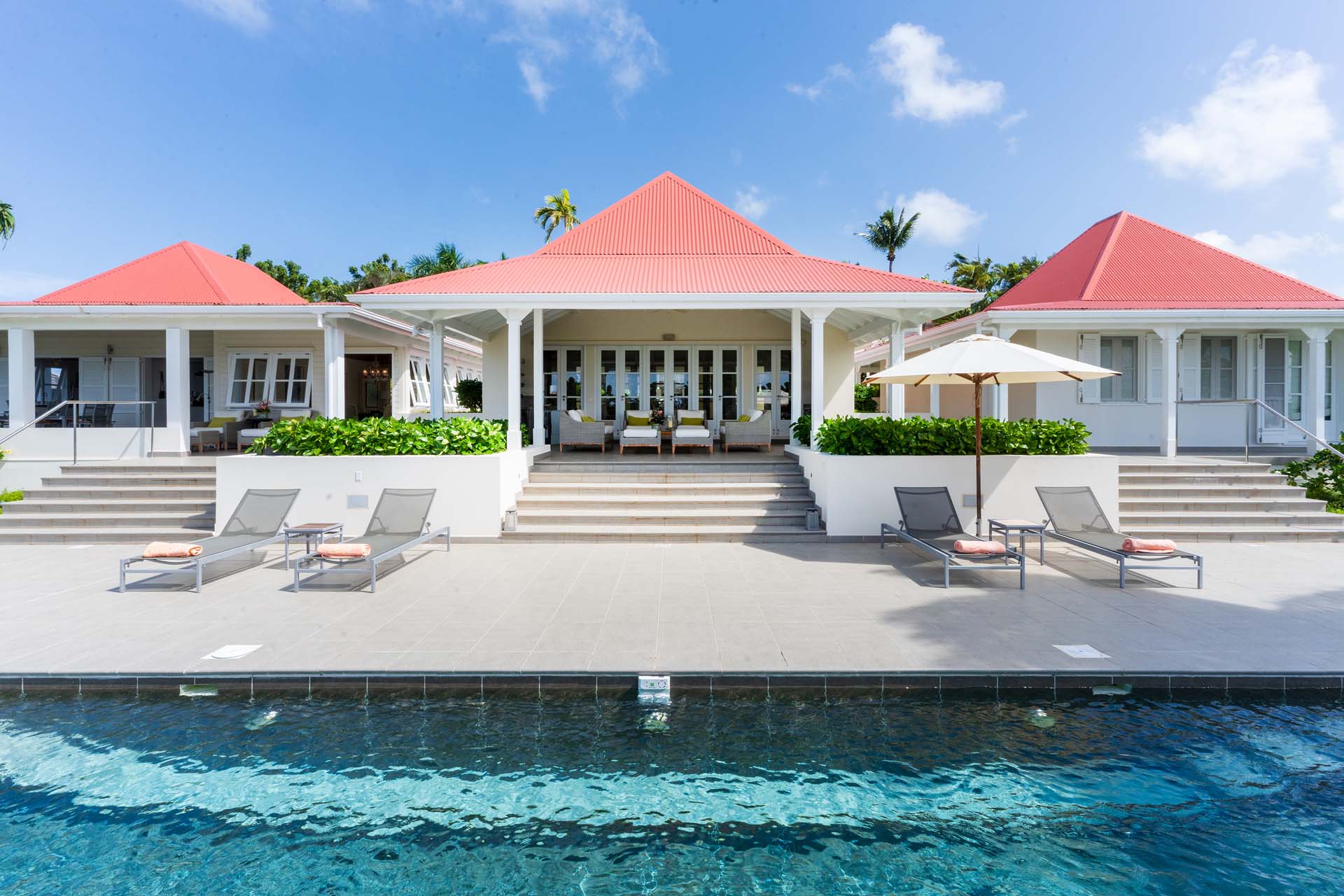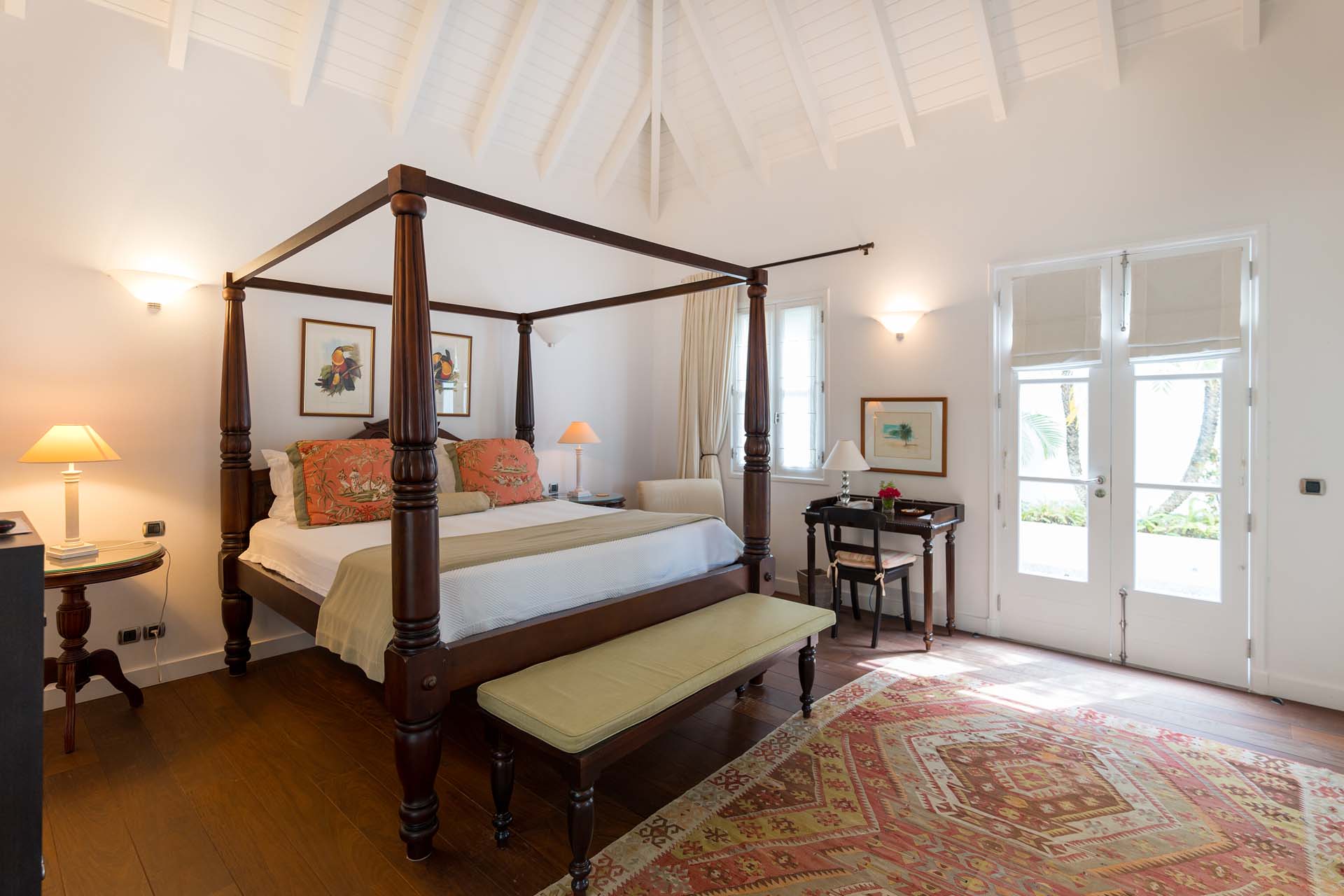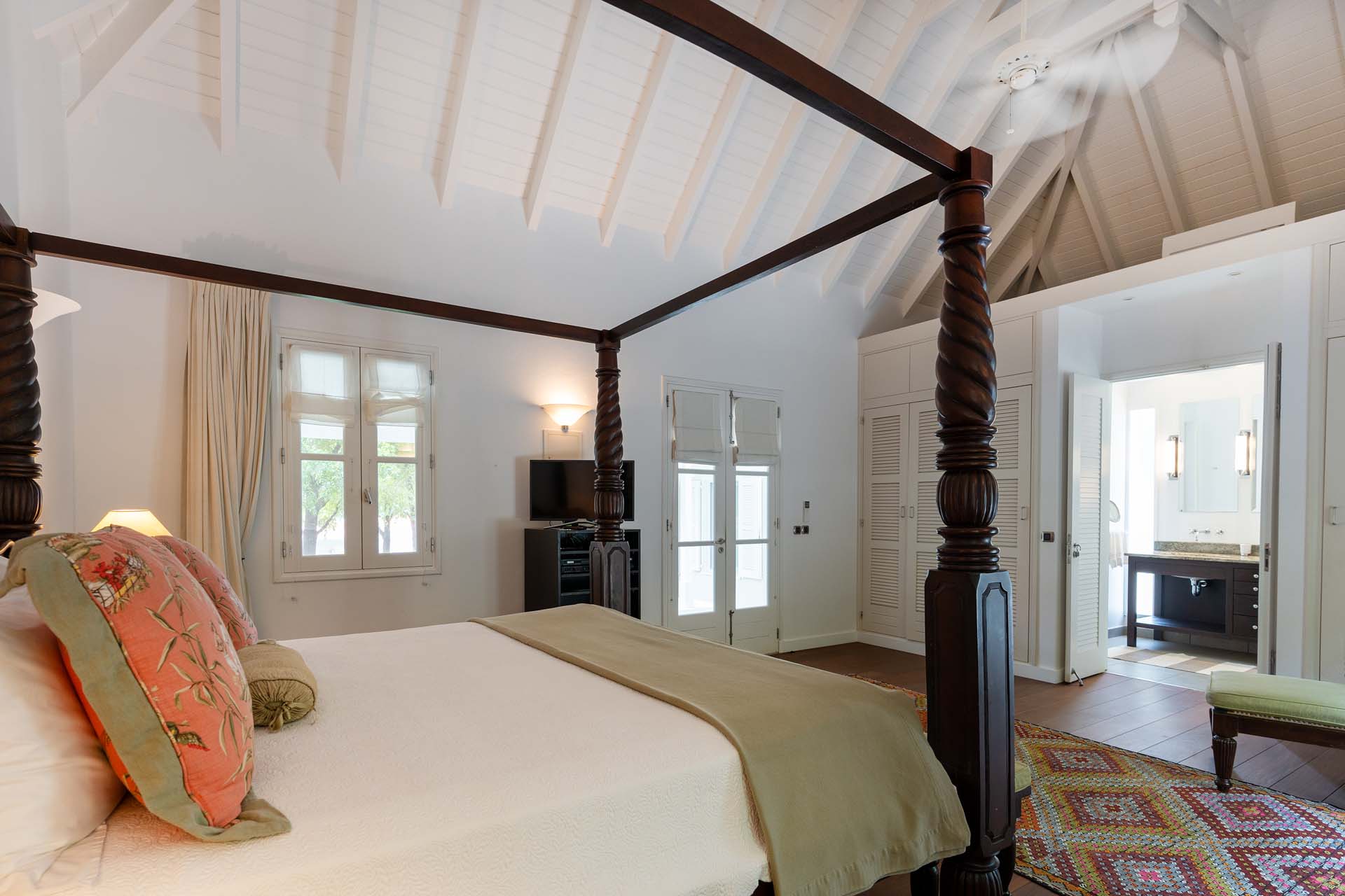Welcome to Villa Belle Bague (villa code: WV VBB), a contemporary 4-bedroom villa nestled high in the hills of Colombier, St. Barts. This property enjoys some of the best sunset views on the island, taking in the glimmering Caribbean from St. Kitts all the way to Anguilla. The stylish interiors of Villa Belle Bague feature island antiques, vaulted wooden ceilings, and elegant colonial furnishings. Blending with the outdoor spaces, the entire property is clad in a tropical, island atmosphere. This is the luxurious Caribbean living at its very best. Villa Belle Bague is a short drive from the beach and restaurants in Flamands. Elegant restaurants and shops in Gustavia or St-Jean are both just 10 minutes away. Spread over a series of pavilions, Villa Belle Bague is brought together by a series of covered outdoor walkways revolving around a central cloister. With a beautiful garden and stone fountain, this entrance sets the tone for the rest of the relaxing living spaces. The large living room pavilion features French doors opening towards the outdoor terrace and ocean views. Sofas, armchairs, and artworks all pop with vibrant patterns, contrasting with dark wooden details and accents. Belle Bague Villa’s kitchen has stainless steel appliances and granite countertops. Our concierge can organize grocery pre-stocking or delivery, catered meals, or arrange private chef service for a special occasion. The kitchen opens to an outdoor dining area and a full bar under a covered terrace. Dining in the open air with the velvety evening slowly descending will be a highlight of any stay. A formal dining room with a French sideboard has seating suitable for up to 10 guests under an antique chandelier. It’s a magnificent setting for elegant dinners with family and friends. Three of the four bedrooms are in separate cottages, located around the central cloister. Each bedroom has colonial-style furnishings and a French queen-sized bed, offering a fantastic night’s sleep. The rooms also come with an ensuite bathroom with granite-topped vanities and a private terrace ideal for sunbathing. The fourth bedroom is similarly furnished and opens towards the pool terrace. Outside the main living room is the expansive covered deck. A comfortable lounge area with Rattan sofas offers a nice spot to sink in, open a bottle of wine, and enjoy the stunning sunsets across the sea and islands. Steps lead down towards the large, heated pool, featuring a striking granite-faced waterfall. Diving in here is a refreshing way to cool off during the day. Surrounding the pool is a wooden deck furnished with plenty of loungers, letting you soak up the island sun. From its location at the tip of Colombier point, Villa Belle Bague is close to the trail head for the hiking trail that leads down to Colombier beach, a protected nature preserve. A few minutes away by car is the lovely is Flamands Beach. Home to several elegant restaurants and hotels, it’s one of St. Barts’ most upscale areas. For something more rugged, Belle Bague Villa is also minutes away from the trailhead leading to Colombier Beach. Accessed only via foot or with a boat, it’s a fantastic glimpse into the natural beauty of the island. A gym equipped with weights, a rowing machine, and an elliptical is an ideal spot to work up a sweat. For those that need to get some work done, behind the kitchen is also a spacious office, complete with a computer and printer. During Thanksgiving and the December holidays, the villa rents at the full occupancy rate regardless of how many bedrooms are used. This villa is suitable for young children.Please fill out the form to begin your inquiry and we will connect you with a seasoned villa rental specialist.