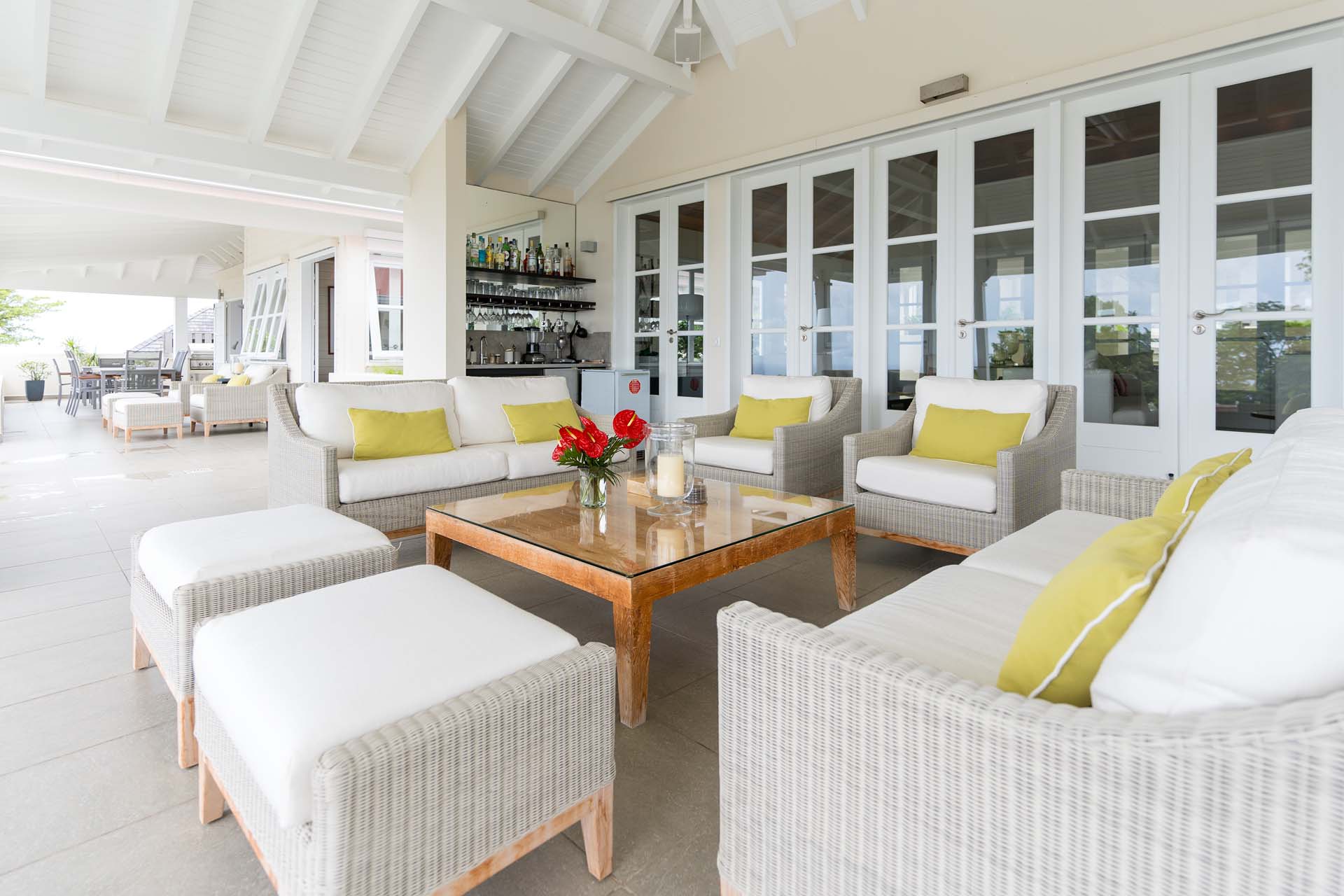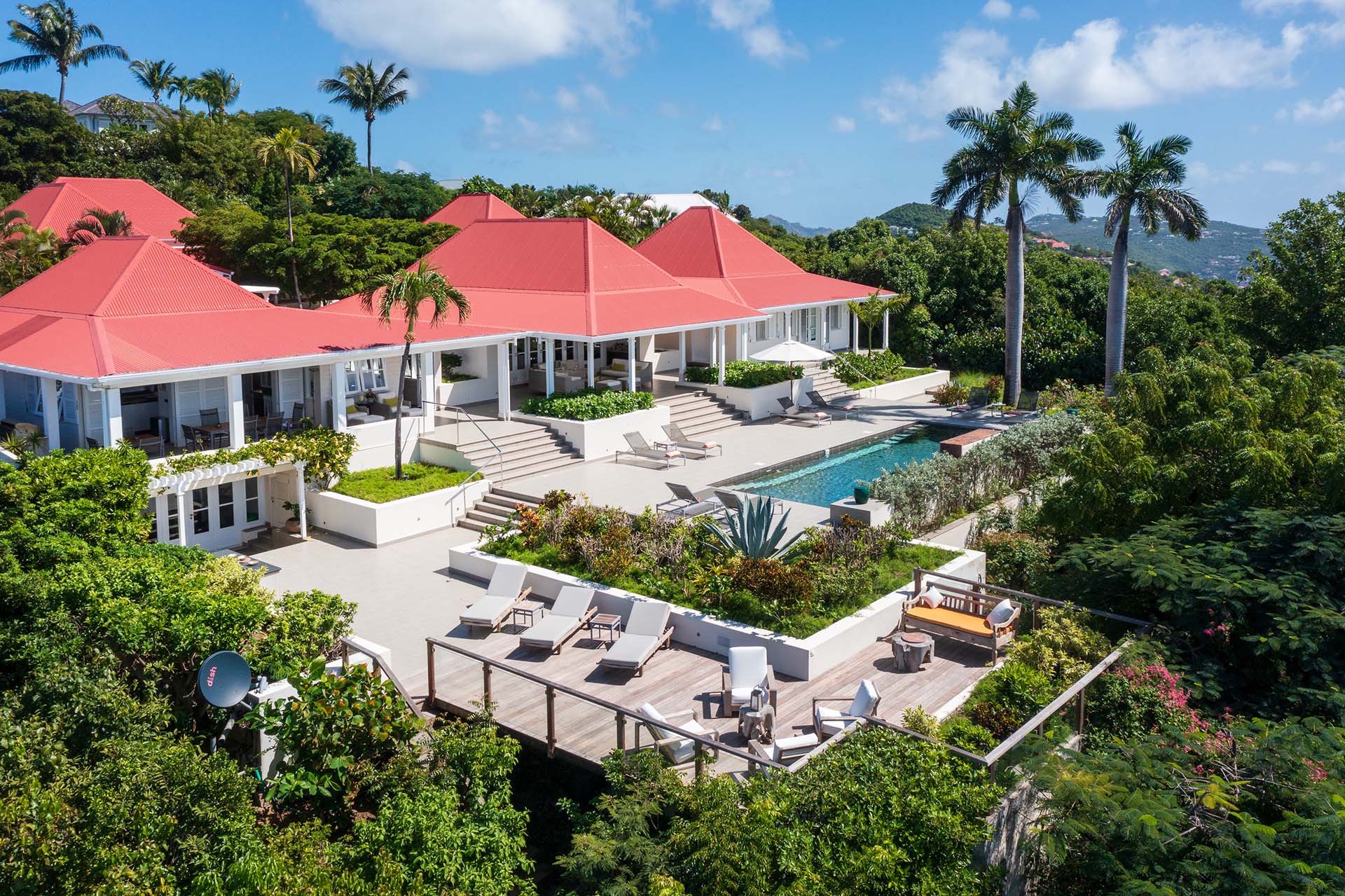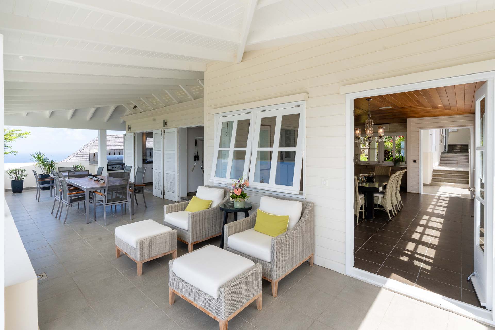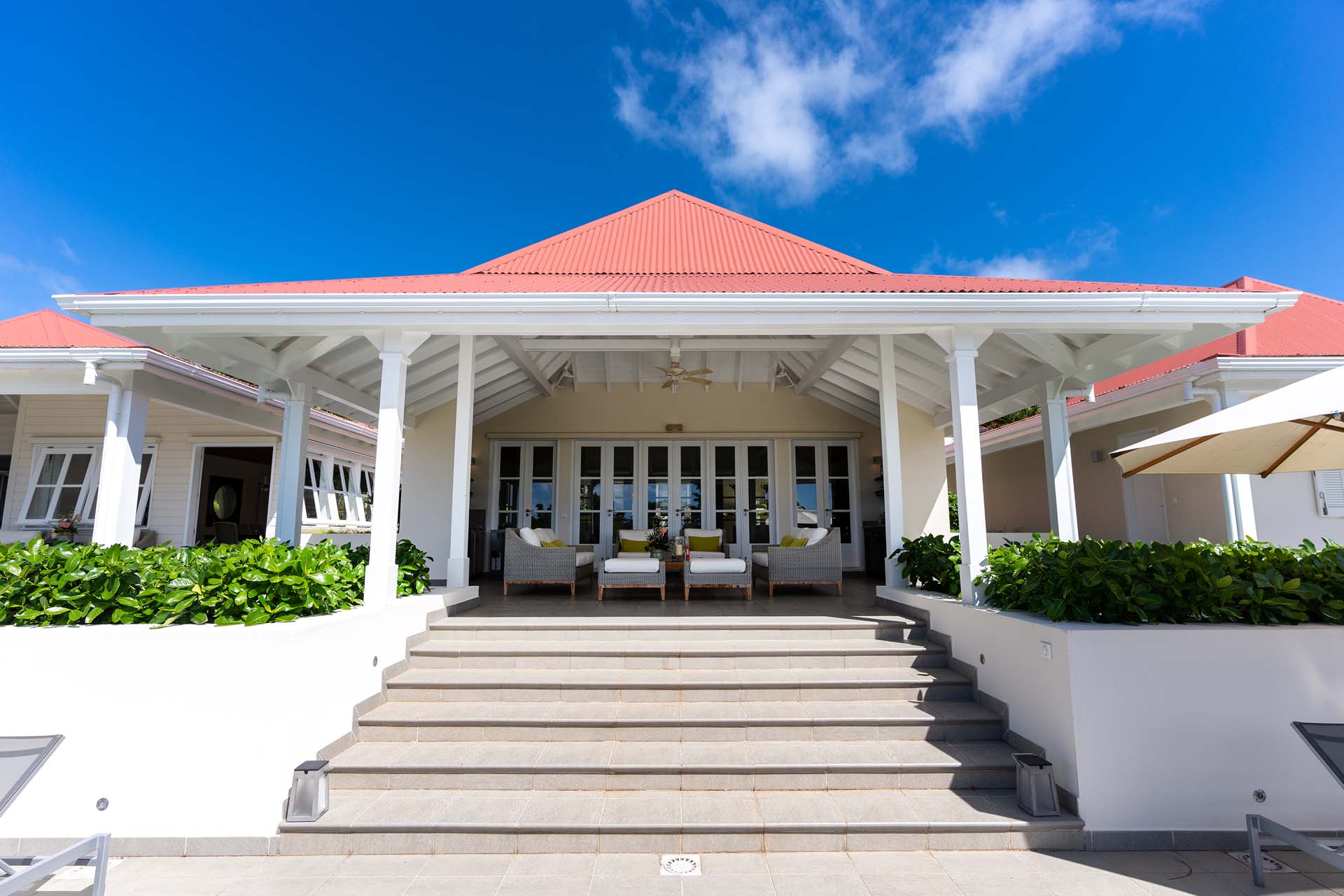 Welcome to Villa Belle Bague (villa code: WV VBB), a contemporary 4-bedroom villa nestled high in the hills of Colombier, St. Barts. This property enjoys some of the best sunset views on the island, taking in the glimmering Caribbean from St. Kitts all the way to Anguilla. The stylish interiors of Villa Belle Bague feature island antiques, vaulted wooden ceilings, and elegant colonial furnishings. Blending with the outdoor spaces, the entire property is clad in a tropical, island atmosphere. This is the luxurious Caribbean living at its very best. Villa Belle Bague is a short drive from the beach and restaurants in Flamands. Elegant restaurants and shops in Gustavia or St-Jean are both just 10 minutes away. Spread over a series of pavilions, Villa Belle Bague is brought together by a series of covered outdoor walkways revolving around a central cloister. With a beautiful garden and stone fountain, this entrance sets the tone for the rest of the relaxing living spaces. The large living room pavilion features French doors opening towards the outdoor terrace and ocean views. Sofas, armchairs, and artworks all pop with vibrant patterns, contrasting with dark wooden details and accents. Belle Bague Villa’s kitchen has stainless steel appliances and granite countertops. Our concierge can organize grocery pre-stocking or delivery, catered meals, or arrange private chef service for a special occasion. The kitchen opens to an outdoor dining area and a full bar under a covered terrace. Dining in the open air with the velvety evening slowly descending will be a highlight of any stay. A formal dining room with a French sideboard has seating suitable for up to 10 guests under an antique chandelier. It’s a magnificent setting for elegant dinners with family and friends. Three of the four bedrooms are in separate cottages, located around the central cloister. Each bedroom has colonial-style furnishings and a French queen-sized bed, offering a fantastic night’s sleep. The rooms also come with an ensuite bathroom with granite-topped vanities and a private terrace ideal for sunbathing. The fourth bedroom is similarly furnished and opens towards the pool terrace. Outside the main living room is the expansive covered deck. A comfortable lounge area with Rattan sofas offers a nice spot to sink in, open a bottle of wine, and enjoy the stunning sunsets across the sea and islands. Steps lead down towards the large, heated pool, featuring a striking granite-faced waterfall. Diving in here is a refreshing way to cool off during the day. Surrounding the pool is a wooden deck furnished with plenty of loungers, letting you soak up the island sun. From its location at the tip of Colombier point, Villa Belle Bague is close to the trail head for the hiking trail that leads down to Colombier beach, a protected nature preserve. A few minutes away by car is the lovely is Flamands Beach. Home to several elegant restaurants and hotels, it’s one of St. Barts’ most upscale areas. For something more rugged, Belle Bague Villa is also minutes away from the trailhead leading to Colombier Beach. Accessed only via foot or with a boat, it’s a fantastic glimpse into the natural beauty of the island. A gym equipped with weights, a rowing machine, and an elliptical is an ideal spot to work up a sweat. For those that need to get some work done, behind the kitchen is also a spacious office, complete with a computer and printer. During Thanksgiving and the December holidays, the villa rents at the full occupancy rate regardless of how many bedrooms are used. This villa is suitable for young children.Please fill out the form to begin your inquiry and we will connect you with a seasoned villa rental specialist.