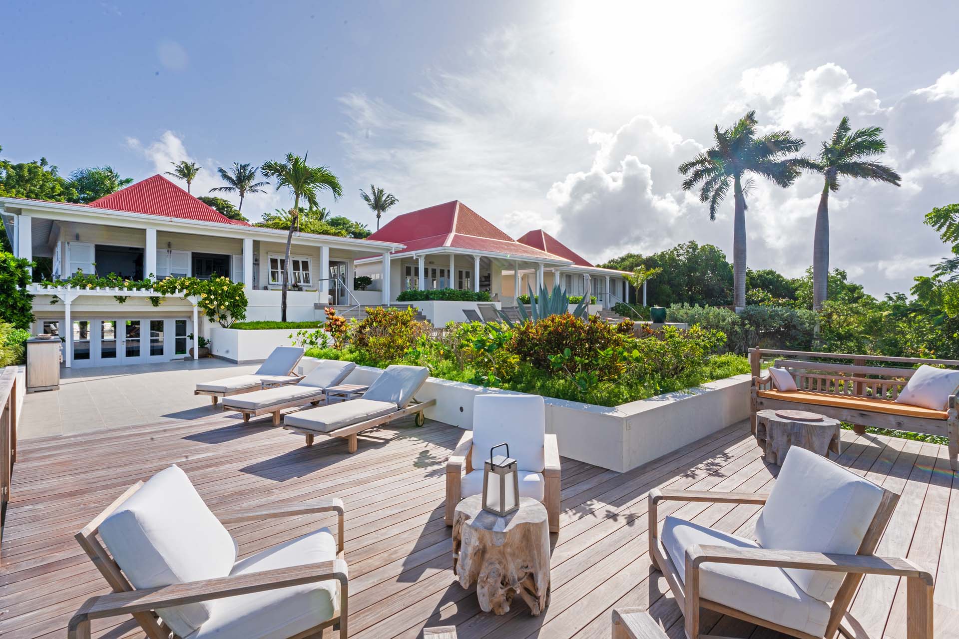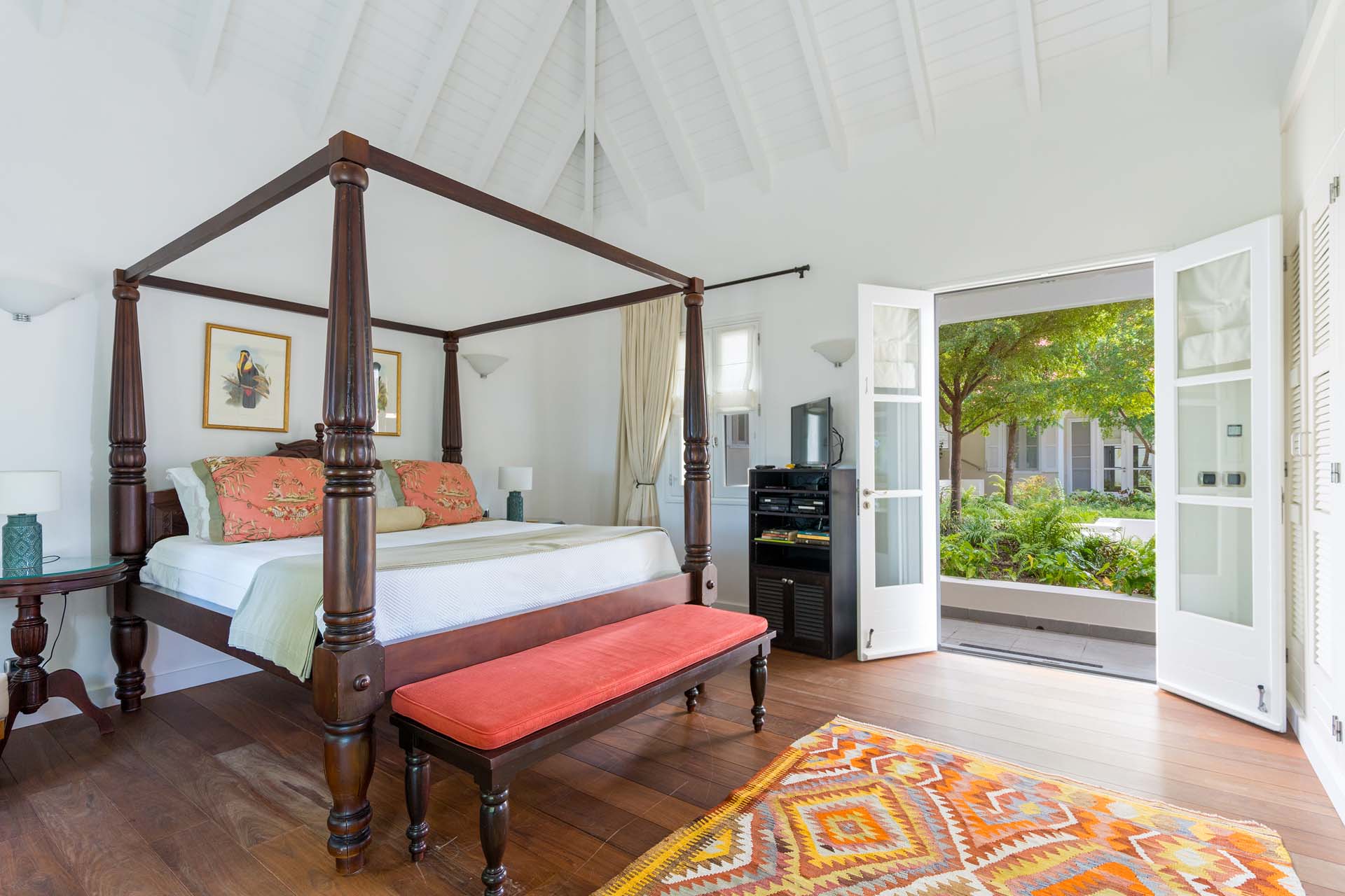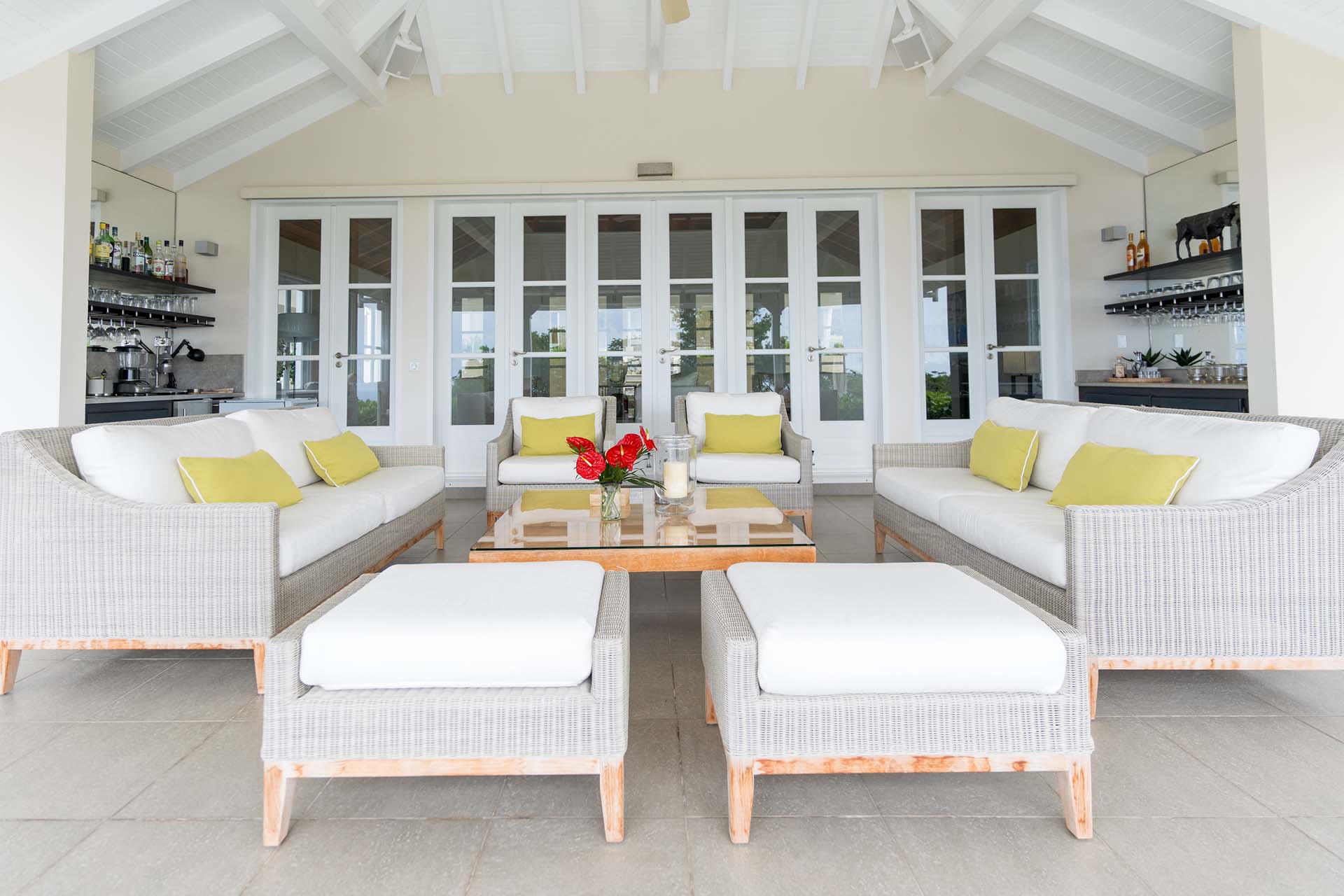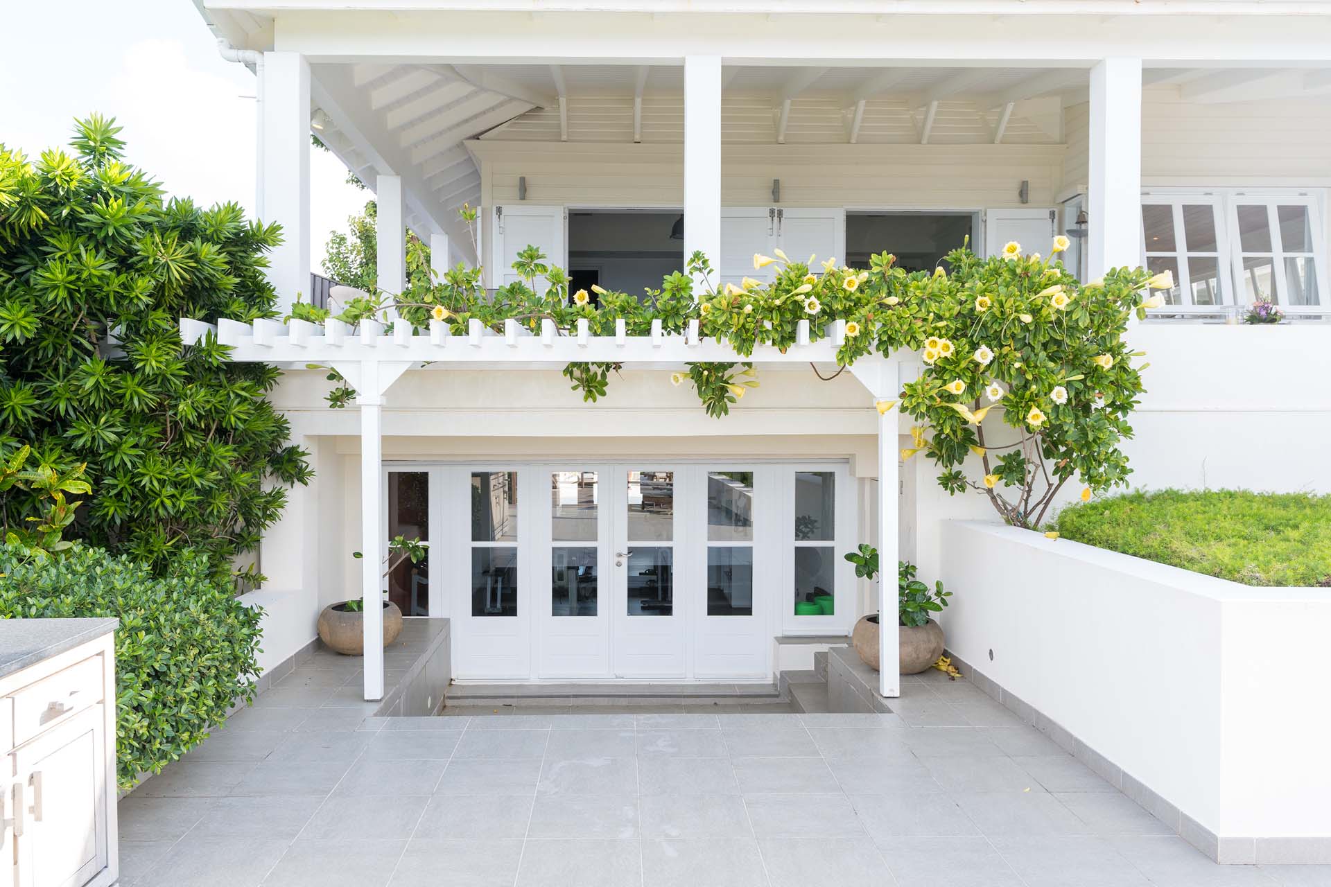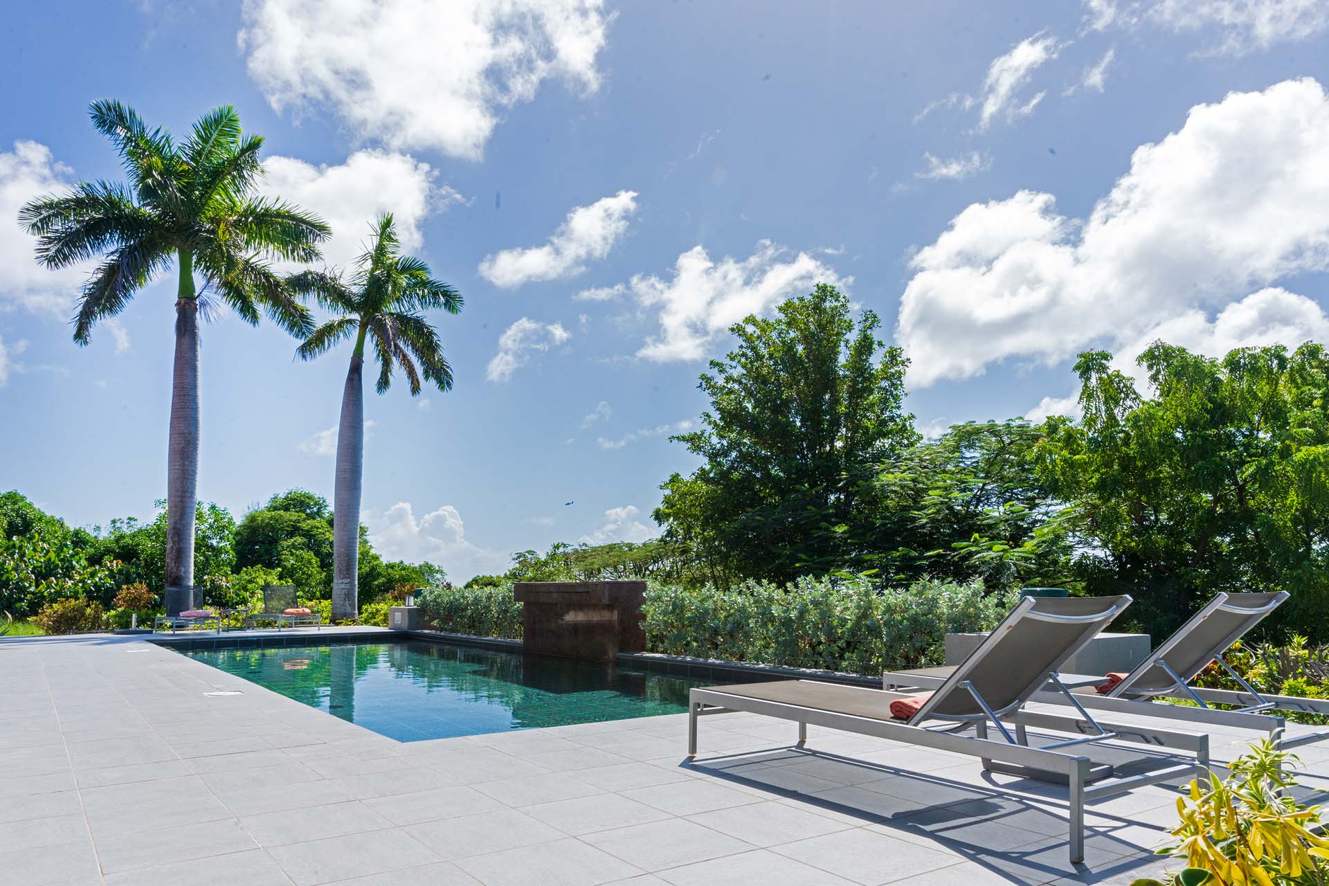 Welcome to Villa Belle Bague (villa code: WV VBB), a contemporary 4-bedroom villa nestled high in the hills of Colombier, St. Barts. This property enjoys some of the best sunset views on the island, taking in the glimmering Caribbean from St. Kitts all the way to Anguilla. The stylish interiors of Villa Belle Bague feature island antiques, vaulted wooden ceilings, and elegant colonial furnishings. Blending with the outdoor spaces, the entire property is clad in a tropical, island atmosphere. This is the luxurious Caribbean living at its very best. Villa Belle Bague is a short drive from the beach and restaurants in Flamands. Elegant restaurants and shops in Gustavia or St-Jean are both just 10 minutes away. Spread over a series of pavilions, Villa Belle Bague is brought together by a series of covered outdoor walkways revolving around a central cloister. With a beautiful garden and stone fountain, this entrance sets the tone for the rest of the relaxing living spaces. The large living room pavilion features French doors opening towards the outdoor terrace and ocean views. Sofas, armchairs, and artworks all pop with vibrant patterns, contrasting with dark wooden details and accents. Belle Bague Villa’s kitchen has stainless steel appliances and granite countertops. Our concierge can organize grocery pre-stocking or delivery, catered meals, or arrange private chef service for a special occasion. The kitchen opens to an outdoor dining area and a full bar under a covered terrace. Dining in the open air with the velvety evening slowly descending will be a highlight of any stay. A formal dining room with a French sideboard has seating suitable for up to 10 guests under an antique chandelier. It’s a magnificent setting for elegant dinners with family and friends. Three of the four bedrooms are in separate cottages, located around the central cloister. Each bedroom has colonial-style furnishings and a French queen-sized bed, offering a fantastic night’s sleep. The rooms also come with an ensuite bathroom with granite-topped vanities and a private terrace ideal for sunbathing. The fourth bedroom is similarly furnished and opens towards the pool terrace. Outside the main living room is the expansive covered deck. A comfortable lounge area with Rattan sofas offers a nice spot to sink in, open a bottle of wine, and enjoy the stunning sunsets across the sea and islands. Steps lead down towards the large, heated pool, featuring a striking granite-faced waterfall. Diving in here is a refreshing way to cool off during the day. Surrounding the pool is a wooden deck furnished with plenty of loungers, letting you soak up the island sun. From its location at the tip of Colombier point, Villa Belle Bague is close to the trail head for the hiking trail that leads down to Colombier beach, a protected nature preserve. A few minutes away by car is the lovely is Flamands Beach. Home to several elegant restaurants and hotels, it’s one of St. Barts’ most upscale areas. For something more rugged, Belle Bague Villa is also minutes away from the trailhead leading to Colombier Beach. Accessed only via foot or with a boat, it’s a fantastic glimpse into the natural beauty of the island. A gym equipped with weights, a rowing machine, and an elliptical is an ideal spot to work up a sweat. For those that need to get some work done, behind the kitchen is also a spacious office, complete with a computer and printer. During Thanksgiving and the December holidays, the villa rents at the full occupancy rate regardless of how many bedrooms are used. This villa is suitable for young children.Please fill out the form to begin your inquiry and we will connect you with a seasoned villa rental specialist.