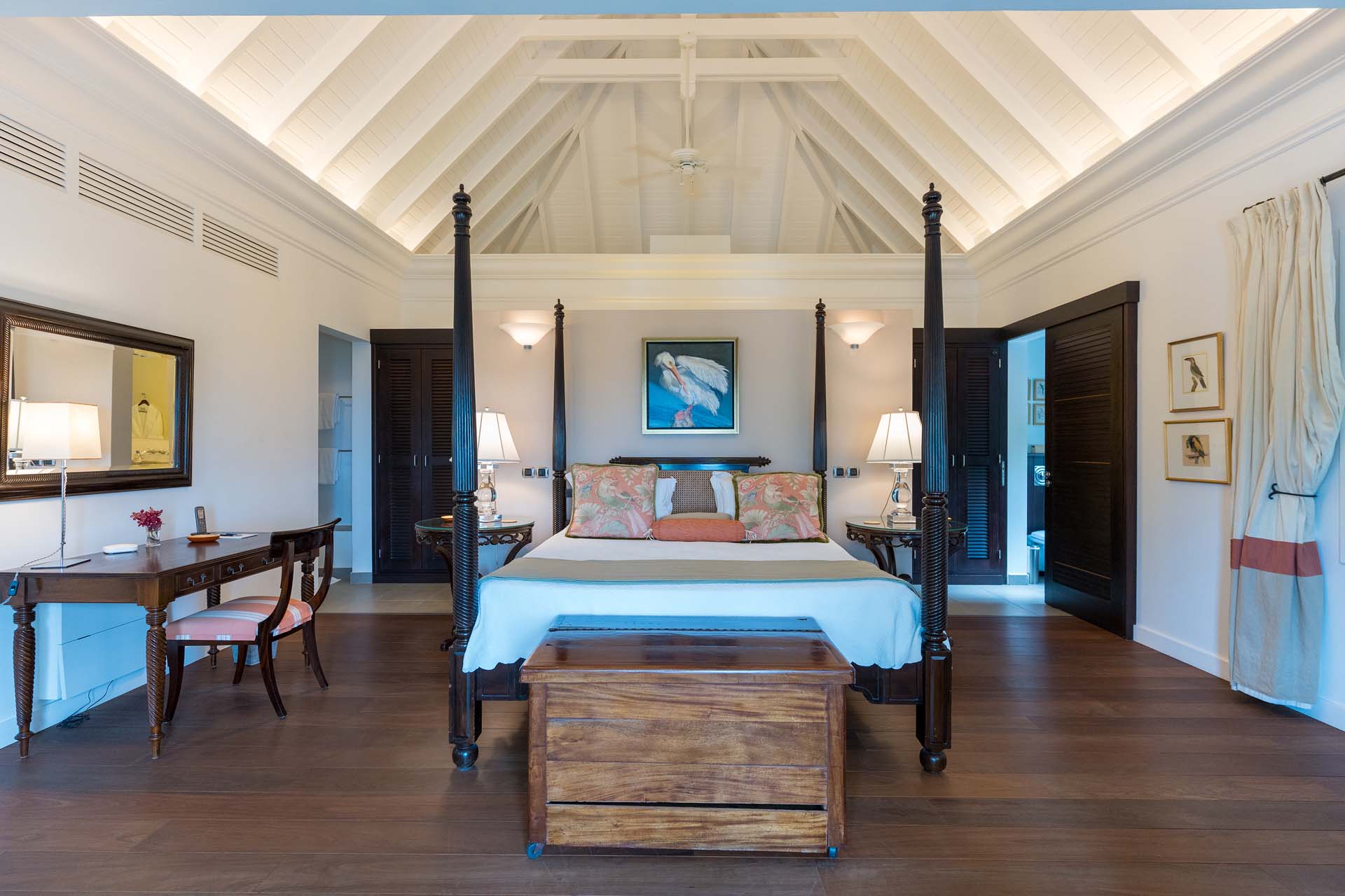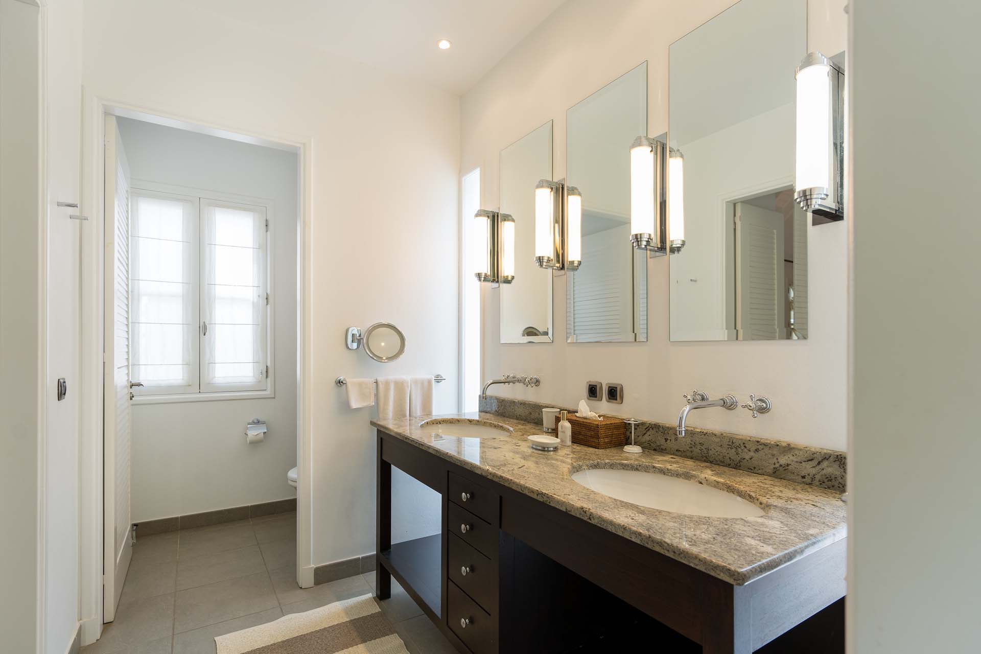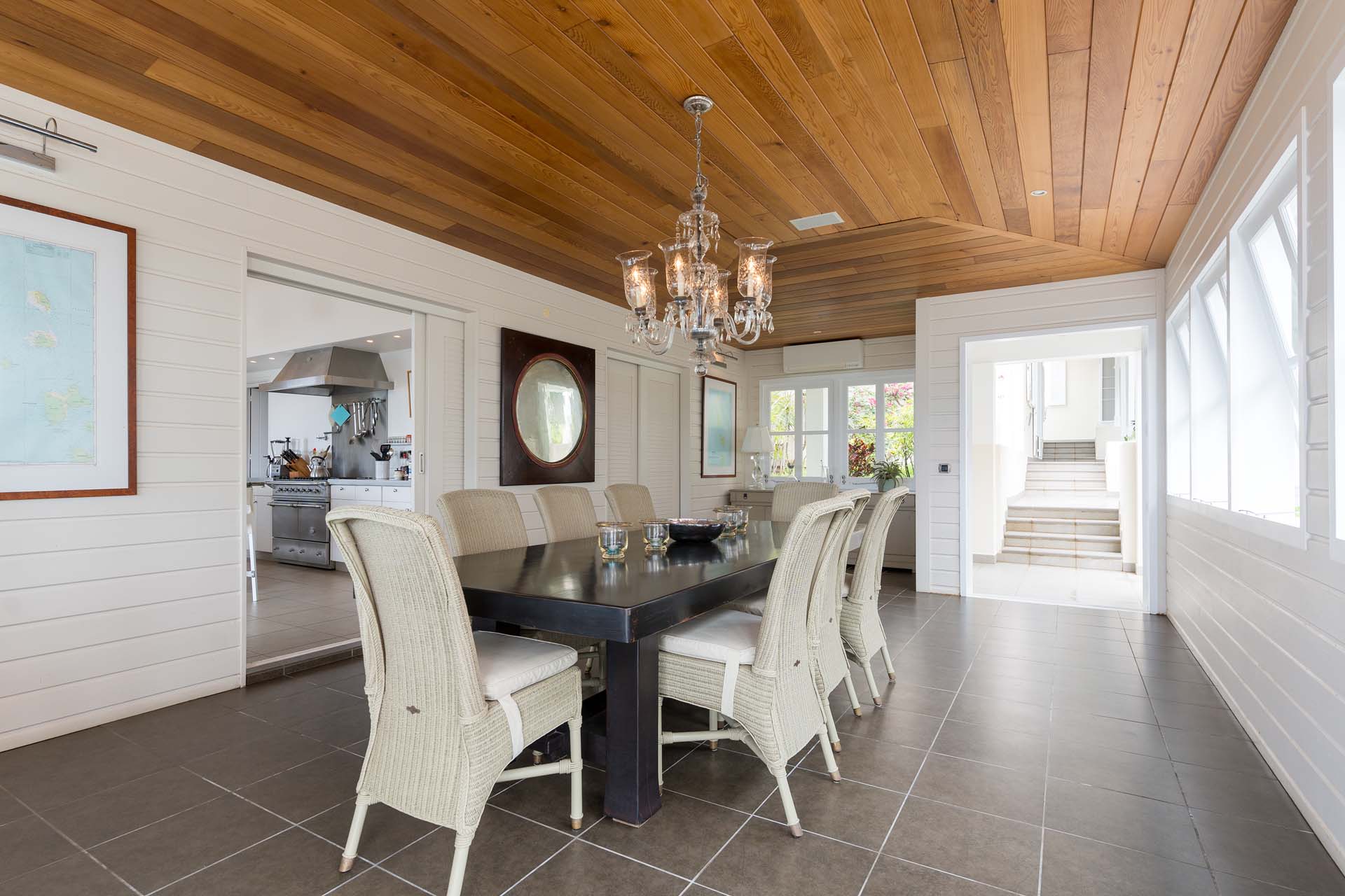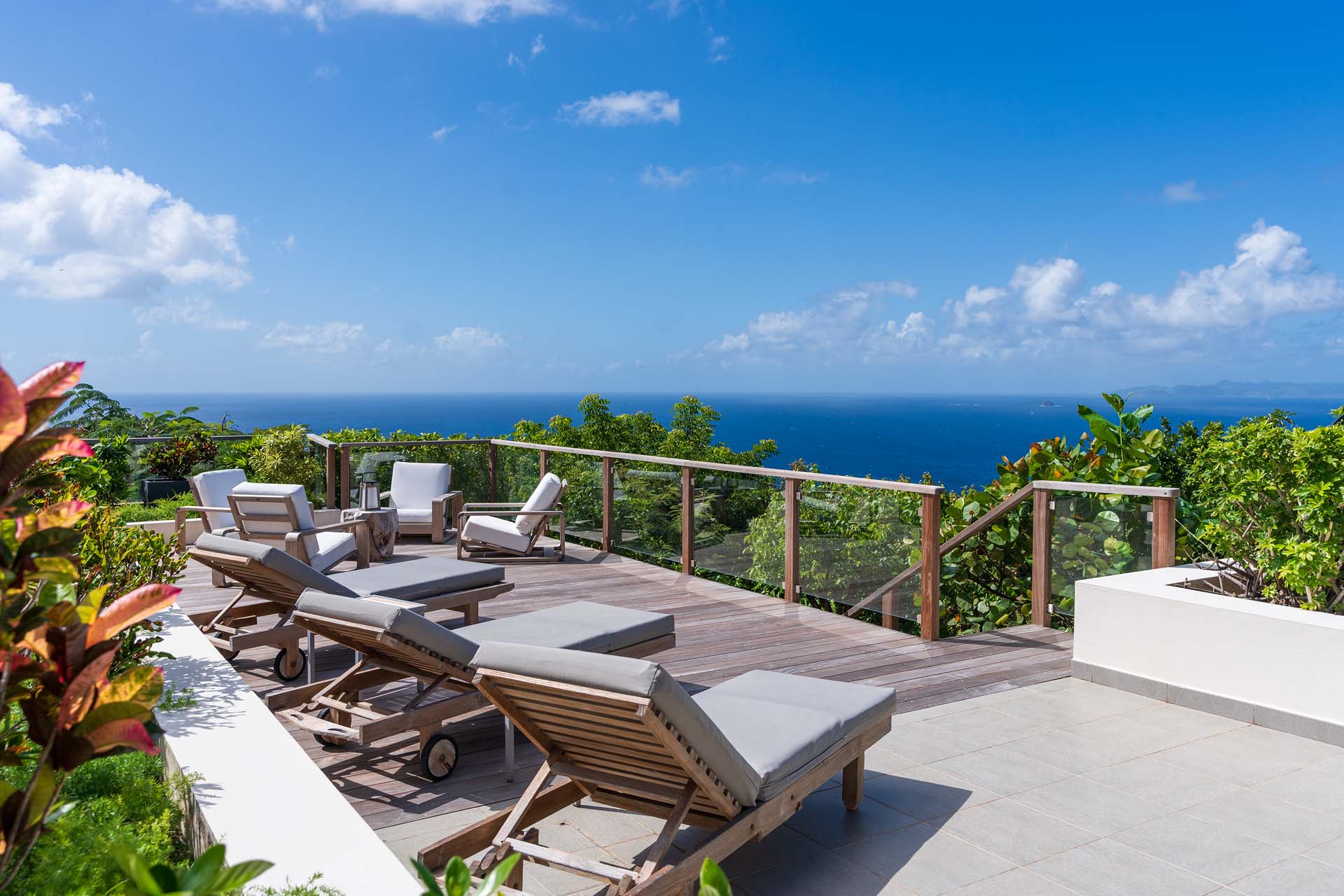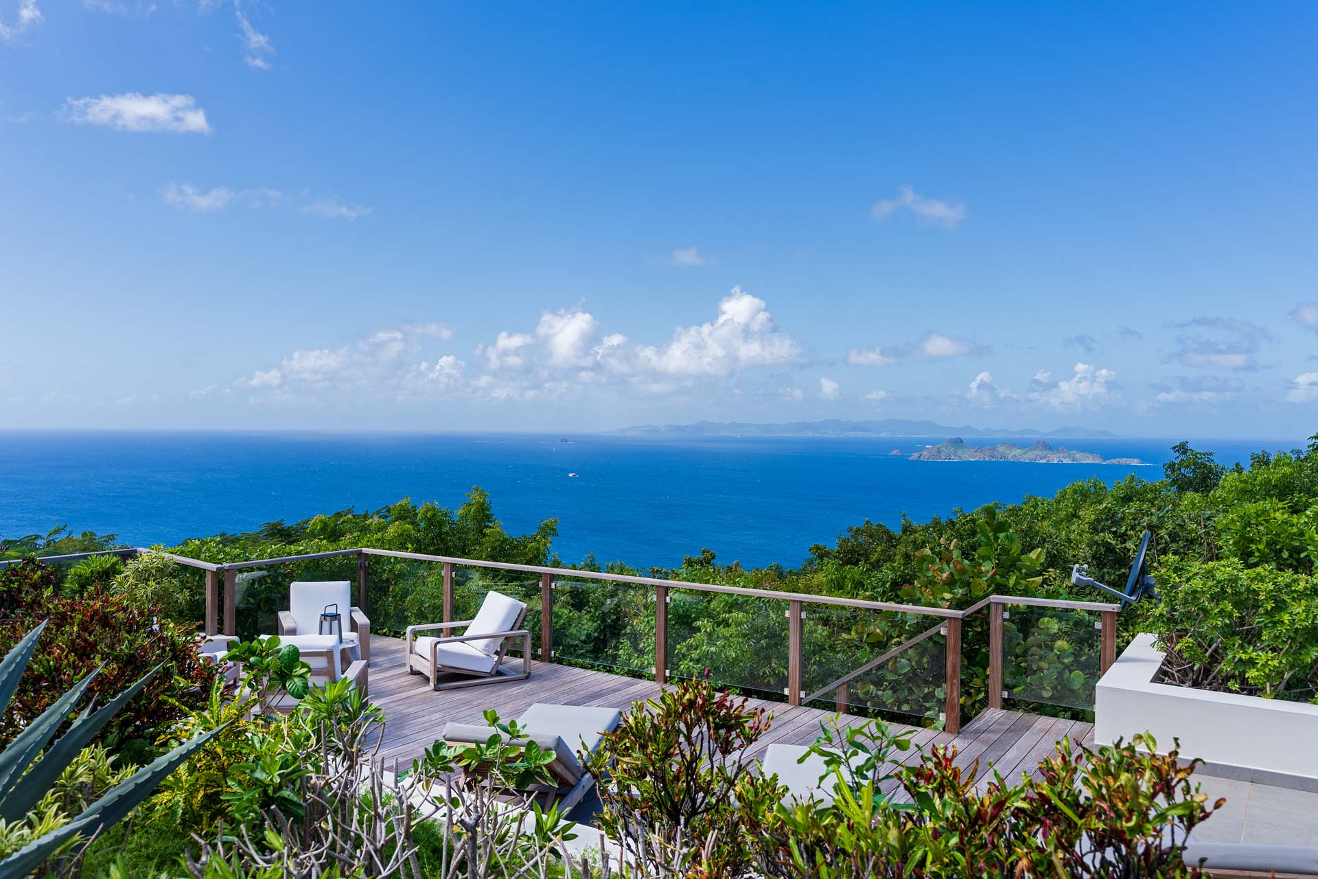 Welcome to Villa Belle Bague (villa code: WV VBB), a contemporary 4-bedroom villa nestled high in the hills of Colombier, St. Barts. This property enjoys some of the best sunset views on the island, taking in the glimmering Caribbean from St. Kitts all the way to Anguilla. The stylish interiors of Villa Belle Bague feature island antiques, vaulted wooden ceilings, and elegant colonial furnishings. Blending with the outdoor spaces, the entire property is clad in a tropical, island atmosphere. This is the luxurious Caribbean living at its very best. Villa Belle Bague is a short drive from the beach and restaurants in Flamands. Elegant restaurants and shops in Gustavia or St-Jean are both just 10 minutes away. Spread over a series of pavilions, Villa Belle Bague is brought together by a series of covered outdoor walkways revolving around a central cloister. With a beautiful garden and stone fountain, this entrance sets the tone for the rest of the relaxing living spaces. The large living room pavilion features French doors opening towards the outdoor terrace and ocean views. Sofas, armchairs, and artworks all pop with vibrant patterns, contrasting with dark wooden details and accents. Belle Bague Villa’s kitchen has stainless steel appliances and granite countertops. Our concierge can organize grocery pre-stocking or delivery, catered meals, or arrange private chef service for a special occasion. The kitchen opens to an outdoor dining area and a full bar under a covered terrace. Dining in the open air with the velvety evening slowly descending will be a highlight of any stay. A formal dining room with a French sideboard has seating suitable for up to 10 guests under an antique chandelier. It’s a magnificent setting for elegant dinners with family and friends. Three of the four bedrooms are in separate cottages, located around the central cloister. Each bedroom has colonial-style furnishings and a French queen-sized bed, offering a fantastic night’s sleep. The rooms also come with an ensuite bathroom with granite-topped vanities and a private terrace ideal for sunbathing. The fourth bedroom is similarly furnished and opens towards the pool terrace. Outside the main living room is the expansive covered deck. A comfortable lounge area with Rattan sofas offers a nice spot to sink in, open a bottle of wine, and enjoy the stunning sunsets across the sea and islands. Steps lead down towards the large, heated pool, featuring a striking granite-faced waterfall. Diving in here is a refreshing way to cool off during the day. Surrounding the pool is a wooden deck furnished with plenty of loungers, letting you soak up the island sun. From its location at the tip of Colombier point, Villa Belle Bague is close to the trail head for the hiking trail that leads down to Colombier beach, a protected nature preserve. A few minutes away by car is the lovely is Flamands Beach. Home to several elegant restaurants and hotels, it’s one of St. Barts’ most upscale areas. For something more rugged, Belle Bague Villa is also minutes away from the trailhead leading to Colombier Beach. Accessed only via foot or with a boat, it’s a fantastic glimpse into the natural beauty of the island. A gym equipped with weights, a rowing machine, and an elliptical is an ideal spot to work up a sweat. For those that need to get some work done, behind the kitchen is also a spacious office, complete with a computer and printer. During Thanksgiving and the December holidays, the villa rents at the full occupancy rate regardless of how many bedrooms are used. This villa is suitable for young children.Please fill out the form to begin your inquiry and we will connect you with a seasoned villa rental specialist.
