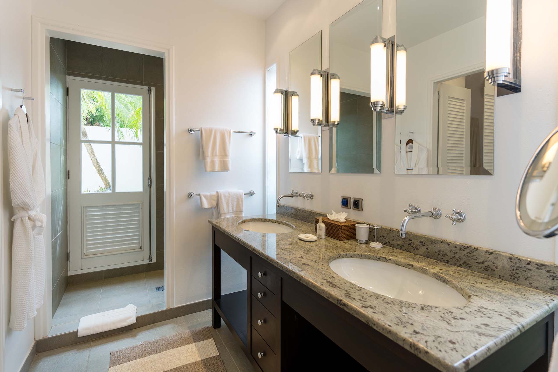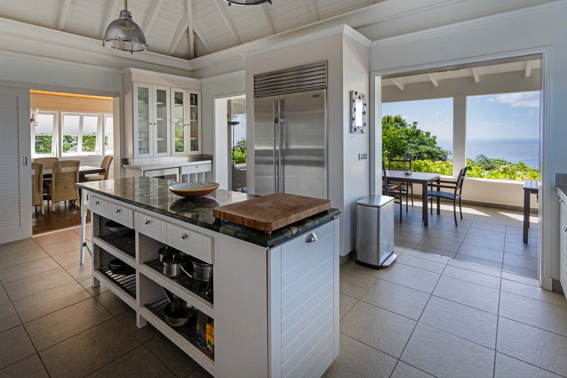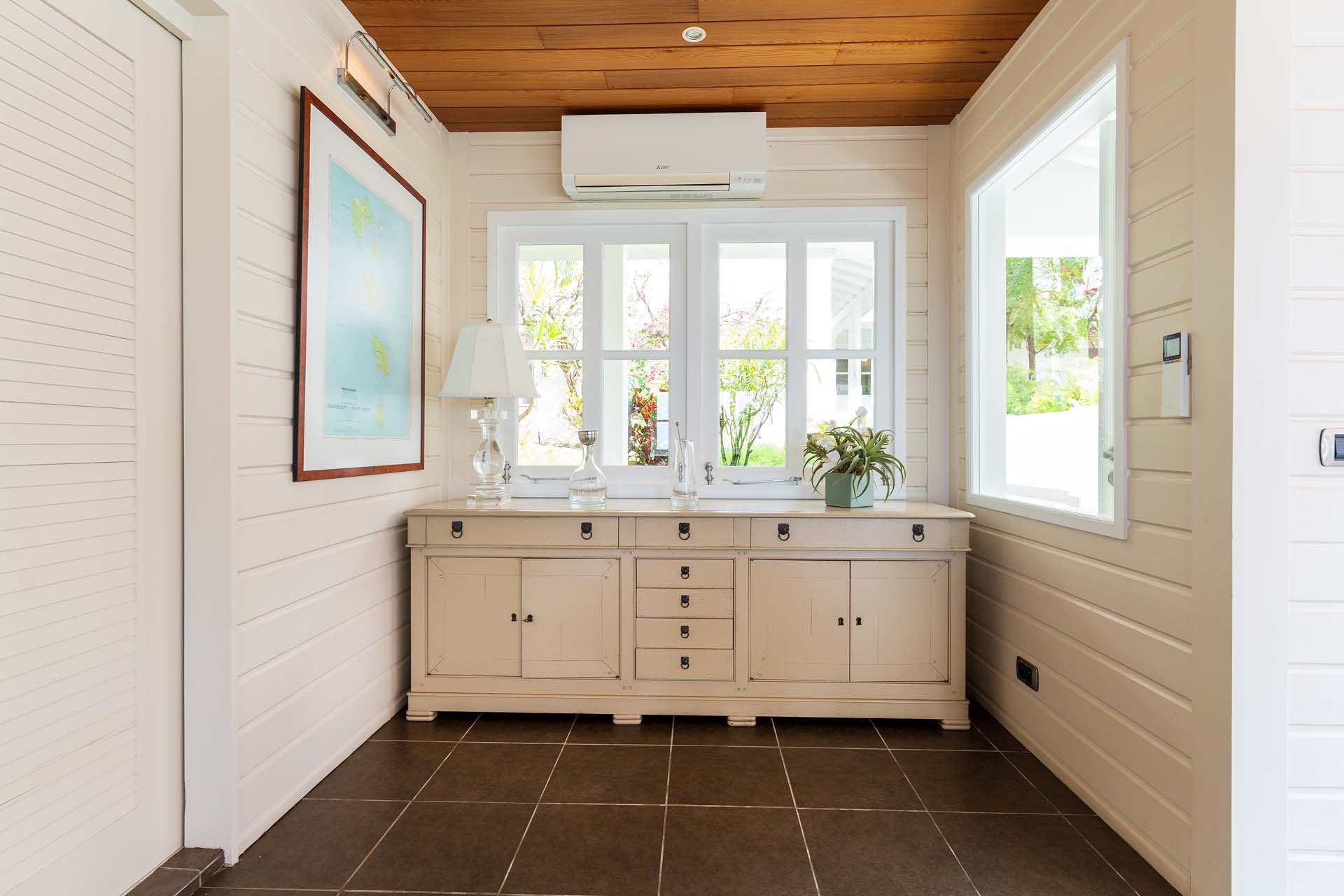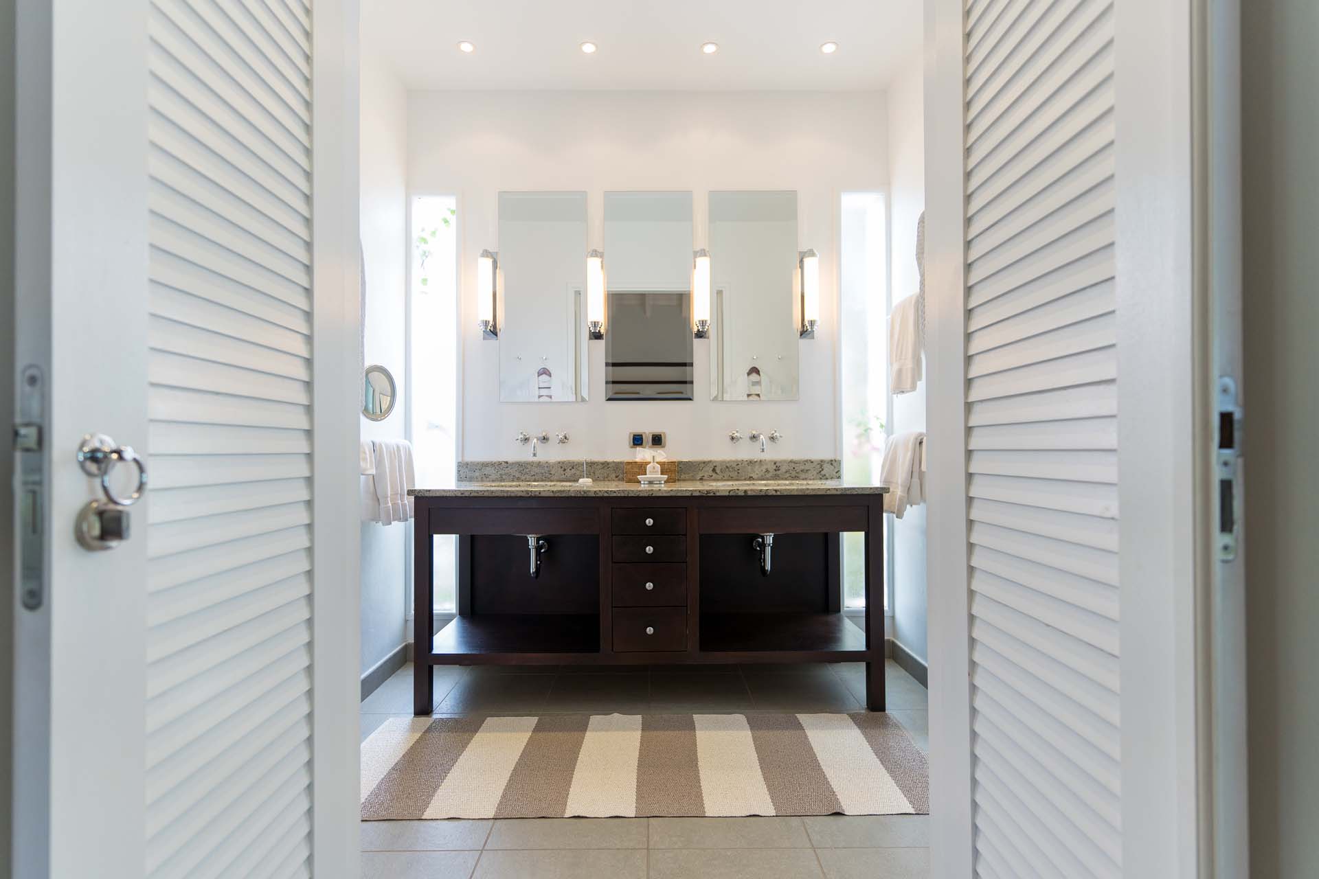 Welcome to Villa Belle Bague (villa code: WV VBB), a contemporary 4-bedroom villa nestled high in the hills of Colombier, St. Barts. This property enjoys some of the best sunset views on the island, taking in the glimmering Caribbean from St. Kitts all the way to Anguilla. The stylish interiors of Villa Belle Bague feature island antiques, vaulted wooden ceilings, and elegant colonial furnishings. Blending with the outdoor spaces, the entire property is clad in a tropical, island atmosphere. This is the luxurious Caribbean living at its very best. Villa Belle Bague is a short drive from the beach and restaurants in Flamands. Elegant restaurants and shops in Gustavia or St-Jean are both just 10 minutes away. Spread over a series of pavilions, Villa Belle Bague is brought together by a series of covered outdoor walkways revolving around a central cloister. With a beautiful garden and stone fountain, this entrance sets the tone for the rest of the relaxing living spaces. The large living room pavilion features French doors opening towards the outdoor terrace and ocean views. Sofas, armchairs, and artworks all pop with vibrant patterns, contrasting with dark wooden details and accents. Belle Bague Villa’s kitchen has stainless steel appliances and granite countertops. Our concierge can organize grocery pre-stocking or delivery, catered meals, or arrange private chef service for a special occasion. The kitchen opens to an outdoor dining area and a full bar under a covered terrace. Dining in the open air with the velvety evening slowly descending will be a highlight of any stay. A formal dining room with a French sideboard has seating suitable for up to 10 guests under an antique chandelier. It’s a magnificent setting for elegant dinners with family and friends. Three of the four bedrooms are in separate cottages, located around the central cloister. Each bedroom has colonial-style furnishings and a French queen-sized bed, offering a fantastic night’s sleep. The rooms also come with an ensuite bathroom with granite-topped vanities and a private terrace ideal for sunbathing. The fourth bedroom is similarly furnished and opens towards the pool terrace. Outside the main living room is the expansive covered deck. A comfortable lounge area with Rattan sofas offers a nice spot to sink in, open a bottle of wine, and enjoy the stunning sunsets across the sea and islands. Steps lead down towards the large, heated pool, featuring a striking granite-faced waterfall. Diving in here is a refreshing way to cool off during the day. Surrounding the pool is a wooden deck furnished with plenty of loungers, letting you soak up the island sun. From its location at the tip of Colombier point, Villa Belle Bague is close to the trail head for the hiking trail that leads down to Colombier beach, a protected nature preserve. A few minutes away by car is the lovely is Flamands Beach. Home to several elegant restaurants and hotels, it’s one of St. Barts’ most upscale areas. For something more rugged, Belle Bague Villa is also minutes away from the trailhead leading to Colombier Beach. Accessed only via foot or with a boat, it’s a fantastic glimpse into the natural beauty of the island. A gym equipped with weights, a rowing machine, and an elliptical is an ideal spot to work up a sweat. For those that need to get some work done, behind the kitchen is also a spacious office, complete with a computer and printer. During Thanksgiving and the December holidays, the villa rents at the full occupancy rate regardless of how many bedrooms are used. This villa is suitable for young children.Please fill out the form to begin your inquiry and we will connect you with a seasoned villa rental specialist.