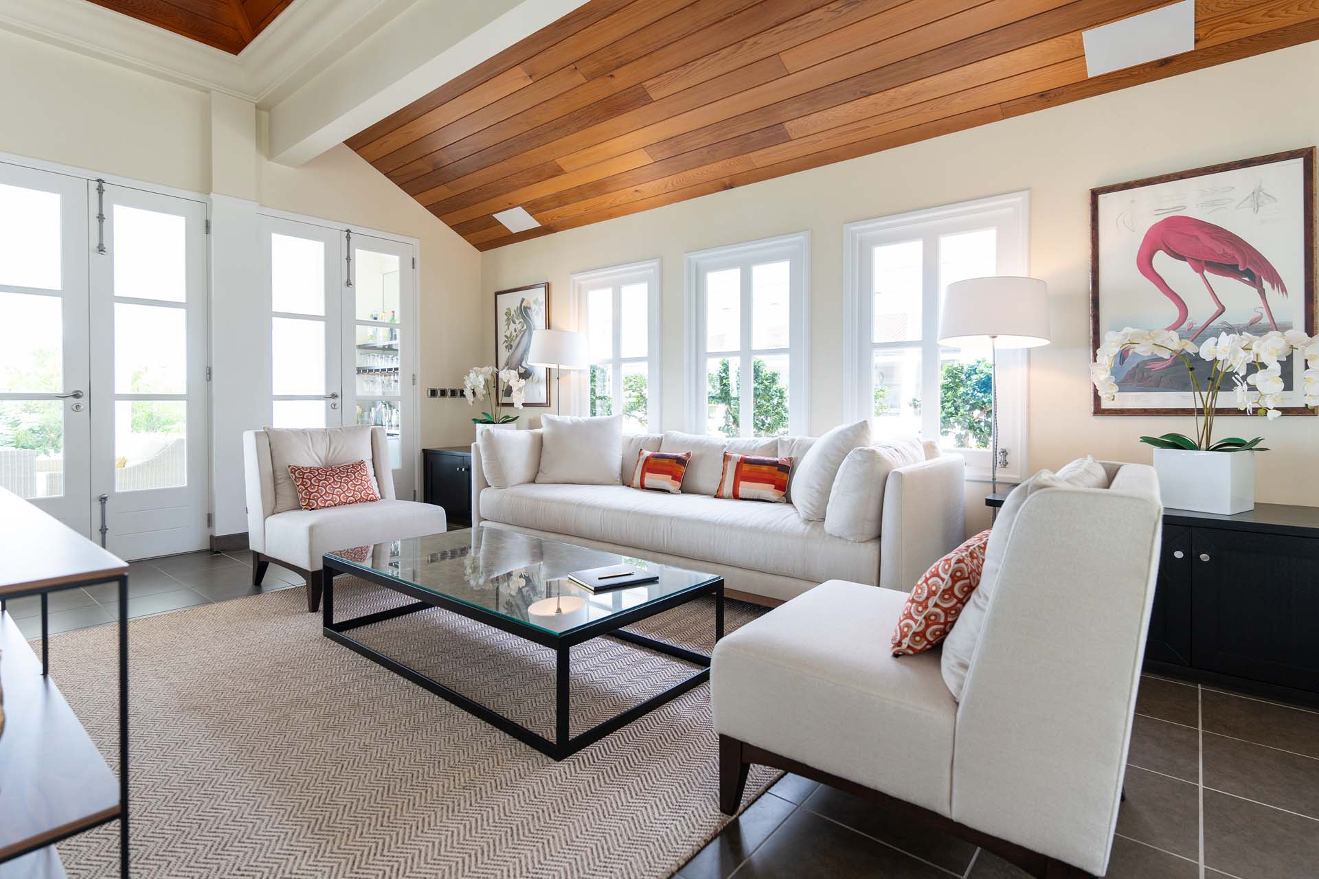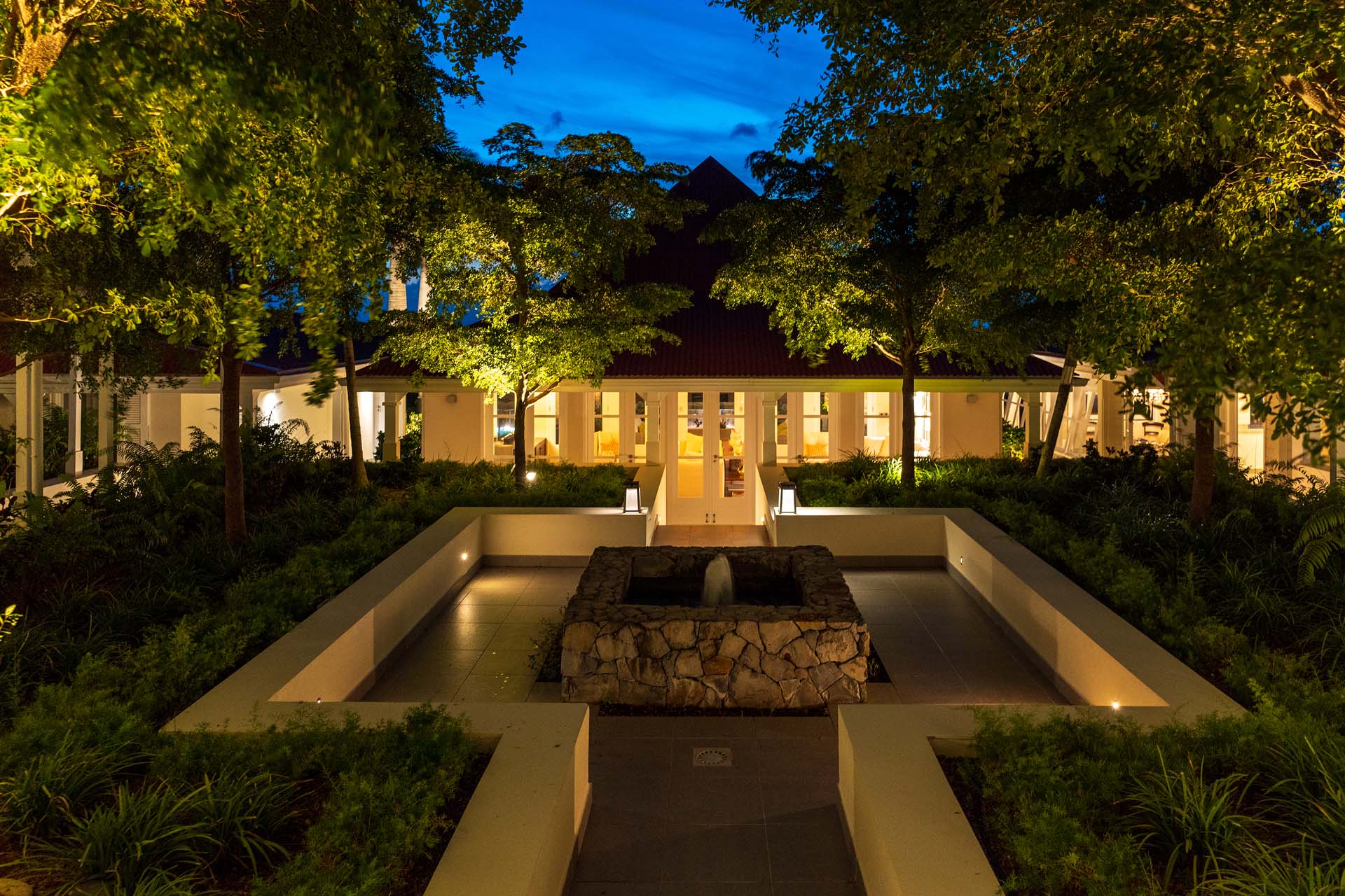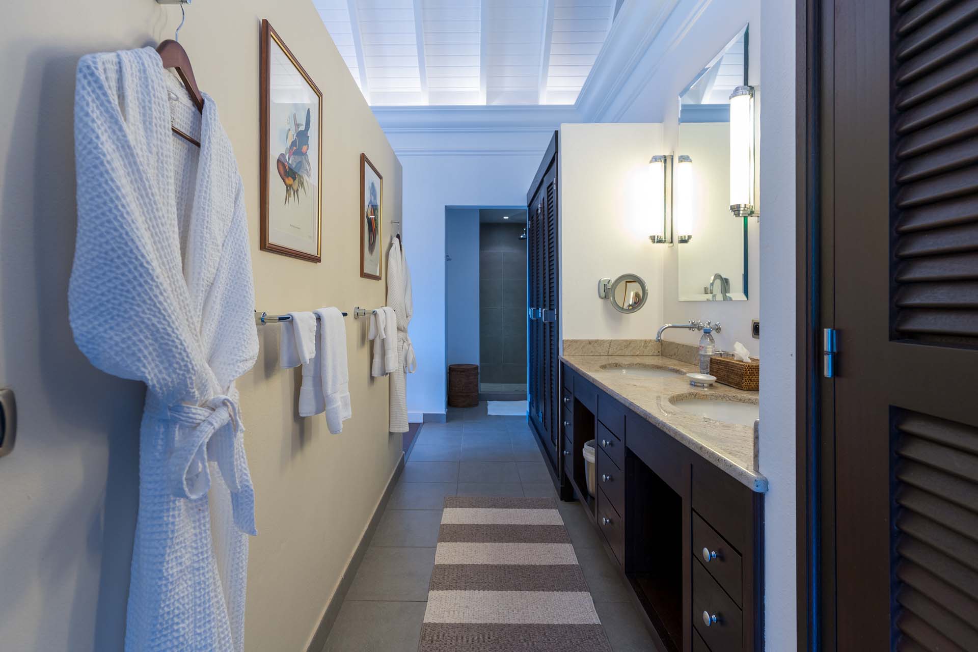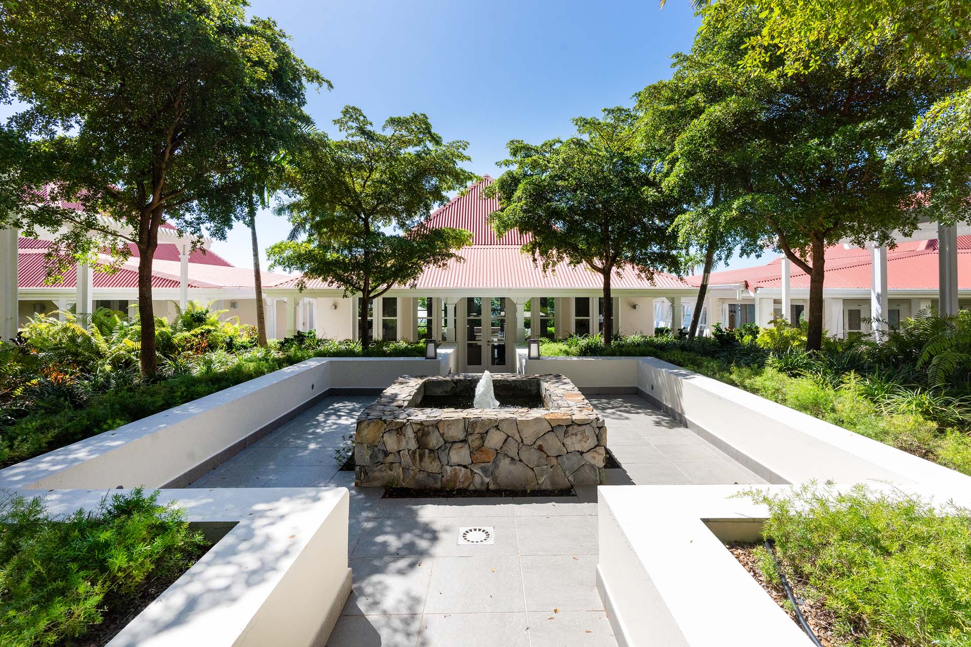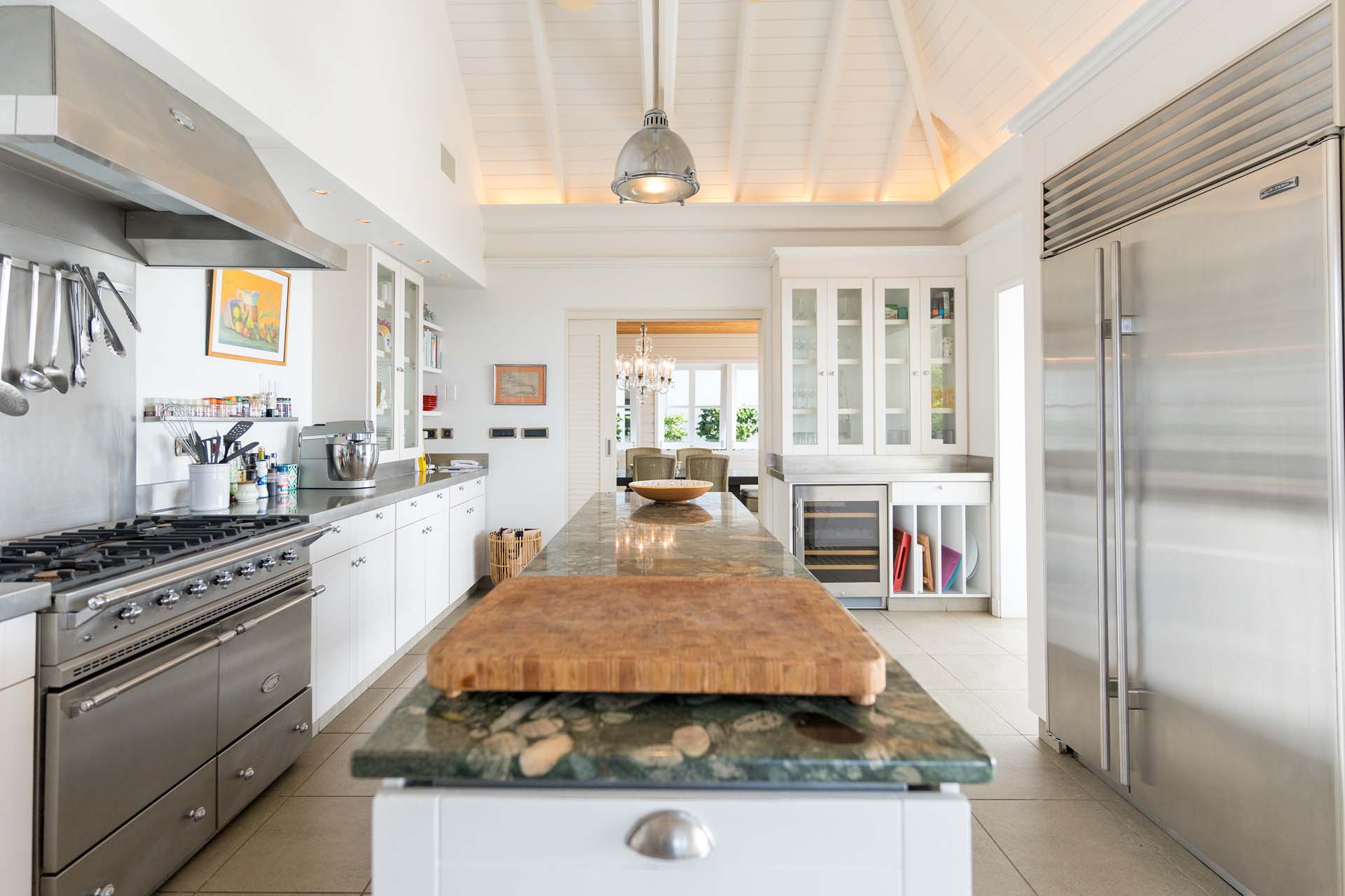 Welcome to Villa Belle Bague (villa code: WV VBB), a contemporary 4-bedroom villa nestled high in the hills of Colombier, St. Barts. This property enjoys some of the best sunset views on the island, taking in the glimmering Caribbean from St. Kitts all the way to Anguilla. The stylish interiors of Villa Belle Bague feature island antiques, vaulted wooden ceilings, and elegant colonial furnishings. Blending with the outdoor spaces, the entire property is clad in a tropical, island atmosphere. This is the luxurious Caribbean living at its very best. Villa Belle Bague is a short drive from the beach and restaurants in Flamands. Elegant restaurants and shops in Gustavia or St-Jean are both just 10 minutes away. Spread over a series of pavilions, Villa Belle Bague is brought together by a series of covered outdoor walkways revolving around a central cloister. With a beautiful garden and stone fountain, this entrance sets the tone for the rest of the relaxing living spaces. The large living room pavilion features French doors opening towards the outdoor terrace and ocean views. Sofas, armchairs, and artworks all pop with vibrant patterns, contrasting with dark wooden details and accents. Belle Bague Villa’s kitchen has stainless steel appliances and granite countertops. Our concierge can organize grocery pre-stocking or delivery, catered meals, or arrange private chef service for a special occasion. The kitchen opens to an outdoor dining area and a full bar under a covered terrace. Dining in the open air with the velvety evening slowly descending will be a highlight of any stay. A formal dining room with a French sideboard has seating suitable for up to 10 guests under an antique chandelier. It’s a magnificent setting for elegant dinners with family and friends. Three of the four bedrooms are in separate cottages, located around the central cloister. Each bedroom has colonial-style furnishings and a French queen-sized bed, offering a fantastic night’s sleep. The rooms also come with an ensuite bathroom with granite-topped vanities and a private terrace ideal for sunbathing. The fourth bedroom is similarly furnished and opens towards the pool terrace. Outside the main living room is the expansive covered deck. A comfortable lounge area with Rattan sofas offers a nice spot to sink in, open a bottle of wine, and enjoy the stunning sunsets across the sea and islands. Steps lead down towards the large, heated pool, featuring a striking granite-faced waterfall. Diving in here is a refreshing way to cool off during the day. Surrounding the pool is a wooden deck furnished with plenty of loungers, letting you soak up the island sun. From its location at the tip of Colombier point, Villa Belle Bague is close to the trail head for the hiking trail that leads down to Colombier beach, a protected nature preserve. A few minutes away by car is the lovely is Flamands Beach. Home to several elegant restaurants and hotels, it’s one of St. Barts’ most upscale areas. For something more rugged, Belle Bague Villa is also minutes away from the trailhead leading to Colombier Beach. Accessed only via foot or with a boat, it’s a fantastic glimpse into the natural beauty of the island. A gym equipped with weights, a rowing machine, and an elliptical is an ideal spot to work up a sweat. For those that need to get some work done, behind the kitchen is also a spacious office, complete with a computer and printer. During Thanksgiving and the December holidays, the villa rents at the full occupancy rate regardless of how many bedrooms are used. This villa is suitable for young children.Please fill out the form to begin your inquiry and we will connect you with a seasoned villa rental specialist.
