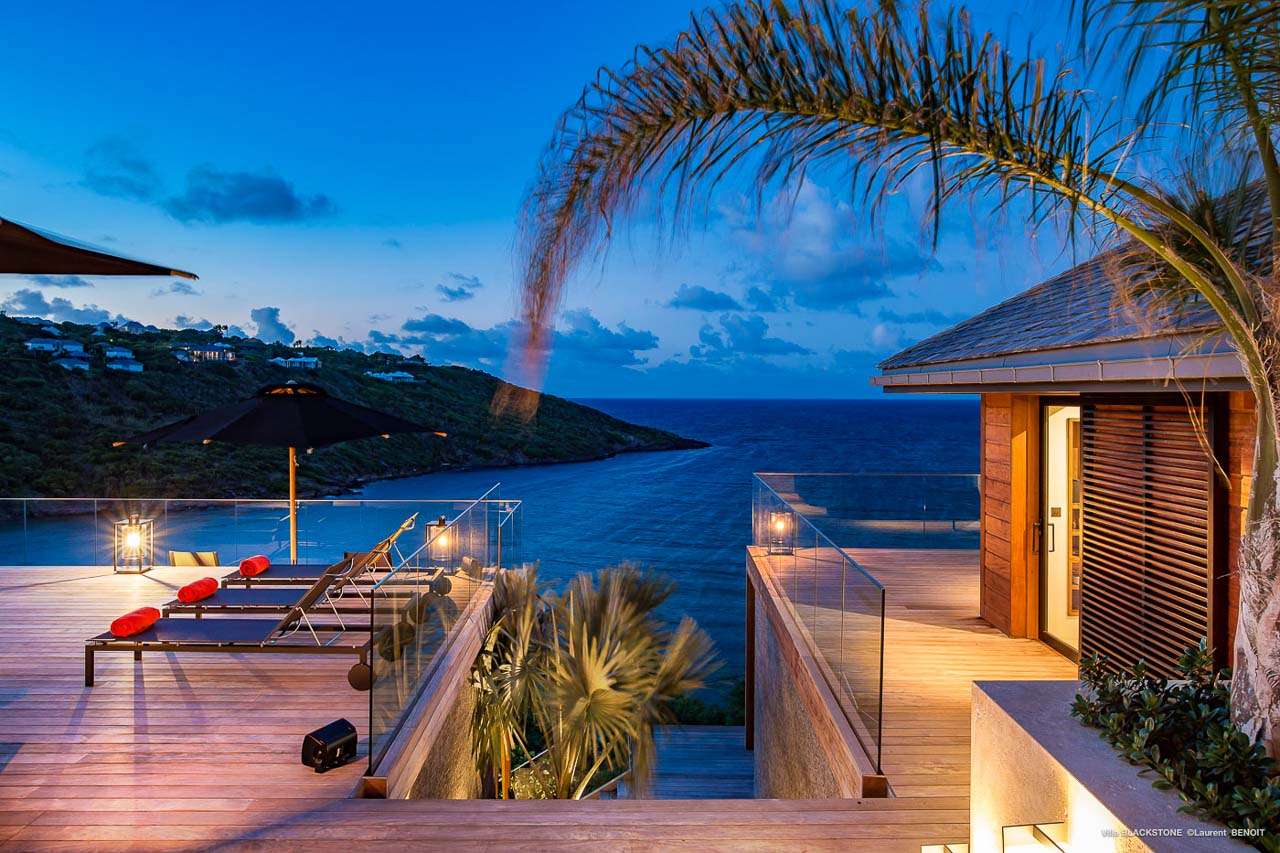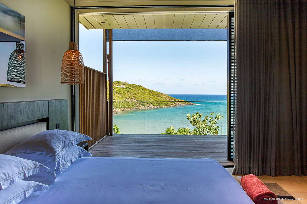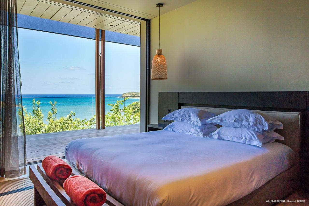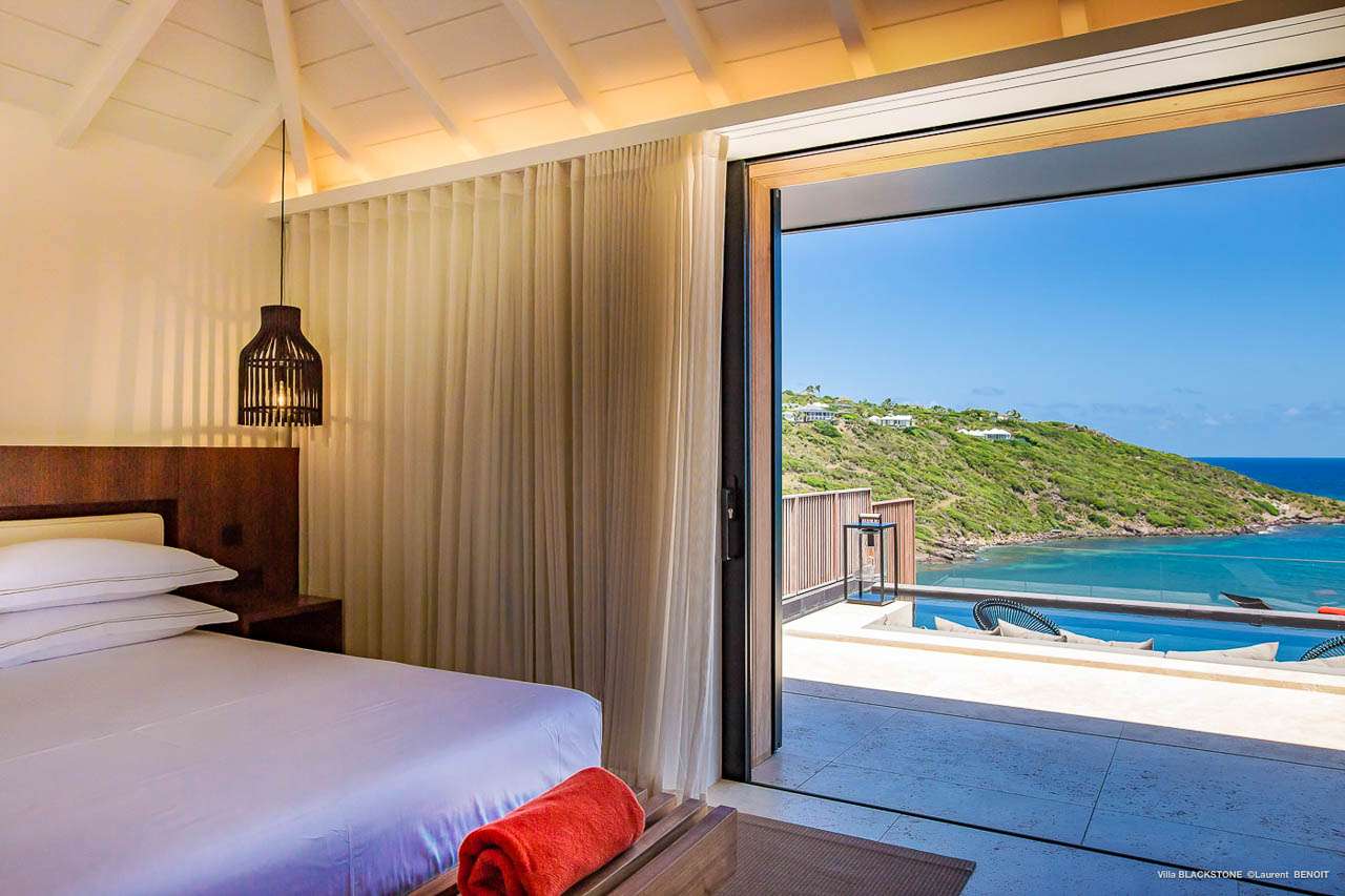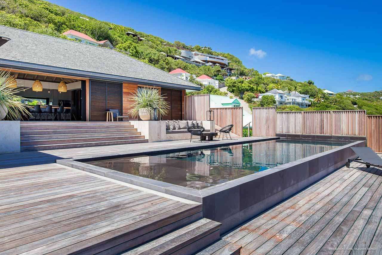 Welcome to Villa Blackstone (villa code: WV BLK), an alluring 6-bedroom villa in Marigot, St. Barts. Situated on the hillside overlooking the bay, this villa enjoys astonishing ocean views within a 5-minute drive from the beach. Low-key luxury is what Villa Blackstone is all about, a sophisticated and elegant choice for your St. Barts getaway. The interiors are cozy and warm, with natural woods bathed in light washing in through the large floor-to-ceiling glass doors. Tropical-chic décor, vaulted ceilings, and gorgeous cross breezes complete the home. Nestled on the hills above Marigot Bay on the north coast of St. Barts, this is a fantastic location for a high-end island vacation. The beach is a short drive down the hill, and St. Jean is a 10-minute drive to the west, with dazzling restaurants and bars to enjoy. Gustavia, the capital, is 15 minutes by car. The clean and contemporary design of the home uses straight lines, natural light, and earthy woods to create a peaceful, Zen-like vibe. The tropical setting is just as big a part as everything else, with the large doors and windows framing views of rugged hills, tropical palms, and the sparkling Caribbean. All roads lead to the great room inside Villa Blackstone, combining the living room, dining area, and kitchen. The living room features a cushioned sofa and a separate chaise lounge, comfortable spots for collapsing in a heap at the end of a long beach day. There’s also a TV for those evenings you’d prefer to stay in with a movie or two. The modern kitchen at Villa Blackstone has a breakfast bar, high-end appliances, and a large counter so the whole group can get involved in preparing meals. Our concierge is also on hand to organize a grocery delivery, or for a special occasion, a private chef. Elegant dinners held at the indoor table are wonderful. There’s seating for up to 12 guests, and the doors open wide to the view, letting you admire the curving bays and coastline of St. Barts while you dine. For those who prefer to dine alfresco, a second dining table sits on the terrace next to the pool, with a large umbrella for shade. With 6 bedrooms inside Villa Blackstone, this villa is a fantastic choice for a large family or group of friends traveling together. The first bedroom features a European king-size bed and an ensuite bathroom with both an indoor and outdoor shower. This wheelchair-accessible bedroom is located on the main level next to the kitchen. The large master bedroom is situated in a separate bungalow a half level lower, next to the main deck and pool. This bedroom has a European king-size bed and an ensuite bathroom with both an indoor and outdoor shower. The remaining 4 bedrooms are located on the lowest level below the pool. Three bedrooms are furnished with European king-size beds, while the fourth bedroom has twin beds which can be made into a king bed and connects to a guest bedroom (ideal for parents with children). The bedrooms can be fully separated with double doors. The gorgeous outdoor terrace at Villa Blackstone is a wonderful place for relaxing at the end of your day, with a glass of wine in hand. There are plenty of comfortable outdoor lounges to kick back in, watching yachts bob up and down in the harbor as the sunset casts golden light across the offshore islands. The swimming pool is a tempting prospect, offering an easy way to stay cool on those hot Caribbean days. Island trade winds also work to keep you cool, drifting across the terrace as you sunbathe in the loungers, sipping on a cool drink. During the Thanksgiving and December holidays, the villa rents at full occupancy rates regardless of how many bedrooms are used.Please fill out the form to begin your inquiry and we will connect you with a seasoned villa rental specialist.