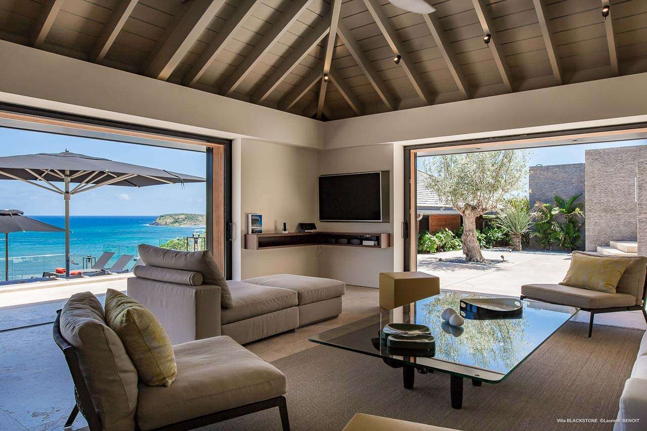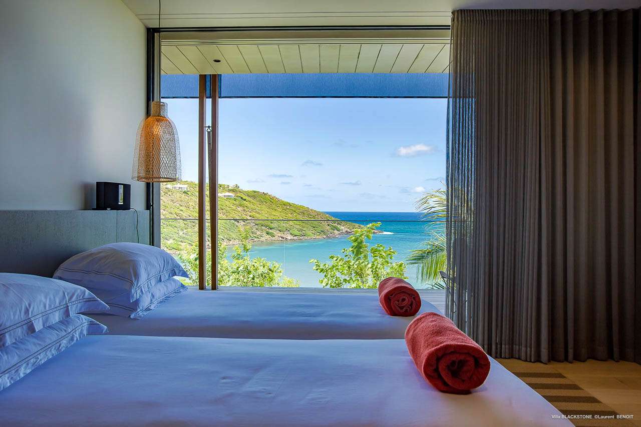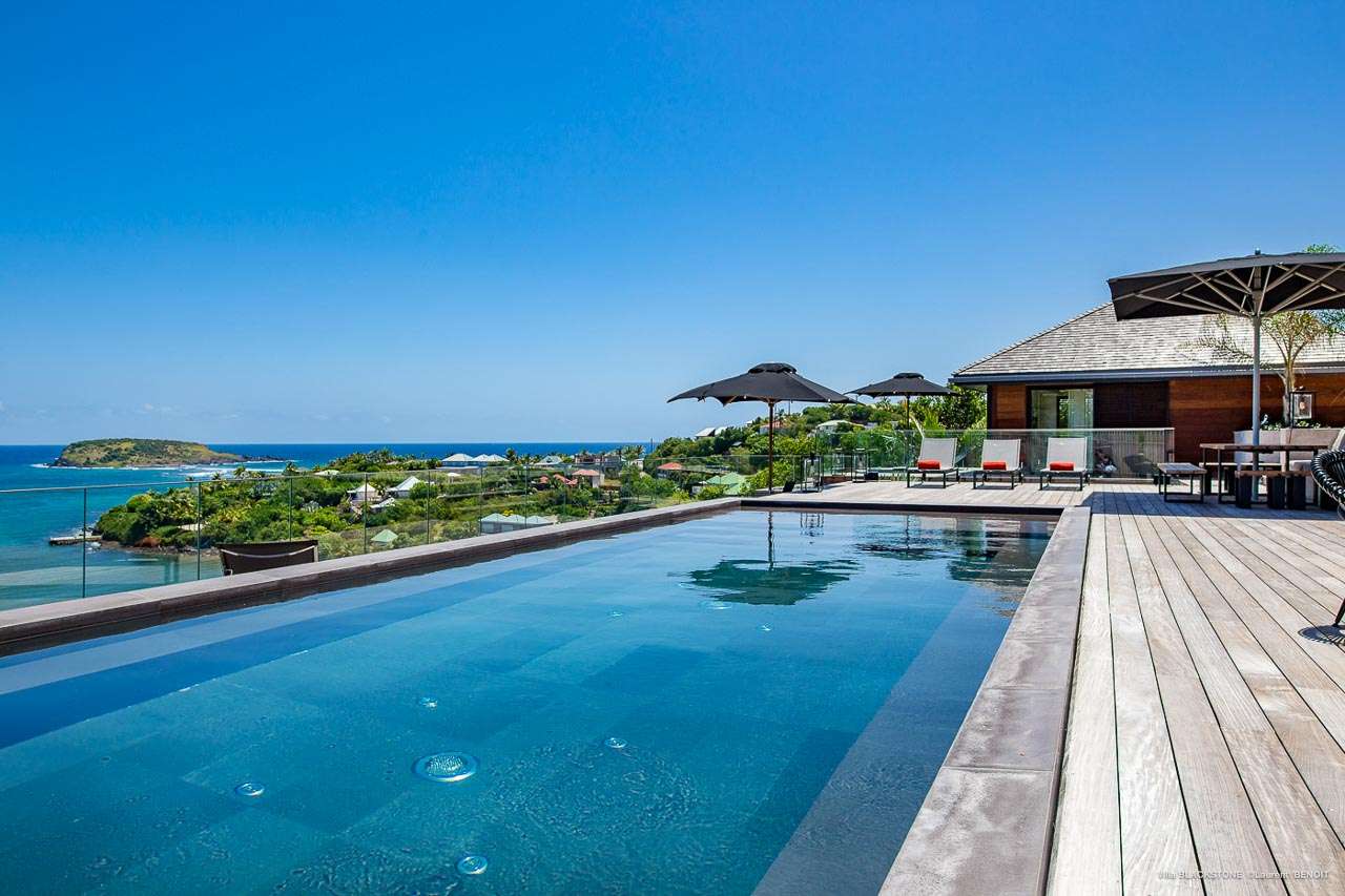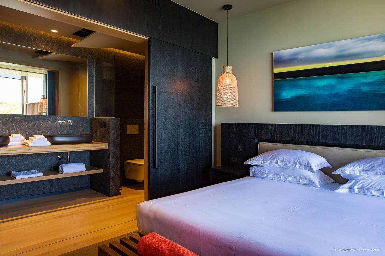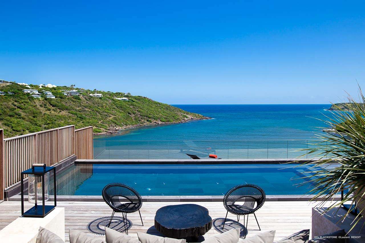 Welcome to Villa Blackstone (villa code: WV BLK), an alluring 6-bedroom villa in Marigot, St. Barts. Situated on the hillside overlooking the bay, this villa enjoys astonishing ocean views within a 5-minute drive from the beach. Low-key luxury is what Villa Blackstone is all about, a sophisticated and elegant choice for your St. Barts getaway. The interiors are cozy and warm, with natural woods bathed in light washing in through the large floor-to-ceiling glass doors. Tropical-chic décor, vaulted ceilings, and gorgeous cross breezes complete the home. Nestled on the hills above Marigot Bay on the north coast of St. Barts, this is a fantastic location for a high-end island vacation. The beach is a short drive down the hill, and St. Jean is a 10-minute drive to the west, with dazzling restaurants and bars to enjoy. Gustavia, the capital, is 15 minutes by car. The clean and contemporary design of the home uses straight lines, natural light, and earthy woods to create a peaceful, Zen-like vibe. The tropical setting is just as big a part as everything else, with the large doors and windows framing views of rugged hills, tropical palms, and the sparkling Caribbean. All roads lead to the great room inside Villa Blackstone, combining the living room, dining area, and kitchen. The living room features a cushioned sofa and a separate chaise lounge, comfortable spots for collapsing in a heap at the end of a long beach day. There’s also a TV for those evenings you’d prefer to stay in with a movie or two. The modern kitchen at Villa Blackstone has a breakfast bar, high-end appliances, and a large counter so the whole group can get involved in preparing meals. Our concierge is also on hand to organize a grocery delivery, or for a special occasion, a private chef. Elegant dinners held at the indoor table are wonderful. There’s seating for up to 12 guests, and the doors open wide to the view, letting you admire the curving bays and coastline of St. Barts while you dine. For those who prefer to dine alfresco, a second dining table sits on the terrace next to the pool, with a large umbrella for shade. With 6 bedrooms inside Villa Blackstone, this villa is a fantastic choice for a large family or group of friends traveling together. The first bedroom features a European king-size bed and an ensuite bathroom with both an indoor and outdoor shower. This wheelchair-accessible bedroom is located on the main level next to the kitchen. The large master bedroom is situated in a separate bungalow a half level lower, next to the main deck and pool. This bedroom has a European king-size bed and an ensuite bathroom with both an indoor and outdoor shower. The remaining 4 bedrooms are located on the lowest level below the pool. Three bedrooms are furnished with European king-size beds, while the fourth bedroom has twin beds which can be made into a king bed and connects to a guest bedroom (ideal for parents with children). The bedrooms can be fully separated with double doors. The gorgeous outdoor terrace at Villa Blackstone is a wonderful place for relaxing at the end of your day, with a glass of wine in hand. There are plenty of comfortable outdoor lounges to kick back in, watching yachts bob up and down in the harbor as the sunset casts golden light across the offshore islands. The swimming pool is a tempting prospect, offering an easy way to stay cool on those hot Caribbean days. Island trade winds also work to keep you cool, drifting across the terrace as you sunbathe in the loungers, sipping on a cool drink. During the Thanksgiving and December holidays, the villa rents at full occupancy rates regardless of how many bedrooms are used.Please fill out the form to begin your inquiry and we will connect you with a seasoned villa rental specialist.