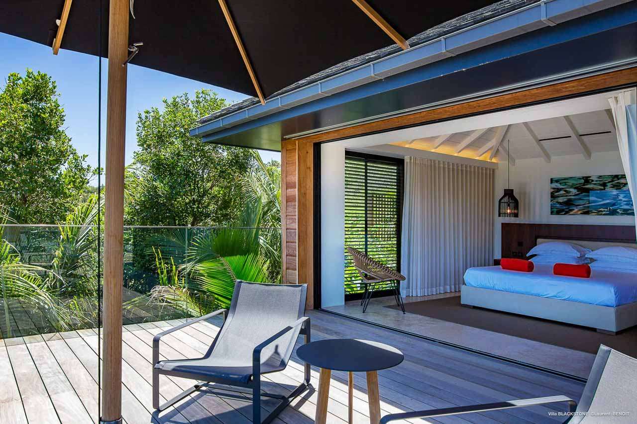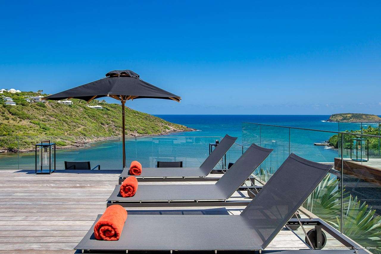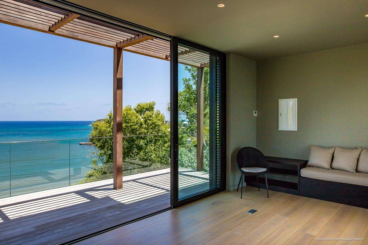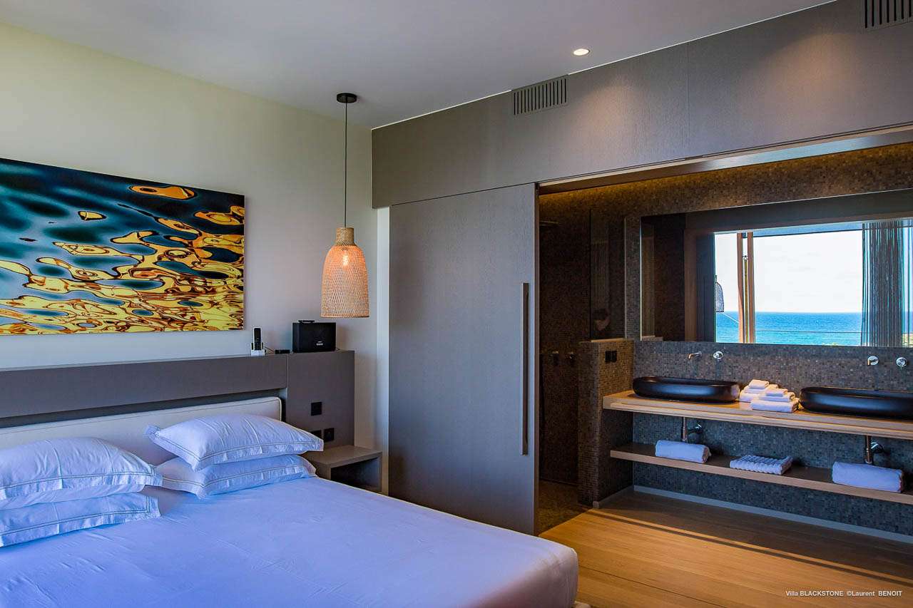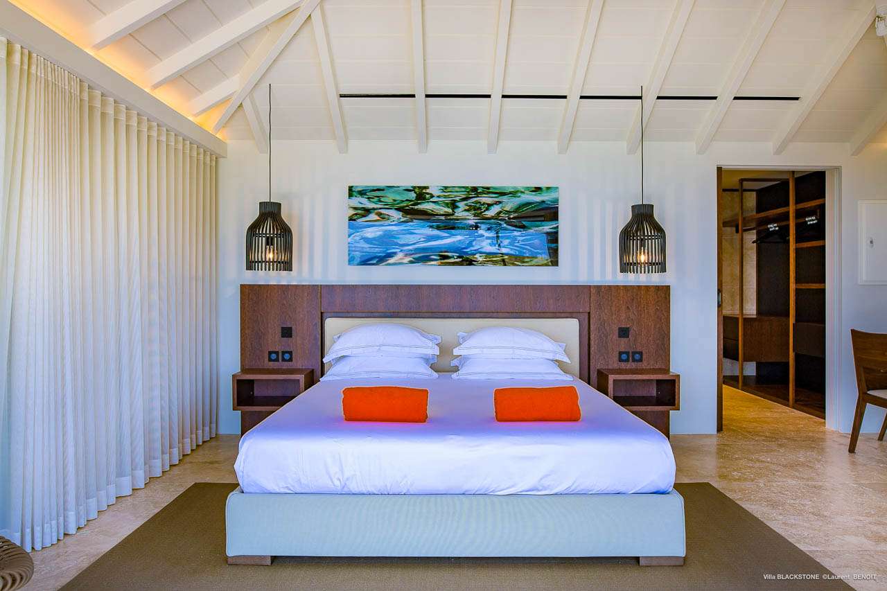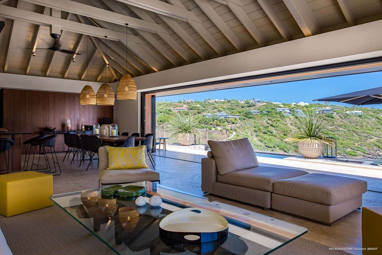 Welcome to Villa Blackstone (villa code: WV BLK), an alluring 6-bedroom villa in Marigot, St. Barts. Situated on the hillside overlooking the bay, this villa enjoys astonishing ocean views within a 5-minute drive from the beach. Low-key luxury is what Villa Blackstone is all about, a sophisticated and elegant choice for your St. Barts getaway. The interiors are cozy and warm, with natural woods bathed in light washing in through the large floor-to-ceiling glass doors. Tropical-chic décor, vaulted ceilings, and gorgeous cross breezes complete the home. Nestled on the hills above Marigot Bay on the north coast of St. Barts, this is a fantastic location for a high-end island vacation. The beach is a short drive down the hill, and St. Jean is a 10-minute drive to the west, with dazzling restaurants and bars to enjoy. Gustavia, the capital, is 15 minutes by car. The clean and contemporary design of the home uses straight lines, natural light, and earthy woods to create a peaceful, Zen-like vibe. The tropical setting is just as big a part as everything else, with the large doors and windows framing views of rugged hills, tropical palms, and the sparkling Caribbean. All roads lead to the great room inside Villa Blackstone, combining the living room, dining area, and kitchen. The living room features a cushioned sofa and a separate chaise lounge, comfortable spots for collapsing in a heap at the end of a long beach day. There’s also a TV for those evenings you’d prefer to stay in with a movie or two. The modern kitchen at Villa Blackstone has a breakfast bar, high-end appliances, and a large counter so the whole group can get involved in preparing meals. Our concierge is also on hand to organize a grocery delivery, or for a special occasion, a private chef. Elegant dinners held at the indoor table are wonderful. There’s seating for up to 12 guests, and the doors open wide to the view, letting you admire the curving bays and coastline of St. Barts while you dine. For those who prefer to dine alfresco, a second dining table sits on the terrace next to the pool, with a large umbrella for shade. With 6 bedrooms inside Villa Blackstone, this villa is a fantastic choice for a large family or group of friends traveling together. The first bedroom features a European king-size bed and an ensuite bathroom with both an indoor and outdoor shower. This wheelchair-accessible bedroom is located on the main level next to the kitchen. The large master bedroom is situated in a separate bungalow a half level lower, next to the main deck and pool. This bedroom has a European king-size bed and an ensuite bathroom with both an indoor and outdoor shower. The remaining 4 bedrooms are located on the lowest level below the pool. Three bedrooms are furnished with European king-size beds, while the fourth bedroom has twin beds which can be made into a king bed and connects to a guest bedroom (ideal for parents with children). The bedrooms can be fully separated with double doors. The gorgeous outdoor terrace at Villa Blackstone is a wonderful place for relaxing at the end of your day, with a glass of wine in hand. There are plenty of comfortable outdoor lounges to kick back in, watching yachts bob up and down in the harbor as the sunset casts golden light across the offshore islands. The swimming pool is a tempting prospect, offering an easy way to stay cool on those hot Caribbean days. Island trade winds also work to keep you cool, drifting across the terrace as you sunbathe in the loungers, sipping on a cool drink. During the Thanksgiving and December holidays, the villa rents at full occupancy rates regardless of how many bedrooms are used.Please fill out the form to begin your inquiry and we will connect you with a seasoned villa rental specialist.
