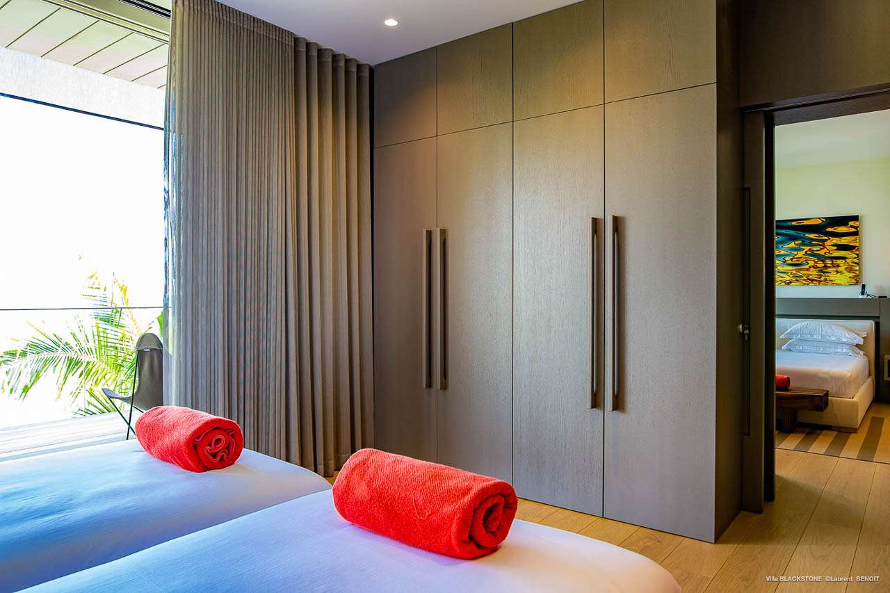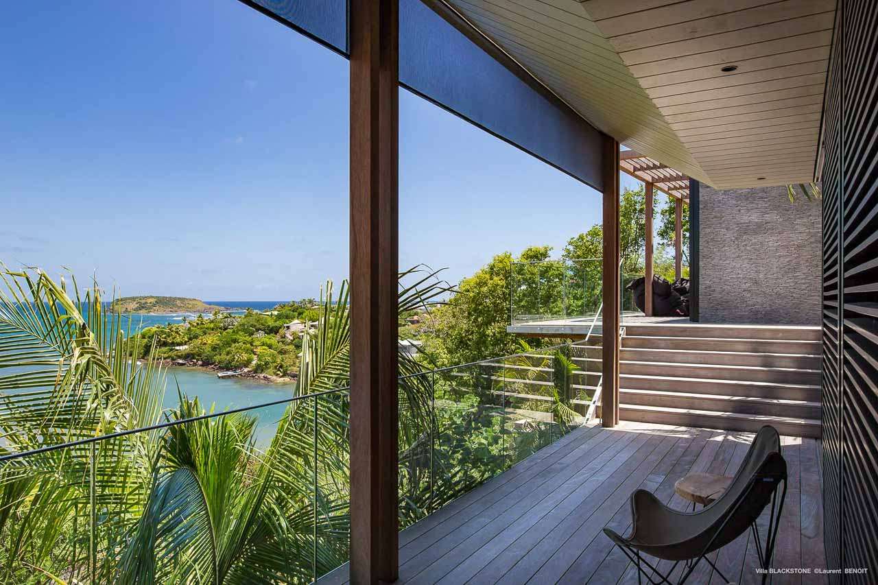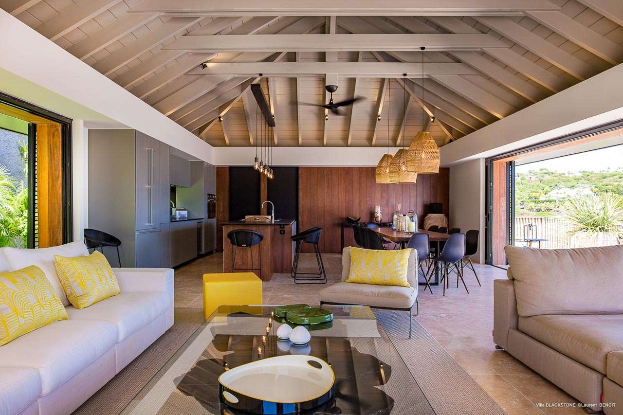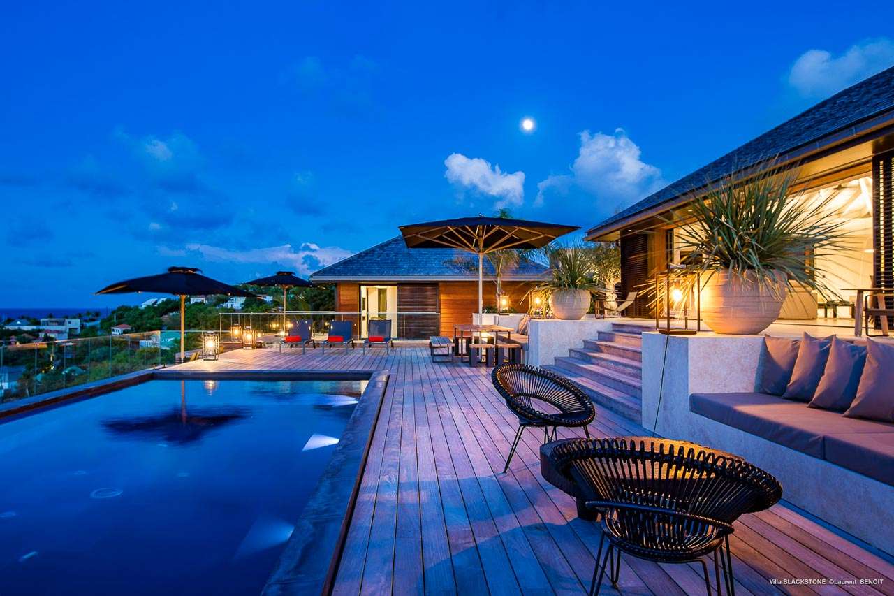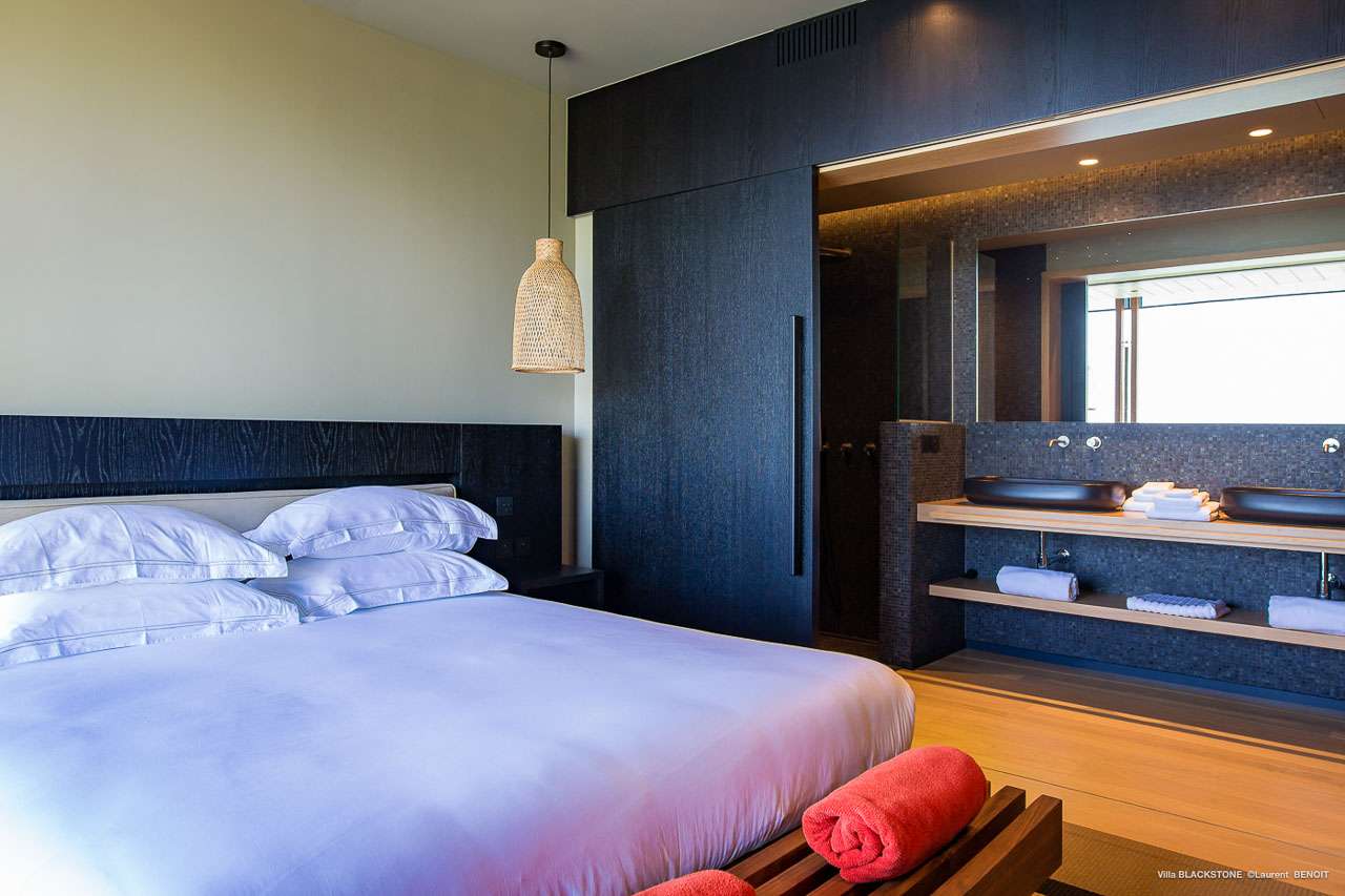 Welcome to Villa Blackstone (villa code: WV BLK), an alluring 6-bedroom villa in Marigot, St. Barts. Situated on the hillside overlooking the bay, this villa enjoys astonishing ocean views within a 5-minute drive from the beach. Low-key luxury is what Villa Blackstone is all about, a sophisticated and elegant choice for your St. Barts getaway. The interiors are cozy and warm, with natural woods bathed in light washing in through the large floor-to-ceiling glass doors. Tropical-chic décor, vaulted ceilings, and gorgeous cross breezes complete the home. Nestled on the hills above Marigot Bay on the north coast of St. Barts, this is a fantastic location for a high-end island vacation. The beach is a short drive down the hill, and St. Jean is a 10-minute drive to the west, with dazzling restaurants and bars to enjoy. Gustavia, the capital, is 15 minutes by car. The clean and contemporary design of the home uses straight lines, natural light, and earthy woods to create a peaceful, Zen-like vibe. The tropical setting is just as big a part as everything else, with the large doors and windows framing views of rugged hills, tropical palms, and the sparkling Caribbean. All roads lead to the great room inside Villa Blackstone, combining the living room, dining area, and kitchen. The living room features a cushioned sofa and a separate chaise lounge, comfortable spots for collapsing in a heap at the end of a long beach day. There’s also a TV for those evenings you’d prefer to stay in with a movie or two. The modern kitchen at Villa Blackstone has a breakfast bar, high-end appliances, and a large counter so the whole group can get involved in preparing meals. Our concierge is also on hand to organize a grocery delivery, or for a special occasion, a private chef. Elegant dinners held at the indoor table are wonderful. There’s seating for up to 12 guests, and the doors open wide to the view, letting you admire the curving bays and coastline of St. Barts while you dine. For those who prefer to dine alfresco, a second dining table sits on the terrace next to the pool, with a large umbrella for shade. With 6 bedrooms inside Villa Blackstone, this villa is a fantastic choice for a large family or group of friends traveling together. The first bedroom features a European king-size bed and an ensuite bathroom with both an indoor and outdoor shower. This wheelchair-accessible bedroom is located on the main level next to the kitchen. The large master bedroom is situated in a separate bungalow a half level lower, next to the main deck and pool. This bedroom has a European king-size bed and an ensuite bathroom with both an indoor and outdoor shower. The remaining 4 bedrooms are located on the lowest level below the pool. Three bedrooms are furnished with European king-size beds, while the fourth bedroom has twin beds which can be made into a king bed and connects to a guest bedroom (ideal for parents with children). The bedrooms can be fully separated with double doors. The gorgeous outdoor terrace at Villa Blackstone is a wonderful place for relaxing at the end of your day, with a glass of wine in hand. There are plenty of comfortable outdoor lounges to kick back in, watching yachts bob up and down in the harbor as the sunset casts golden light across the offshore islands. The swimming pool is a tempting prospect, offering an easy way to stay cool on those hot Caribbean days. Island trade winds also work to keep you cool, drifting across the terrace as you sunbathe in the loungers, sipping on a cool drink. During the Thanksgiving and December holidays, the villa rents at full occupancy rates regardless of how many bedrooms are used.Please fill out the form to begin your inquiry and we will connect you with a seasoned villa rental specialist.