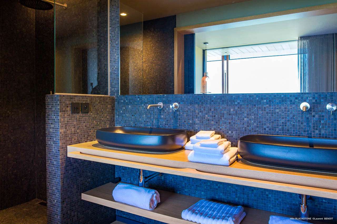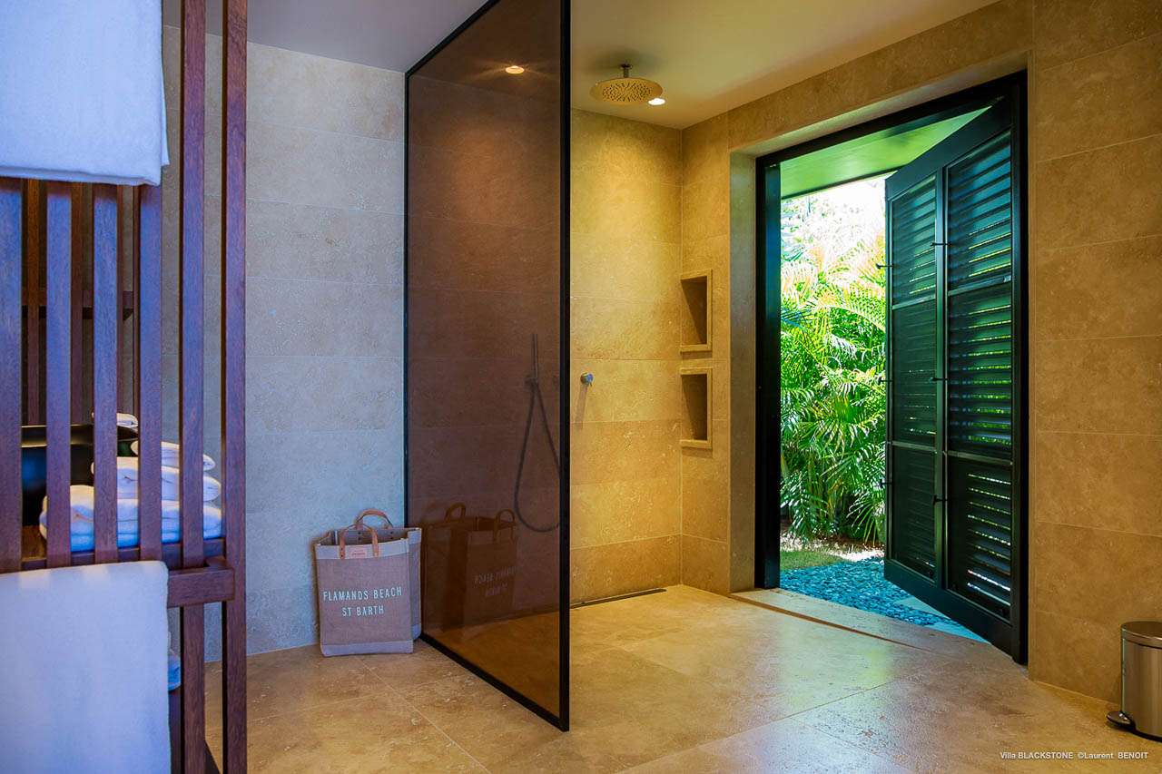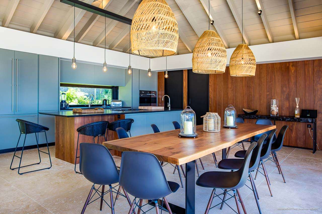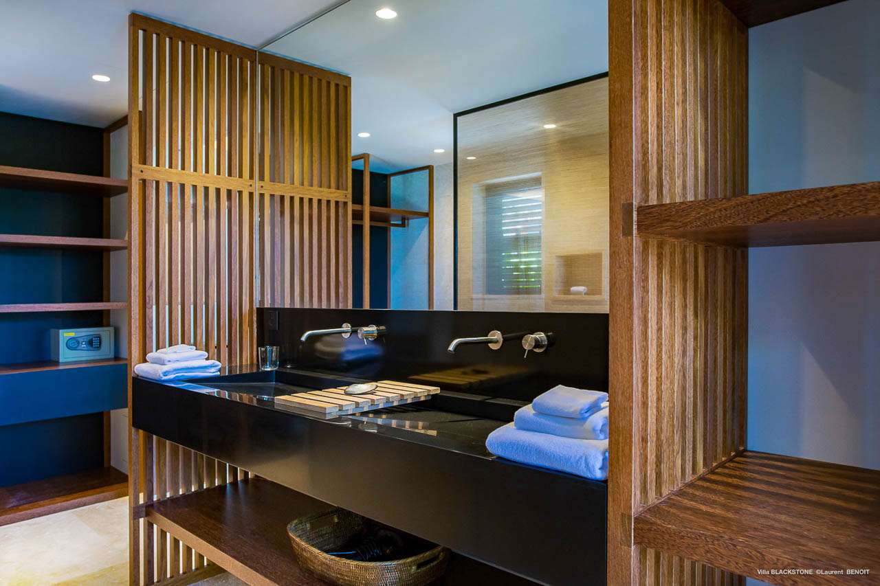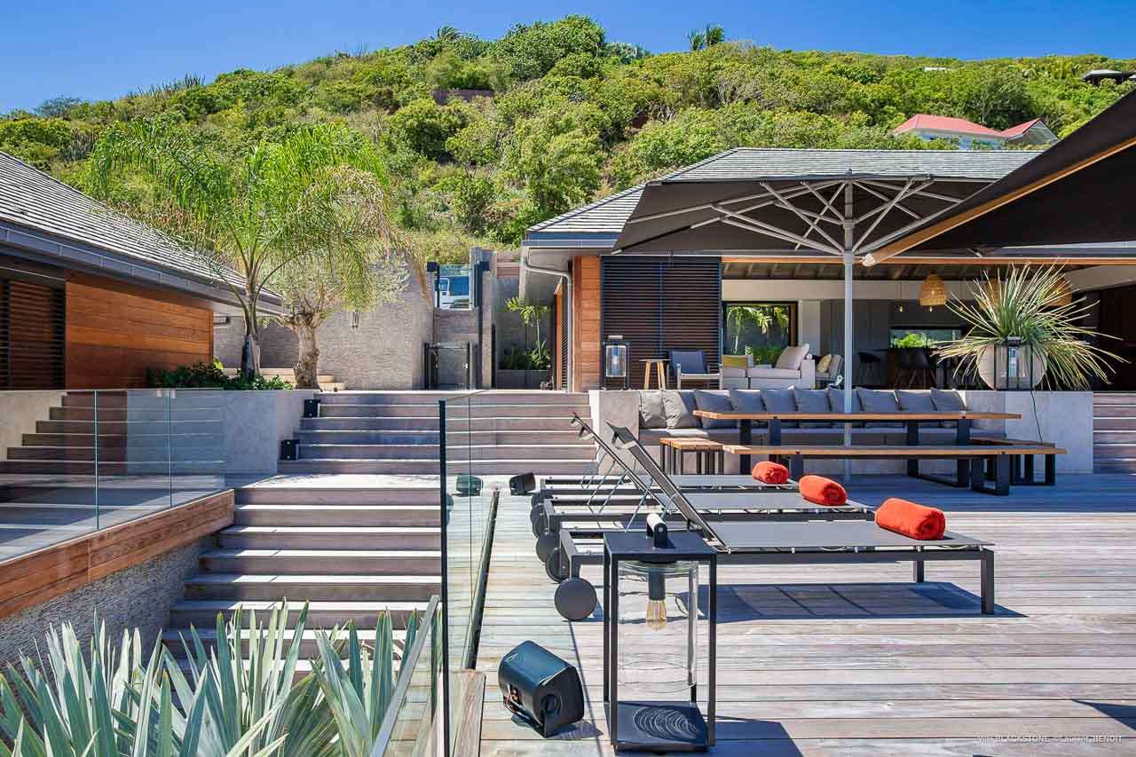 Welcome to Villa Blackstone (villa code: WV BLK), an alluring 6-bedroom villa in Marigot, St. Barts. Situated on the hillside overlooking the bay, this villa enjoys astonishing ocean views within a 5-minute drive from the beach. Low-key luxury is what Villa Blackstone is all about, a sophisticated and elegant choice for your St. Barts getaway. The interiors are cozy and warm, with natural woods bathed in light washing in through the large floor-to-ceiling glass doors. Tropical-chic décor, vaulted ceilings, and gorgeous cross breezes complete the home. Nestled on the hills above Marigot Bay on the north coast of St. Barts, this is a fantastic location for a high-end island vacation. The beach is a short drive down the hill, and St. Jean is a 10-minute drive to the west, with dazzling restaurants and bars to enjoy. Gustavia, the capital, is 15 minutes by car. The clean and contemporary design of the home uses straight lines, natural light, and earthy woods to create a peaceful, Zen-like vibe. The tropical setting is just as big a part as everything else, with the large doors and windows framing views of rugged hills, tropical palms, and the sparkling Caribbean. All roads lead to the great room inside Villa Blackstone, combining the living room, dining area, and kitchen. The living room features a cushioned sofa and a separate chaise lounge, comfortable spots for collapsing in a heap at the end of a long beach day. There’s also a TV for those evenings you’d prefer to stay in with a movie or two. The modern kitchen at Villa Blackstone has a breakfast bar, high-end appliances, and a large counter so the whole group can get involved in preparing meals. Our concierge is also on hand to organize a grocery delivery, or for a special occasion, a private chef. Elegant dinners held at the indoor table are wonderful. There’s seating for up to 12 guests, and the doors open wide to the view, letting you admire the curving bays and coastline of St. Barts while you dine. For those who prefer to dine alfresco, a second dining table sits on the terrace next to the pool, with a large umbrella for shade. With 6 bedrooms inside Villa Blackstone, this villa is a fantastic choice for a large family or group of friends traveling together. The first bedroom features a European king-size bed and an ensuite bathroom with both an indoor and outdoor shower. This wheelchair-accessible bedroom is located on the main level next to the kitchen. The large master bedroom is situated in a separate bungalow a half level lower, next to the main deck and pool. This bedroom has a European king-size bed and an ensuite bathroom with both an indoor and outdoor shower. The remaining 4 bedrooms are located on the lowest level below the pool. Three bedrooms are furnished with European king-size beds, while the fourth bedroom has twin beds which can be made into a king bed and connects to a guest bedroom (ideal for parents with children). The bedrooms can be fully separated with double doors. The gorgeous outdoor terrace at Villa Blackstone is a wonderful place for relaxing at the end of your day, with a glass of wine in hand. There are plenty of comfortable outdoor lounges to kick back in, watching yachts bob up and down in the harbor as the sunset casts golden light across the offshore islands. The swimming pool is a tempting prospect, offering an easy way to stay cool on those hot Caribbean days. Island trade winds also work to keep you cool, drifting across the terrace as you sunbathe in the loungers, sipping on a cool drink. During the Thanksgiving and December holidays, the villa rents at full occupancy rates regardless of how many bedrooms are used.Please fill out the form to begin your inquiry and we will connect you with a seasoned villa rental specialist.