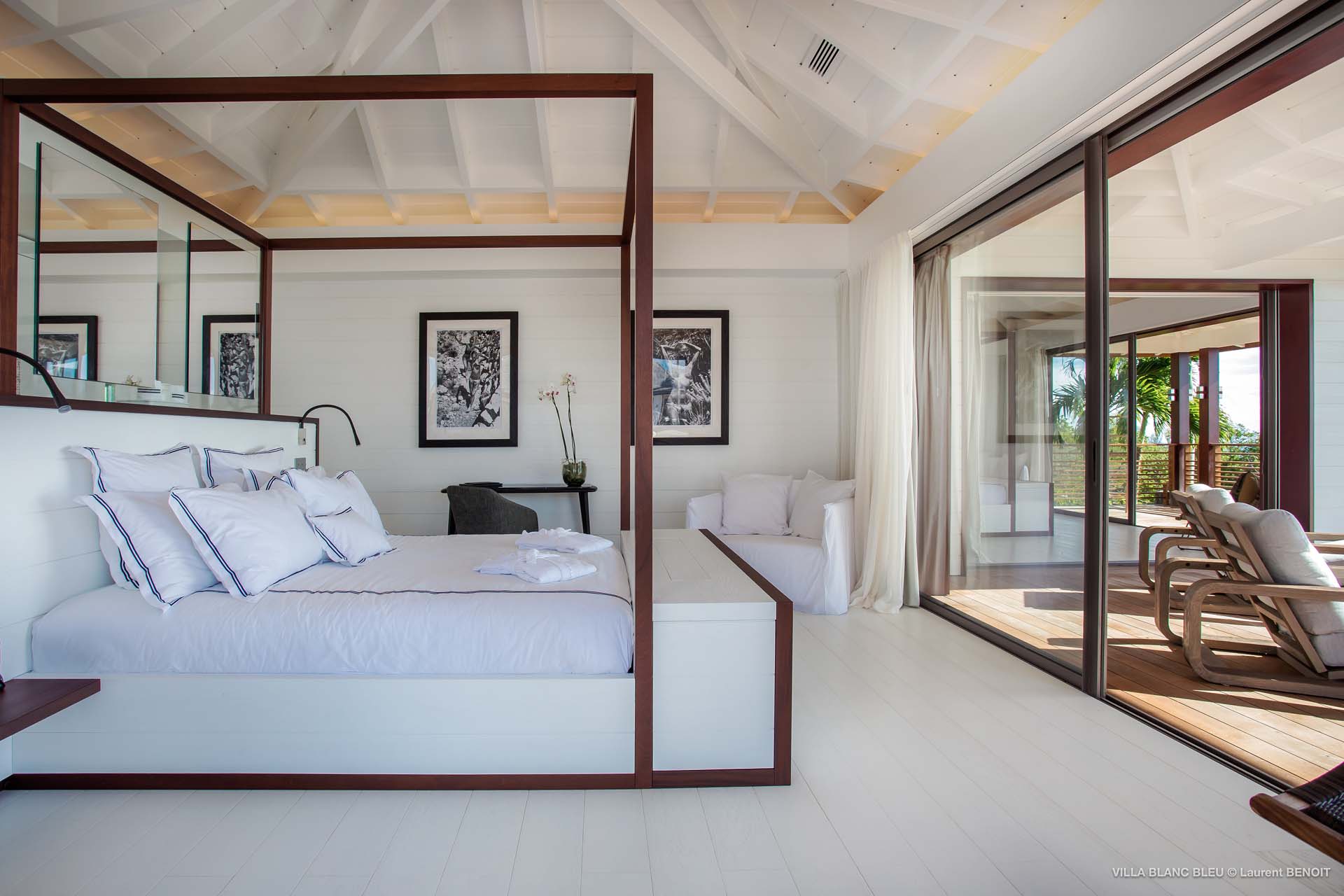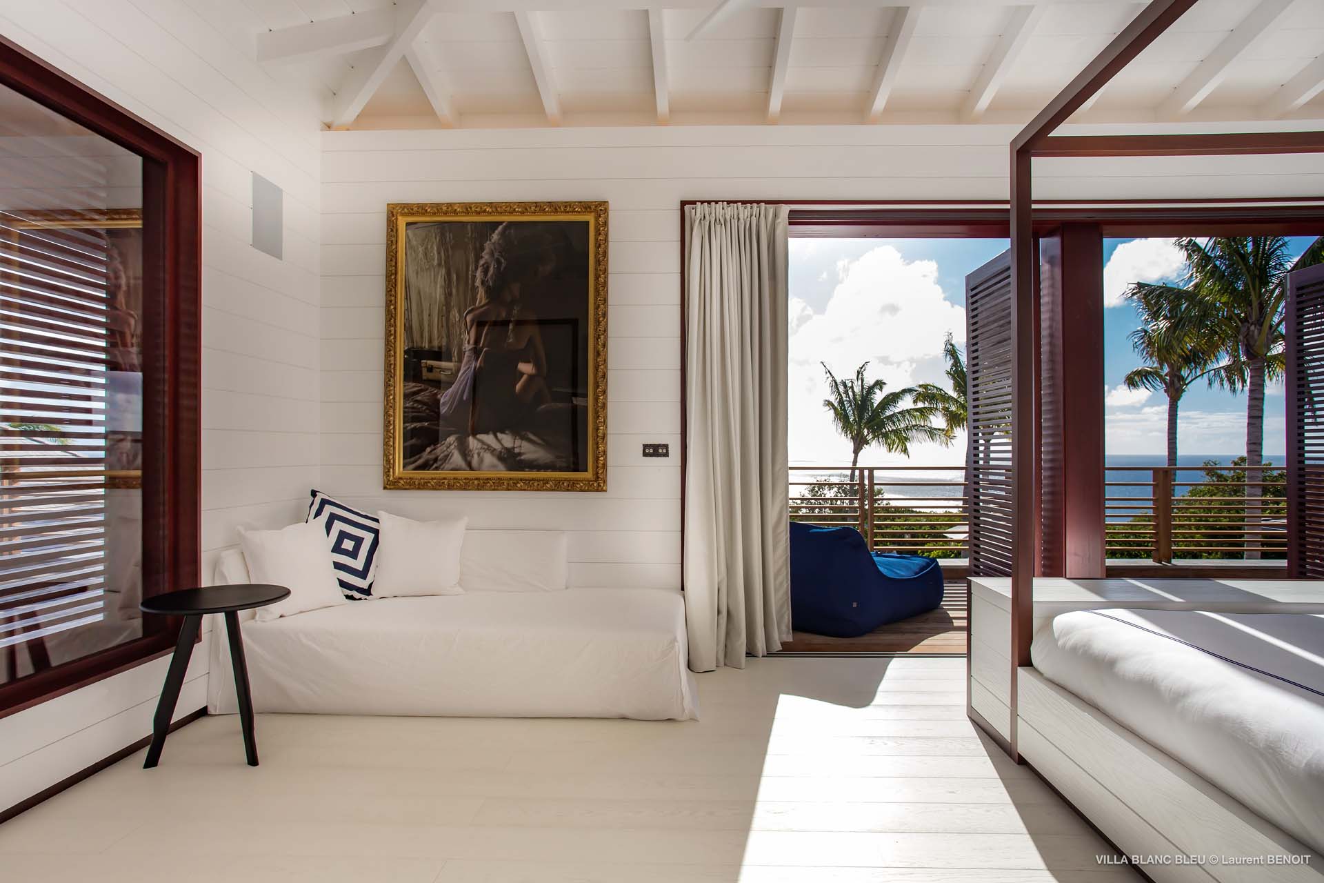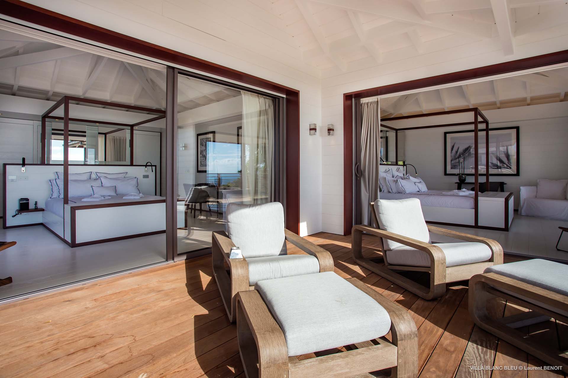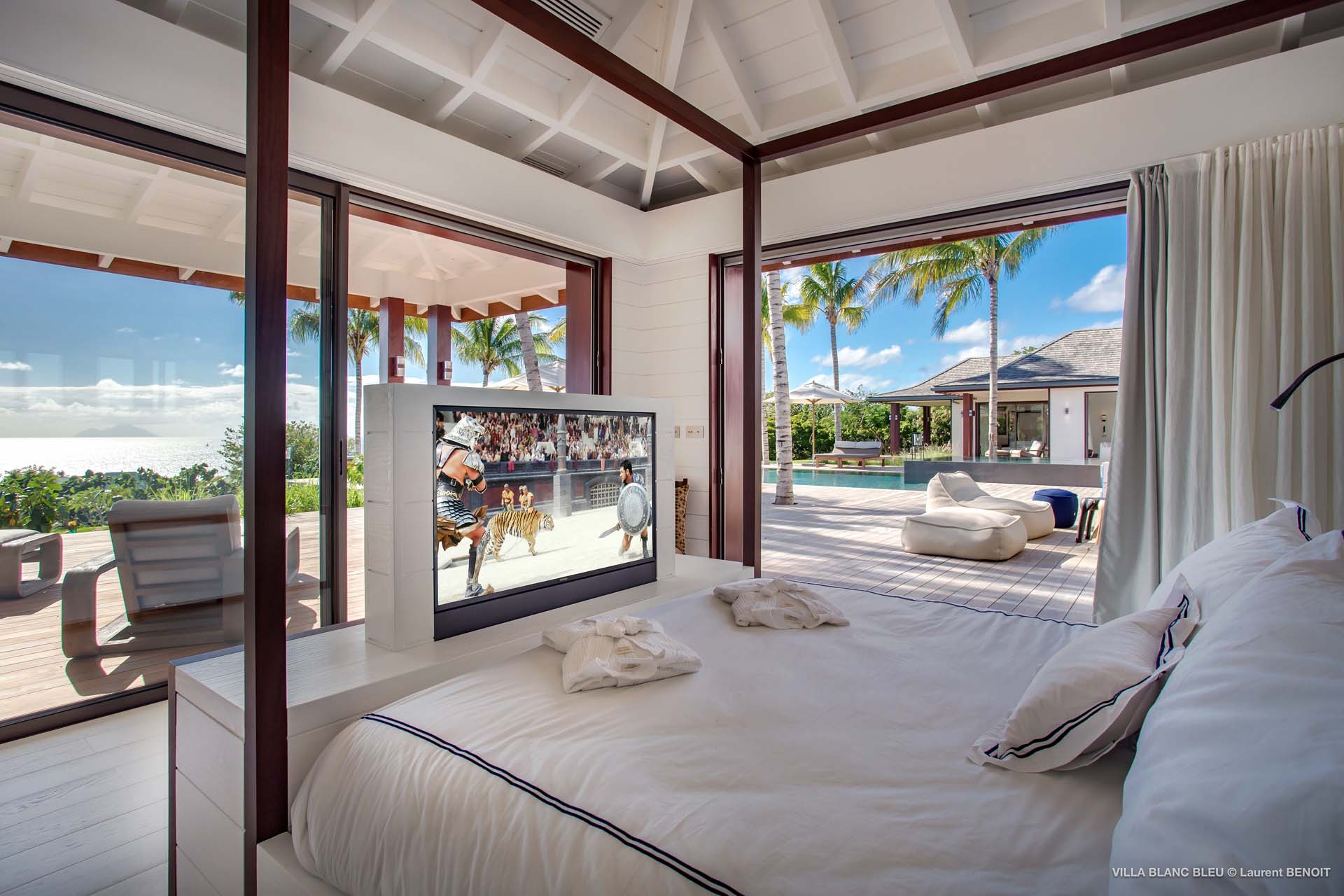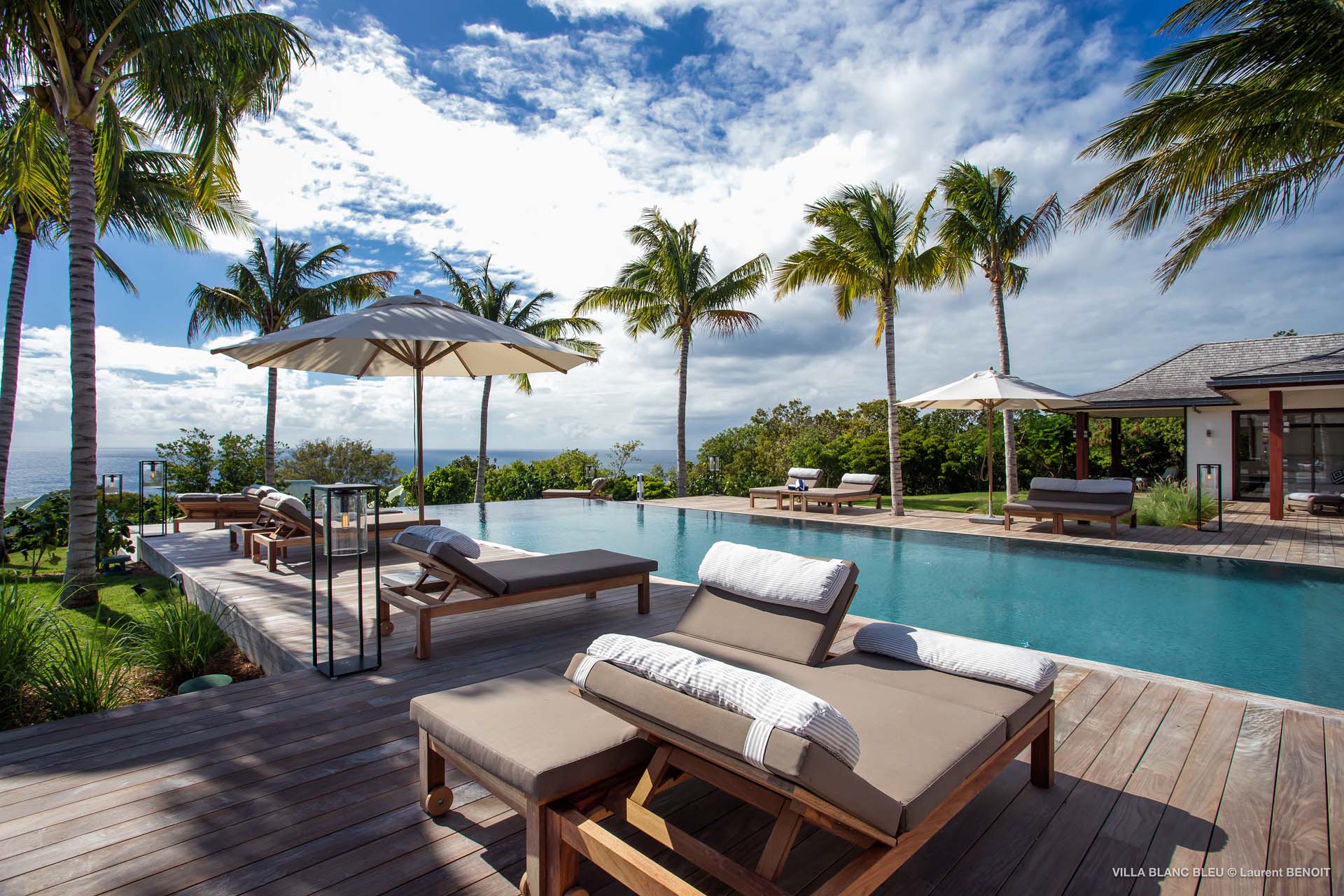 Castaway to Villa Blanc Bleu (villa code: WV BLB), an elegant 6-bedroom villa in Gouverneur, St. Barts. This luxurious estate is all about elegance and relaxed island living, enjoying stunning sunset views over the Caribbean. A masterclass in geometric design, the architecture at Villa Blanc Bleu will sweep you away. The open-plan design flows from the inside out, with accents of rustic wood contrasting with the color palette of white and blue. Classic island decor enhances the Caribbean vibe, while large windows and doors bathe the entire home in all-day sunshine. Nestled in an upscale neighborhood above Gouverneur bay, the beach is just a few minutes away. Restaurants, shopping, and bars are also within easy driving distance, as Gustavia and St-Jean are both under a 10-minute drive. The open great room sets the tone for Villa Blanc Bleu, featuring the signature blue and white color scheme and stunning ocean views. There’s plenty of space to spread out, making this a great choice for families or a larger group of friends. In the great room is the living area, Soft blue sofas in the living room invite you to sink in, enjoying the island breeze drifting through the open doors. Connected to the living room is a separate TV room, with a large soft sofa in front of a flat-screen TV. The modern kitchen at Villa Blanc Bleu features everything you’ll need to create gourmet meals during your stay. Foodies will love experimenting with local flavors and ingredients here. Our concierge can organize grocery pre-stocking or delivery, catered meals, or arrange private chef service for a special occasion. On the covered terrace outside is an expansive dining table, which can seat up to 16 guests. Made from rustic wood and overlooking the pool, it’s an elegant setting for a festive dinner party. There’s a total of 6 bedrooms at Blanc Bleu Villa. There is an extra bedroom next to the kitchen that can also be made up with twin bunk beds, ideal for children or live-in staff members. A beautifully crafted stairway leads up from the great room to the master suite on the second level. Spacious and airy, this room overlooks the pool and ocean beyond. There’s a lounge for relaxing, a desk with a computer, and a private terrace furnished with a comfortable sofa. The other five bedrooms fan out on either side of the living room, each a quiet and private place to relax every evening. Four of these rooms come with a European king-sized bed, while the fifth has a pair of twin beds. All rooms have a private ensuite and a flat-screen TV. Under the covered terrace outside is a comfortable outdoor lounge, a great spot to relax in the warm island air. Whether you’re diving into a good book or simply gazing out at the ocean, this is the best seat in the house. A large projector screen also lets you gather here for an open-air movie night. Out on the terrace at Blanc Bleu, loungers, sunbeds, and parasols offer plenty of options for unwinding in either the sun or shade. They’re all scattered around the nearly 60-foot-long swimming pool, a refreshing spot to cool off during the day. When the afternoon starts to fade, retreating to the large spa is encouraged, letting you watch the sunset with a cocktail in hand. Throw on some music over the outdoor speakers for a glamorous poolside party. A narrow path leads to a small gym and an in-ground trampoline. Here you’ll also find a pickle ball tennis court, complete with an automatic ball server for those working on their topspin. For days on the sand, Gouverneur Beach is a 3-minute drive. Within 10 minutes, you can also be lounging on the pristine shores of either St-Jean or Saline Beach.Please fill out the form to begin your inquiry and we will connect you with a seasoned villa rental specialist.