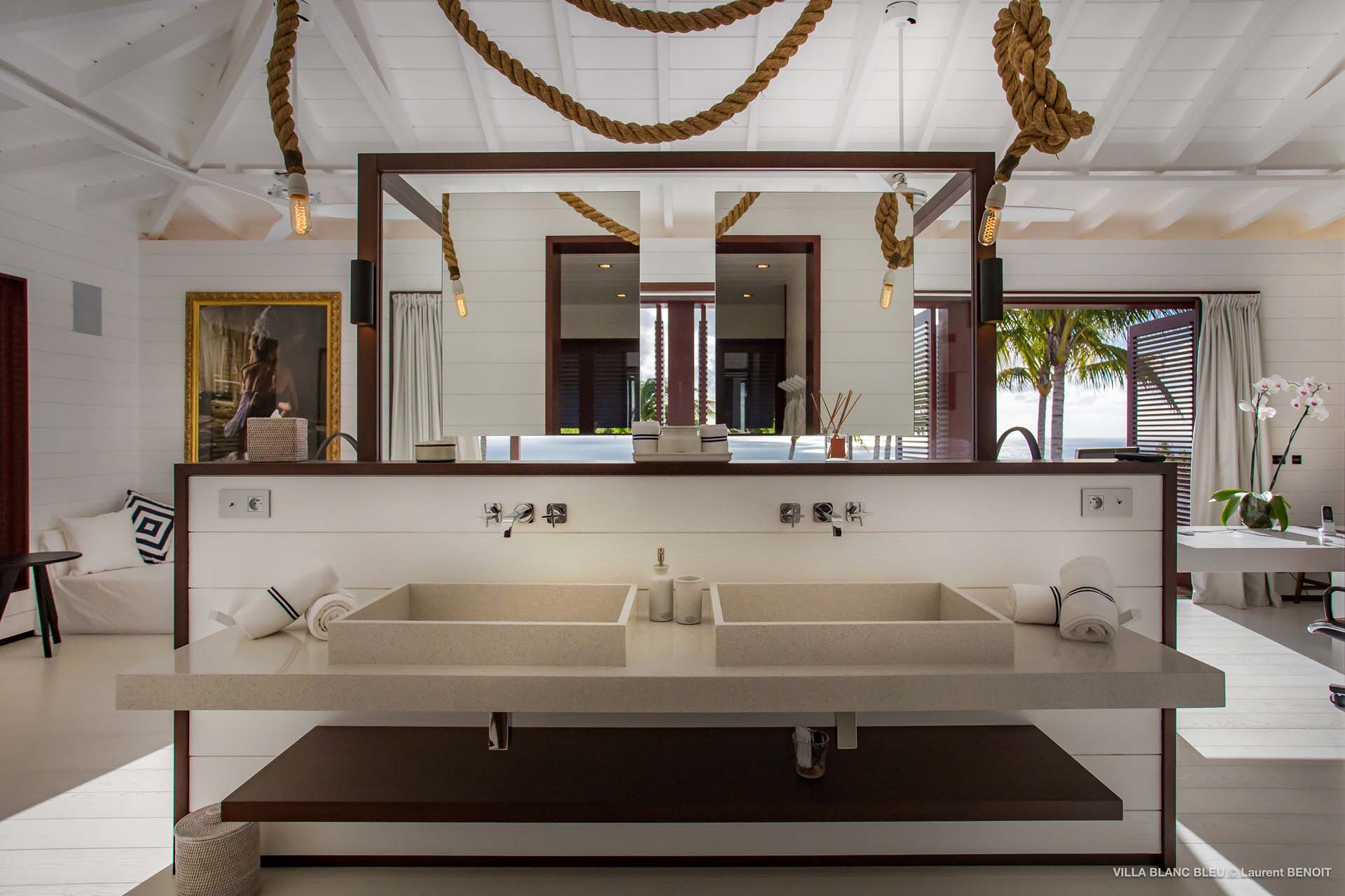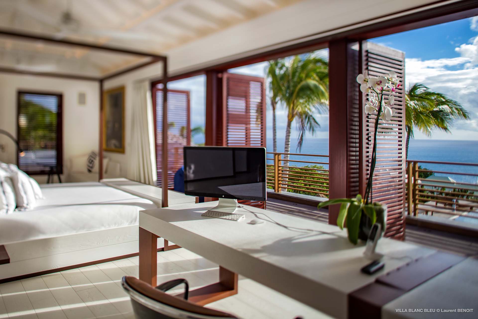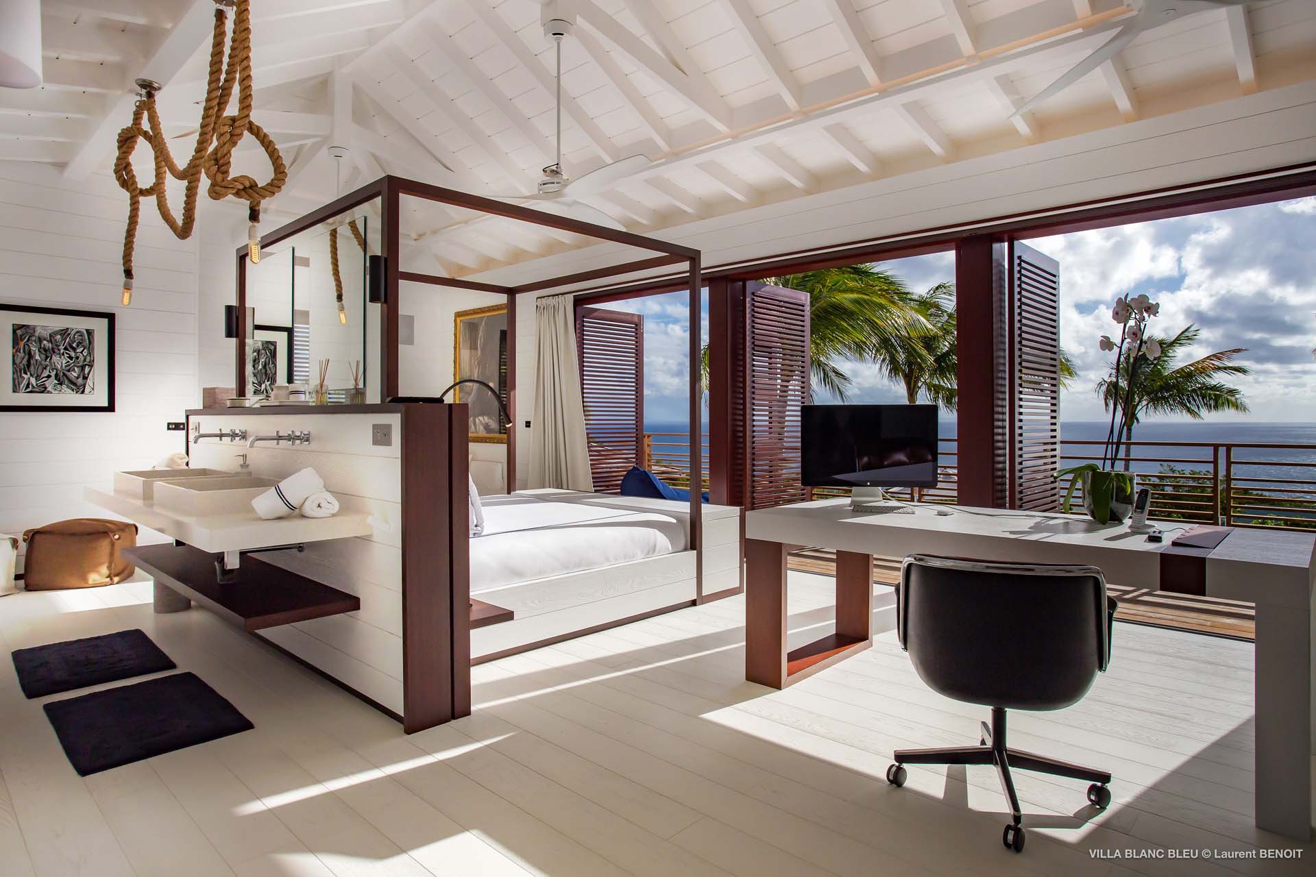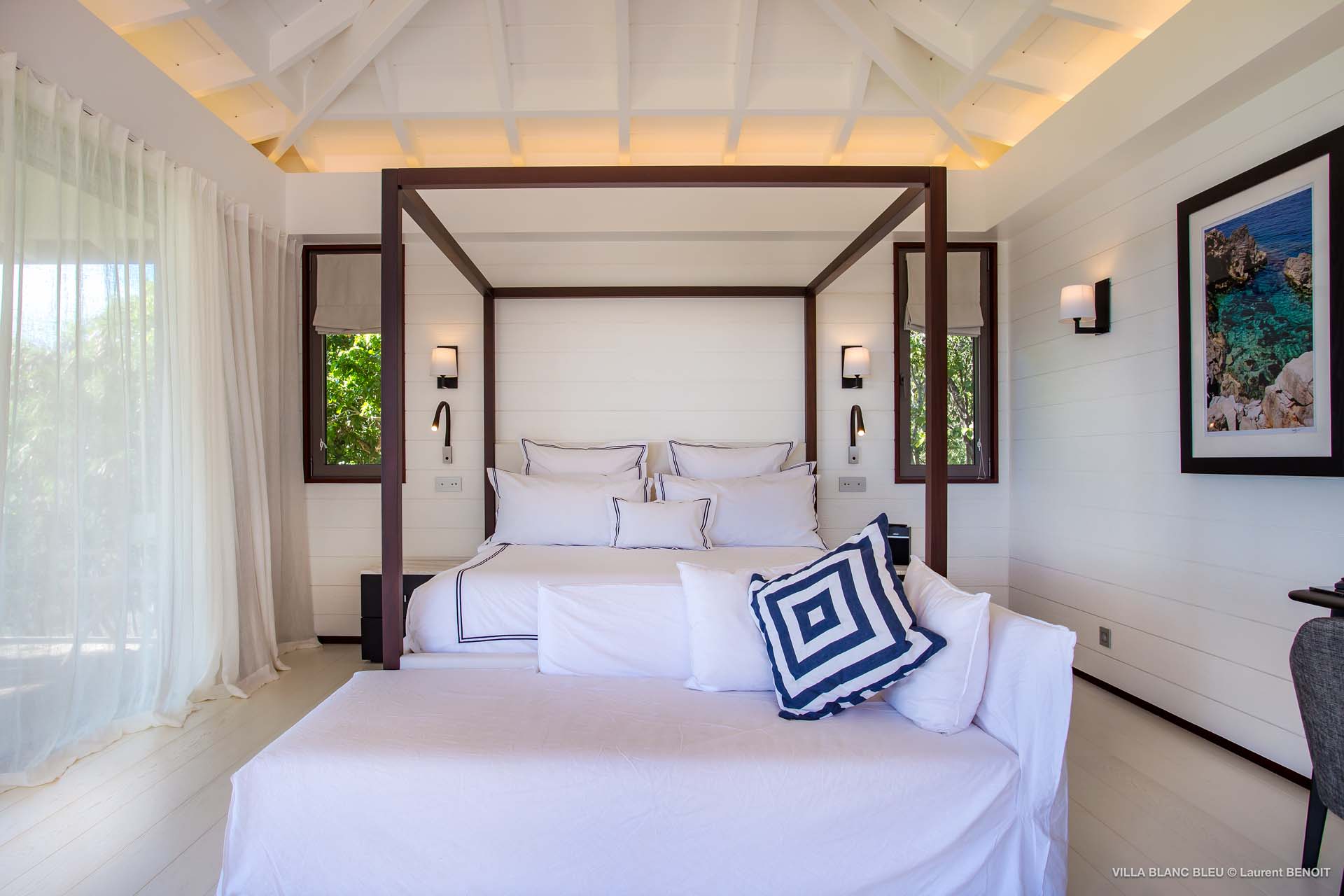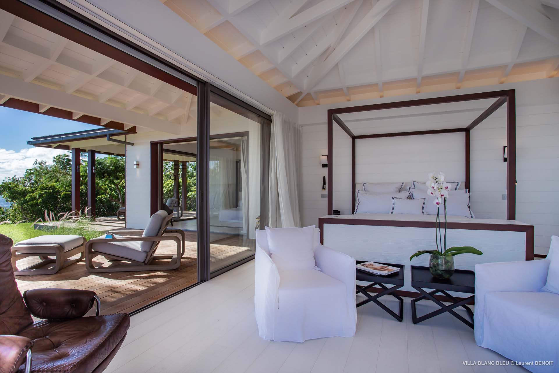 Castaway to Villa Blanc Bleu (villa code: WV BLB), an elegant 6-bedroom villa in Gouverneur, St. Barts. This luxurious estate is all about elegance and relaxed island living, enjoying stunning sunset views over the Caribbean. A masterclass in geometric design, the architecture at Villa Blanc Bleu will sweep you away. The open-plan design flows from the inside out, with accents of rustic wood contrasting with the color palette of white and blue. Classic island decor enhances the Caribbean vibe, while large windows and doors bathe the entire home in all-day sunshine. Nestled in an upscale neighborhood above Gouverneur bay, the beach is just a few minutes away. Restaurants, shopping, and bars are also within easy driving distance, as Gustavia and St-Jean are both under a 10-minute drive. The open great room sets the tone for Villa Blanc Bleu, featuring the signature blue and white color scheme and stunning ocean views. There’s plenty of space to spread out, making this a great choice for families or a larger group of friends. In the great room is the living area, Soft blue sofas in the living room invite you to sink in, enjoying the island breeze drifting through the open doors. Connected to the living room is a separate TV room, with a large soft sofa in front of a flat-screen TV. The modern kitchen at Villa Blanc Bleu features everything you’ll need to create gourmet meals during your stay. Foodies will love experimenting with local flavors and ingredients here. Our concierge can organize grocery pre-stocking or delivery, catered meals, or arrange private chef service for a special occasion. On the covered terrace outside is an expansive dining table, which can seat up to 16 guests. Made from rustic wood and overlooking the pool, it’s an elegant setting for a festive dinner party. There’s a total of 6 bedrooms at Blanc Bleu Villa. There is an extra bedroom next to the kitchen that can also be made up with twin bunk beds, ideal for children or live-in staff members. A beautifully crafted stairway leads up from the great room to the master suite on the second level. Spacious and airy, this room overlooks the pool and ocean beyond. There’s a lounge for relaxing, a desk with a computer, and a private terrace furnished with a comfortable sofa. The other five bedrooms fan out on either side of the living room, each a quiet and private place to relax every evening. Four of these rooms come with a European king-sized bed, while the fifth has a pair of twin beds. All rooms have a private ensuite and a flat-screen TV. Under the covered terrace outside is a comfortable outdoor lounge, a great spot to relax in the warm island air. Whether you’re diving into a good book or simply gazing out at the ocean, this is the best seat in the house. A large projector screen also lets you gather here for an open-air movie night. Out on the terrace at Blanc Bleu, loungers, sunbeds, and parasols offer plenty of options for unwinding in either the sun or shade. They’re all scattered around the nearly 60-foot-long swimming pool, a refreshing spot to cool off during the day. When the afternoon starts to fade, retreating to the large spa is encouraged, letting you watch the sunset with a cocktail in hand. Throw on some music over the outdoor speakers for a glamorous poolside party. A narrow path leads to a small gym and an in-ground trampoline. Here you’ll also find a pickle ball tennis court, complete with an automatic ball server for those working on their topspin. For days on the sand, Gouverneur Beach is a 3-minute drive. Within 10 minutes, you can also be lounging on the pristine shores of either St-Jean or Saline Beach.Please fill out the form to begin your inquiry and we will connect you with a seasoned villa rental specialist.