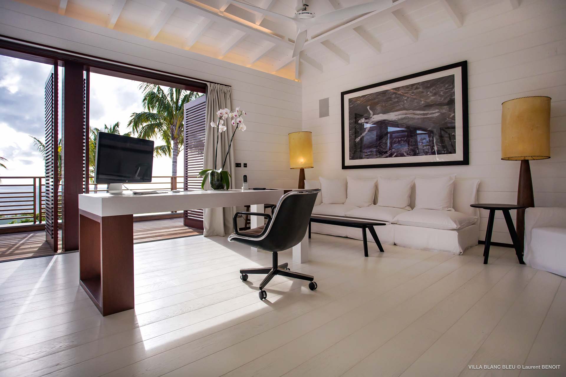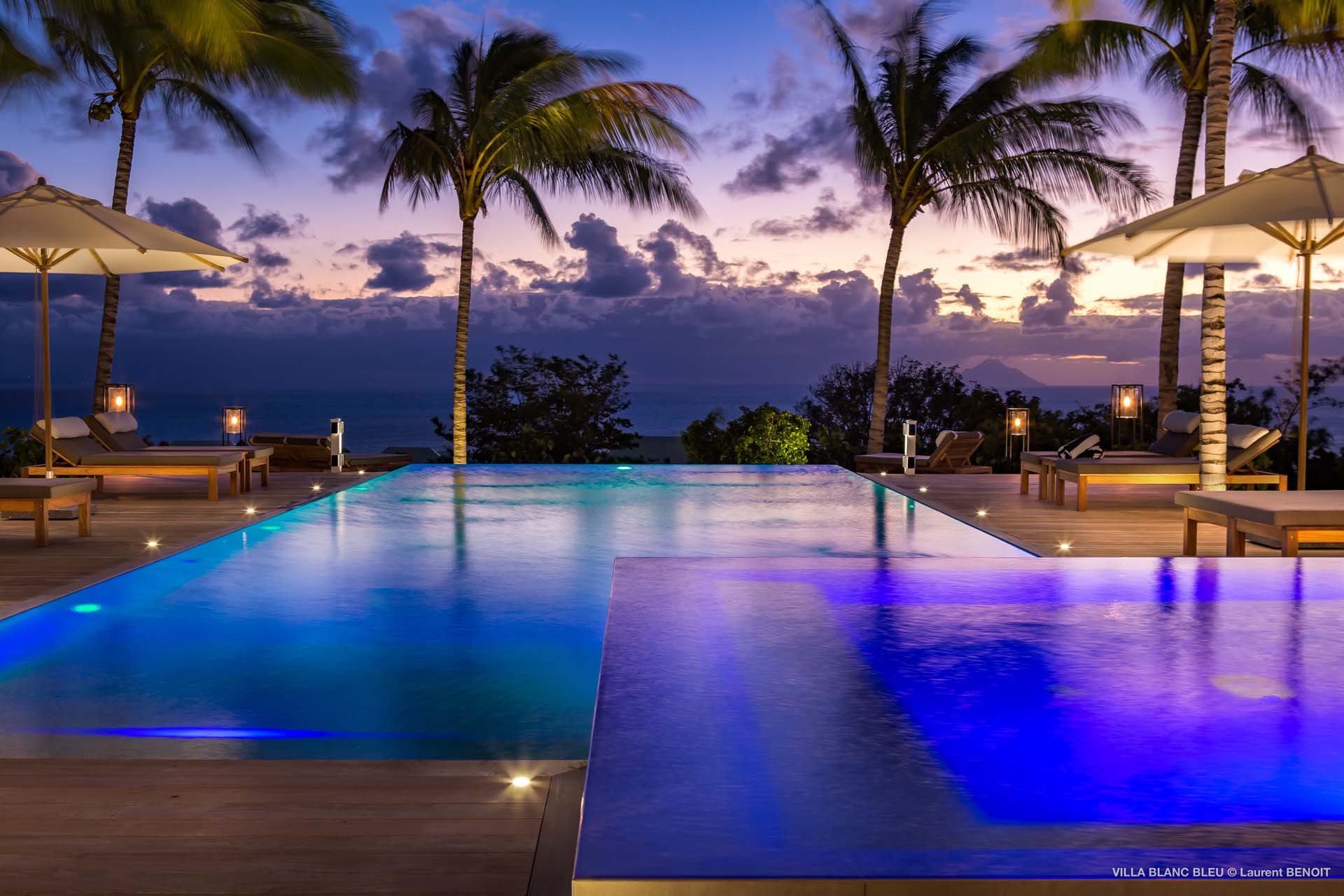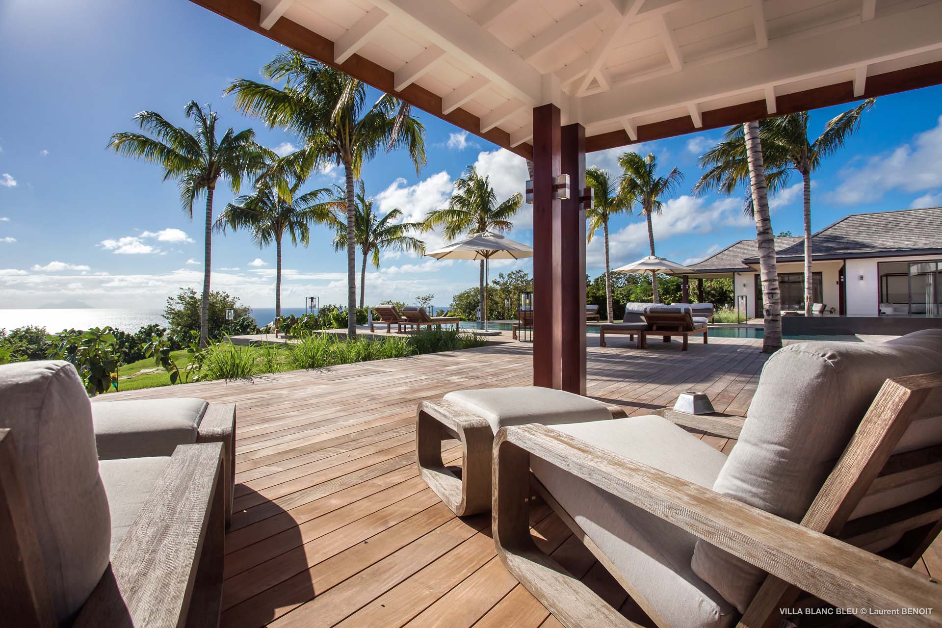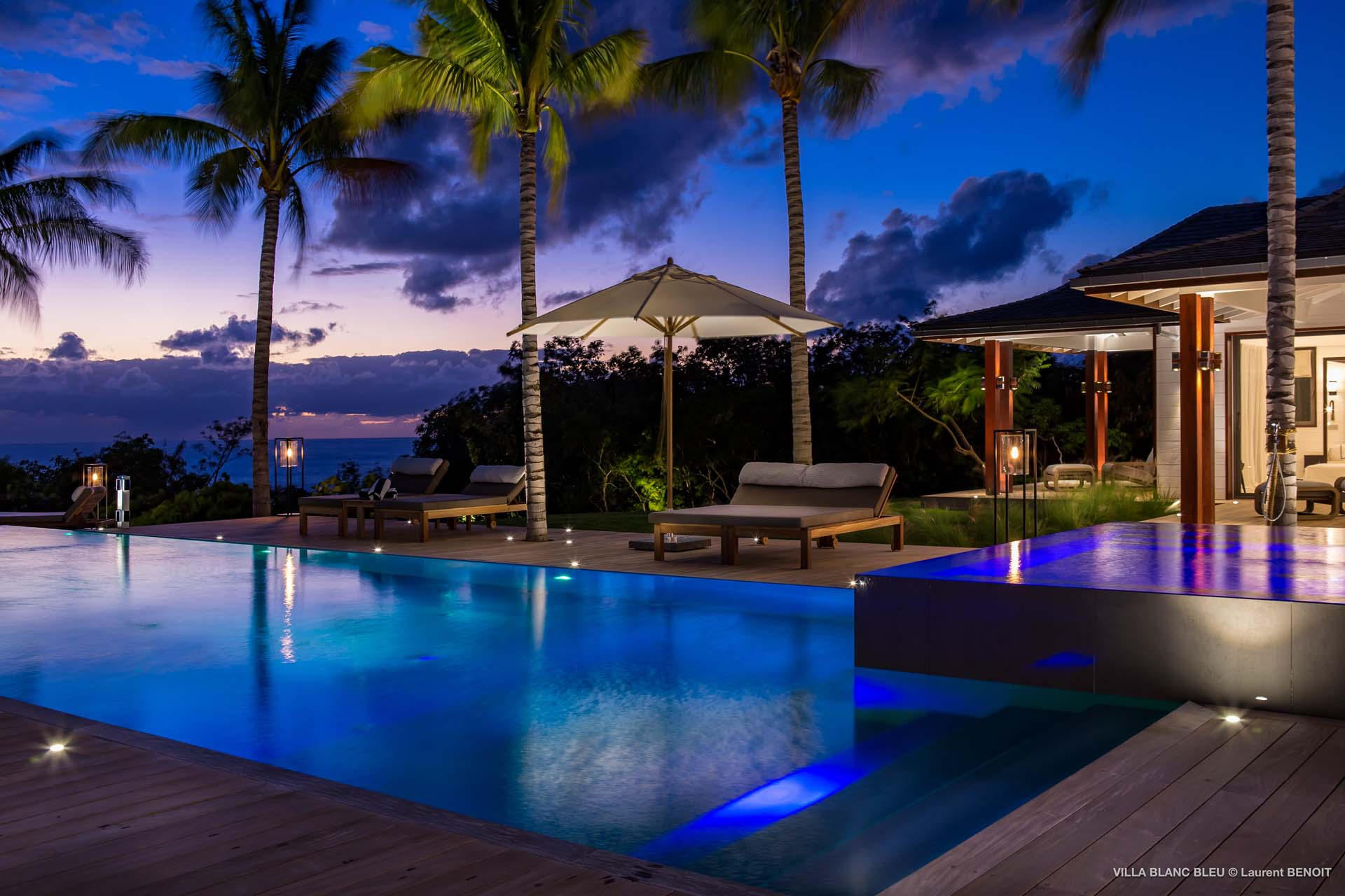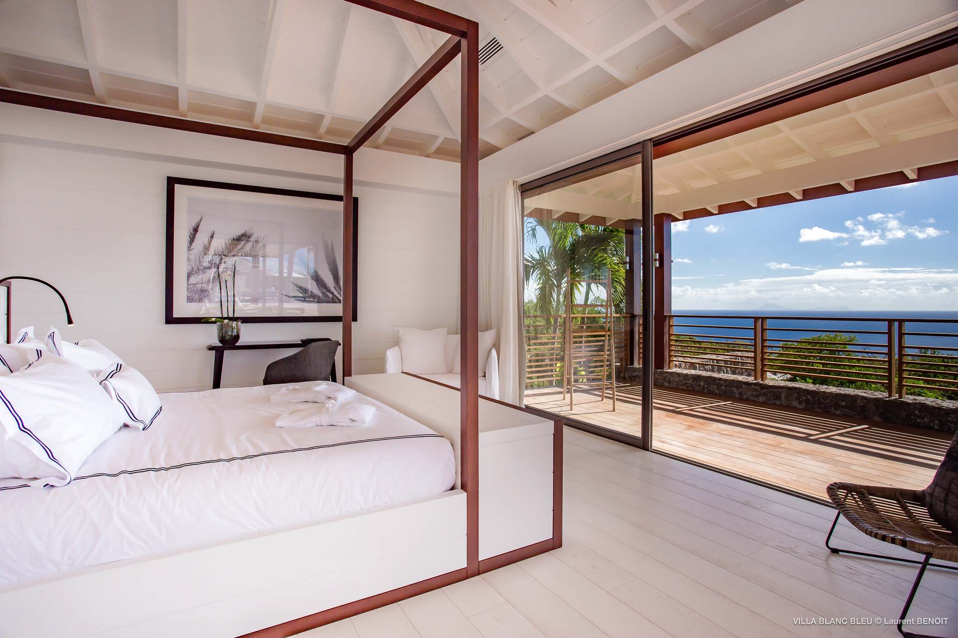 Castaway to Villa Blanc Bleu (villa code: WV BLB), an elegant 6-bedroom villa in Gouverneur, St. Barts. This luxurious estate is all about elegance and relaxed island living, enjoying stunning sunset views over the Caribbean. A masterclass in geometric design, the architecture at Villa Blanc Bleu will sweep you away. The open-plan design flows from the inside out, with accents of rustic wood contrasting with the color palette of white and blue. Classic island decor enhances the Caribbean vibe, while large windows and doors bathe the entire home in all-day sunshine. Nestled in an upscale neighborhood above Gouverneur bay, the beach is just a few minutes away. Restaurants, shopping, and bars are also within easy driving distance, as Gustavia and St-Jean are both under a 10-minute drive. The open great room sets the tone for Villa Blanc Bleu, featuring the signature blue and white color scheme and stunning ocean views. There’s plenty of space to spread out, making this a great choice for families or a larger group of friends. In the great room is the living area, Soft blue sofas in the living room invite you to sink in, enjoying the island breeze drifting through the open doors. Connected to the living room is a separate TV room, with a large soft sofa in front of a flat-screen TV. The modern kitchen at Villa Blanc Bleu features everything you’ll need to create gourmet meals during your stay. Foodies will love experimenting with local flavors and ingredients here. Our concierge can organize grocery pre-stocking or delivery, catered meals, or arrange private chef service for a special occasion. On the covered terrace outside is an expansive dining table, which can seat up to 16 guests. Made from rustic wood and overlooking the pool, it’s an elegant setting for a festive dinner party. There’s a total of 6 bedrooms at Blanc Bleu Villa. There is an extra bedroom next to the kitchen that can also be made up with twin bunk beds, ideal for children or live-in staff members. A beautifully crafted stairway leads up from the great room to the master suite on the second level. Spacious and airy, this room overlooks the pool and ocean beyond. There’s a lounge for relaxing, a desk with a computer, and a private terrace furnished with a comfortable sofa. The other five bedrooms fan out on either side of the living room, each a quiet and private place to relax every evening. Four of these rooms come with a European king-sized bed, while the fifth has a pair of twin beds. All rooms have a private ensuite and a flat-screen TV. Under the covered terrace outside is a comfortable outdoor lounge, a great spot to relax in the warm island air. Whether you’re diving into a good book or simply gazing out at the ocean, this is the best seat in the house. A large projector screen also lets you gather here for an open-air movie night. Out on the terrace at Blanc Bleu, loungers, sunbeds, and parasols offer plenty of options for unwinding in either the sun or shade. They’re all scattered around the nearly 60-foot-long swimming pool, a refreshing spot to cool off during the day. When the afternoon starts to fade, retreating to the large spa is encouraged, letting you watch the sunset with a cocktail in hand. Throw on some music over the outdoor speakers for a glamorous poolside party. A narrow path leads to a small gym and an in-ground trampoline. Here you’ll also find a pickle ball tennis court, complete with an automatic ball server for those working on their topspin. For days on the sand, Gouverneur Beach is a 3-minute drive. Within 10 minutes, you can also be lounging on the pristine shores of either St-Jean or Saline Beach.Please fill out the form to begin your inquiry and we will connect you with a seasoned villa rental specialist.