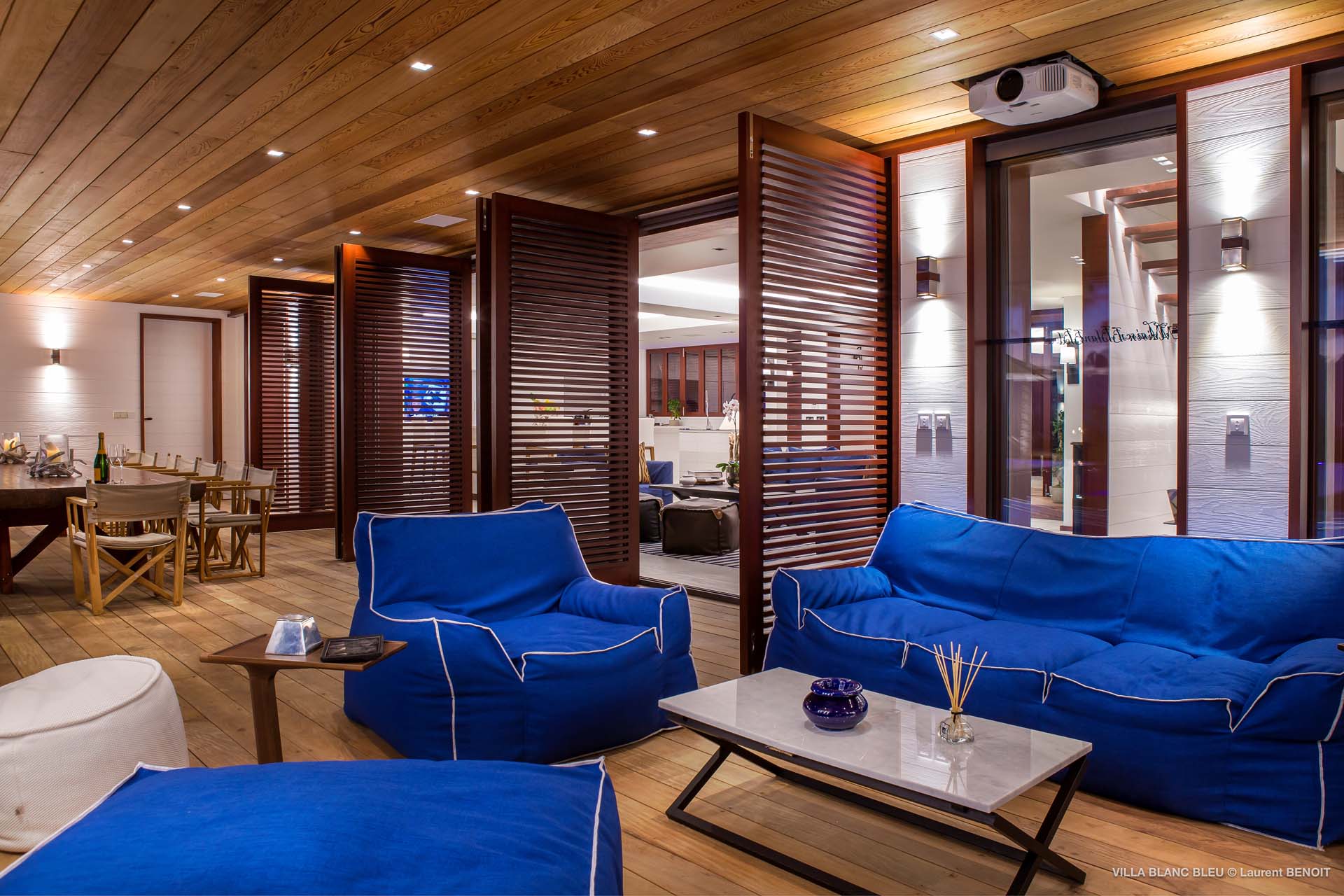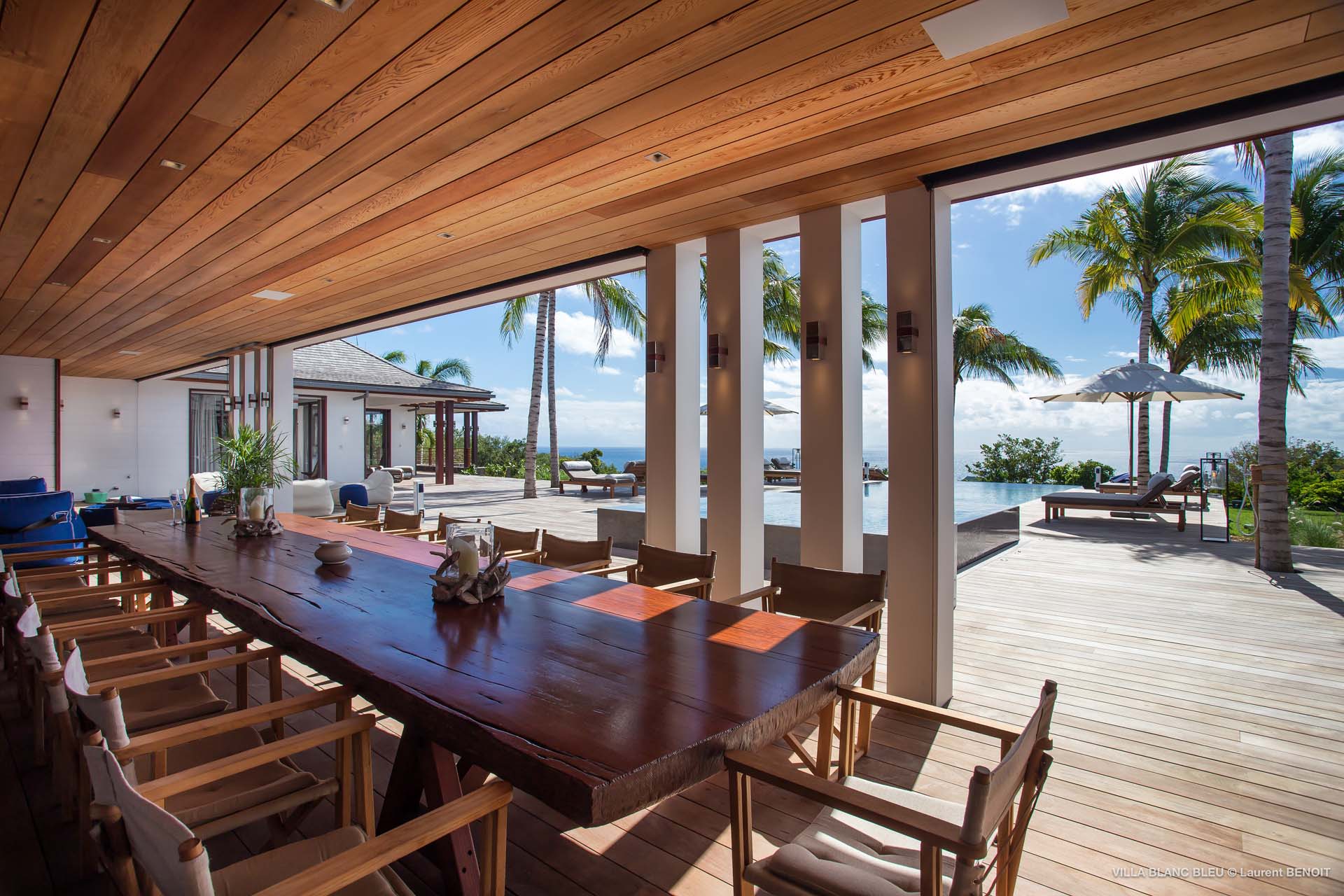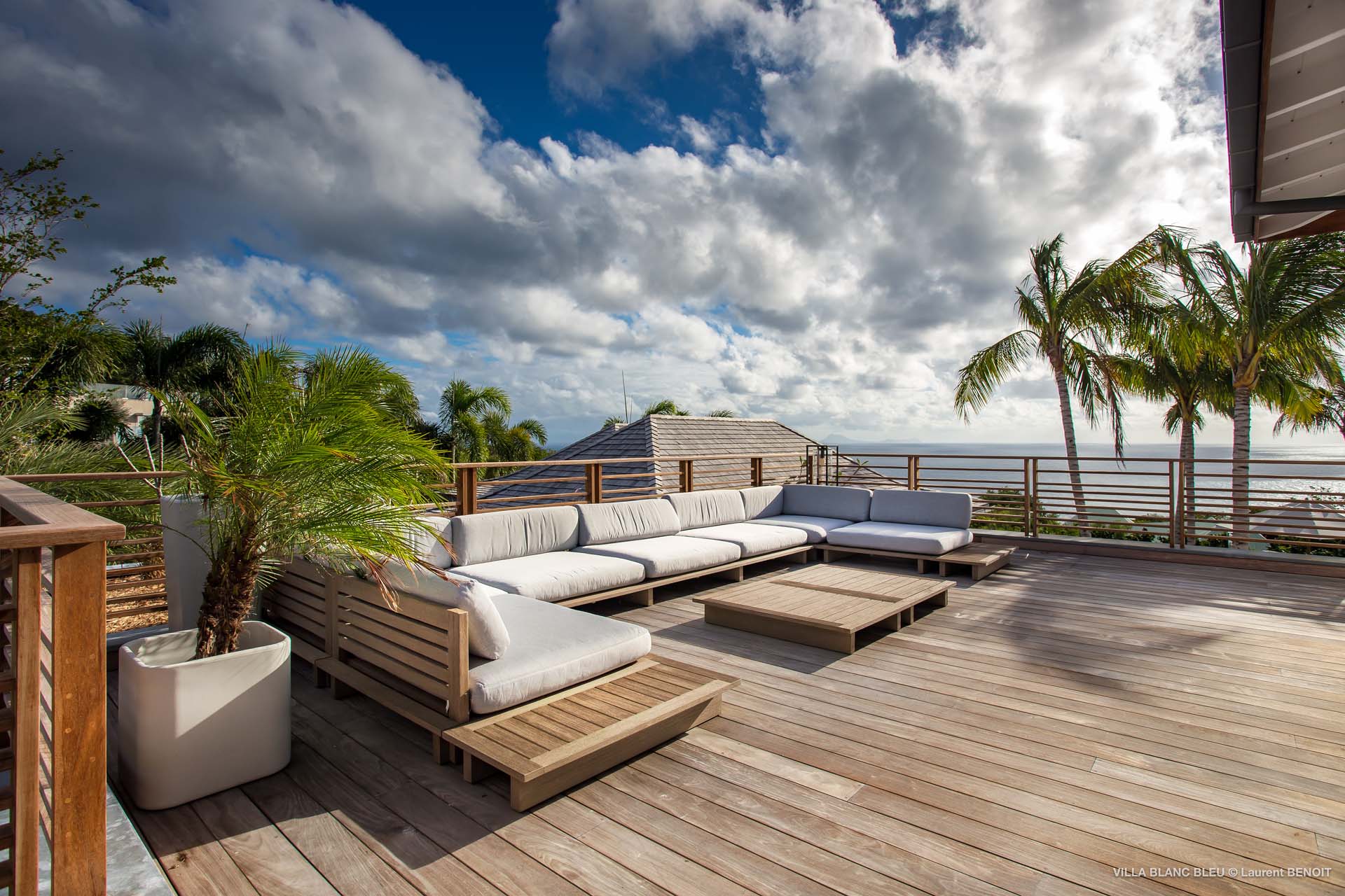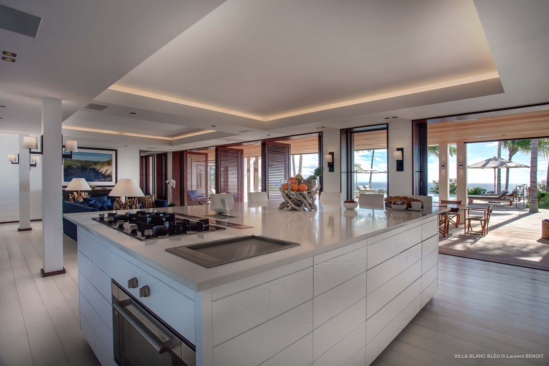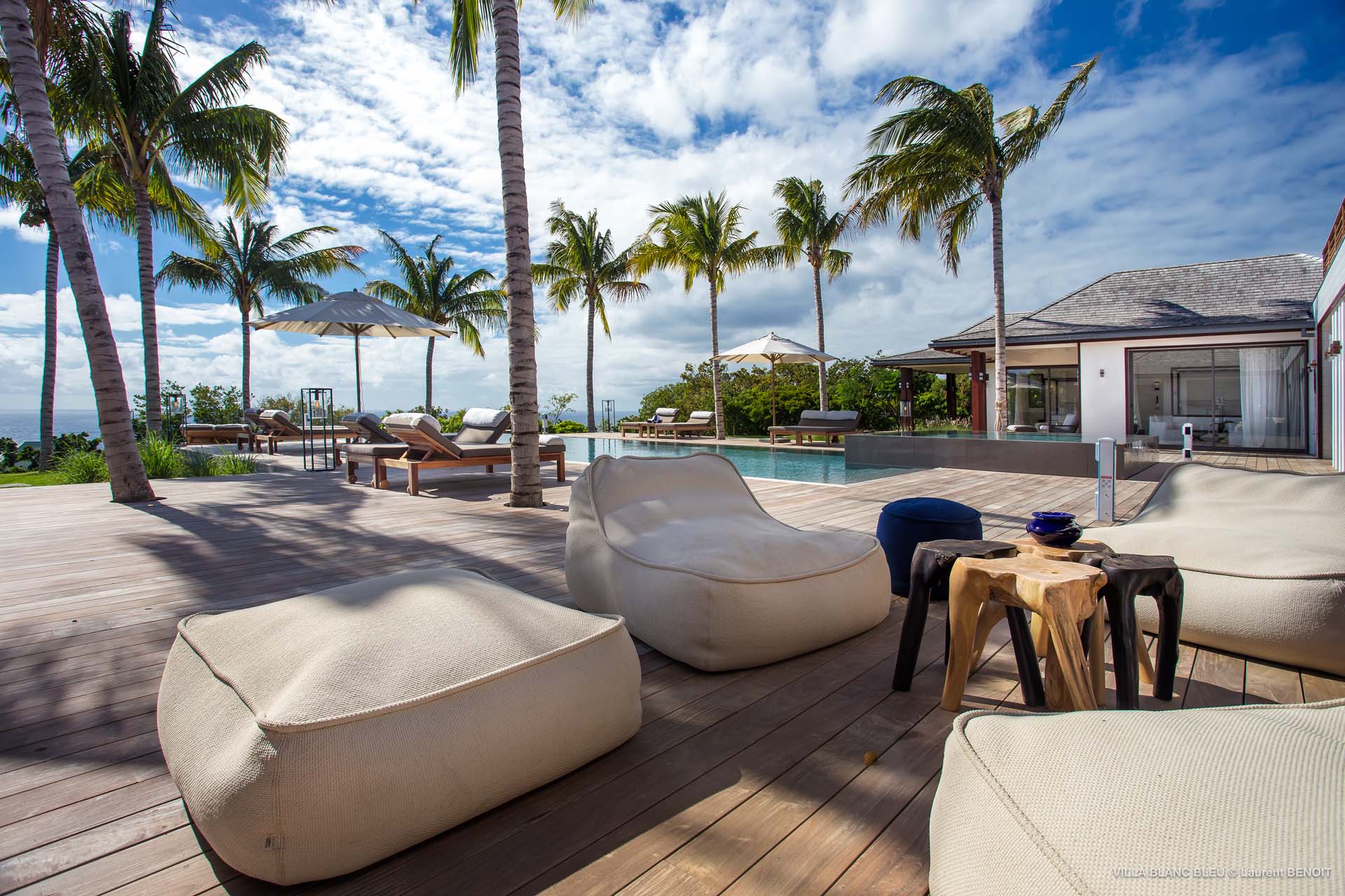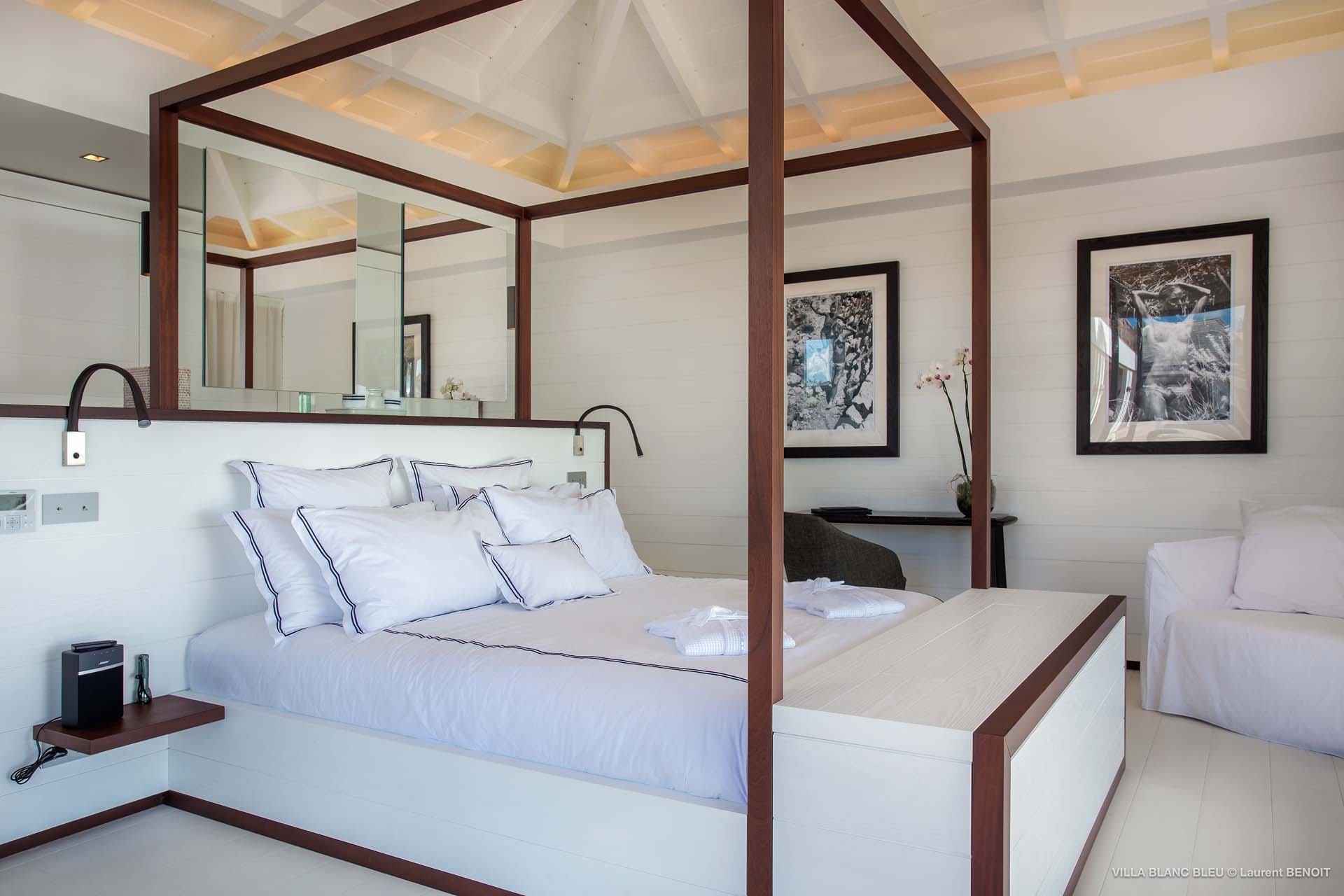 Castaway to Villa Blanc Bleu (villa code: WV BLB), an elegant 6-bedroom villa in Gouverneur, St. Barts. This luxurious estate is all about elegance and relaxed island living, enjoying stunning sunset views over the Caribbean. A masterclass in geometric design, the architecture at Villa Blanc Bleu will sweep you away. The open-plan design flows from the inside out, with accents of rustic wood contrasting with the color palette of white and blue. Classic island decor enhances the Caribbean vibe, while large windows and doors bathe the entire home in all-day sunshine. Nestled in an upscale neighborhood above Gouverneur bay, the beach is just a few minutes away. Restaurants, shopping, and bars are also within easy driving distance, as Gustavia and St-Jean are both under a 10-minute drive. The open great room sets the tone for Villa Blanc Bleu, featuring the signature blue and white color scheme and stunning ocean views. There’s plenty of space to spread out, making this a great choice for families or a larger group of friends. In the great room is the living area, Soft blue sofas in the living room invite you to sink in, enjoying the island breeze drifting through the open doors. Connected to the living room is a separate TV room, with a large soft sofa in front of a flat-screen TV. The modern kitchen at Villa Blanc Bleu features everything you’ll need to create gourmet meals during your stay. Foodies will love experimenting with local flavors and ingredients here. Our concierge can organize grocery pre-stocking or delivery, catered meals, or arrange private chef service for a special occasion. On the covered terrace outside is an expansive dining table, which can seat up to 16 guests. Made from rustic wood and overlooking the pool, it’s an elegant setting for a festive dinner party. There’s a total of 6 bedrooms at Blanc Bleu Villa. There is an extra bedroom next to the kitchen that can also be made up with twin bunk beds, ideal for children or live-in staff members. A beautifully crafted stairway leads up from the great room to the master suite on the second level. Spacious and airy, this room overlooks the pool and ocean beyond. There’s a lounge for relaxing, a desk with a computer, and a private terrace furnished with a comfortable sofa. The other five bedrooms fan out on either side of the living room, each a quiet and private place to relax every evening. Four of these rooms come with a European king-sized bed, while the fifth has a pair of twin beds. All rooms have a private ensuite and a flat-screen TV. Under the covered terrace outside is a comfortable outdoor lounge, a great spot to relax in the warm island air. Whether you’re diving into a good book or simply gazing out at the ocean, this is the best seat in the house. A large projector screen also lets you gather here for an open-air movie night. Out on the terrace at Blanc Bleu, loungers, sunbeds, and parasols offer plenty of options for unwinding in either the sun or shade. They’re all scattered around the nearly 60-foot-long swimming pool, a refreshing spot to cool off during the day. When the afternoon starts to fade, retreating to the large spa is encouraged, letting you watch the sunset with a cocktail in hand. Throw on some music over the outdoor speakers for a glamorous poolside party. A narrow path leads to a small gym and an in-ground trampoline. Here you’ll also find a pickle ball tennis court, complete with an automatic ball server for those working on their topspin. For days on the sand, Gouverneur Beach is a 3-minute drive. Within 10 minutes, you can also be lounging on the pristine shores of either St-Jean or Saline Beach.Please fill out the form to begin your inquiry and we will connect you with a seasoned villa rental specialist.