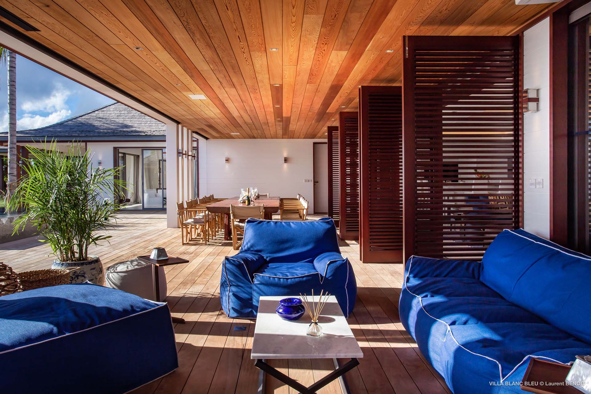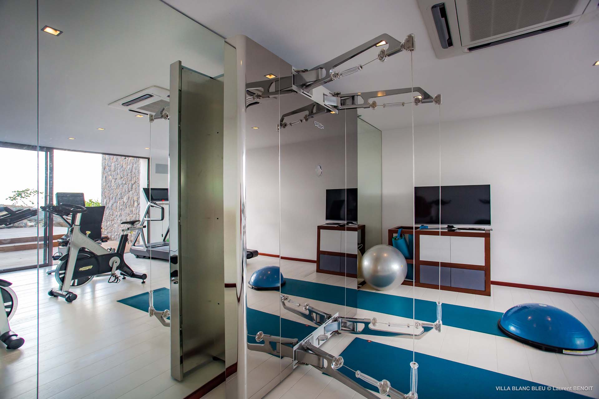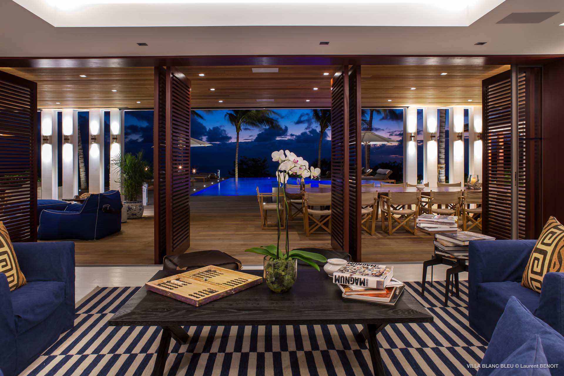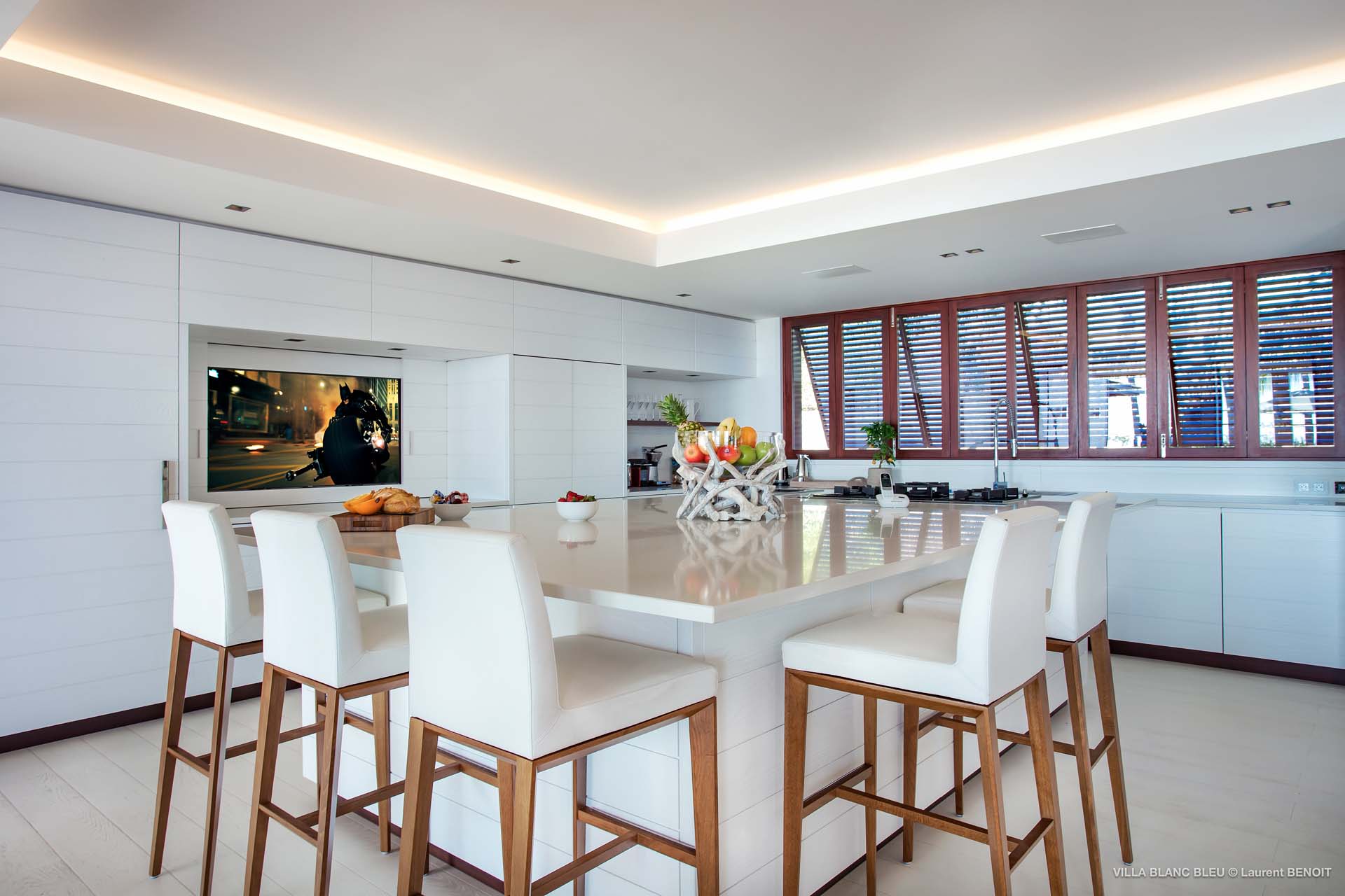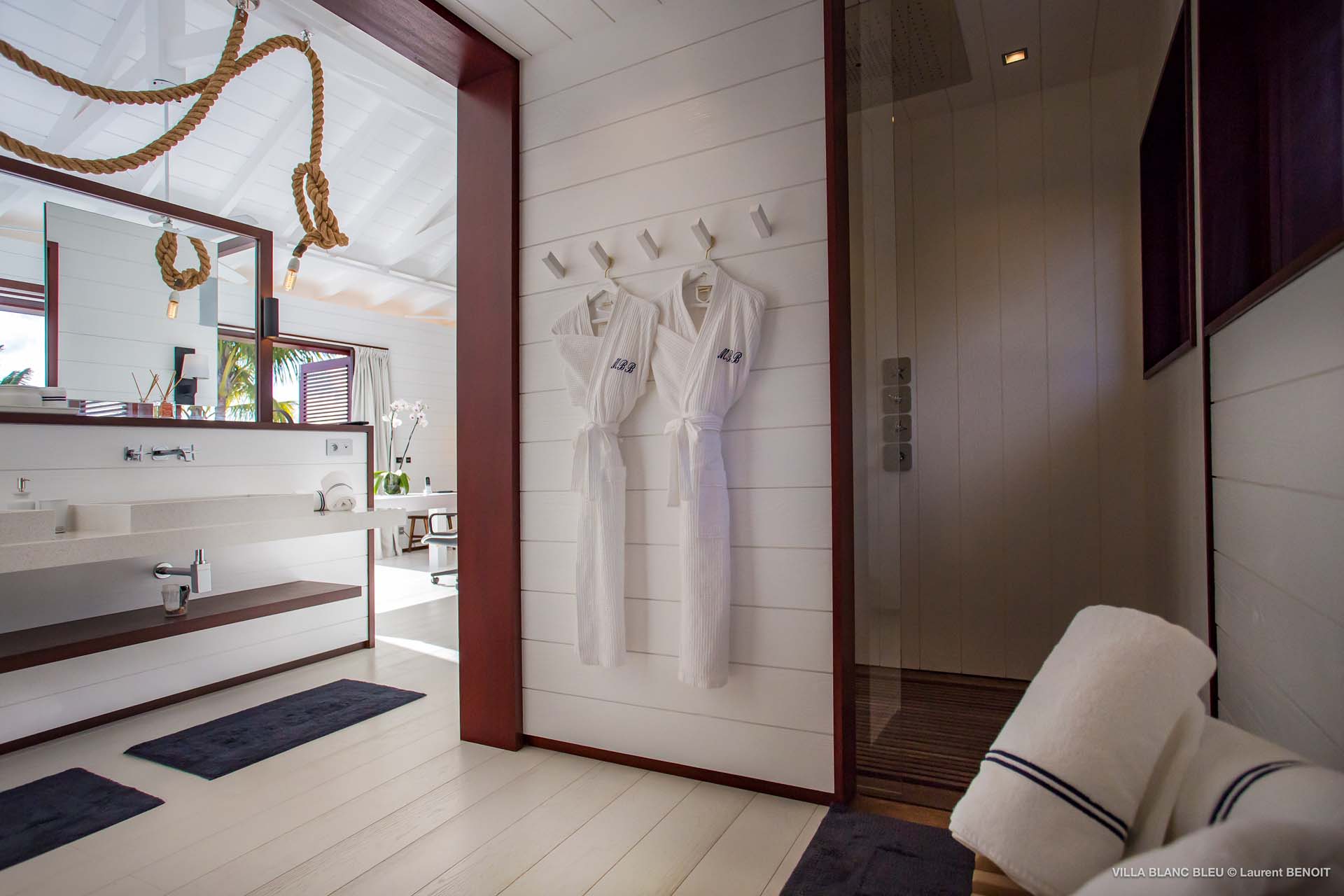 Castaway to Villa Blanc Bleu (villa code: WV BLB), an elegant 6-bedroom villa in Gouverneur, St. Barts. This luxurious estate is all about elegance and relaxed island living, enjoying stunning sunset views over the Caribbean. A masterclass in geometric design, the architecture at Villa Blanc Bleu will sweep you away. The open-plan design flows from the inside out, with accents of rustic wood contrasting with the color palette of white and blue. Classic island decor enhances the Caribbean vibe, while large windows and doors bathe the entire home in all-day sunshine. Nestled in an upscale neighborhood above Gouverneur bay, the beach is just a few minutes away. Restaurants, shopping, and bars are also within easy driving distance, as Gustavia and St-Jean are both under a 10-minute drive. The open great room sets the tone for Villa Blanc Bleu, featuring the signature blue and white color scheme and stunning ocean views. There’s plenty of space to spread out, making this a great choice for families or a larger group of friends. In the great room is the living area, Soft blue sofas in the living room invite you to sink in, enjoying the island breeze drifting through the open doors. Connected to the living room is a separate TV room, with a large soft sofa in front of a flat-screen TV. The modern kitchen at Villa Blanc Bleu features everything you’ll need to create gourmet meals during your stay. Foodies will love experimenting with local flavors and ingredients here. Our concierge can organize grocery pre-stocking or delivery, catered meals, or arrange private chef service for a special occasion. On the covered terrace outside is an expansive dining table, which can seat up to 16 guests. Made from rustic wood and overlooking the pool, it’s an elegant setting for a festive dinner party. There’s a total of 6 bedrooms at Blanc Bleu Villa. There is an extra bedroom next to the kitchen that can also be made up with twin bunk beds, ideal for children or live-in staff members. A beautifully crafted stairway leads up from the great room to the master suite on the second level. Spacious and airy, this room overlooks the pool and ocean beyond. There’s a lounge for relaxing, a desk with a computer, and a private terrace furnished with a comfortable sofa. The other five bedrooms fan out on either side of the living room, each a quiet and private place to relax every evening. Four of these rooms come with a European king-sized bed, while the fifth has a pair of twin beds. All rooms have a private ensuite and a flat-screen TV. Under the covered terrace outside is a comfortable outdoor lounge, a great spot to relax in the warm island air. Whether you’re diving into a good book or simply gazing out at the ocean, this is the best seat in the house. A large projector screen also lets you gather here for an open-air movie night. Out on the terrace at Blanc Bleu, loungers, sunbeds, and parasols offer plenty of options for unwinding in either the sun or shade. They’re all scattered around the nearly 60-foot-long swimming pool, a refreshing spot to cool off during the day. When the afternoon starts to fade, retreating to the large spa is encouraged, letting you watch the sunset with a cocktail in hand. Throw on some music over the outdoor speakers for a glamorous poolside party. A narrow path leads to a small gym and an in-ground trampoline. Here you’ll also find a pickle ball tennis court, complete with an automatic ball server for those working on their topspin. For days on the sand, Gouverneur Beach is a 3-minute drive. Within 10 minutes, you can also be lounging on the pristine shores of either St-Jean or Saline Beach.Please fill out the form to begin your inquiry and we will connect you with a seasoned villa rental specialist.