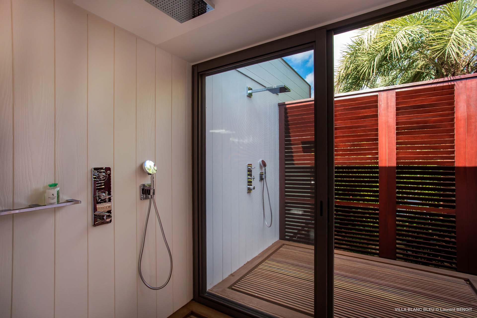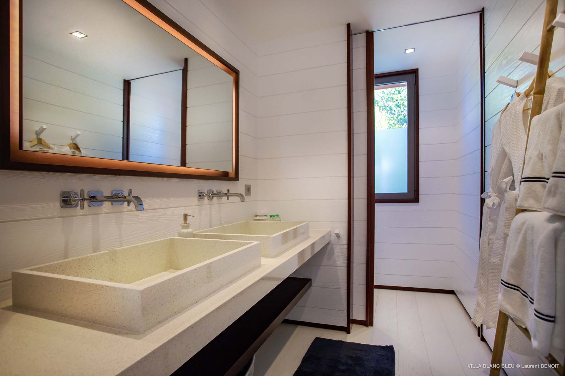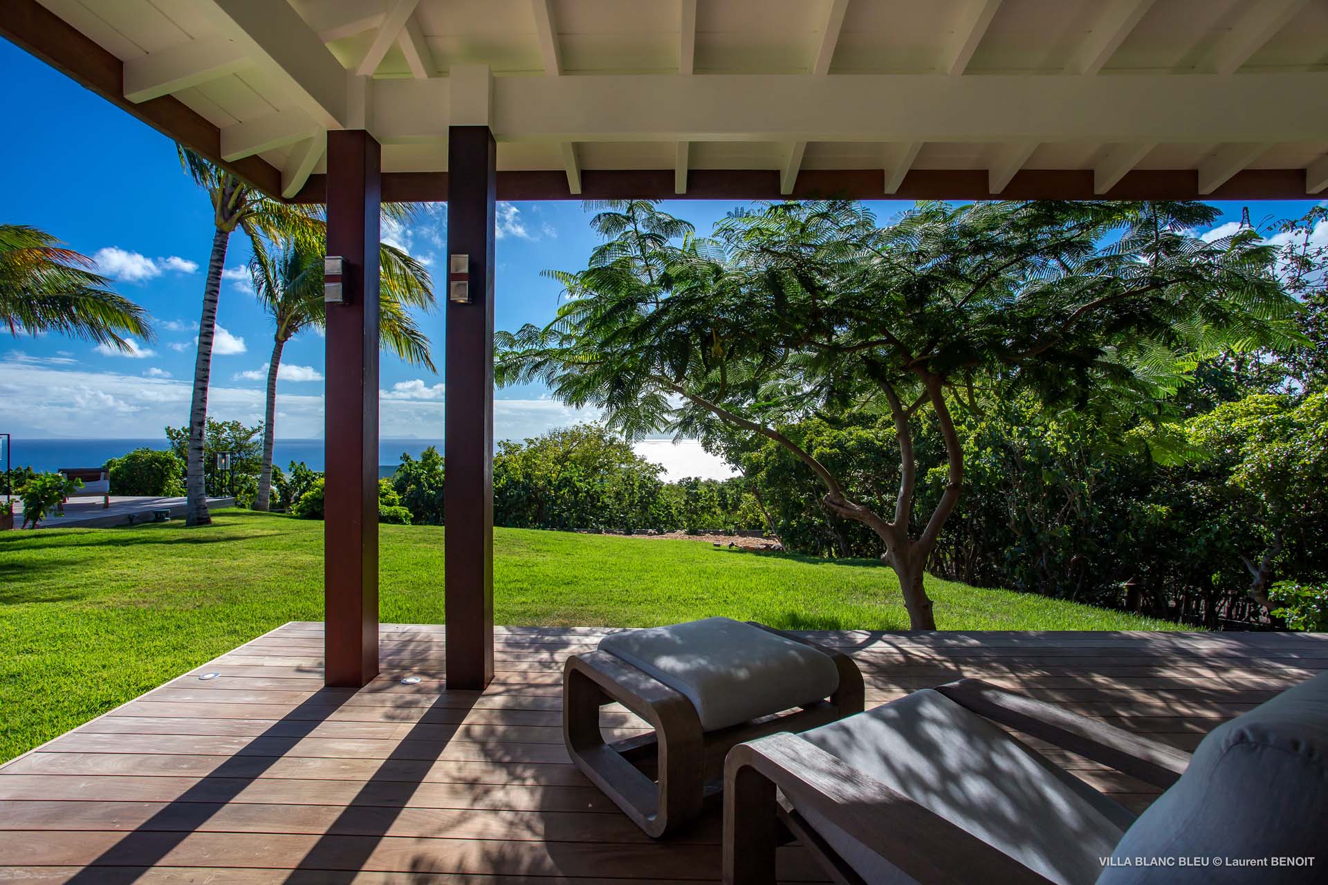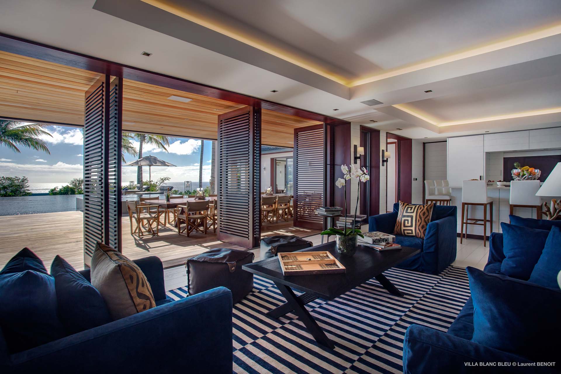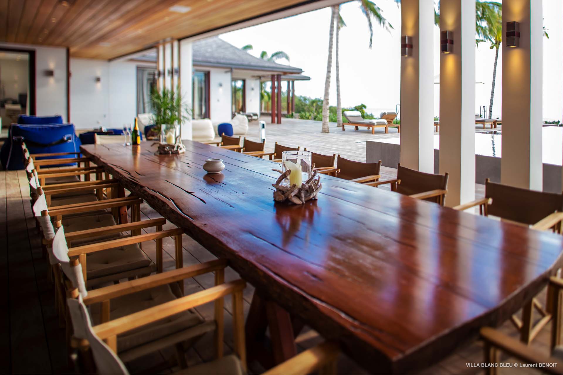 Castaway to Villa Blanc Bleu (villa code: WV BLB), an elegant 6-bedroom villa in Gouverneur, St. Barts. This luxurious estate is all about elegance and relaxed island living, enjoying stunning sunset views over the Caribbean. A masterclass in geometric design, the architecture at Villa Blanc Bleu will sweep you away. The open-plan design flows from the inside out, with accents of rustic wood contrasting with the color palette of white and blue. Classic island decor enhances the Caribbean vibe, while large windows and doors bathe the entire home in all-day sunshine. Nestled in an upscale neighborhood above Gouverneur bay, the beach is just a few minutes away. Restaurants, shopping, and bars are also within easy driving distance, as Gustavia and St-Jean are both under a 10-minute drive. The open great room sets the tone for Villa Blanc Bleu, featuring the signature blue and white color scheme and stunning ocean views. There’s plenty of space to spread out, making this a great choice for families or a larger group of friends. In the great room is the living area, Soft blue sofas in the living room invite you to sink in, enjoying the island breeze drifting through the open doors. Connected to the living room is a separate TV room, with a large soft sofa in front of a flat-screen TV. The modern kitchen at Villa Blanc Bleu features everything you’ll need to create gourmet meals during your stay. Foodies will love experimenting with local flavors and ingredients here. Our concierge can organize grocery pre-stocking or delivery, catered meals, or arrange private chef service for a special occasion. On the covered terrace outside is an expansive dining table, which can seat up to 16 guests. Made from rustic wood and overlooking the pool, it’s an elegant setting for a festive dinner party. There’s a total of 6 bedrooms at Blanc Bleu Villa. There is an extra bedroom next to the kitchen that can also be made up with twin bunk beds, ideal for children or live-in staff members. A beautifully crafted stairway leads up from the great room to the master suite on the second level. Spacious and airy, this room overlooks the pool and ocean beyond. There’s a lounge for relaxing, a desk with a computer, and a private terrace furnished with a comfortable sofa. The other five bedrooms fan out on either side of the living room, each a quiet and private place to relax every evening. Four of these rooms come with a European king-sized bed, while the fifth has a pair of twin beds. All rooms have a private ensuite and a flat-screen TV. Under the covered terrace outside is a comfortable outdoor lounge, a great spot to relax in the warm island air. Whether you’re diving into a good book or simply gazing out at the ocean, this is the best seat in the house. A large projector screen also lets you gather here for an open-air movie night. Out on the terrace at Blanc Bleu, loungers, sunbeds, and parasols offer plenty of options for unwinding in either the sun or shade. They’re all scattered around the nearly 60-foot-long swimming pool, a refreshing spot to cool off during the day. When the afternoon starts to fade, retreating to the large spa is encouraged, letting you watch the sunset with a cocktail in hand. Throw on some music over the outdoor speakers for a glamorous poolside party. A narrow path leads to a small gym and an in-ground trampoline. Here you’ll also find a pickle ball tennis court, complete with an automatic ball server for those working on their topspin. For days on the sand, Gouverneur Beach is a 3-minute drive. Within 10 minutes, you can also be lounging on the pristine shores of either St-Jean or Saline Beach.Please fill out the form to begin your inquiry and we will connect you with a seasoned villa rental specialist.