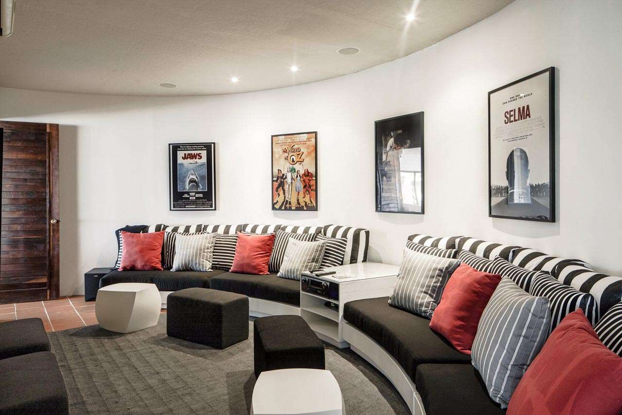 Downstairs, a fully-equipped media room is the best seat in the house to enjoy a movie. A large flat-screen TV, vintage movie posters, and surround sound all make it a wonderful spot for the latest blockbuster.