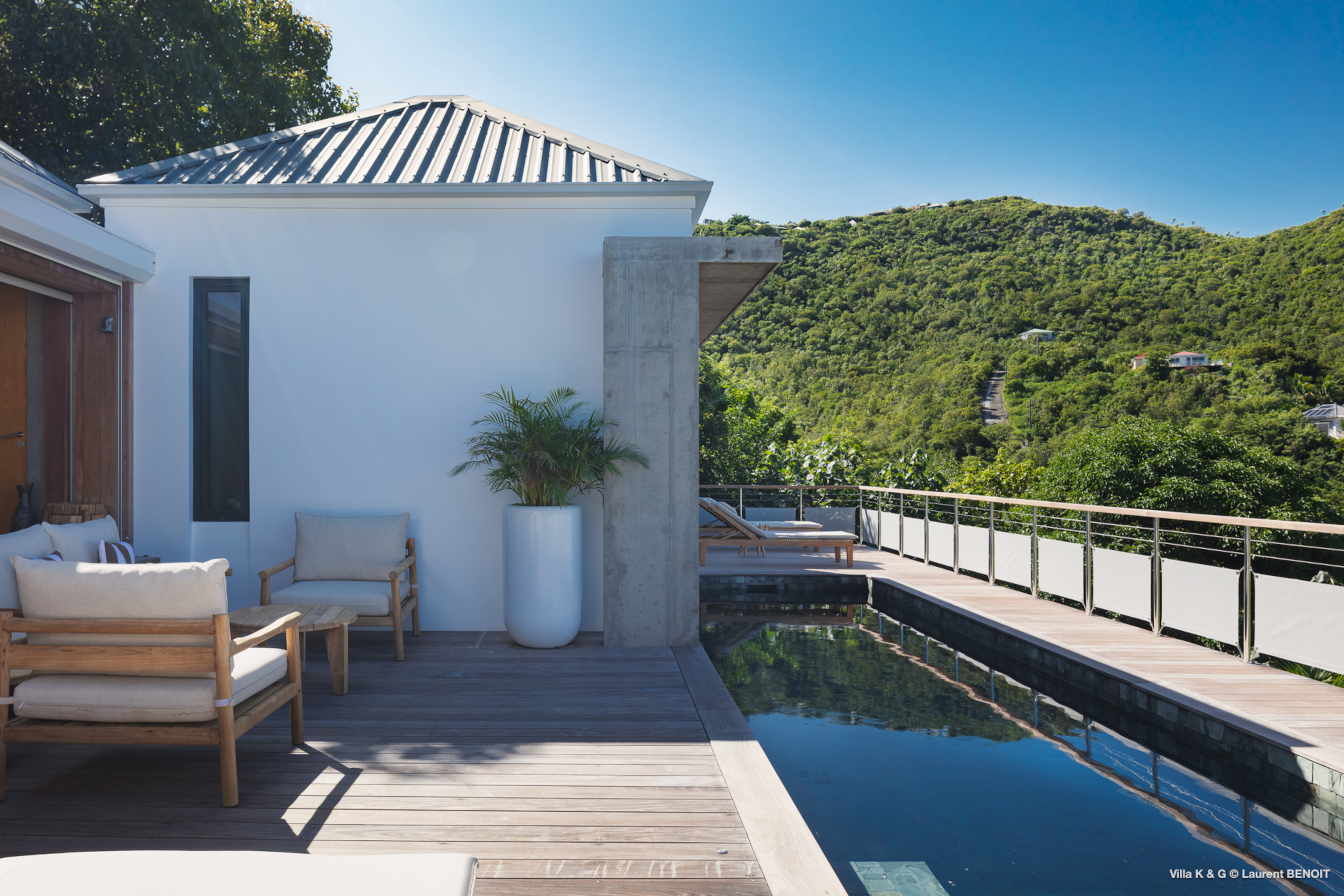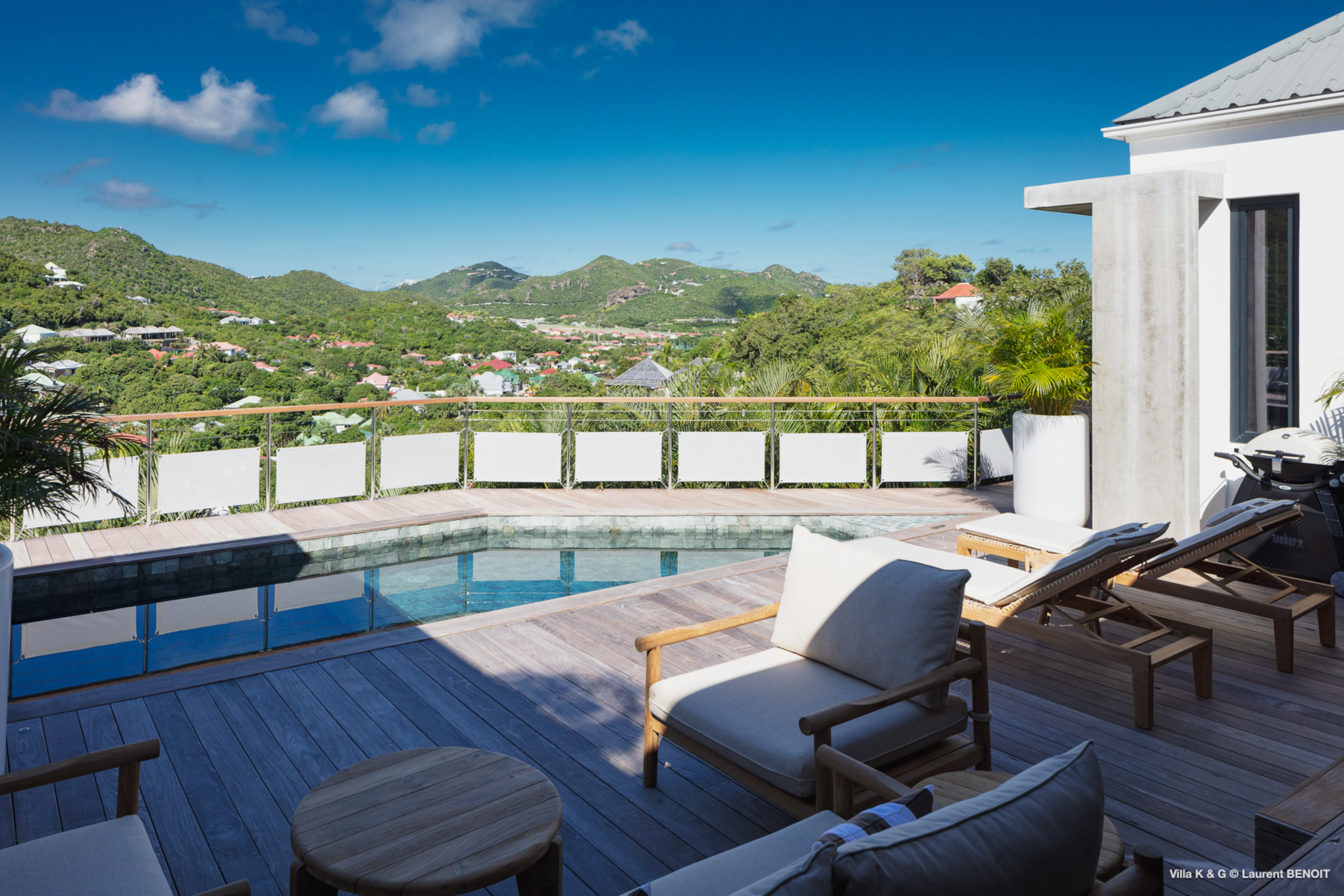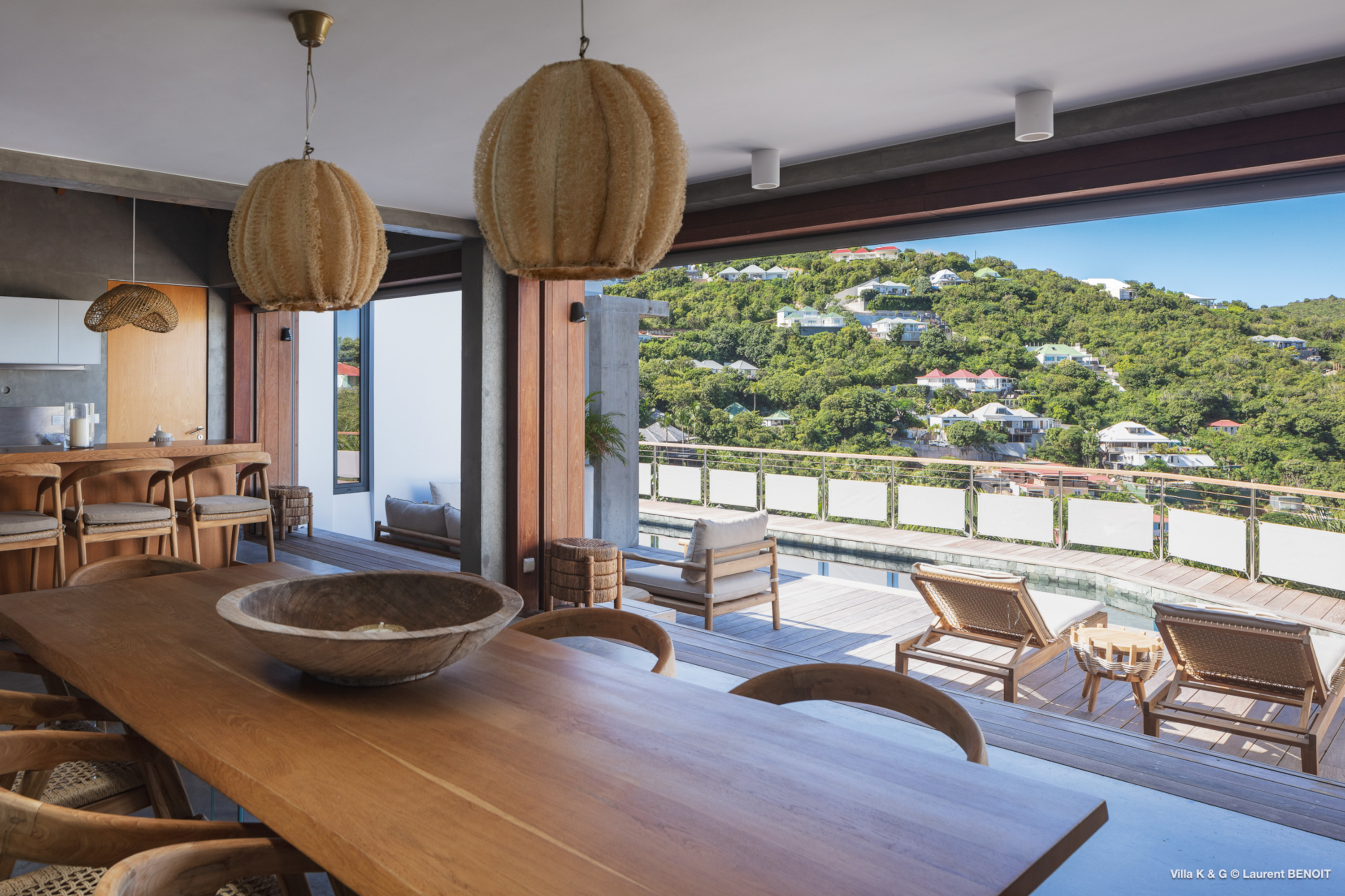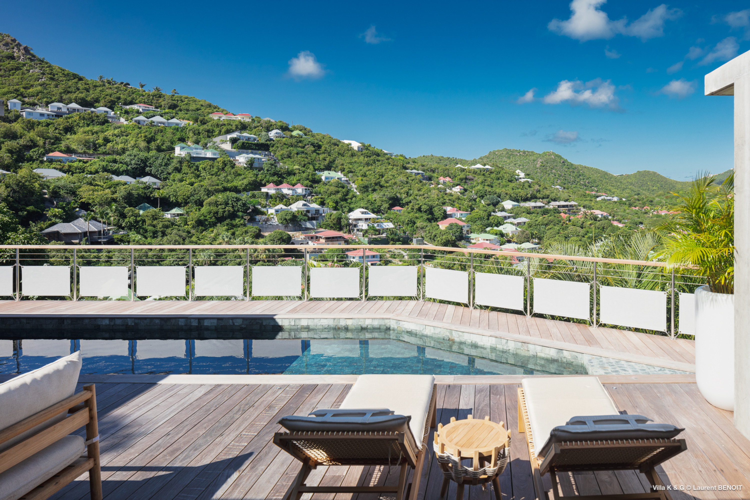 Nestled on the hill of St. Jean, amidst lush vegetation, Villa Bonheur (villa code: WV BNR) is a true invitation to relaxation and well-being. This luxury villa combines an atypical and warm decor with modern elements, creating a unique and cozy atmosphere. The raw concrete walls harmoniously blend with the stunning exposed wooden beams, offering a contemporary yet welcoming setting. The spacious living room is the heart of the villa, where you can unwind in a comfortable L-shaped lounge equipped with a large flat-screen TV, perfect for moments of relaxation, reading breaks, or unforgettable movie nights. The layout maximizes natural light, thanks to a wide bay window that opens up to breathtaking views of the rock formations and surrounding greenery, while a fully glazed wall provides a magnificent perspective of the verdant hills. At the center of this main area, a beautiful wooden table with transparent legs can accommodate up to 8 guests, making it ideal for memorable and convivial dinners. The open-plan kitchen, fully-equipped, invites a sense of togetherness. Around the central island, you can share pleasant moments in a warm and friendly atmosphere, away from conventions. It’s the perfect place to whip up delicious meals while enjoying the company of your loved ones. A true extension of the living space, the exterior of Villa Bonheur is a peaceful haven. Sun loungers await you for relaxation after a refreshing swim in the crystal-clear pool. A small bar area, subtly sheltered by the vegetation, completes this outdoor space, providing an idyllic setting to savor cocktails in tranquility. The bedrooms at Villa Bonheur are a true sanctuary of comfort. Spacious and cozy, they feature high ceilings and each has its own ensuite bathroom. The decor, both understated and chic, creates a soothing atmosphere, perfect for recharging after a day under the St. Barts sun. Villa Bonheur is much more than just a place to stay; it is an unforgettable experience on the island of St. Barts. Whether you seek relaxation, conviviality, or adventure, this villa will meet all your expectations and offer you an exceptional stay. Come and discover this little piece of paradise just a few minutes from St. Jean beach.Please fill out the form to begin your inquiry and we will connect you with a seasoned villa rental specialist.