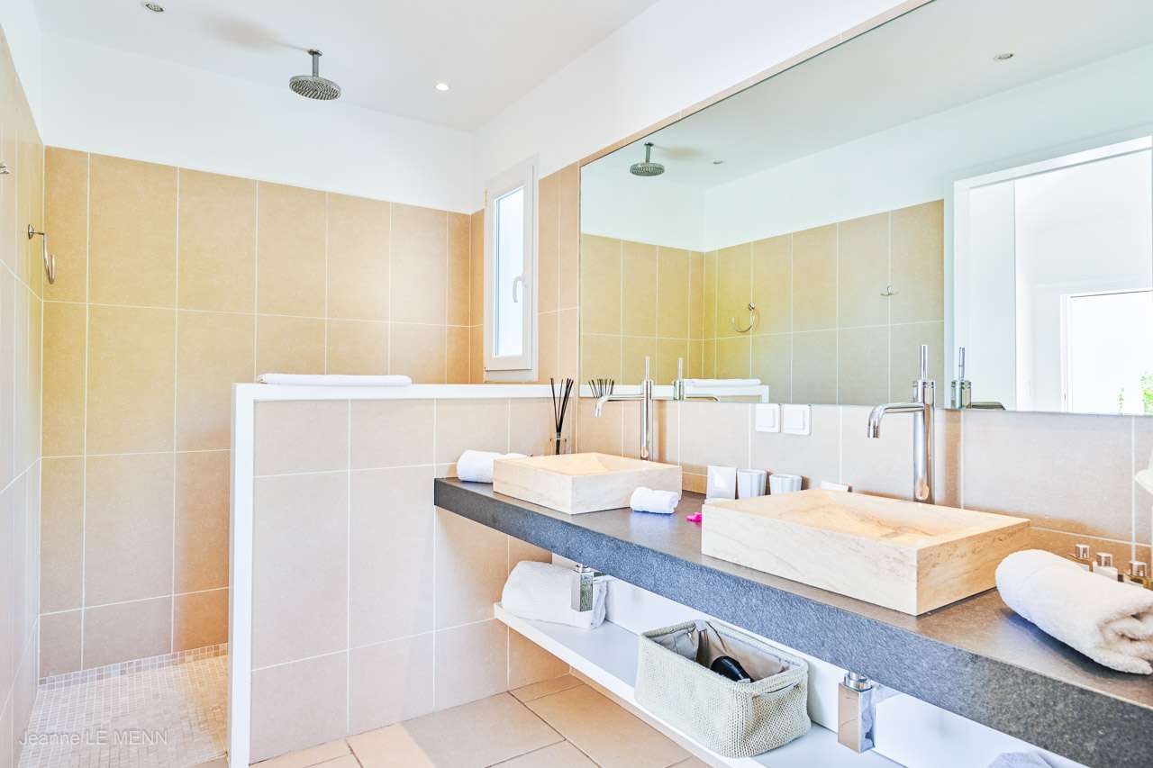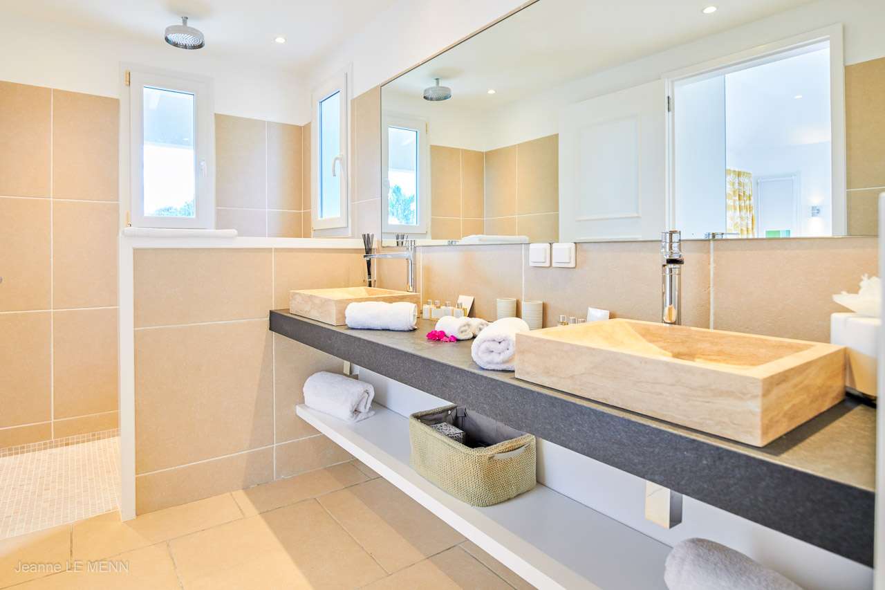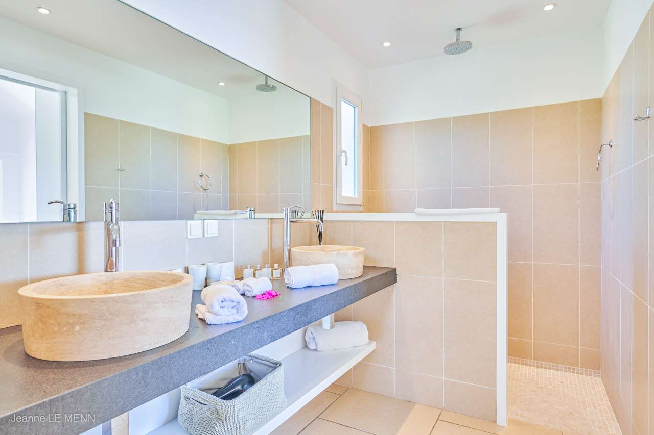 The third bedroom is in an independent cottage at the front of the house, opening towards the garden and featuring an outdoor shower connected to the ensuite.