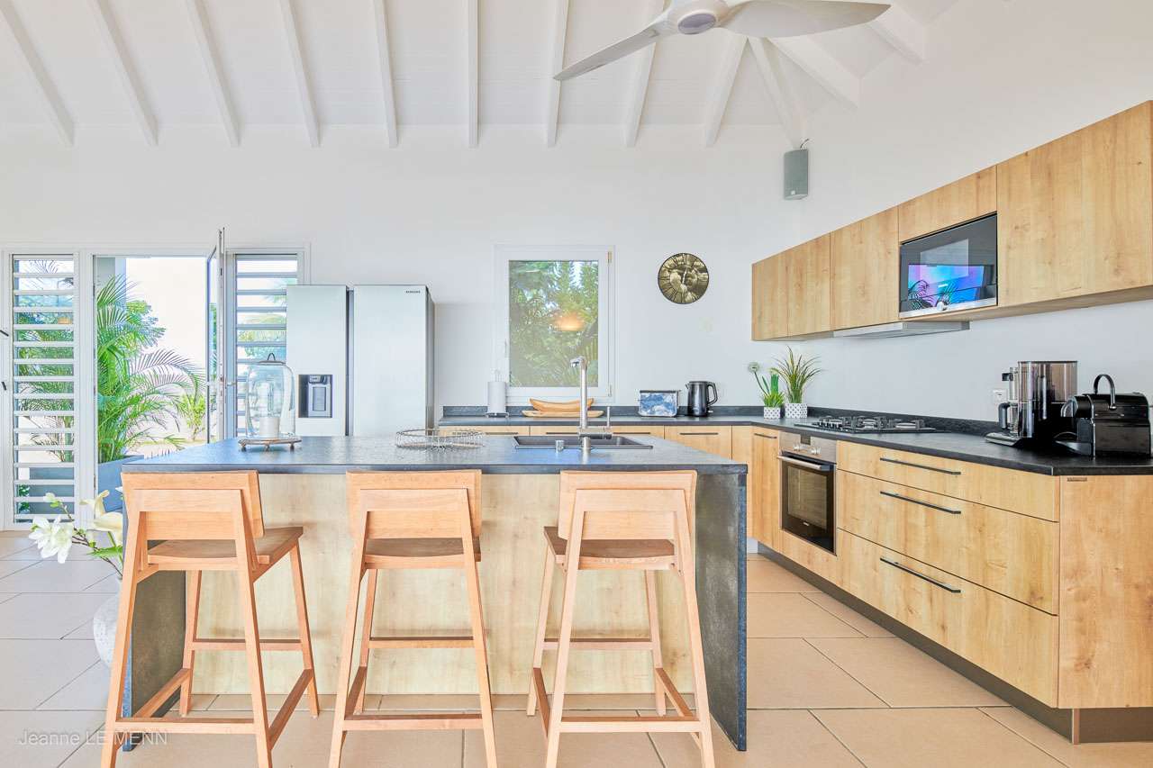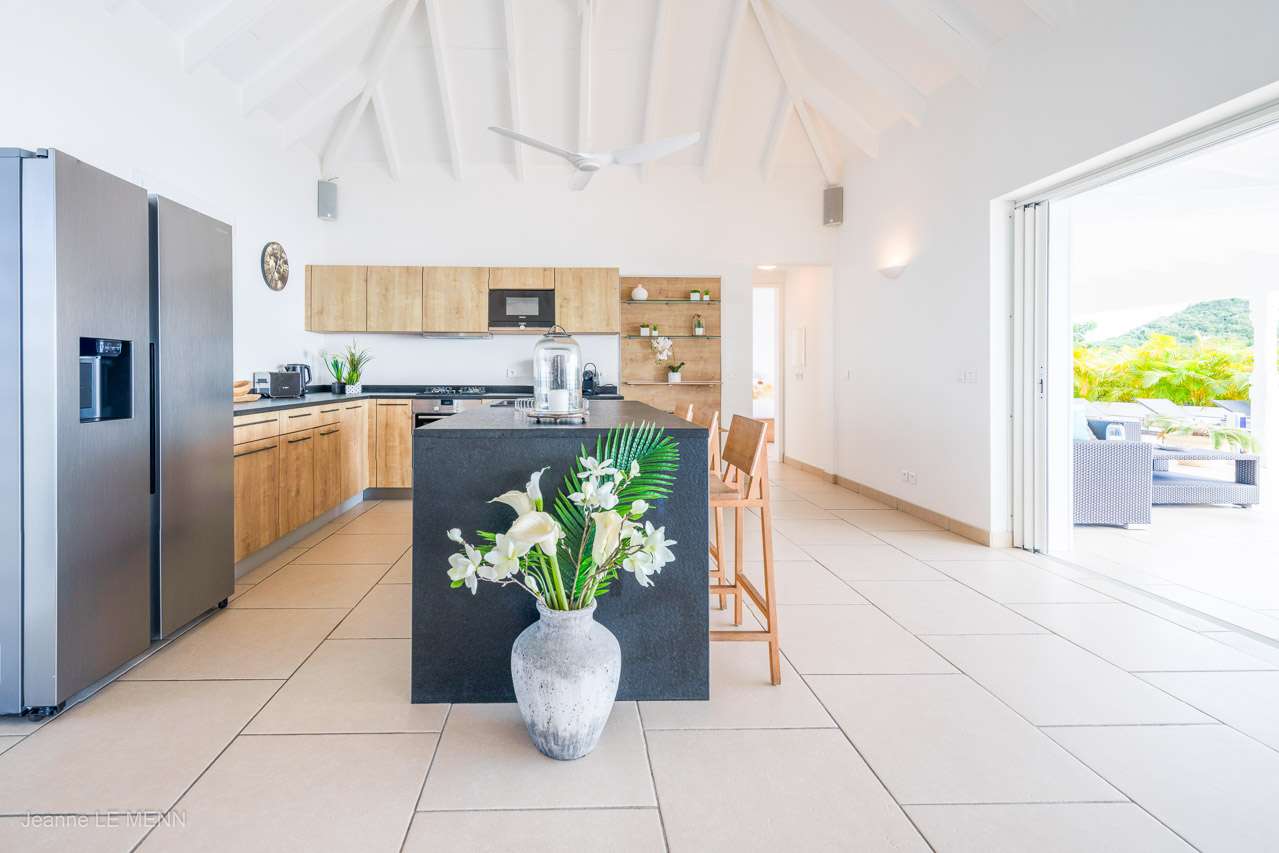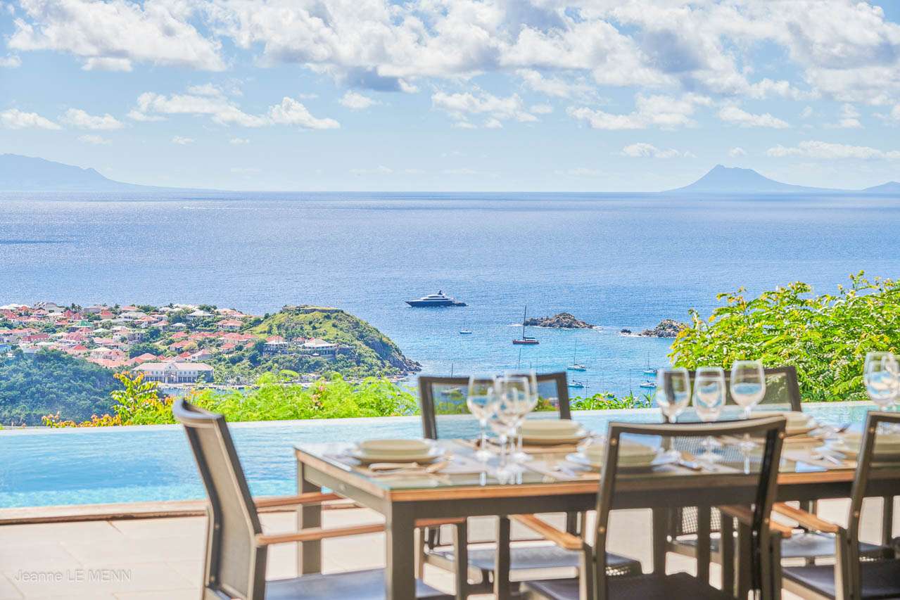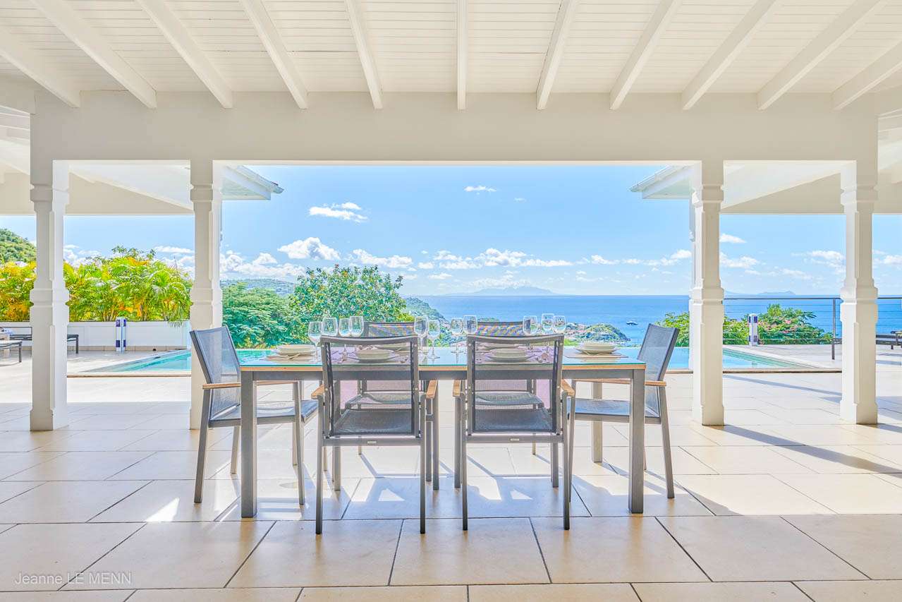 A breakfast bar on the kitchen island is a great spot for your morning croissant and a coffee. More formal meals can be enjoyed at the outdoor dining table on the covered terrace, offering stunning views over Gustavia and the Caribbean.